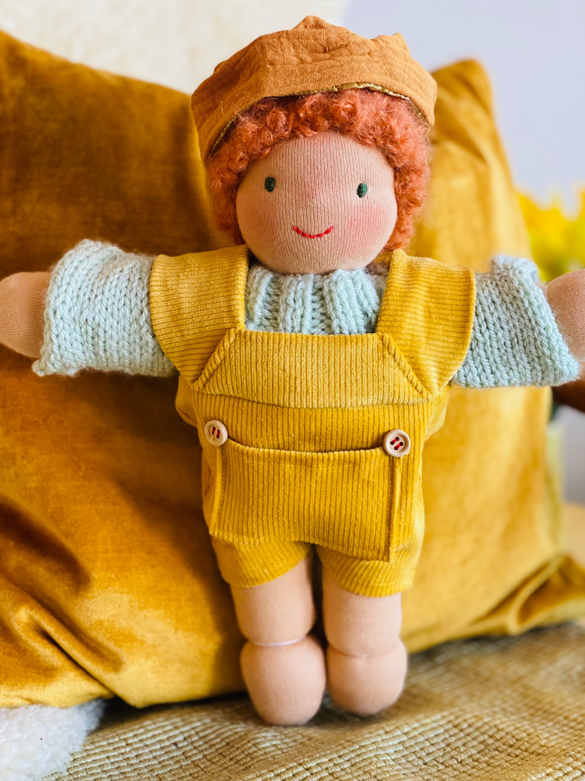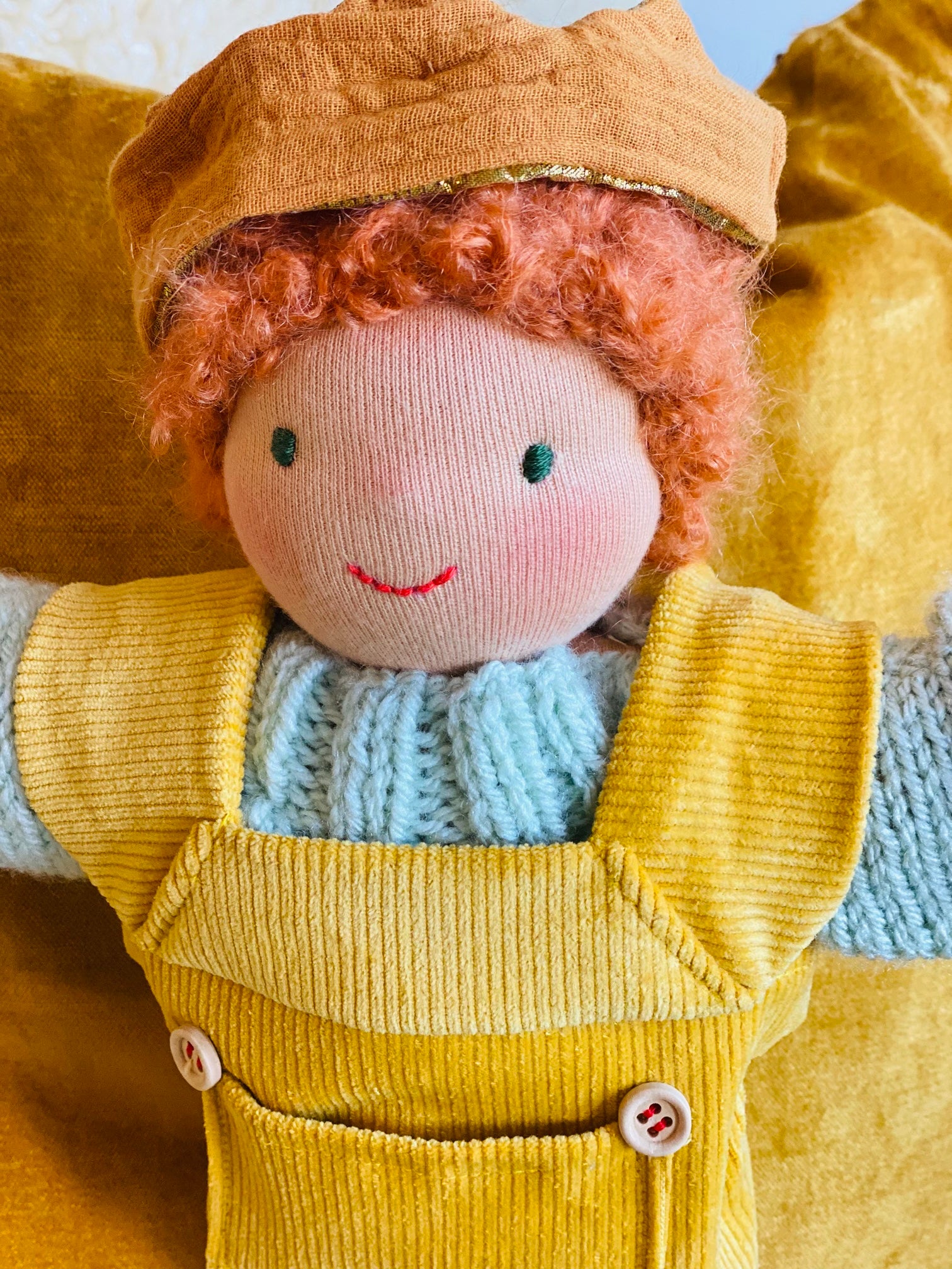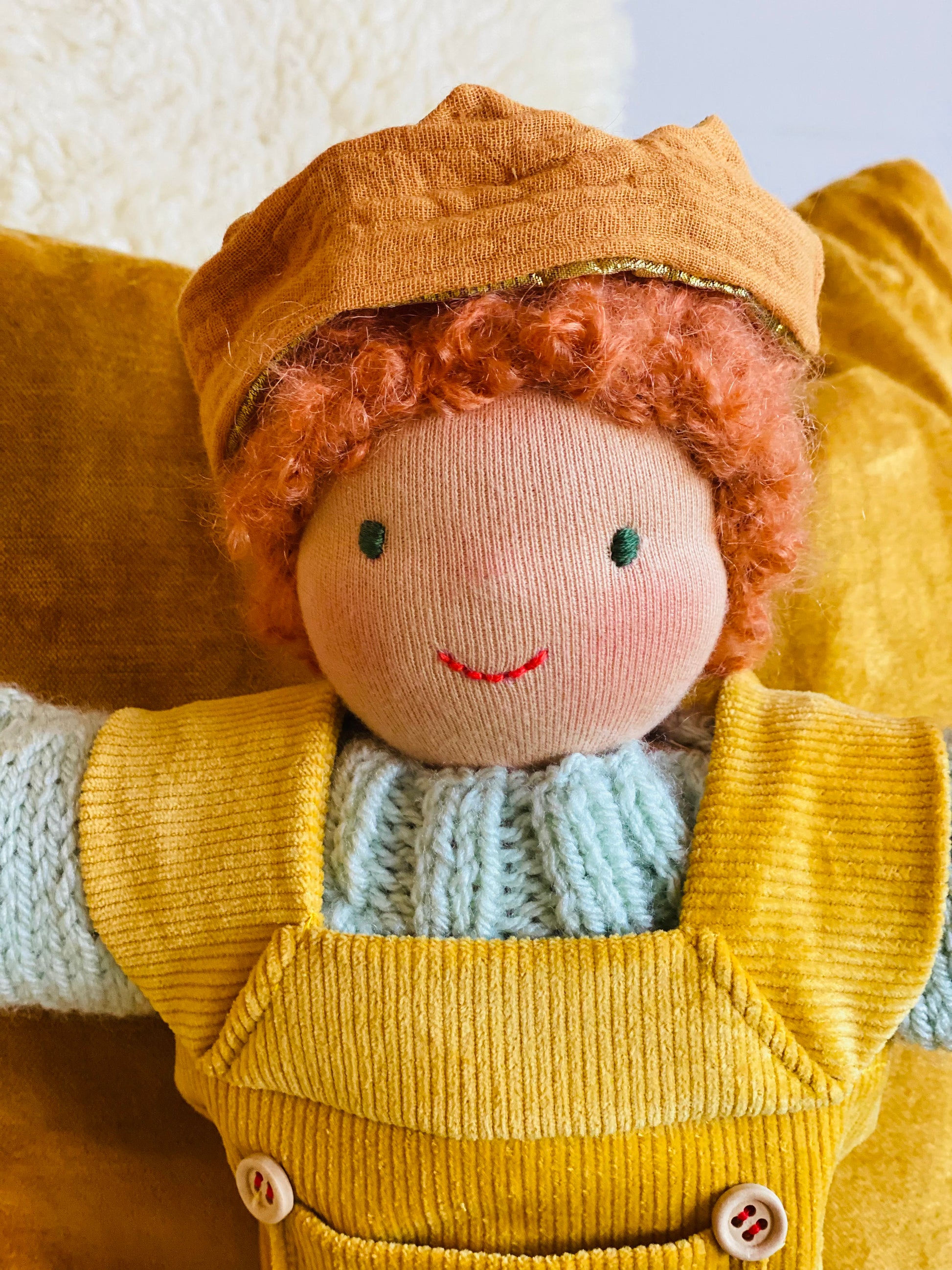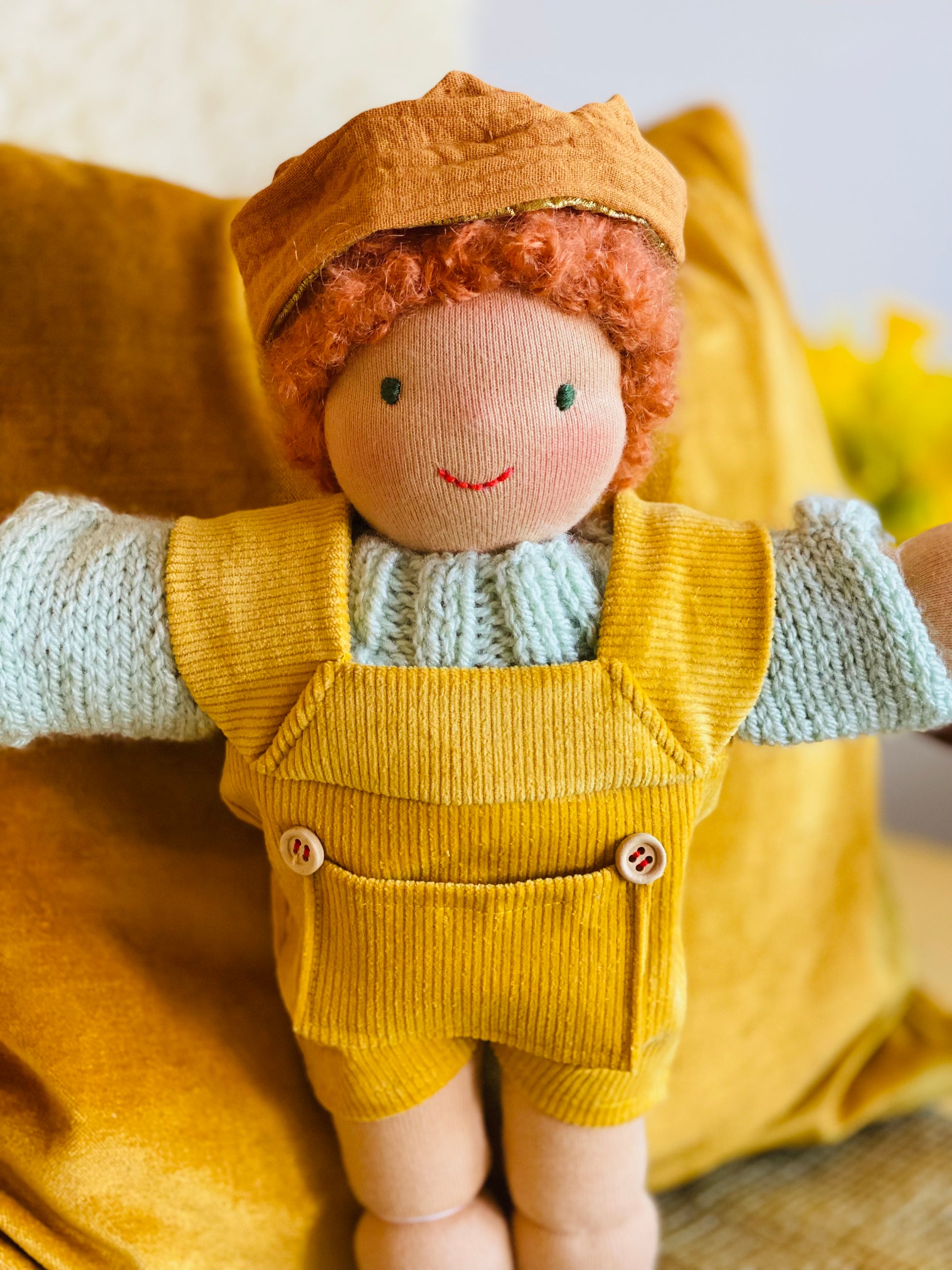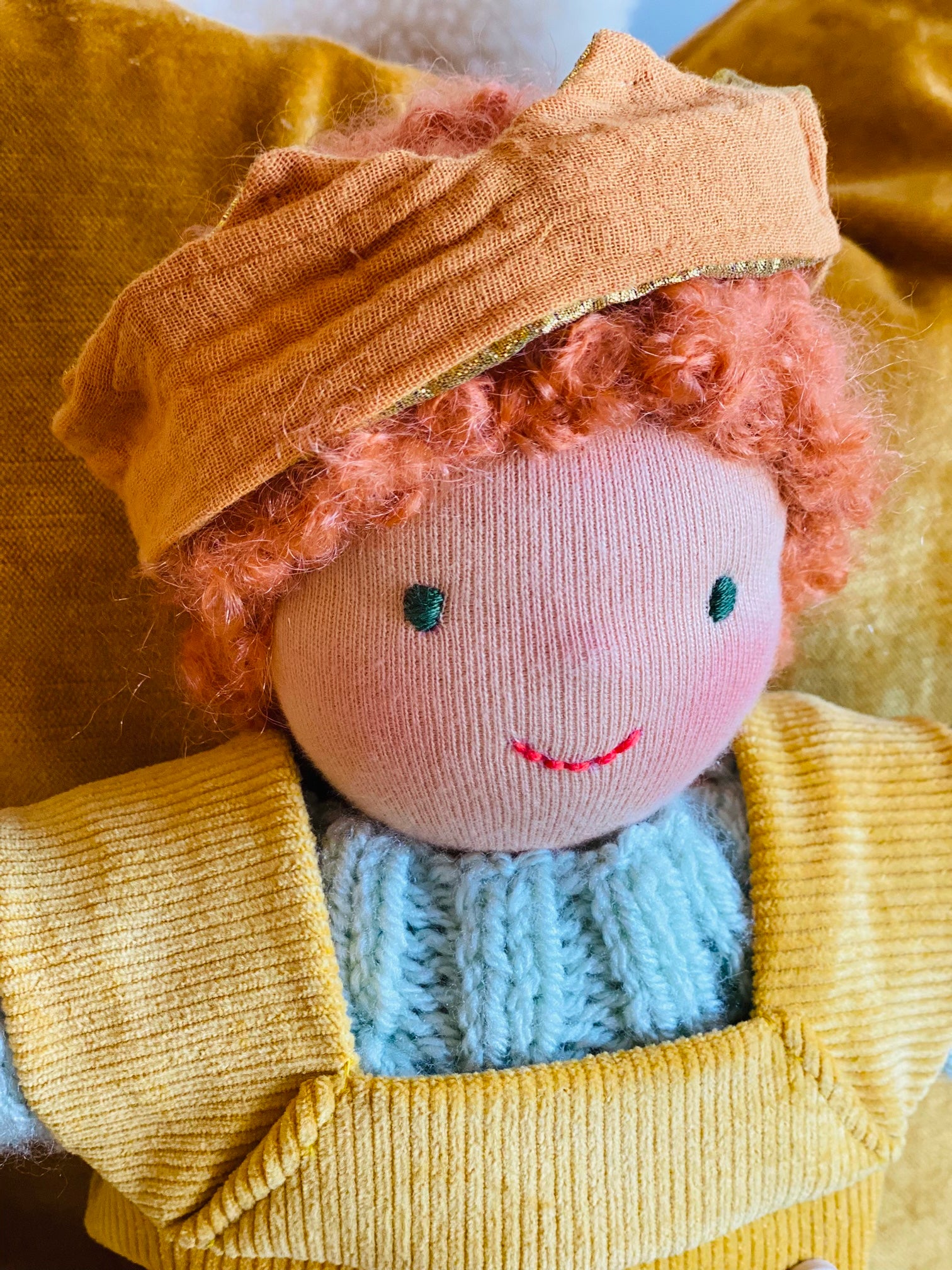 ROSA ist ein kleines, ca. 33 cm großes, kuscheliges Waldorf-Puppenkind und ist gefüllt mit gesunder De Witte Engel OEKO-TEX® zertifizierter Schafwolle.