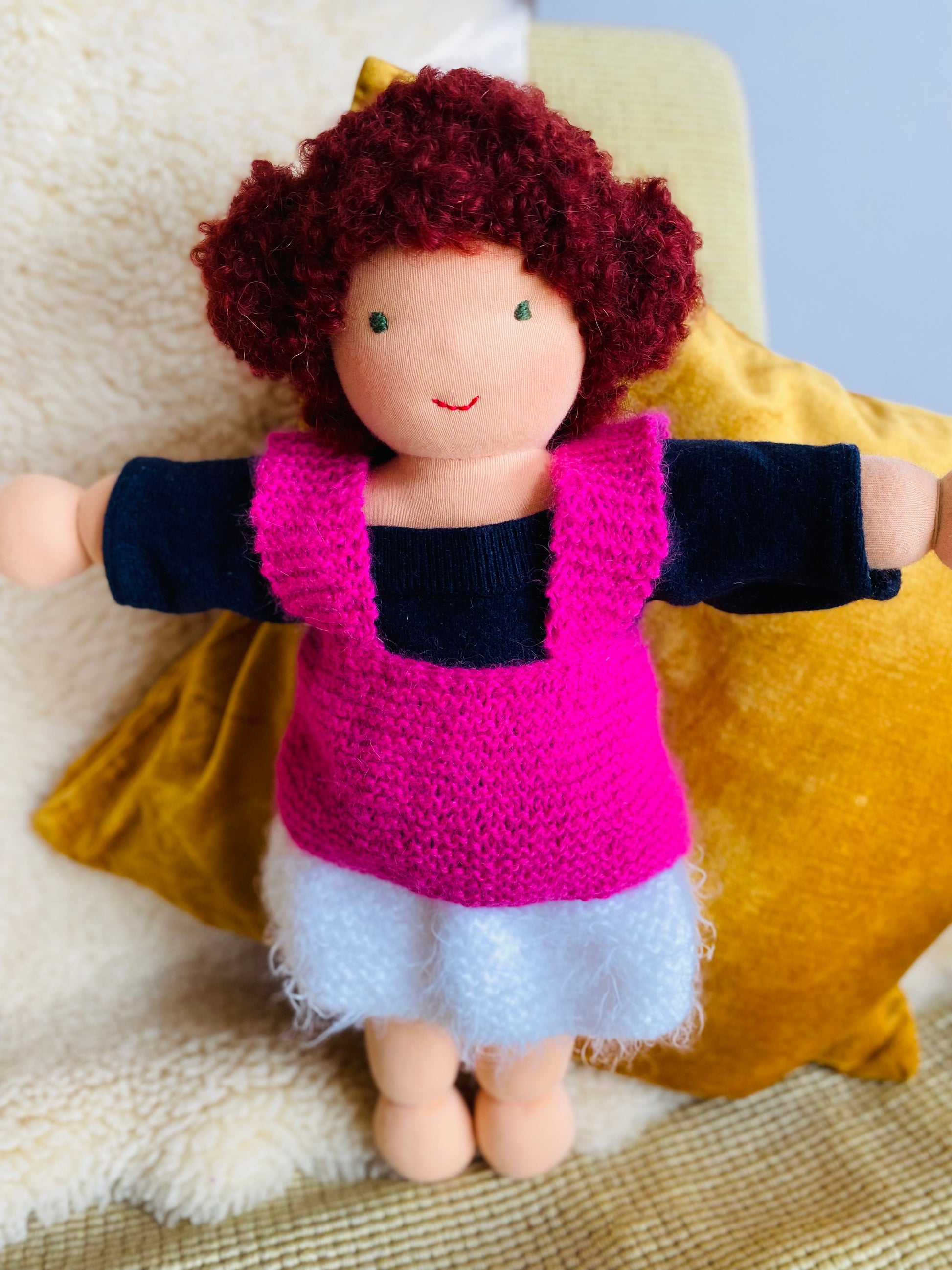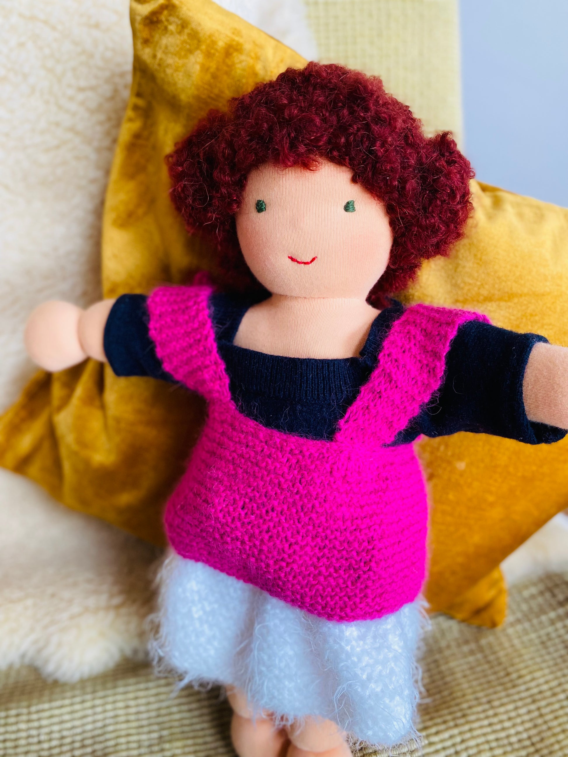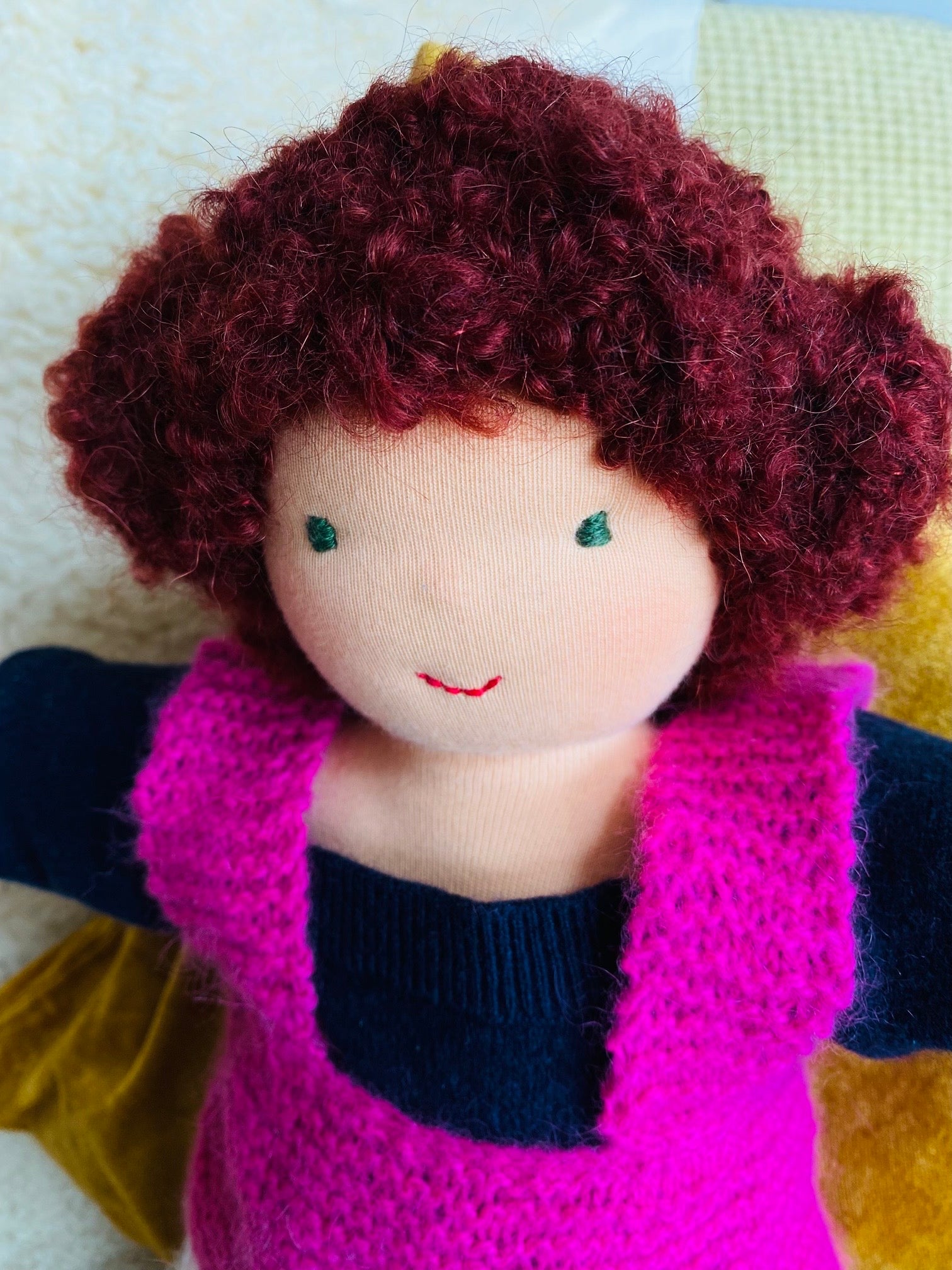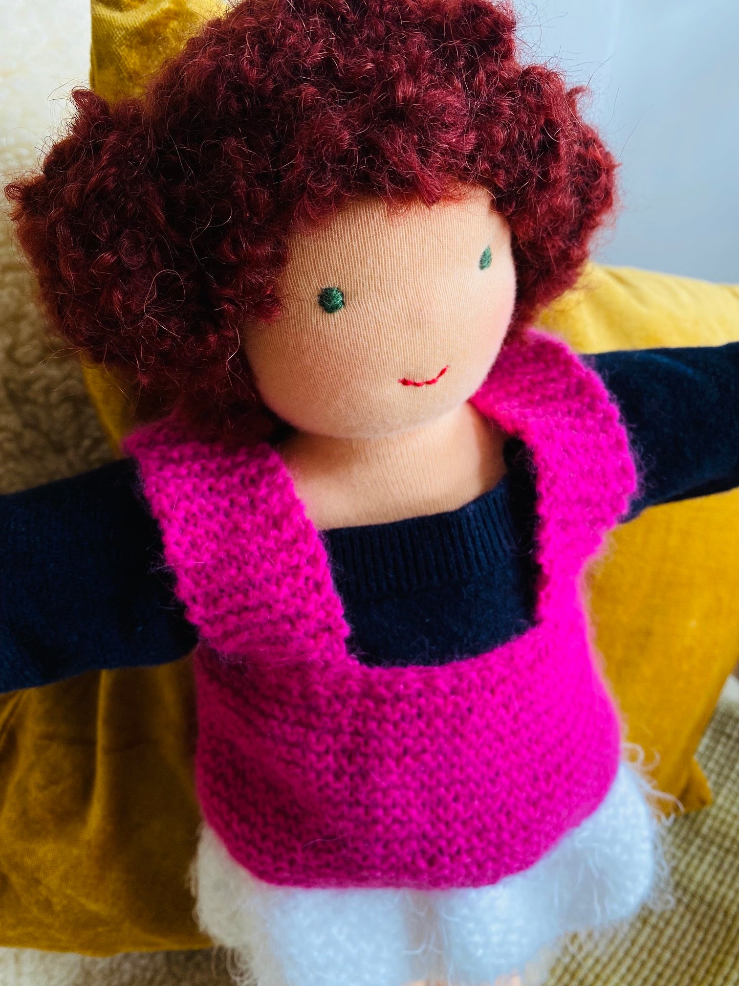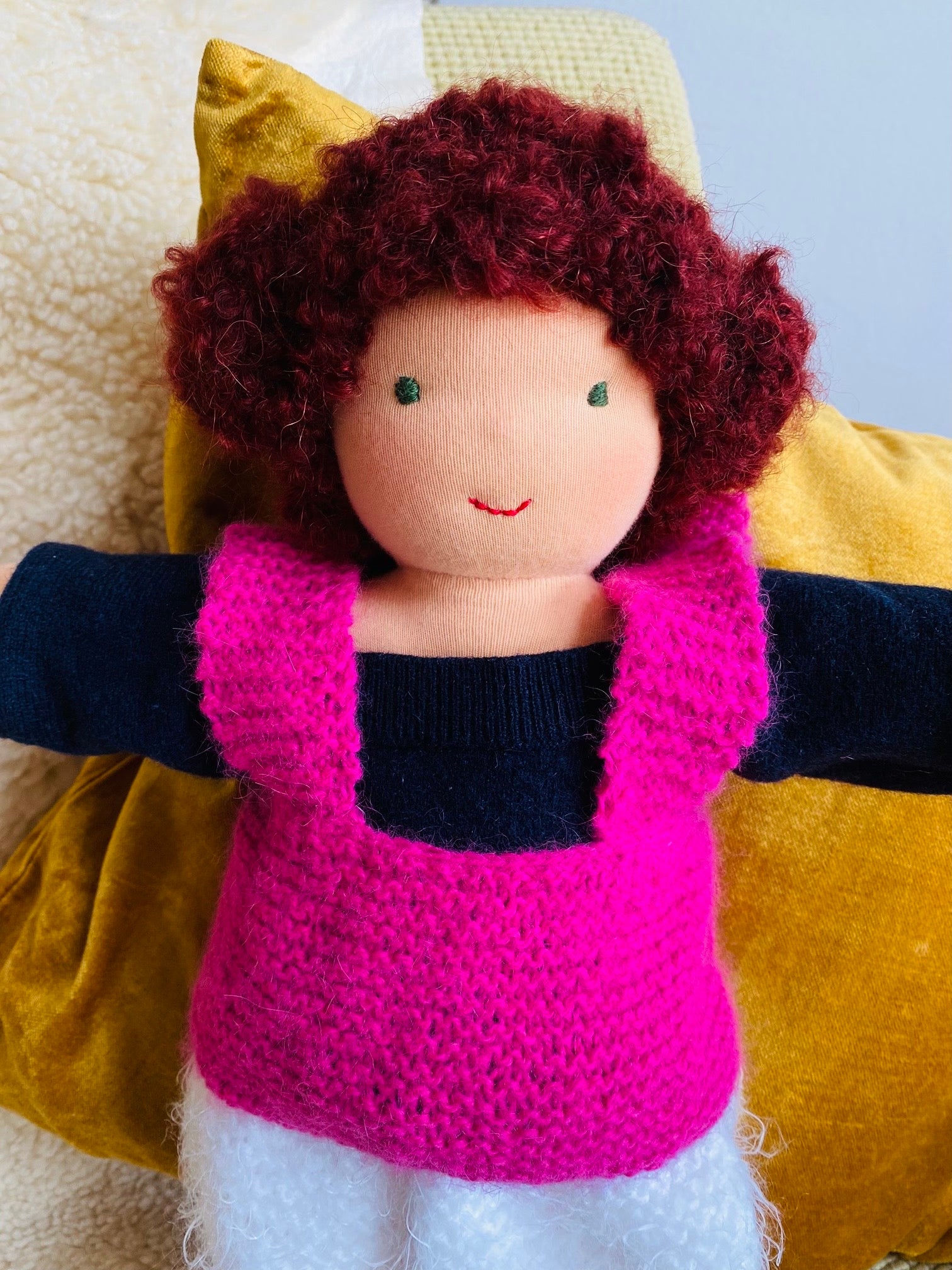 Die Mohair-Locke besteht aus 74% Mohair, 17% Schurwolle und 9% Polyamid und der Puppenjersey kommt De Witte Engel, ist OEKO-TEX® zertifiziert und super robust.