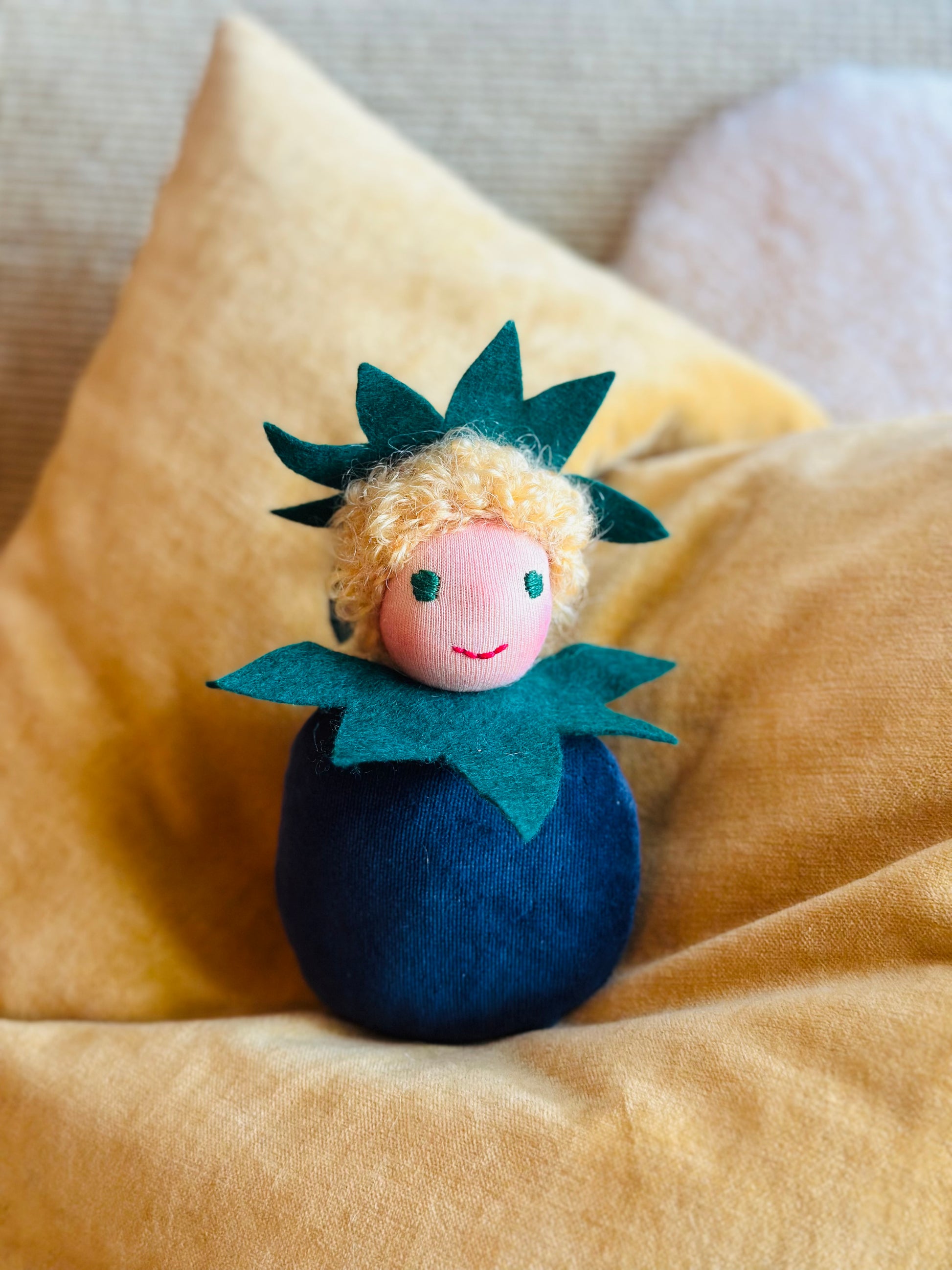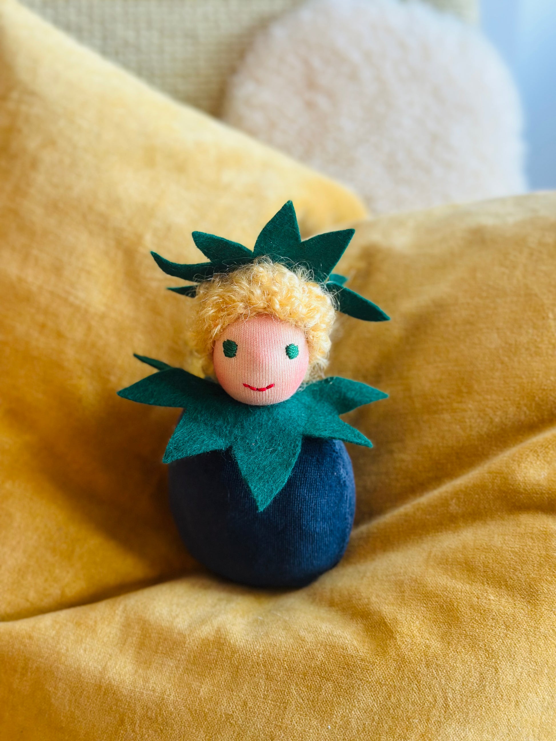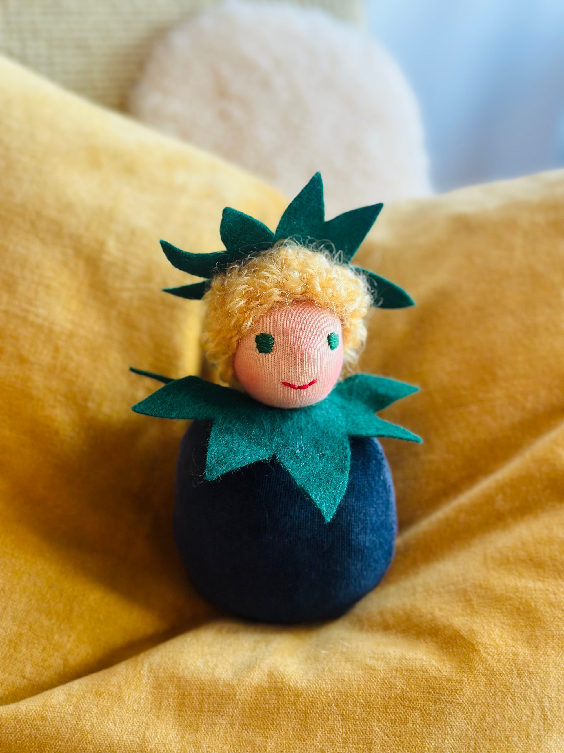 BLAUBEERCHEN 🫐 ist ein kleines, ca. 15 cm großes, kuscheliges Waldorf-Puppenkind und ist gefüllt mit gesunder Bio zertifizierter Schafwolle.