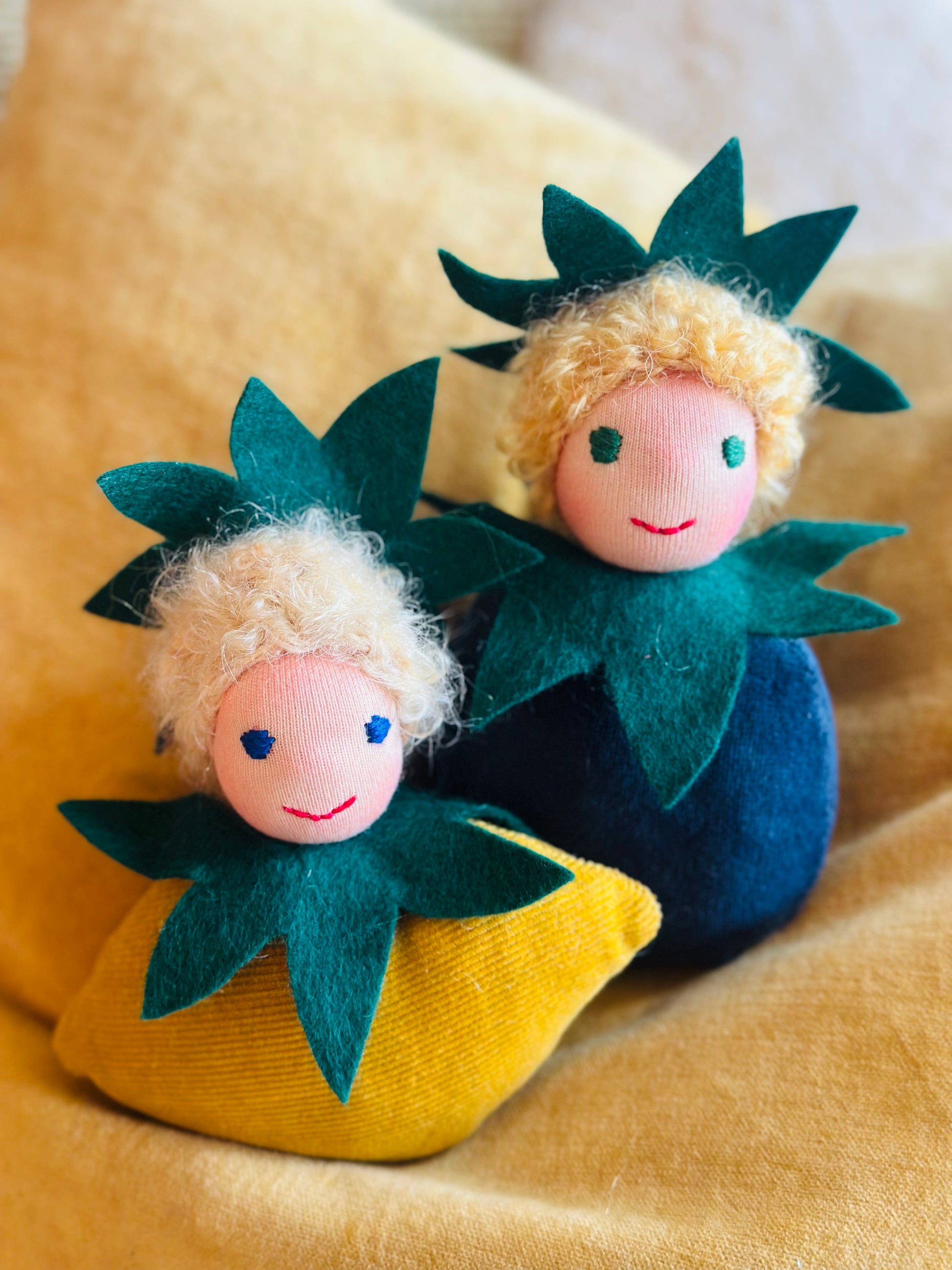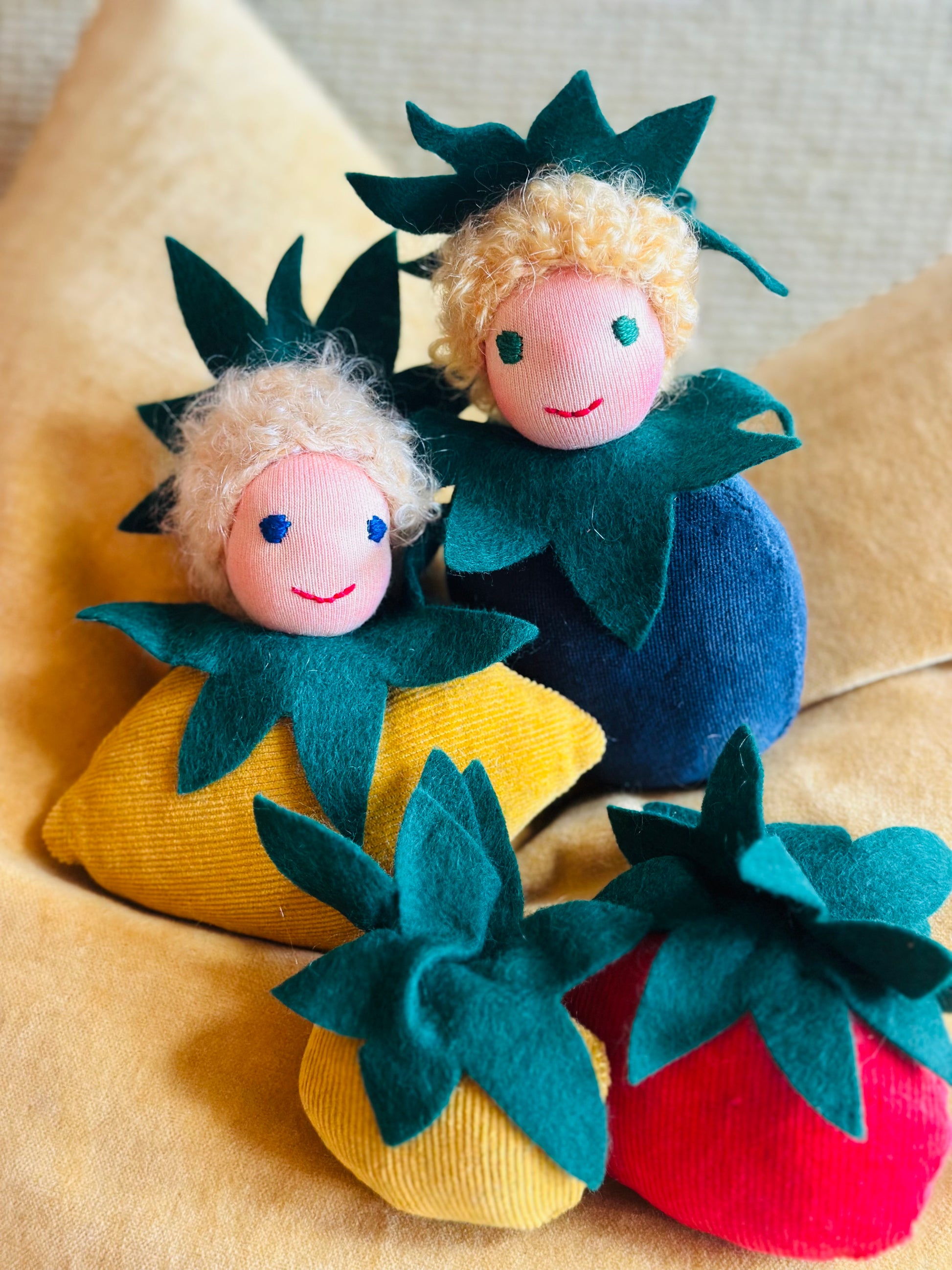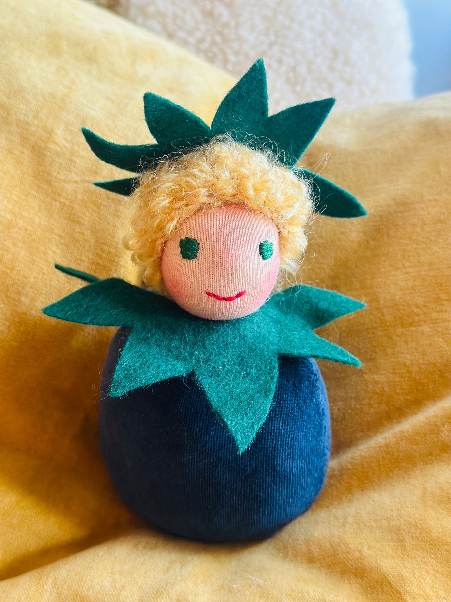 BLAUBEERCHEN 🫐 ist ein kleines, ca. 15 cm großes, kuscheliges Waldorf-Puppenkind und ist gefüllt mit gesunder Bio zertifizierter Schafwolle.
