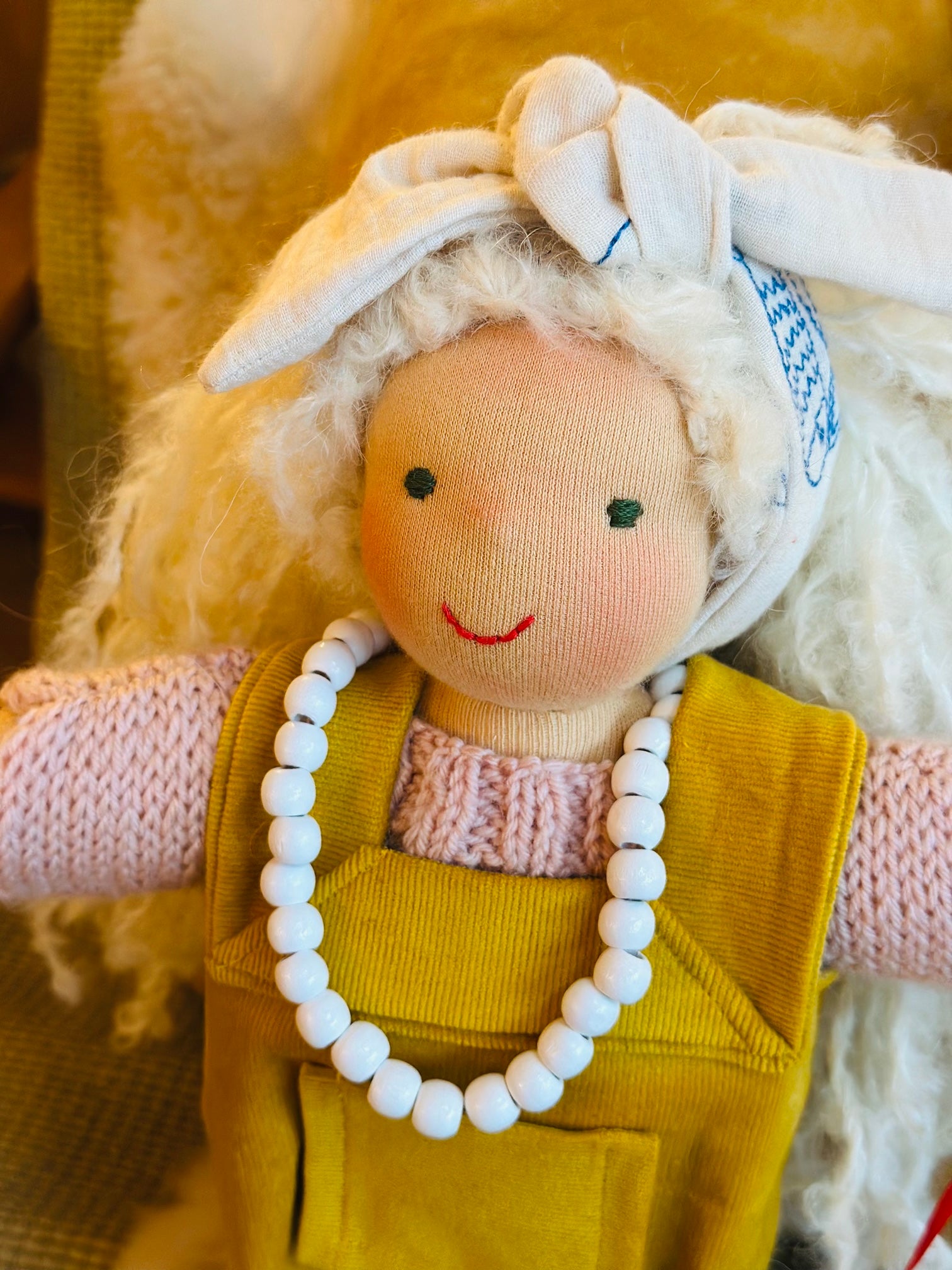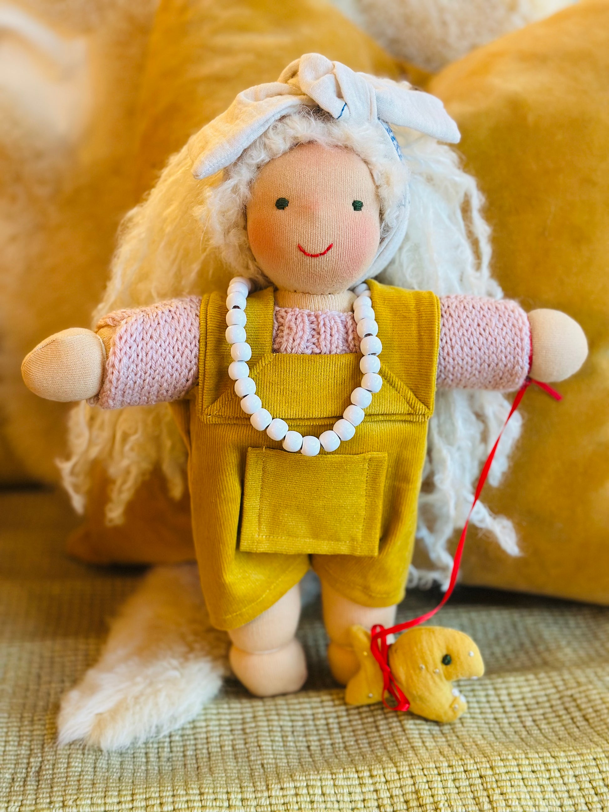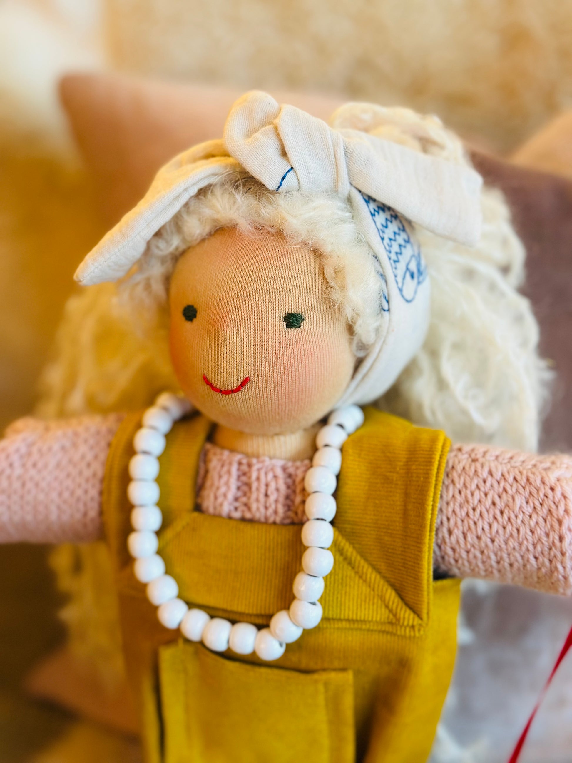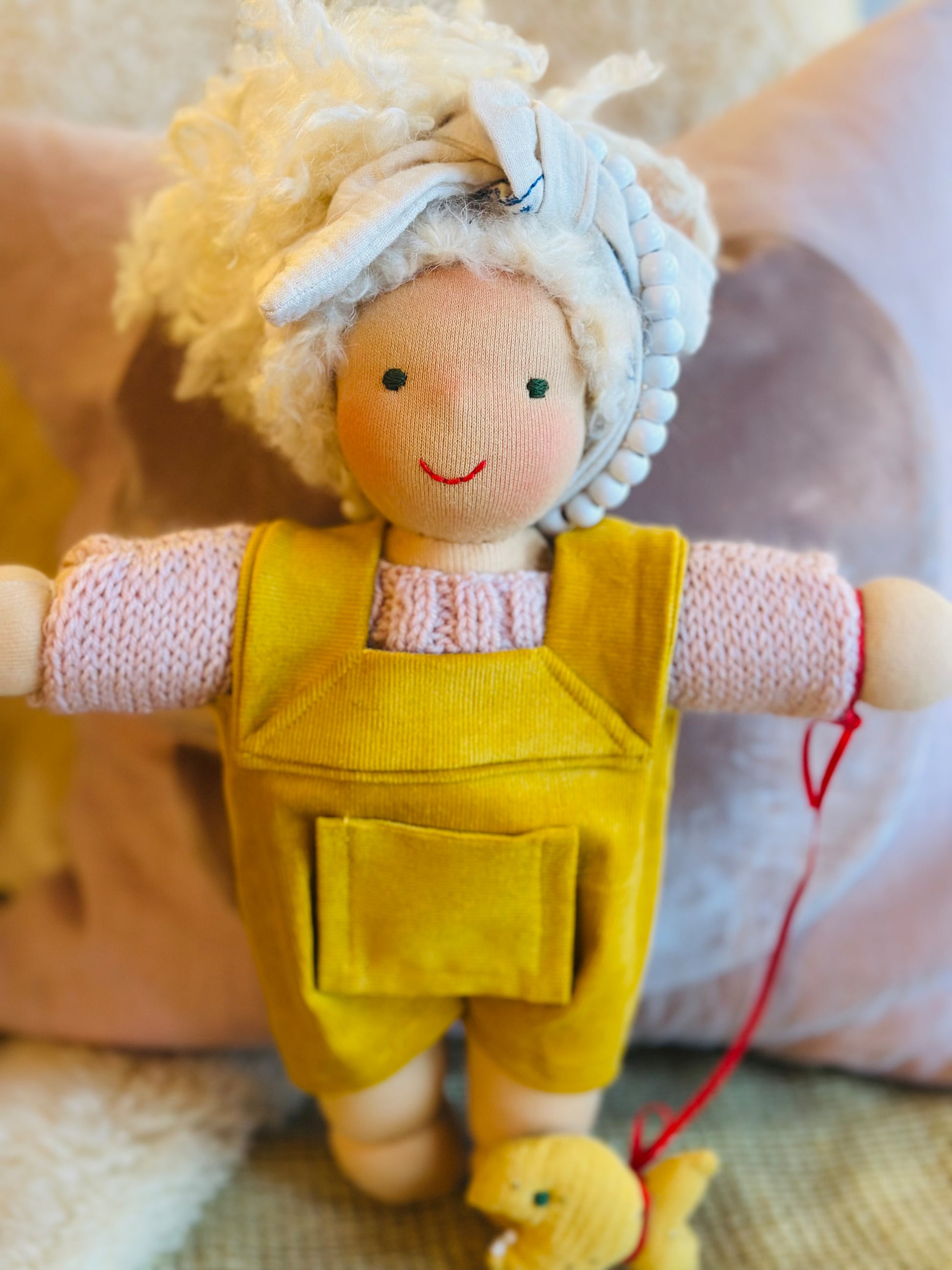 CHARLOTTE 🐠 ist ein kleines, ca. 33 cm großes, kuscheliges Waldorf-Puppenkind und ist gefüllt mit gesundem De Witte Engel OEKO-TEX ® zertifizierter Schafwolle.
