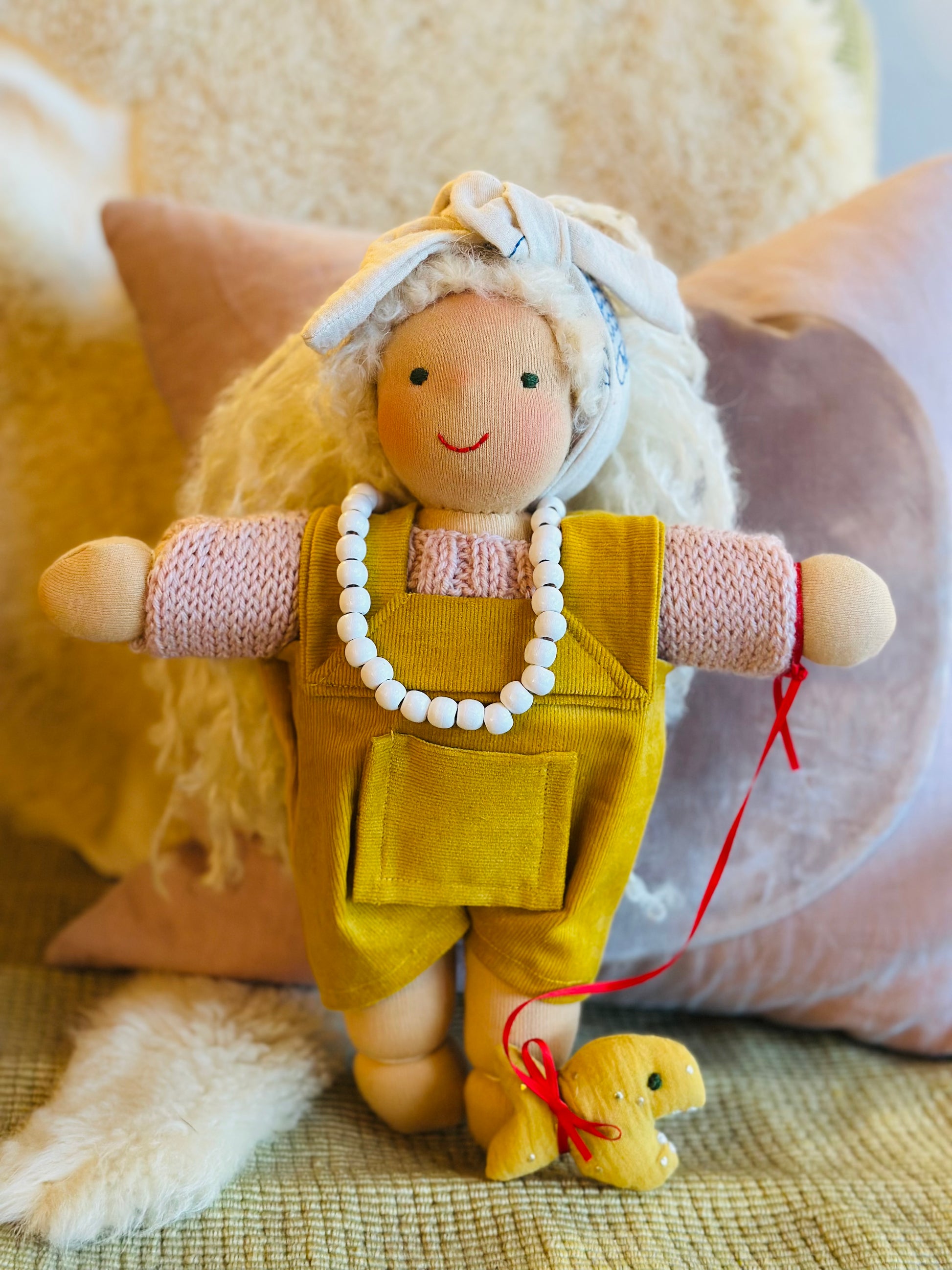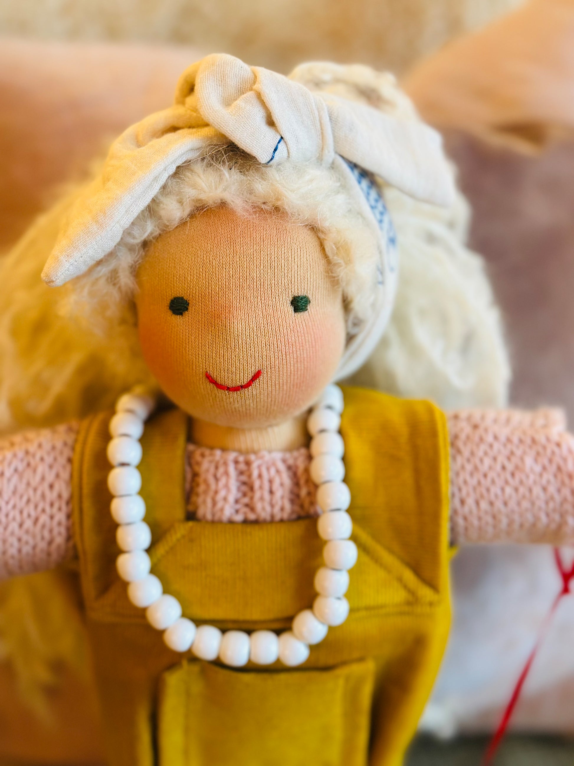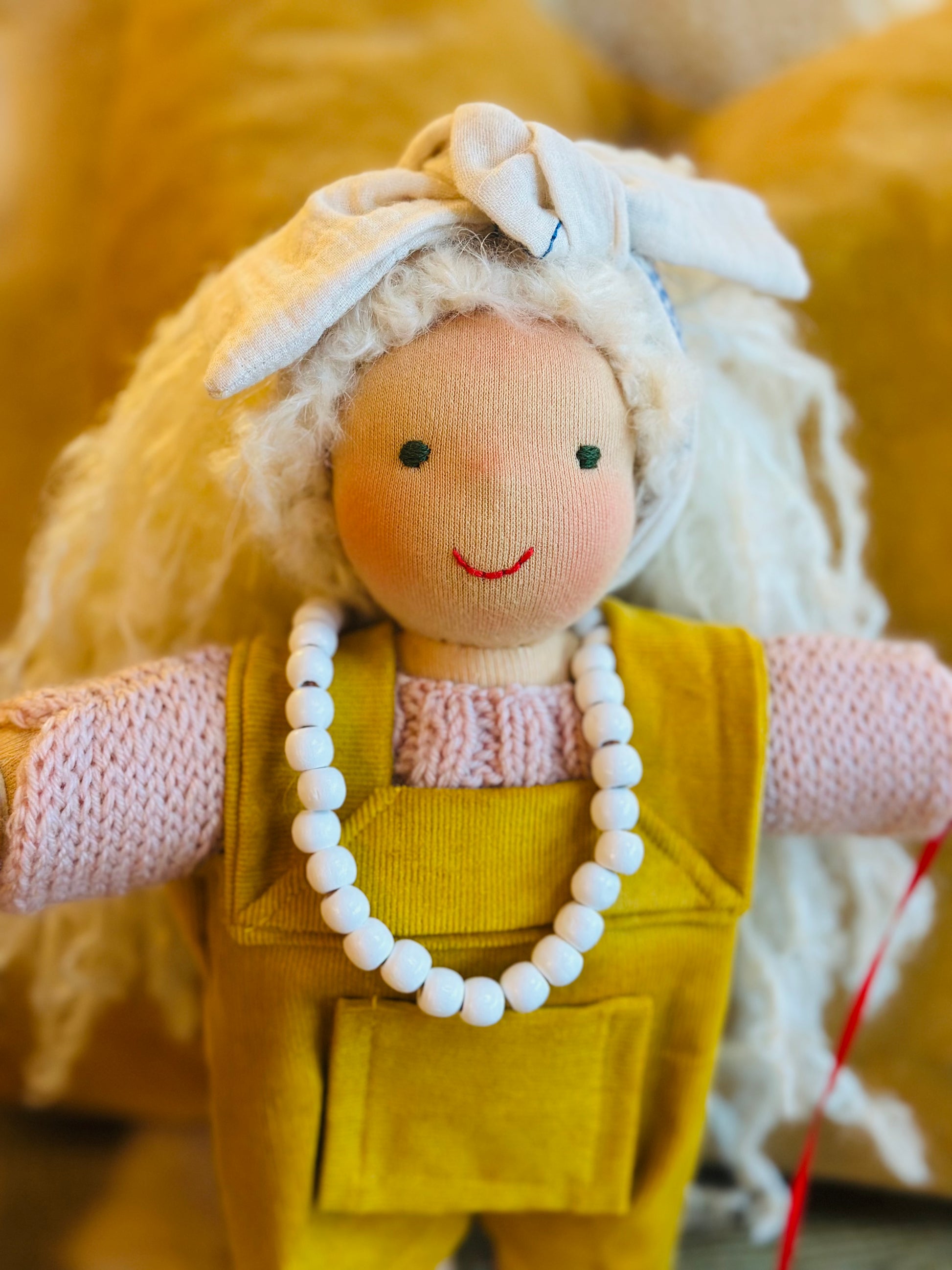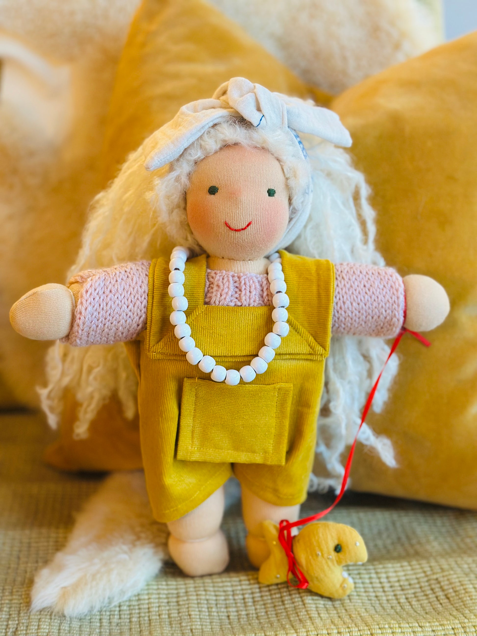 CHARLOTTE 🐠 ist ein kleines, ca. 33 cm großes, kuscheliges Waldorf-Puppenkind und ist gefüllt mit gesundem De Witte Engel OEKO-TEX ® zertifizierter Schafwolle.