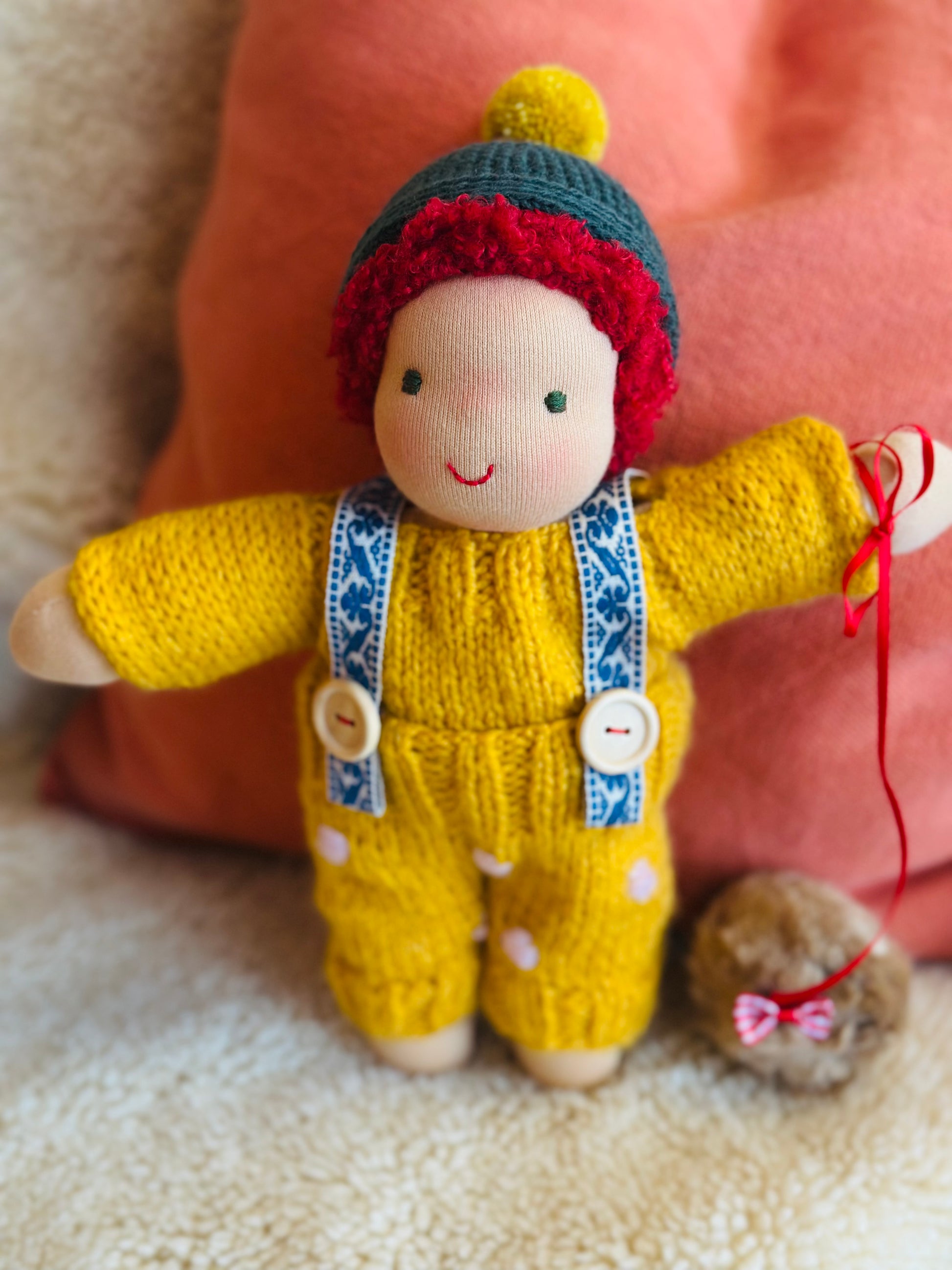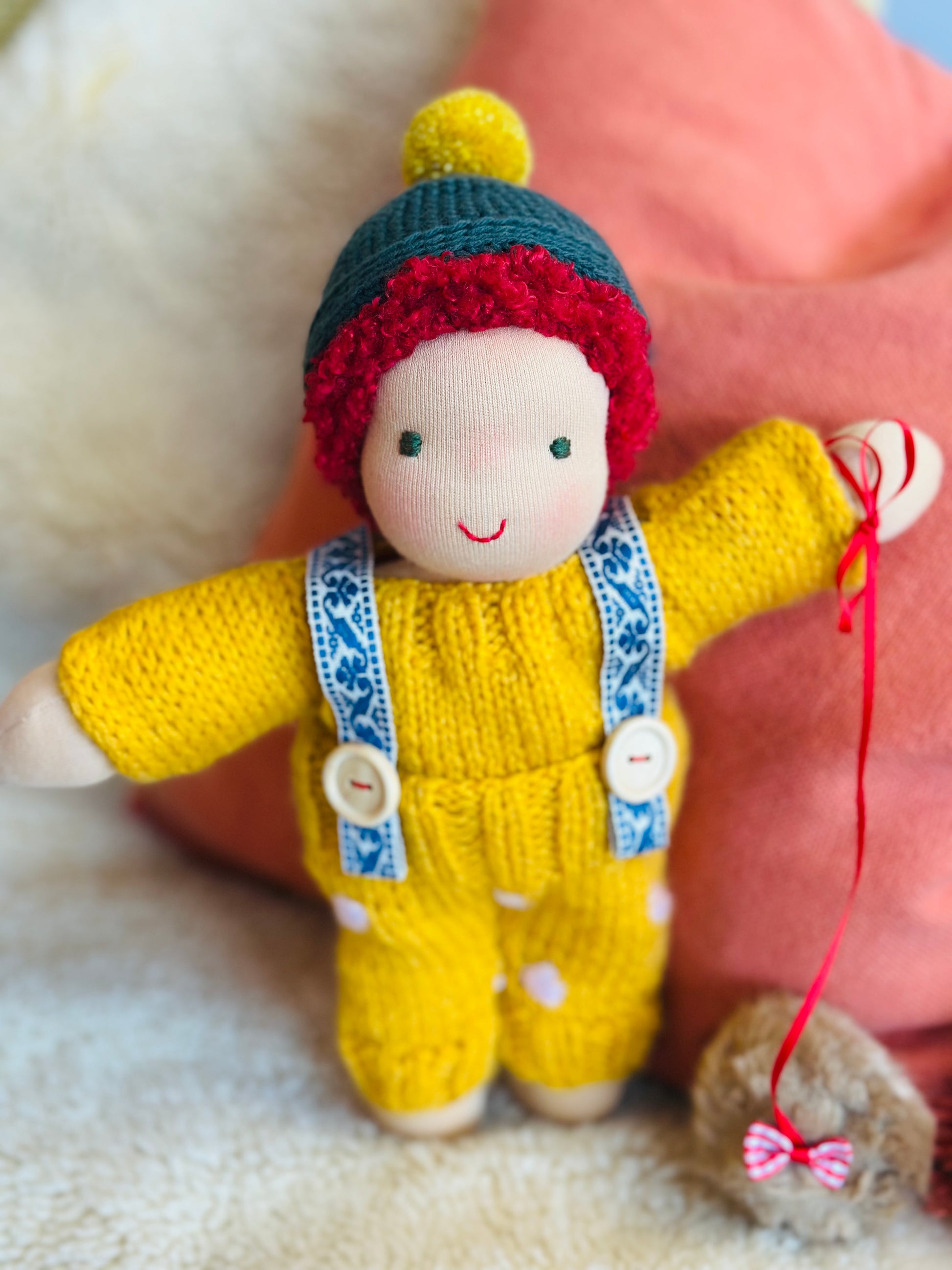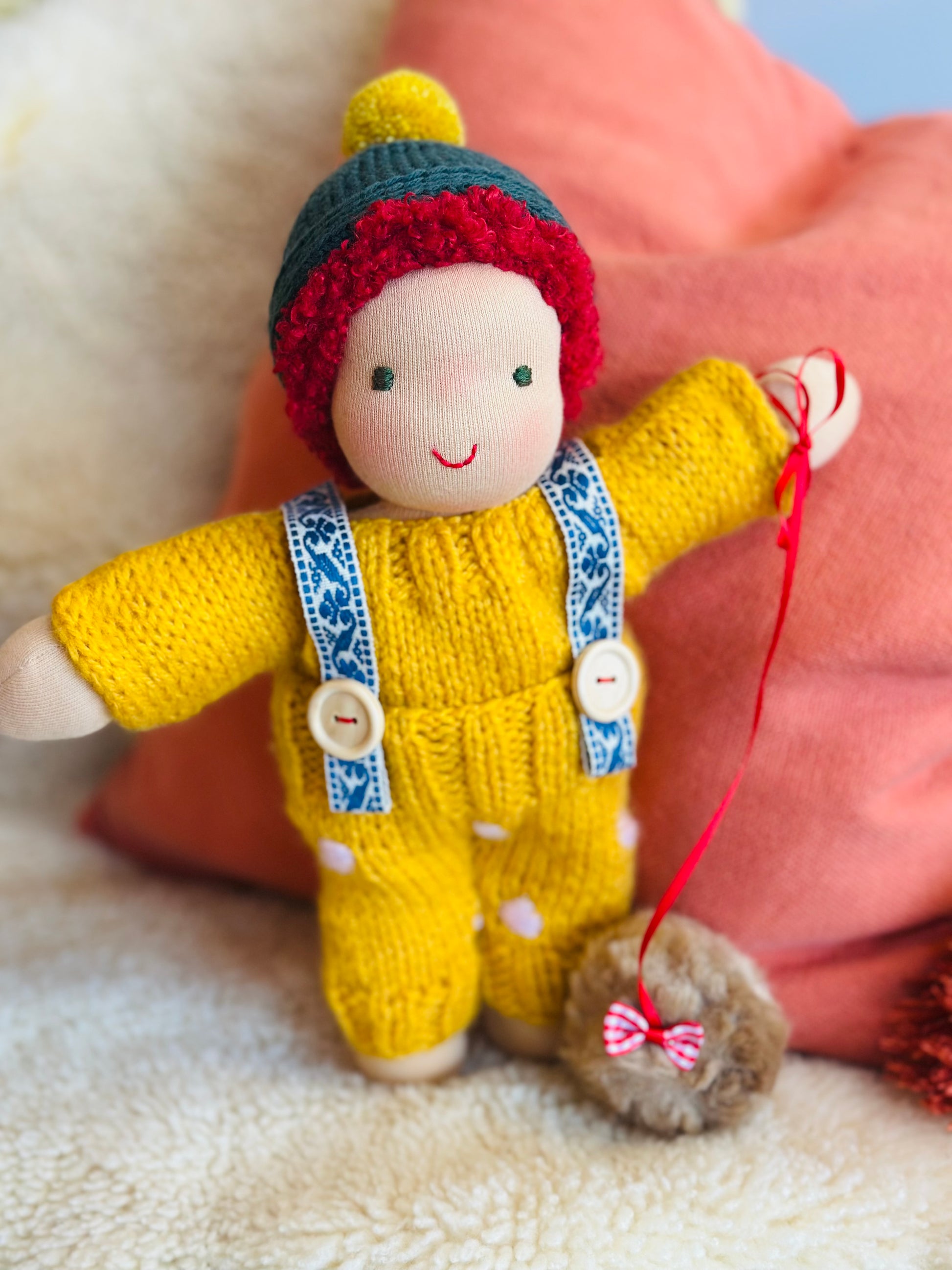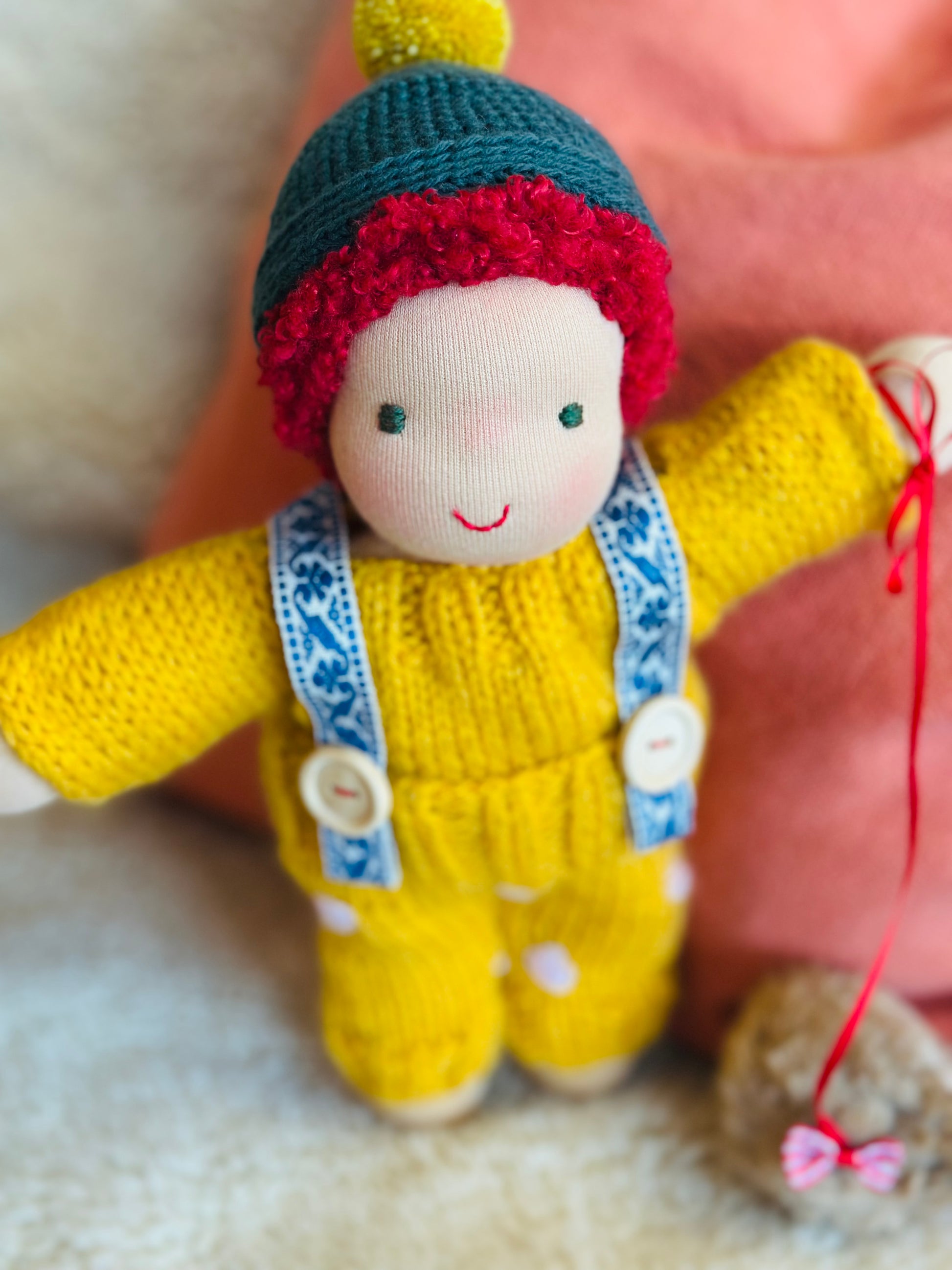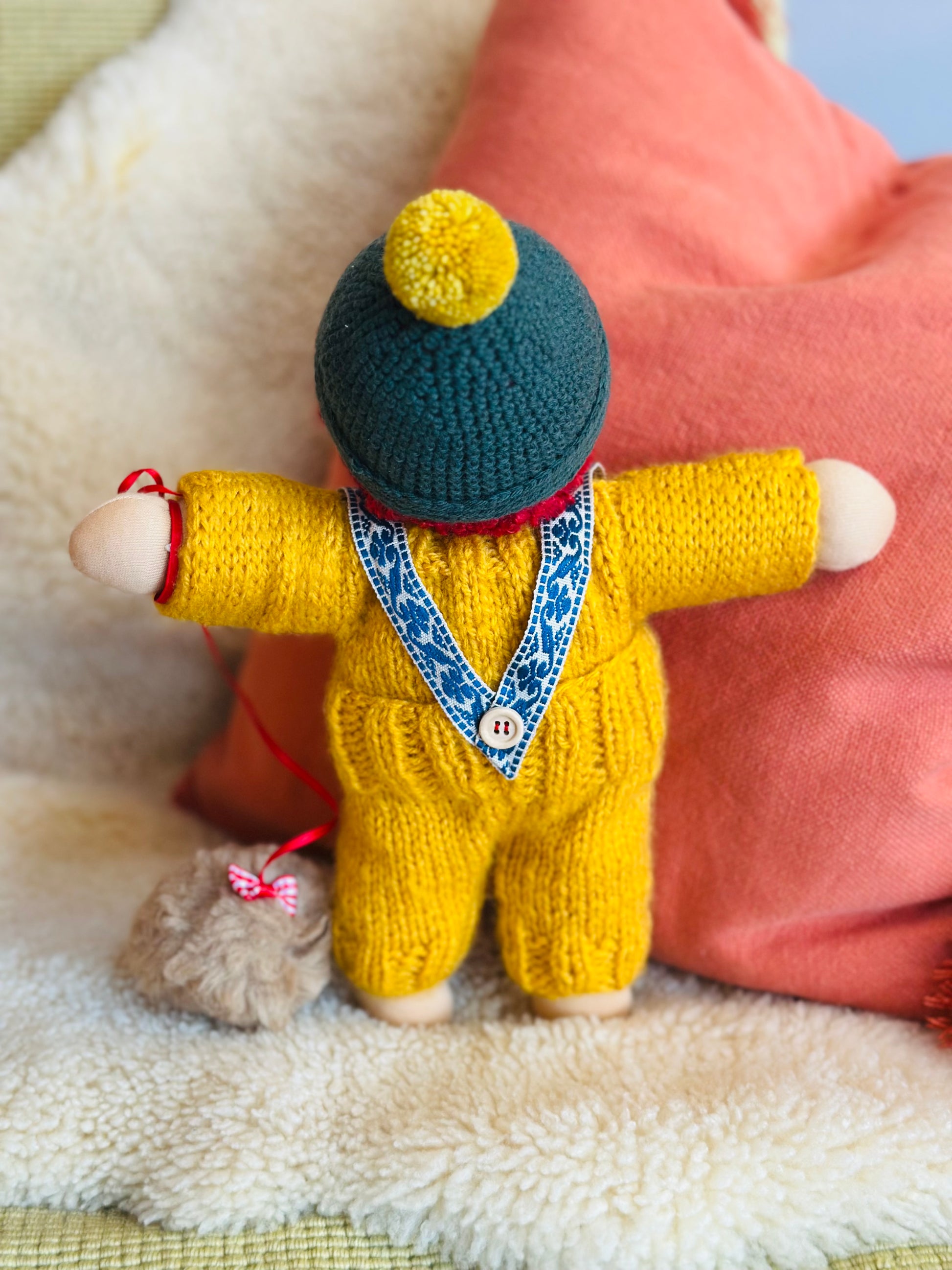 SWANTJE ist ein kleines, ca. 33 cm großes, kuscheliges Waldorf-Puppenkind und ist gefüllt mit gesundem De Witte Engel OEKO-TEX ® zertifizierter Schafwolle.