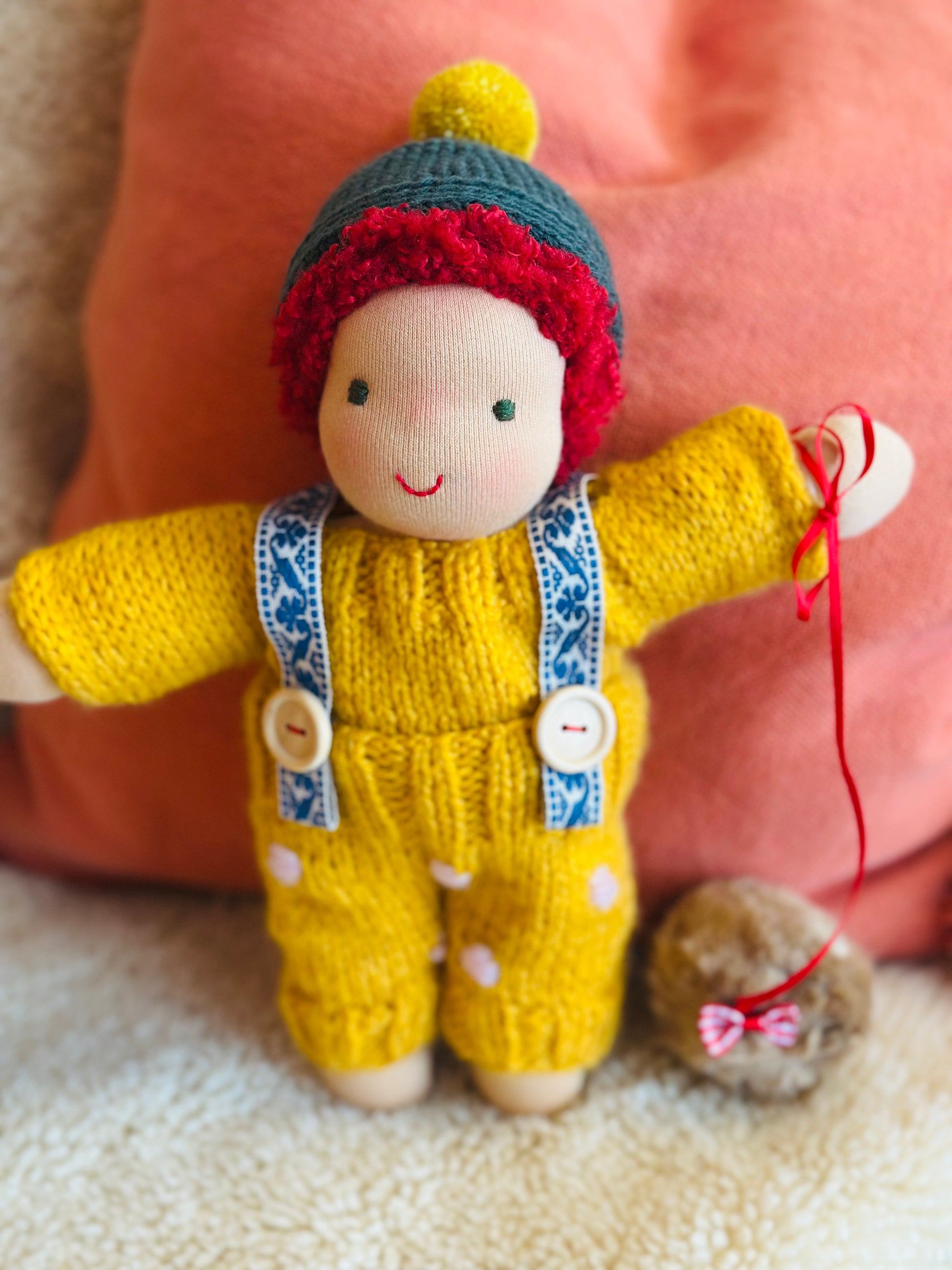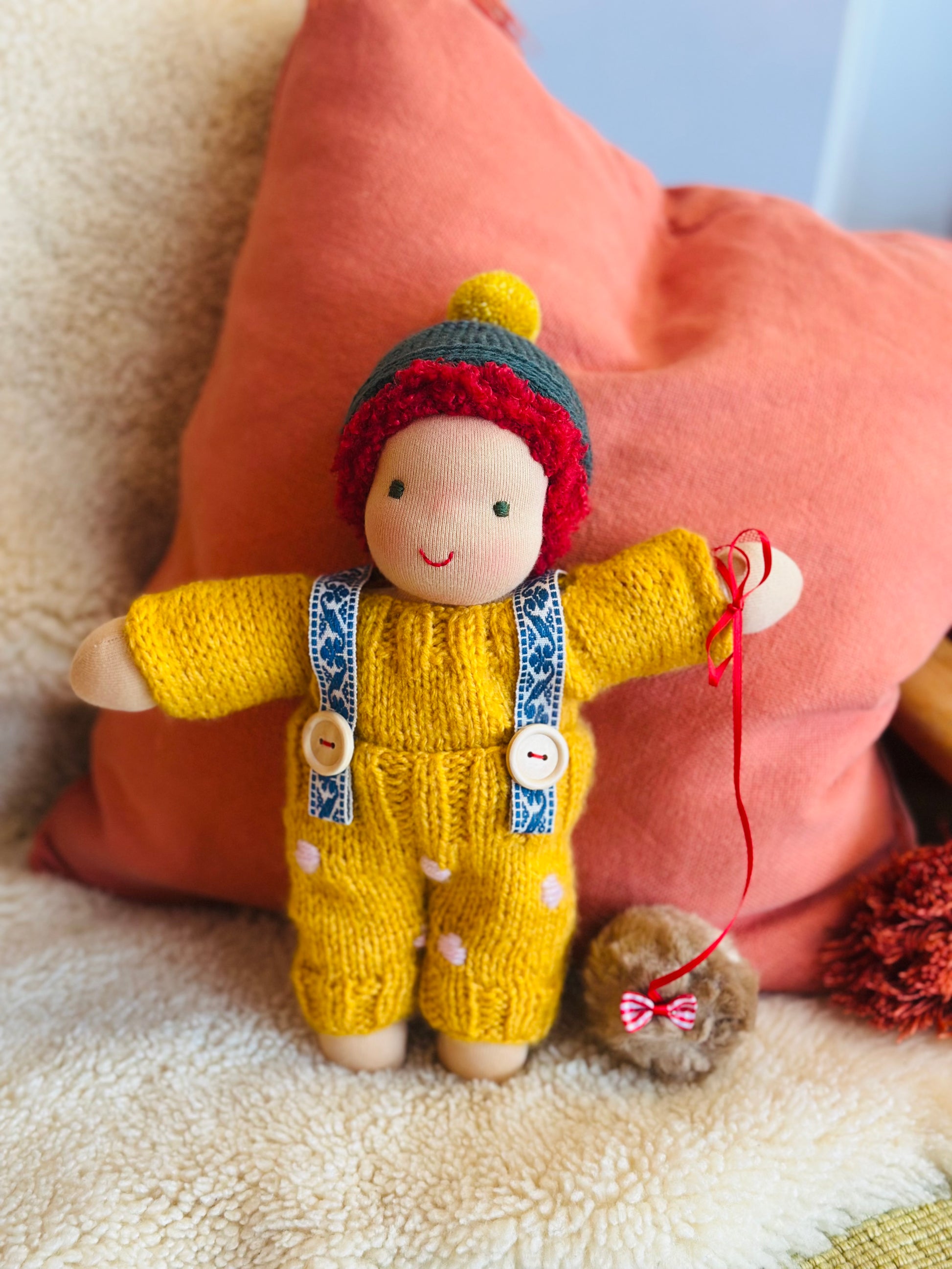Die Mohair-Locke besteht aus 74 % Mohair, 17 % Schurwolle und 9 % Polyamid und der Puppenjersey kommt von „Puppenstoffe“ aus der Schweiz ist OEKO-TEX® zertifiziert und super robust.
