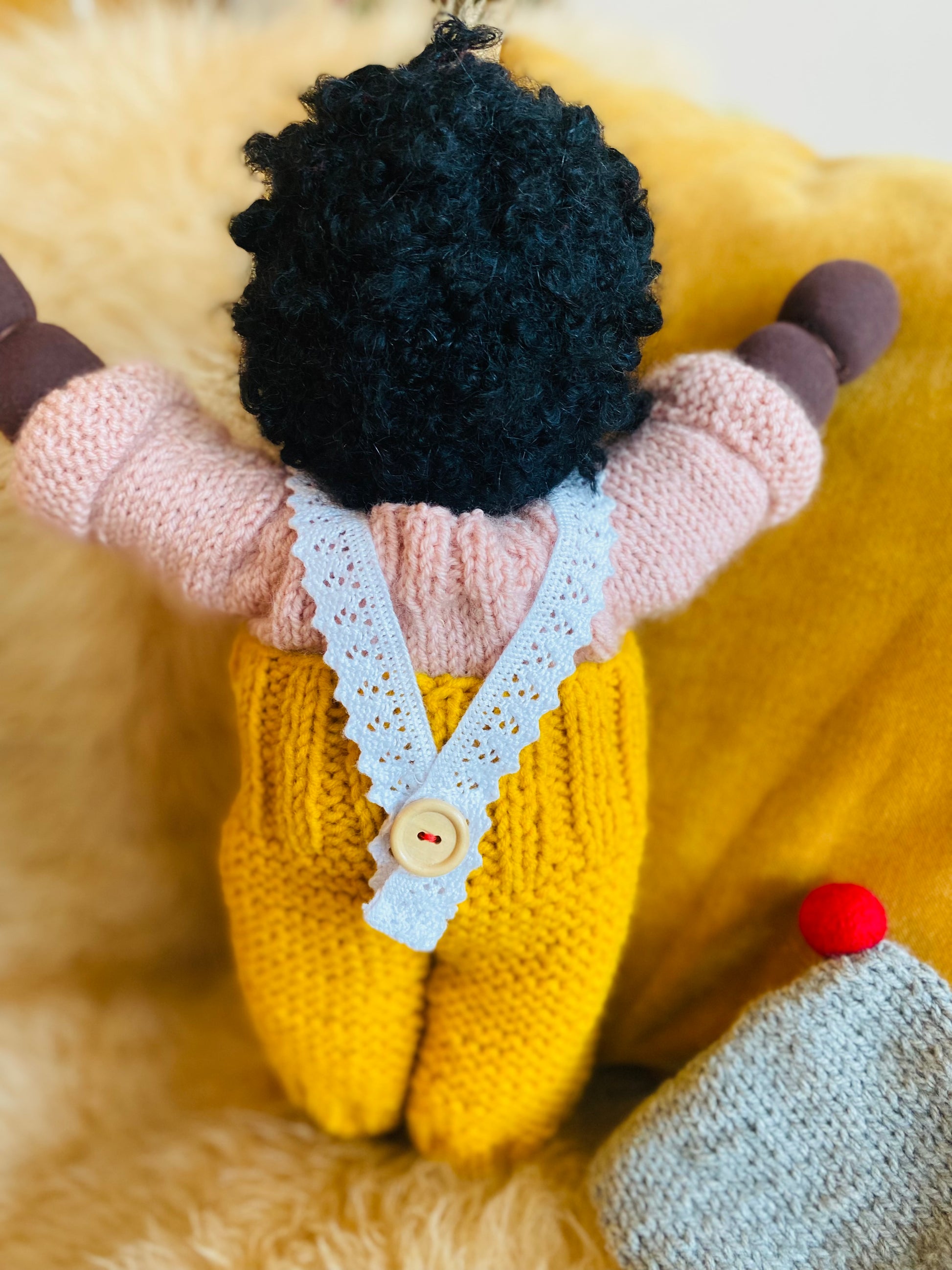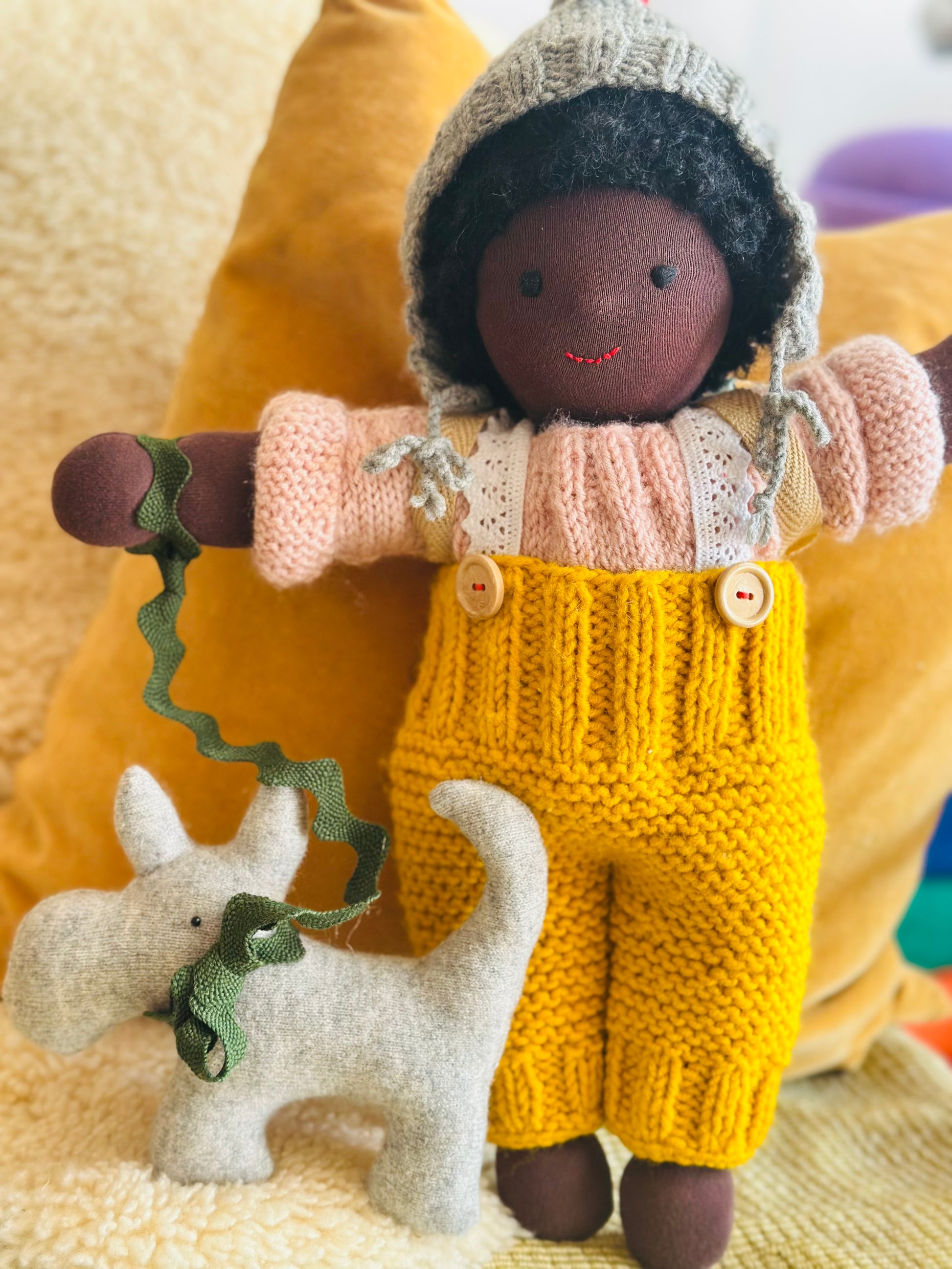 Die Mohair-Locke besteht aus 74% Mohair, 17% Schurwolle und 9% Polyamid und der Puppenjersey kommt von De Witte Engel, ist OEKO-TEX® zertifiziert und super robust.