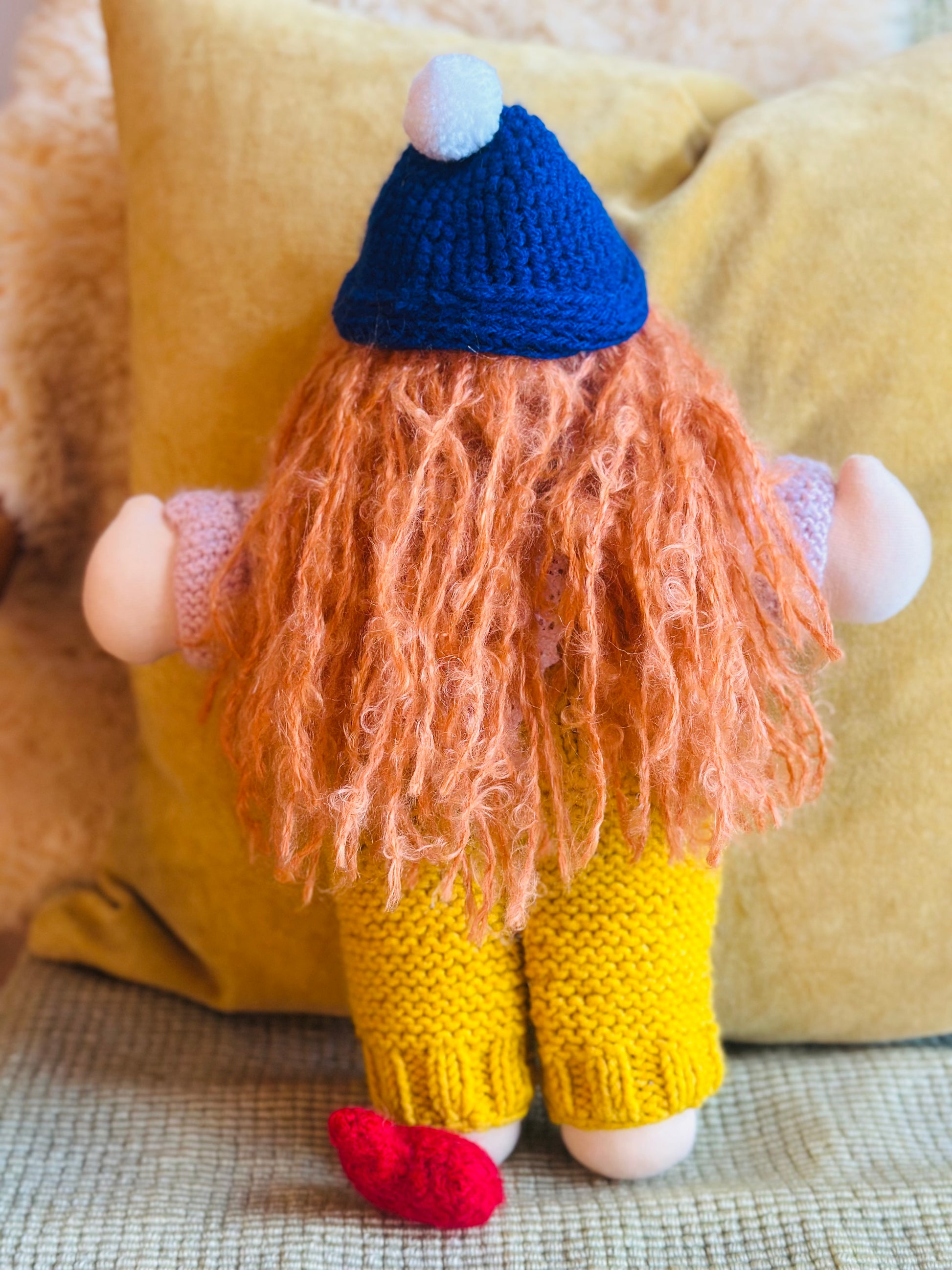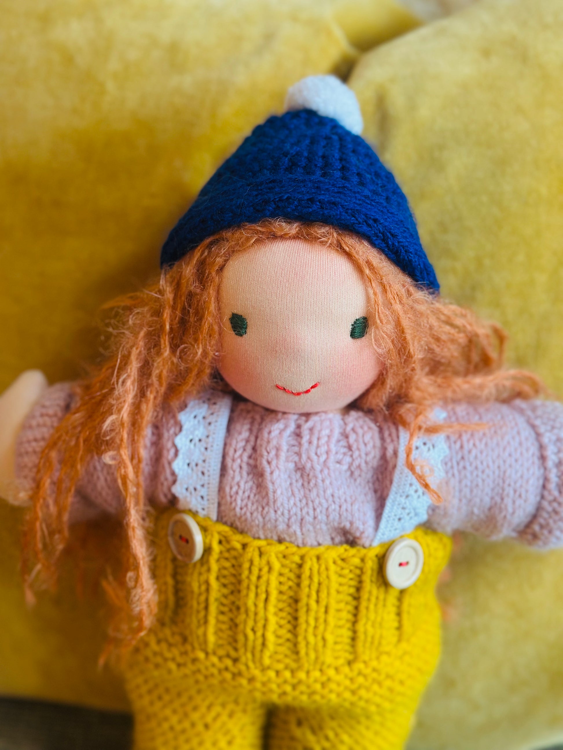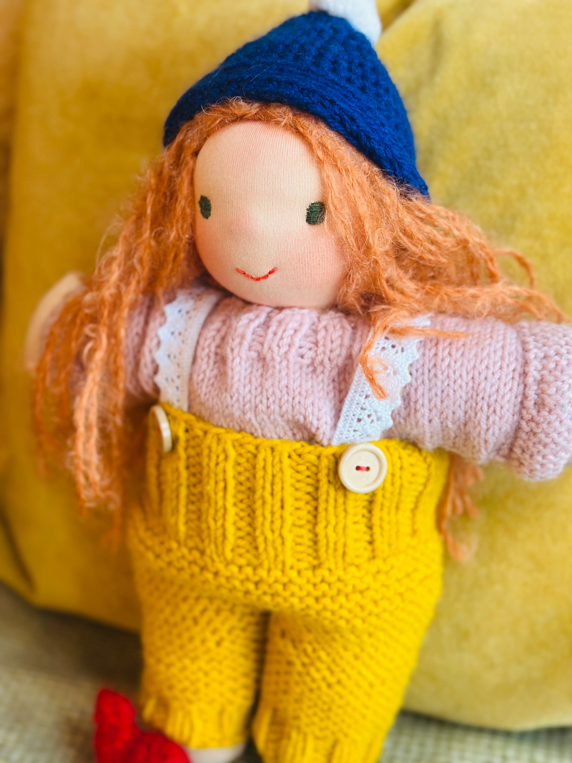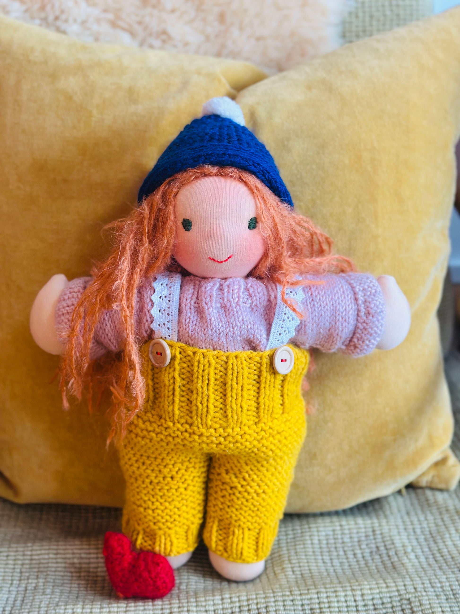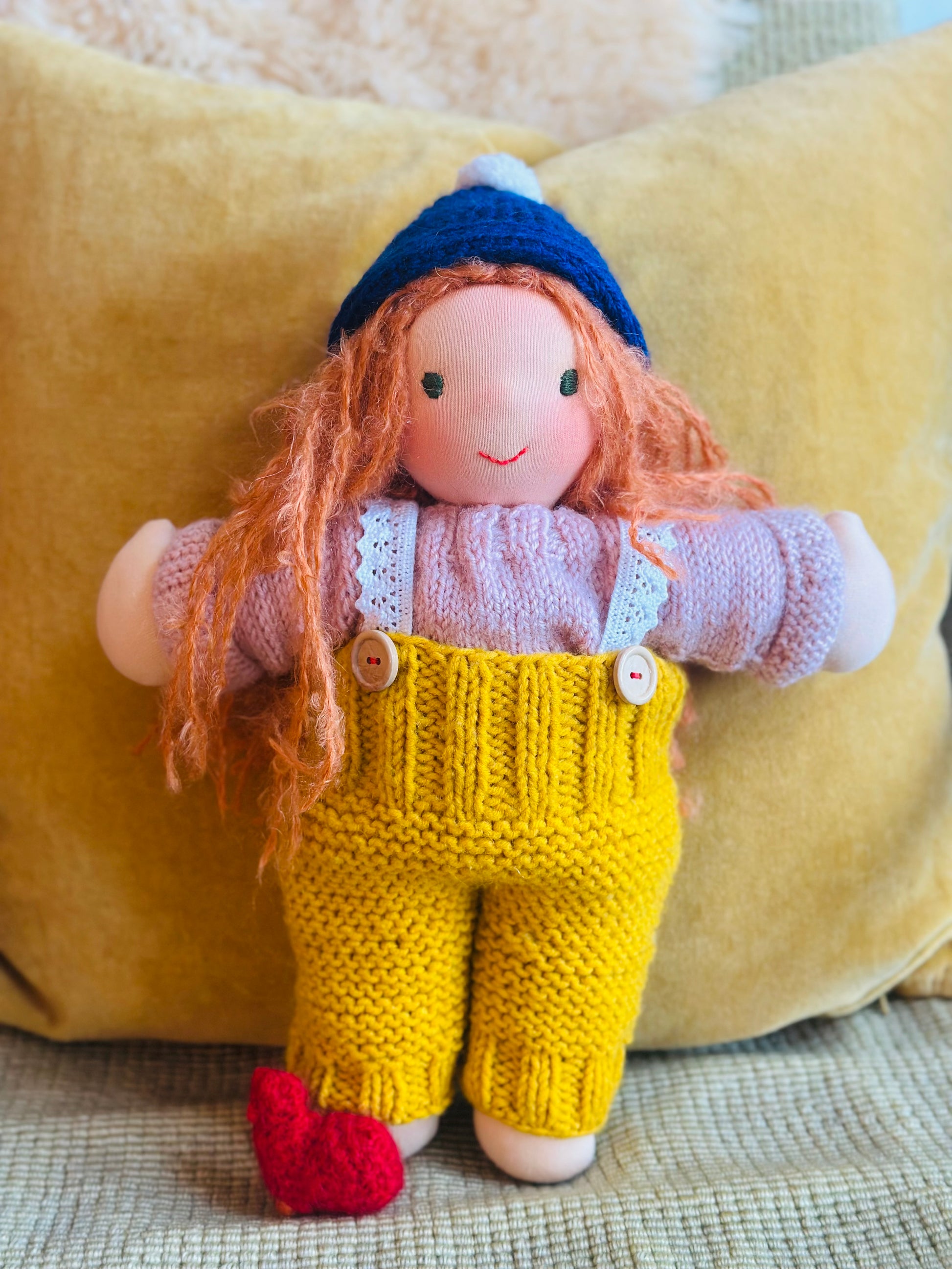 SENTA 🦩 ist ein kleines, ca. 33 cm großes, kuscheliges Waldorf-Puppenkind und ist gefüllt mit gesunder Bio zertifizierter Schafwolle.