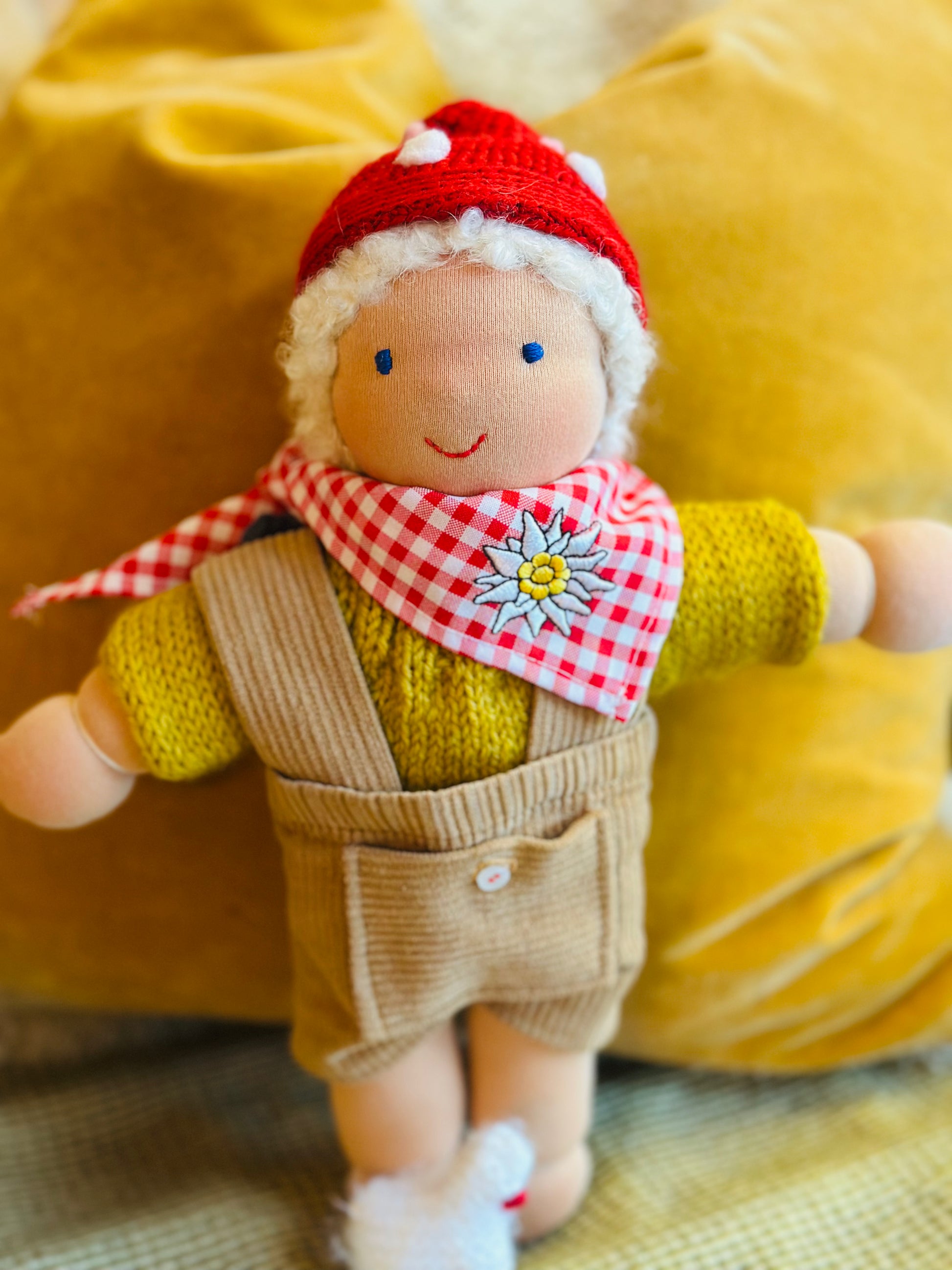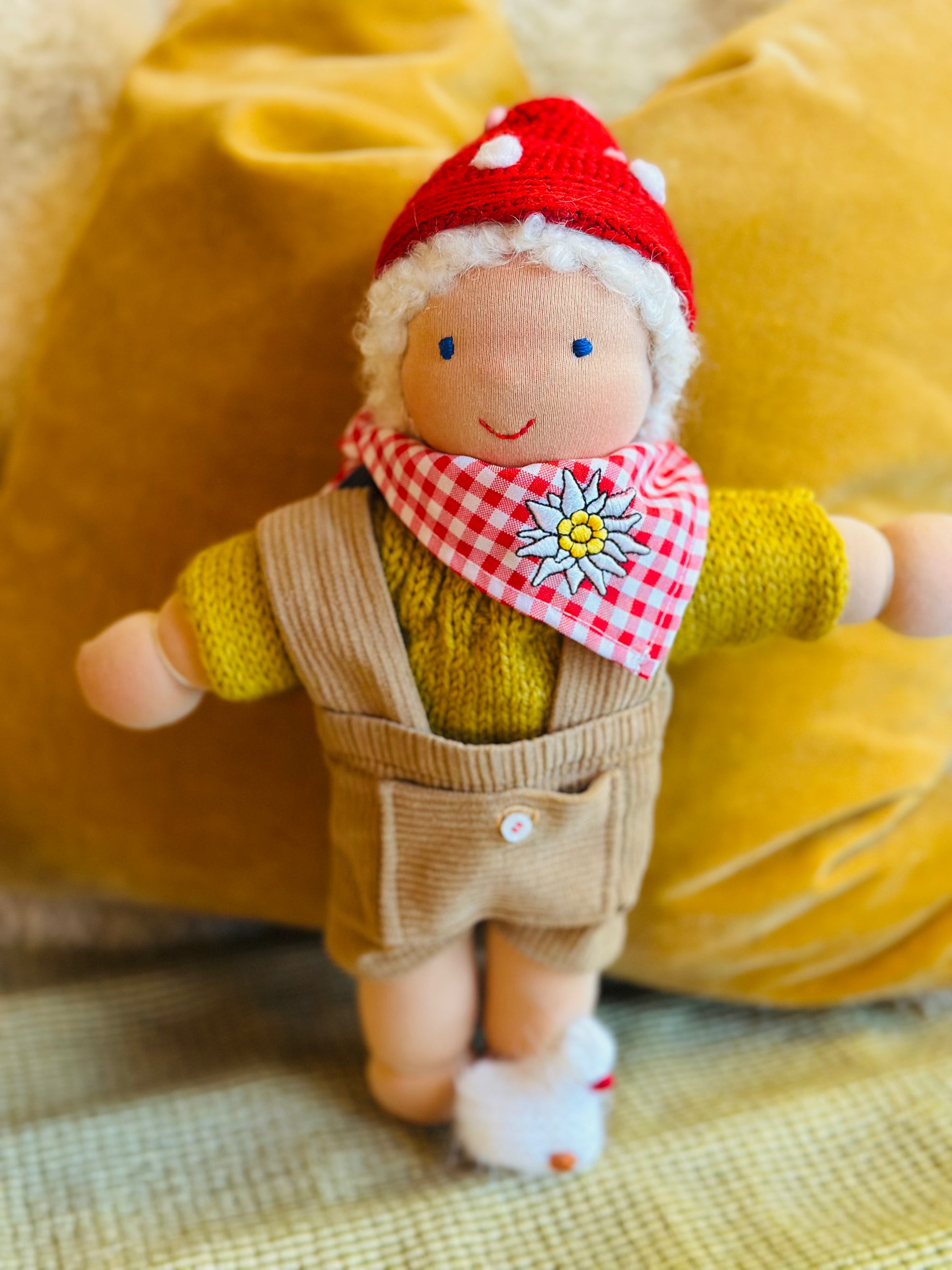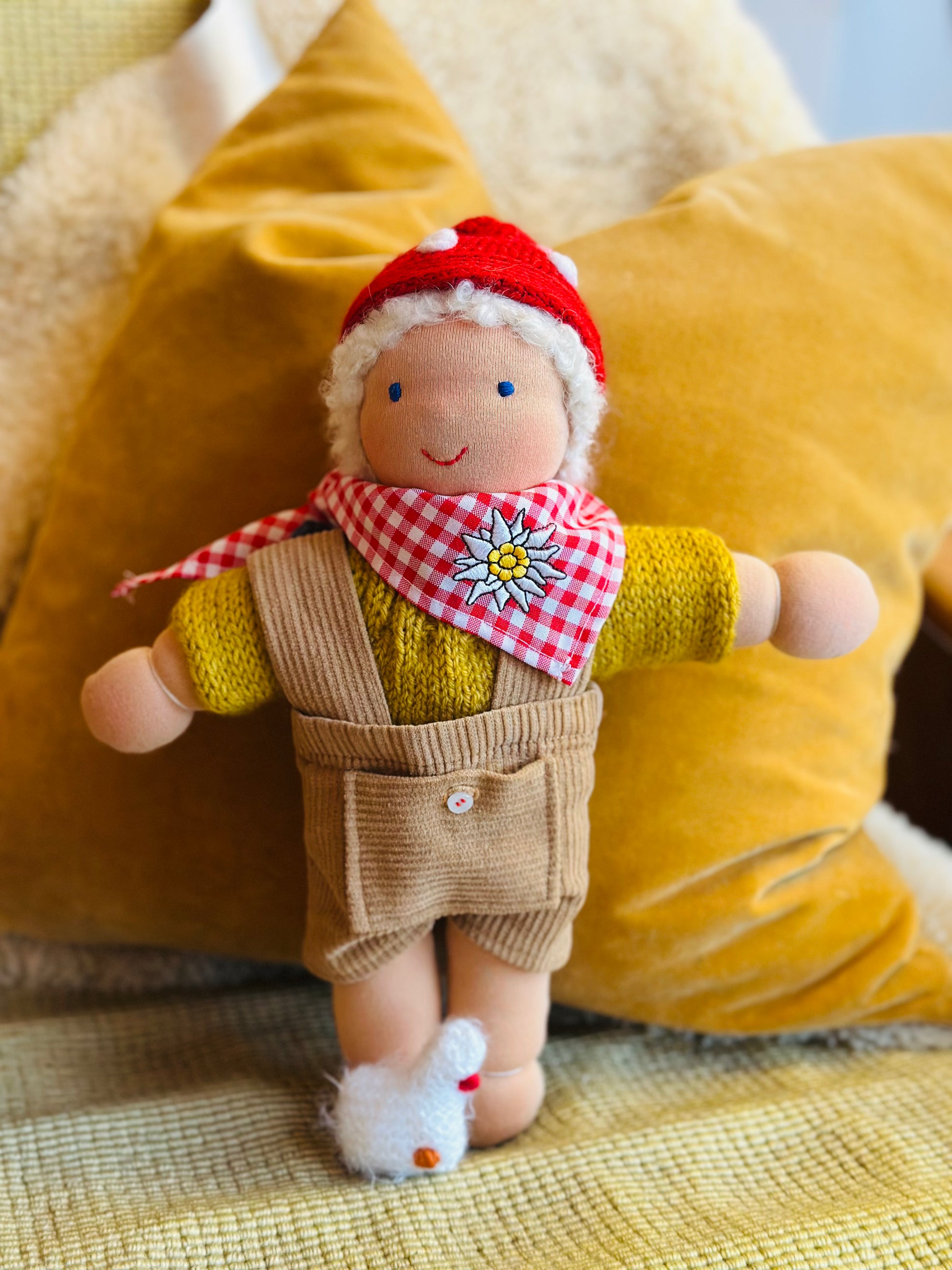 EMIL 🪿 ist ein kleines, ca. 33 cm großes, kuscheliges Waldorf-Puppenkind und ist gefüllt mit gesunder De Witte Engel OEKO-TEX® zertifizierter Schafwolle.