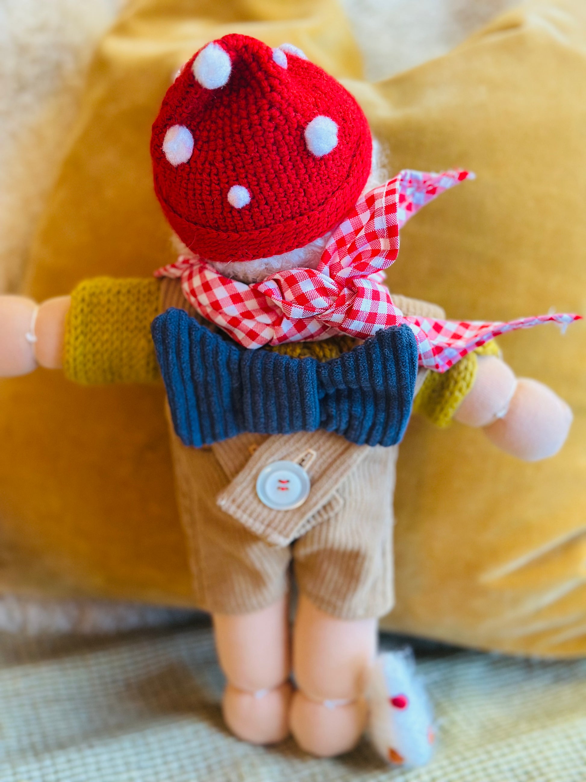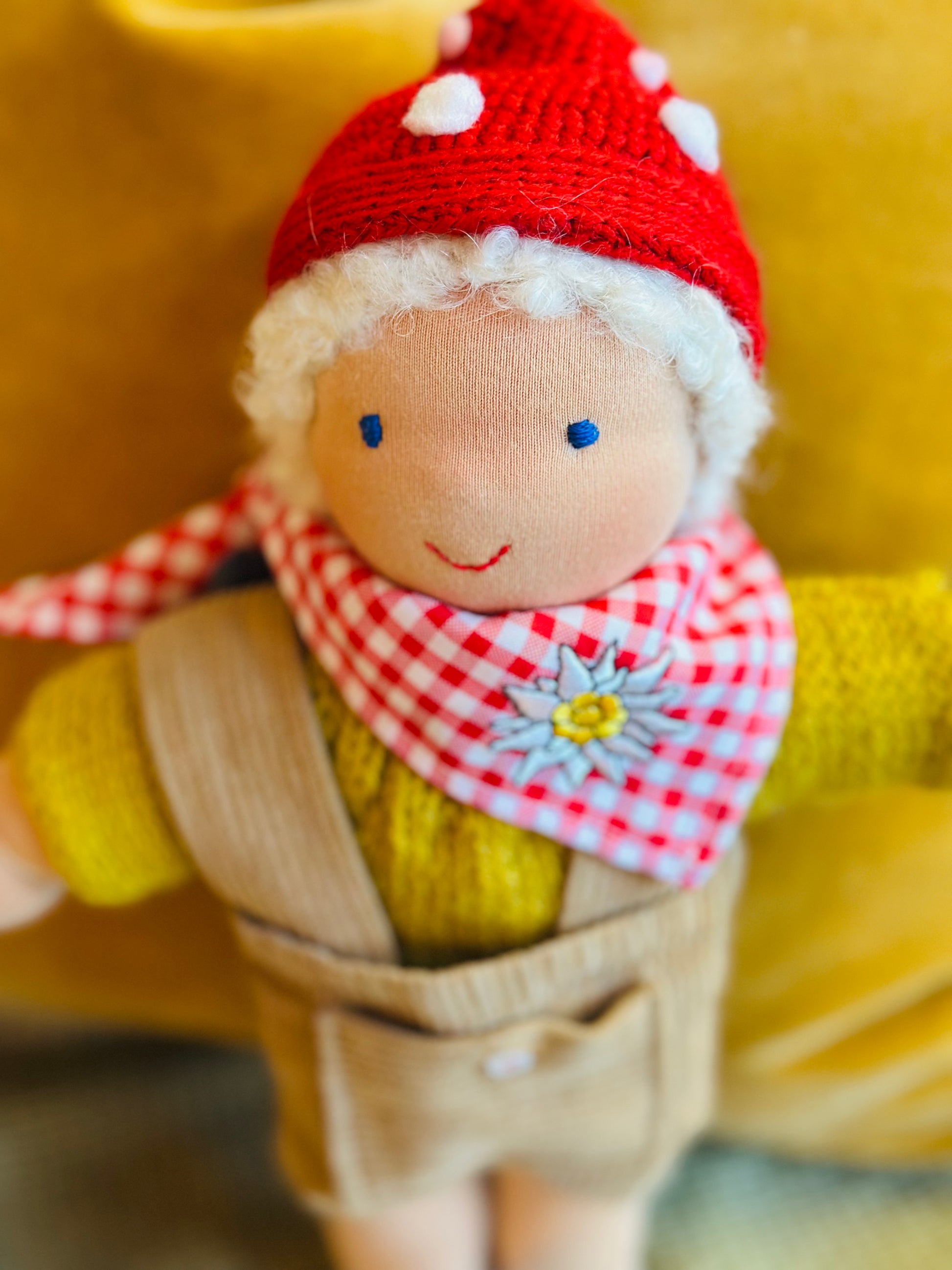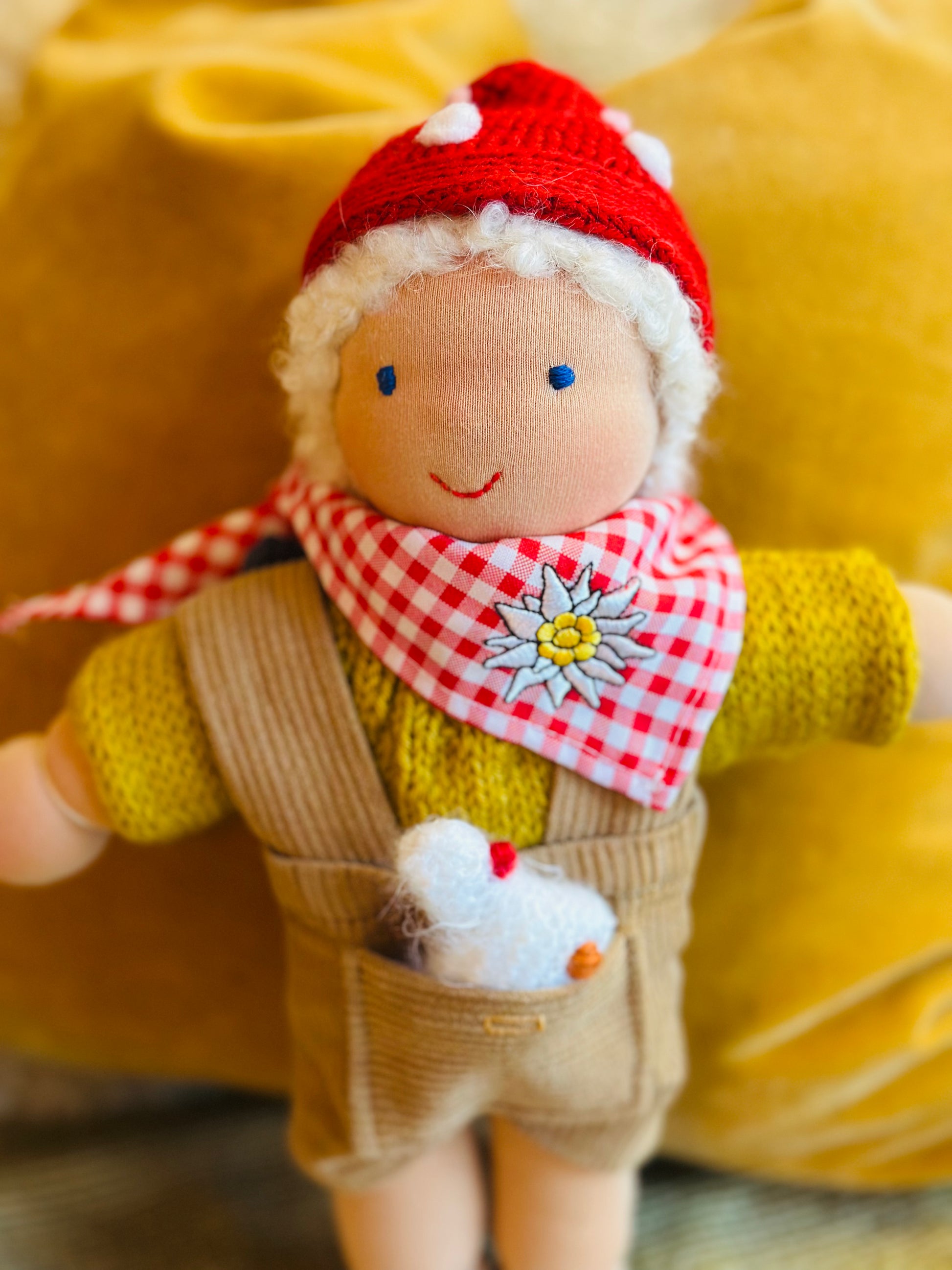 EMIL 🪿 ist ein kleines, ca. 33 cm großes, kuscheliges Waldorf-Puppenkind und ist gefüllt mit gesunder De Witte Engel OEKO-TEX® zertifizierter Schafwolle.