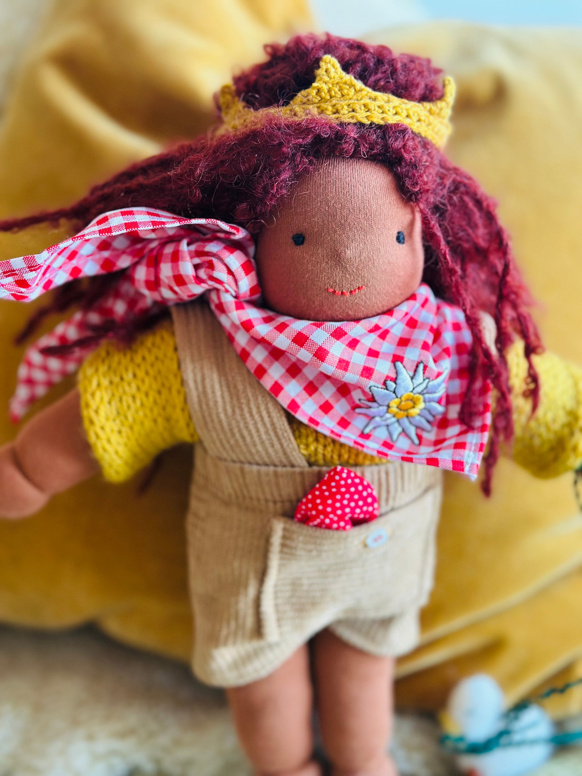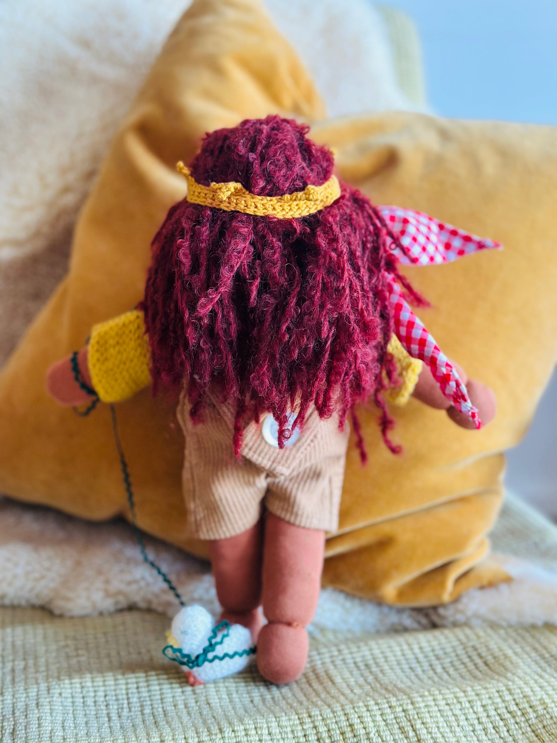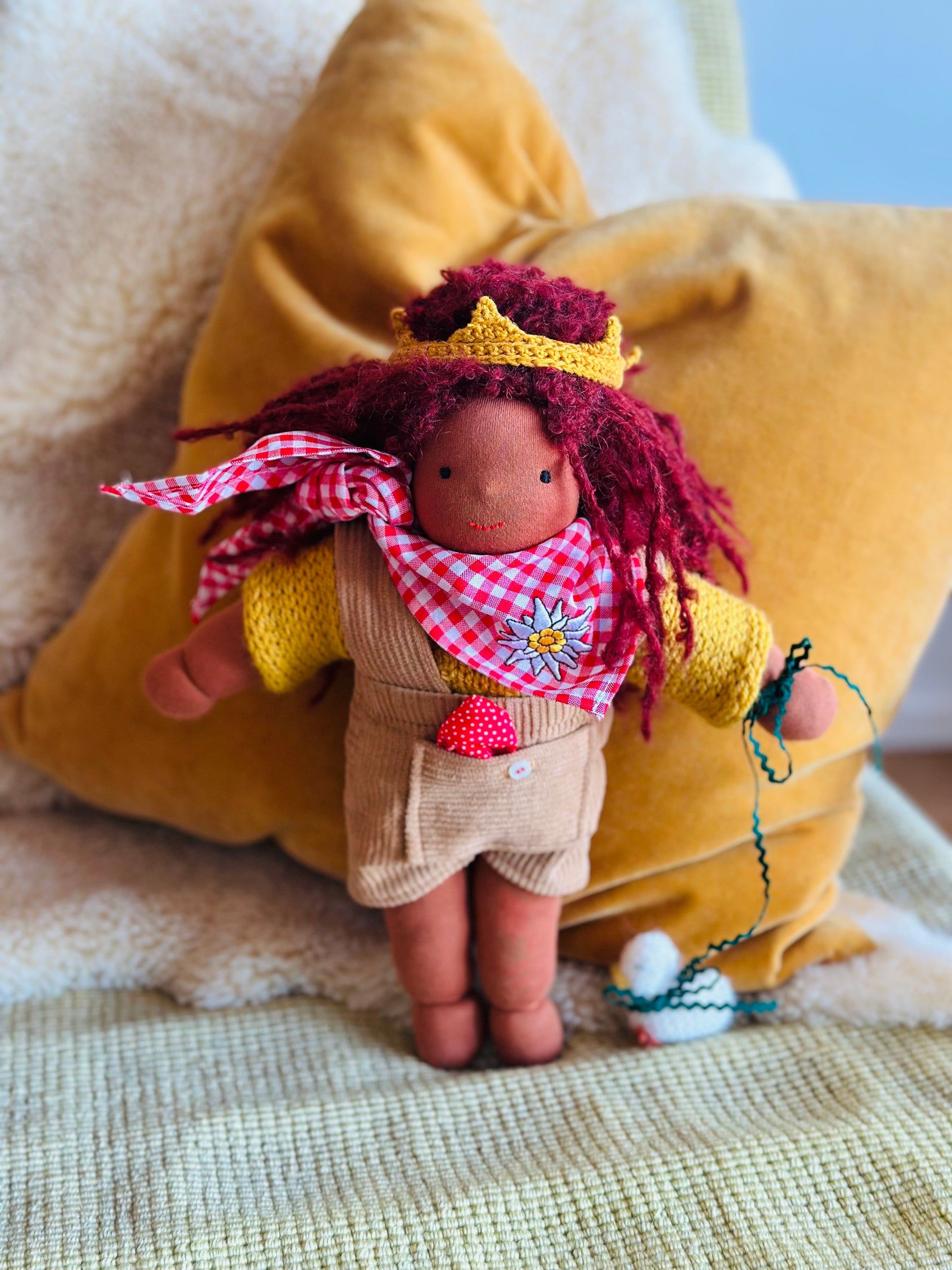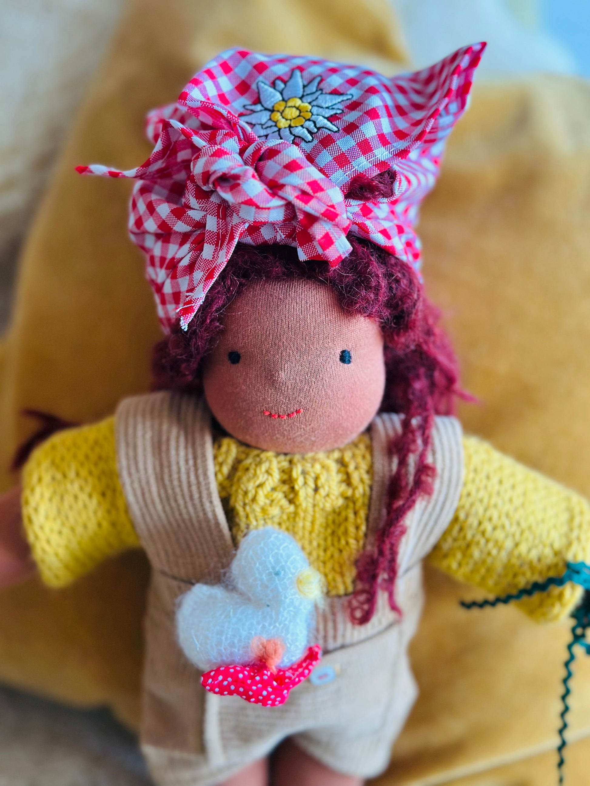EMMA 🪻 ist ein kleines, ca. 33 cm  großes, kuscheliges Waldorf-Puppenkind und ist gefüllt mit gesundem De Witte Engel OEKO-TEX® zertifizierter  Schafwolle.