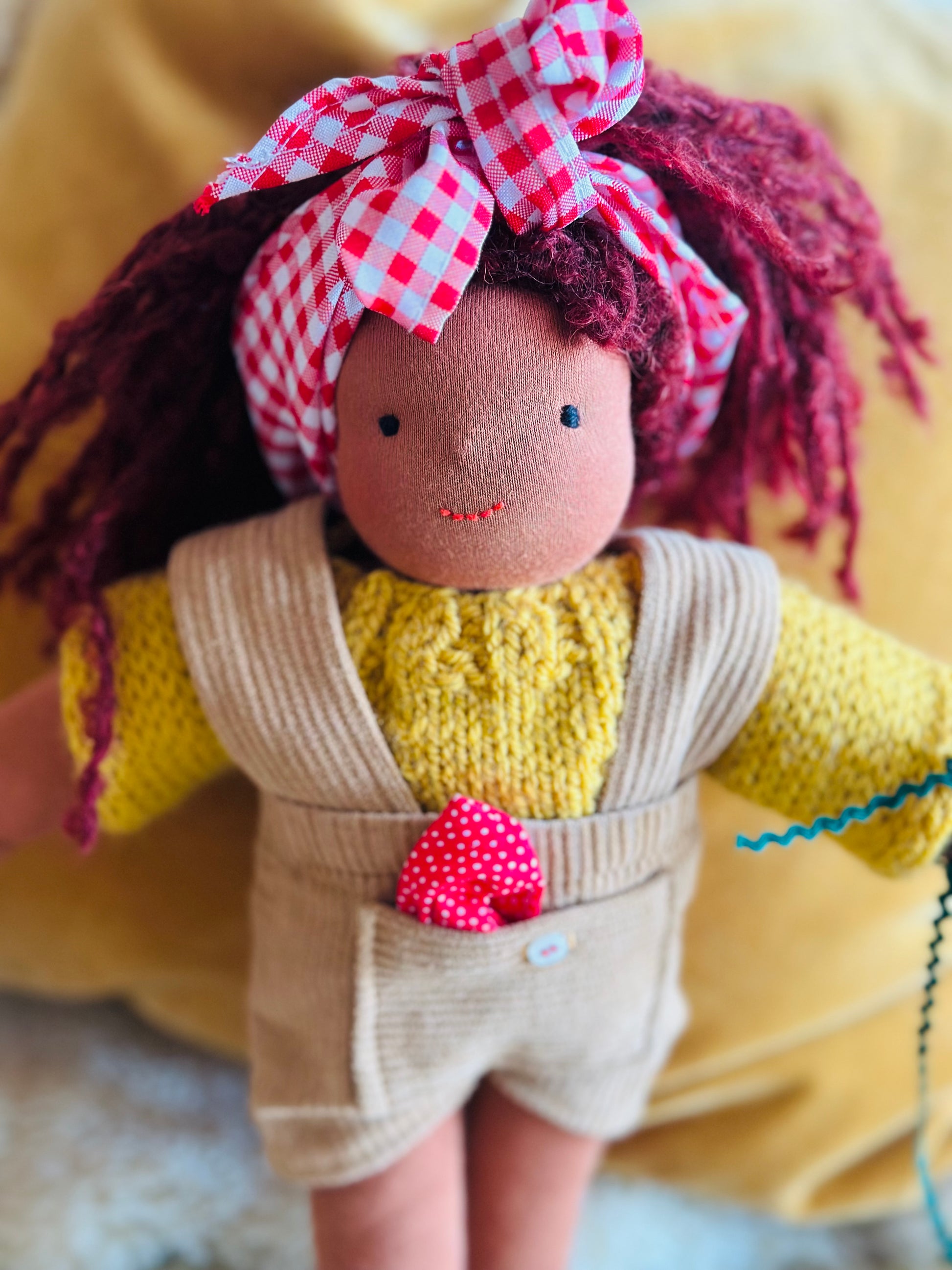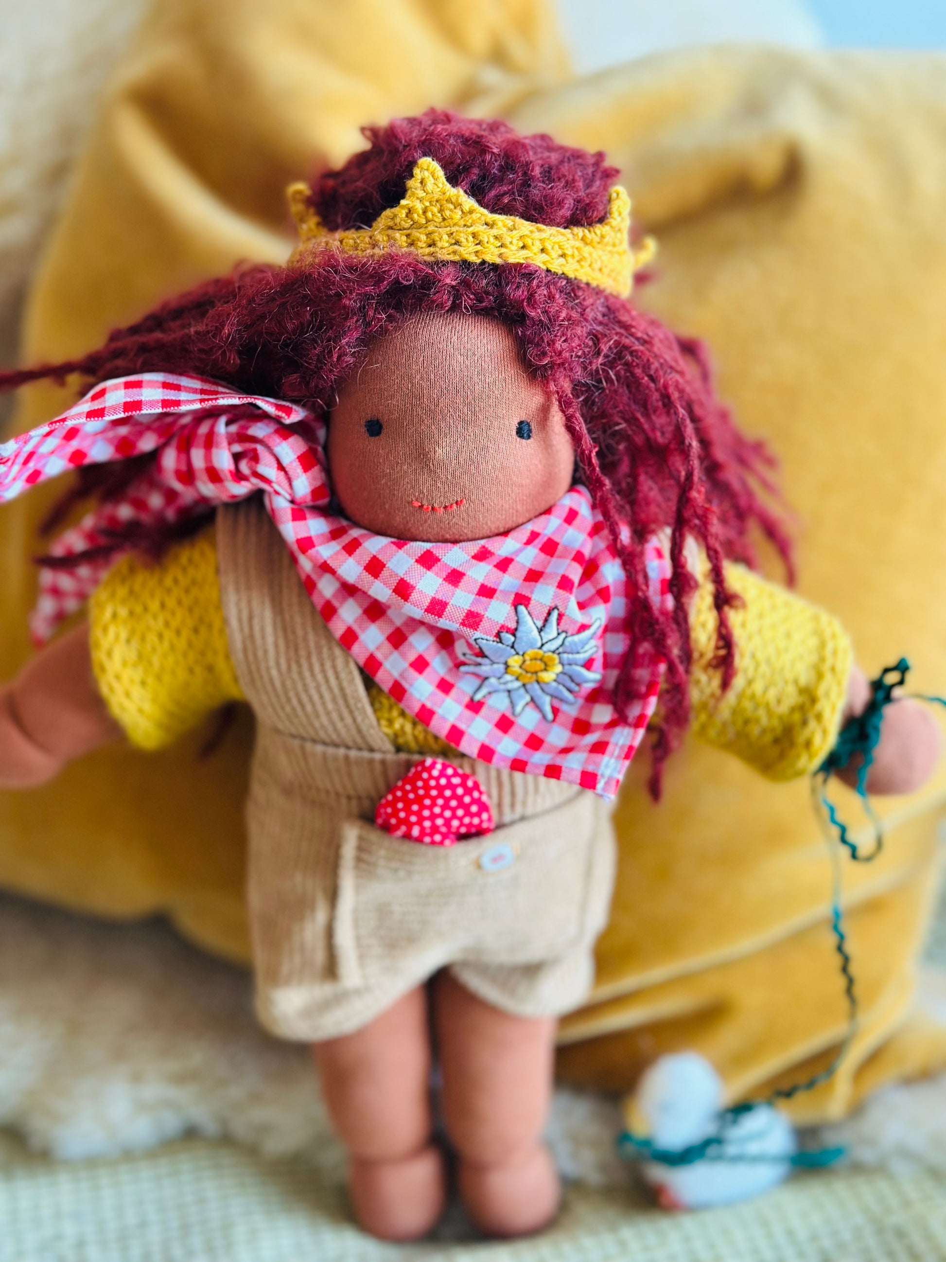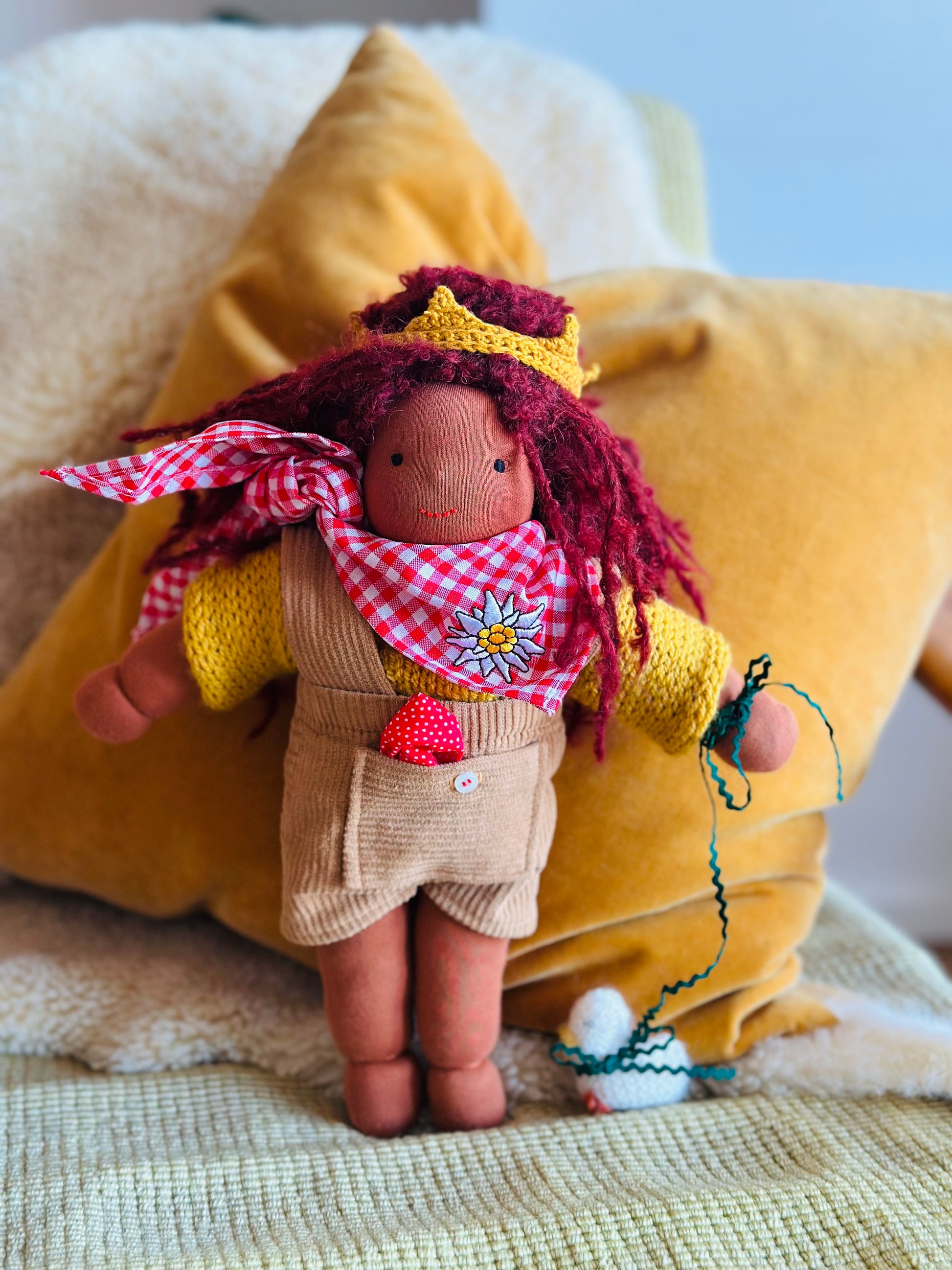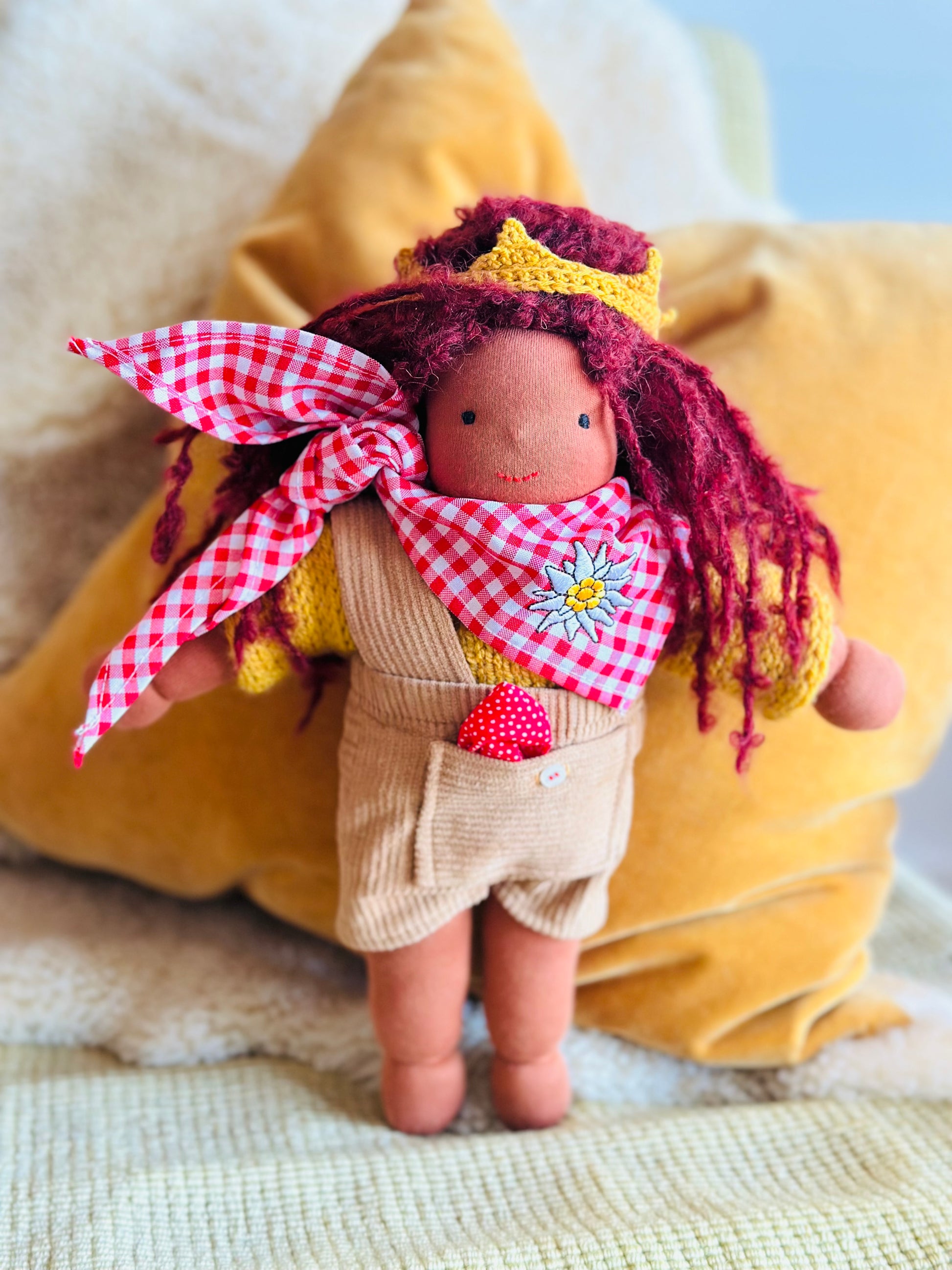 Die Mohair-Locke besteht aus 74 % Mohair, 17 % Schurwolle und 9 % Polyamid und der Puppenjersey kommt von De Witte Engel ist OEKO-TEX® und EN71 zertifiziert und ist super robust.Â
