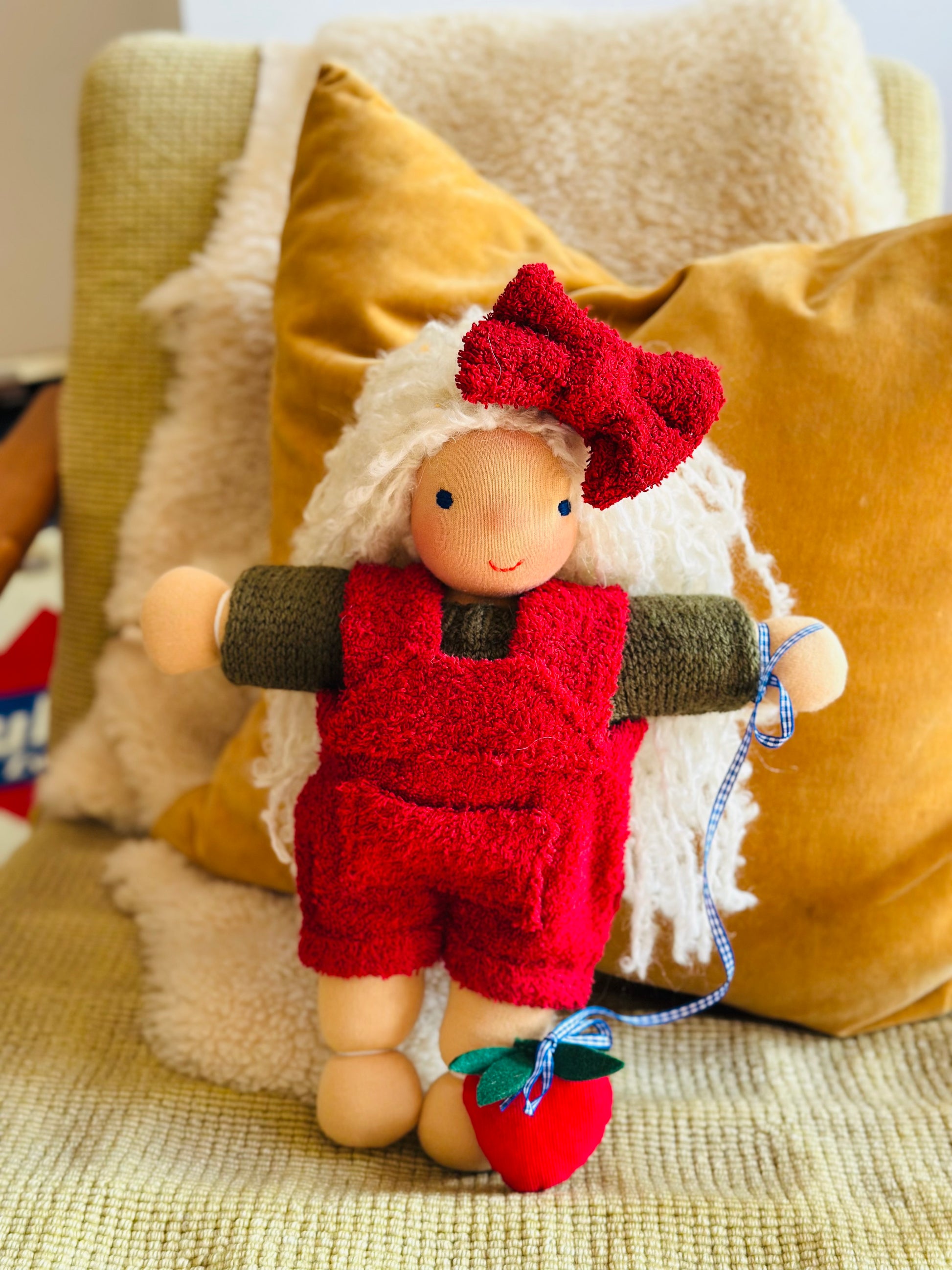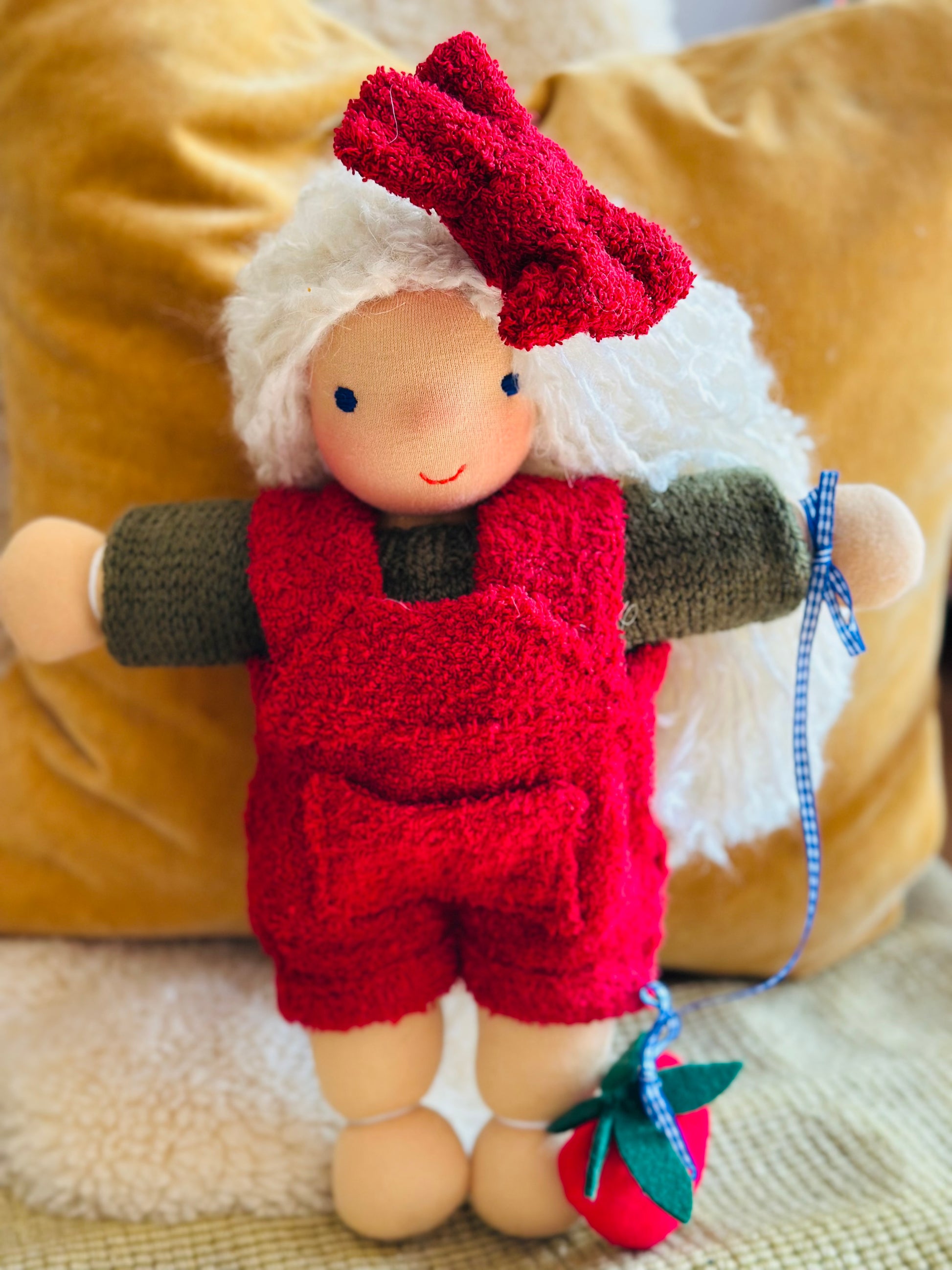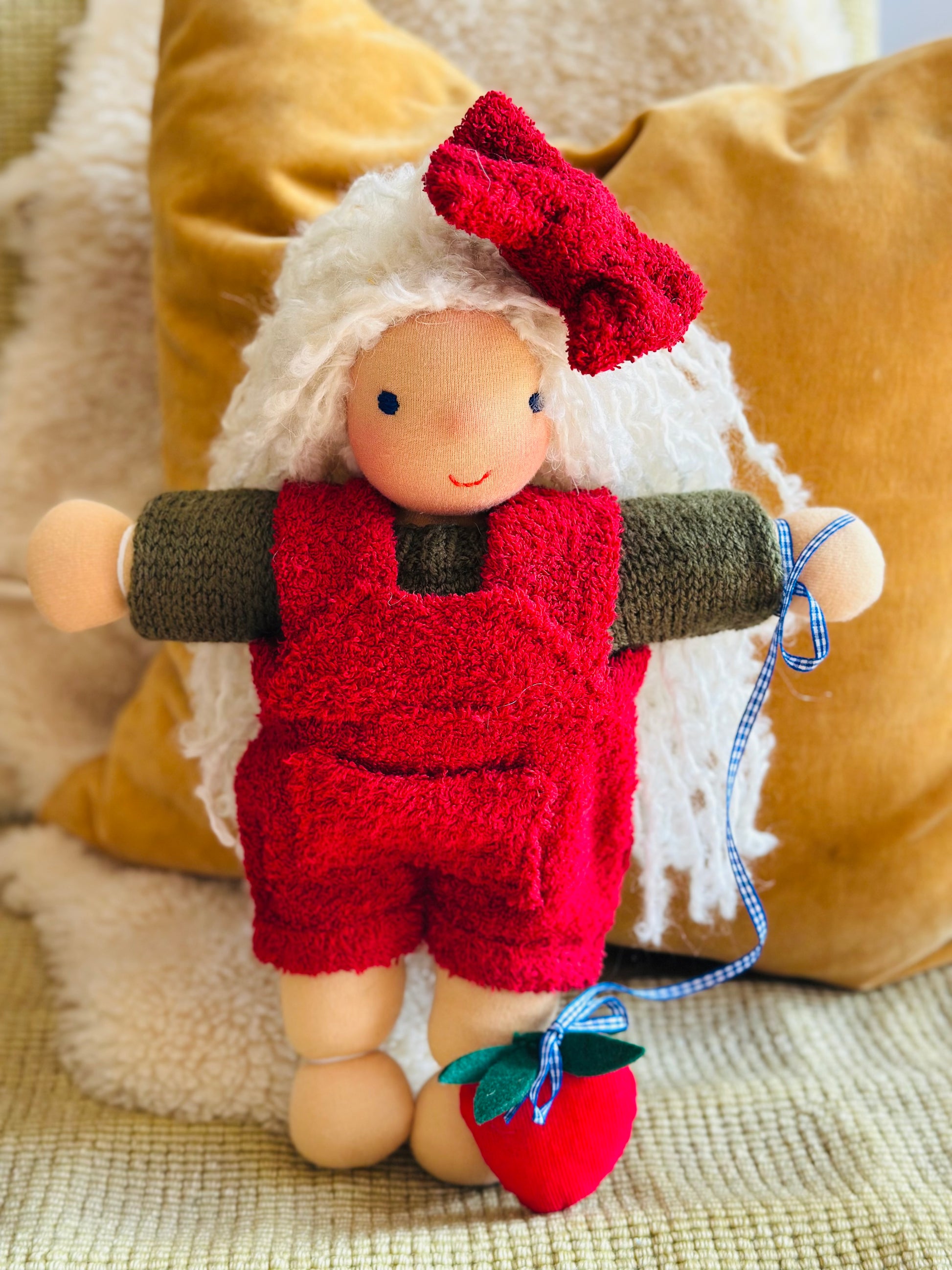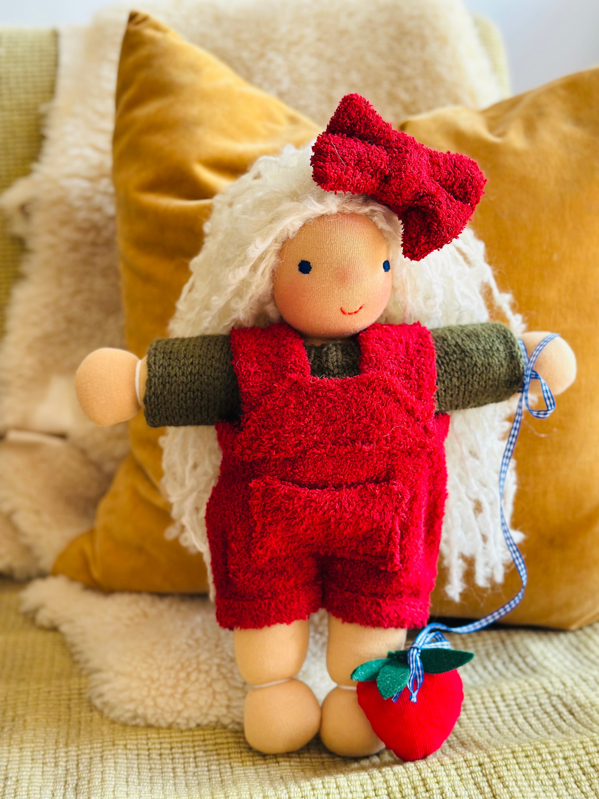ERDBEERINCHEN 🍓 ist ein kleines, ca. 33 cm großes, kuscheliges Waldorf-Puppenkind und ist gefüllt mit gesunder Bio zertifizierter Schafwolle.