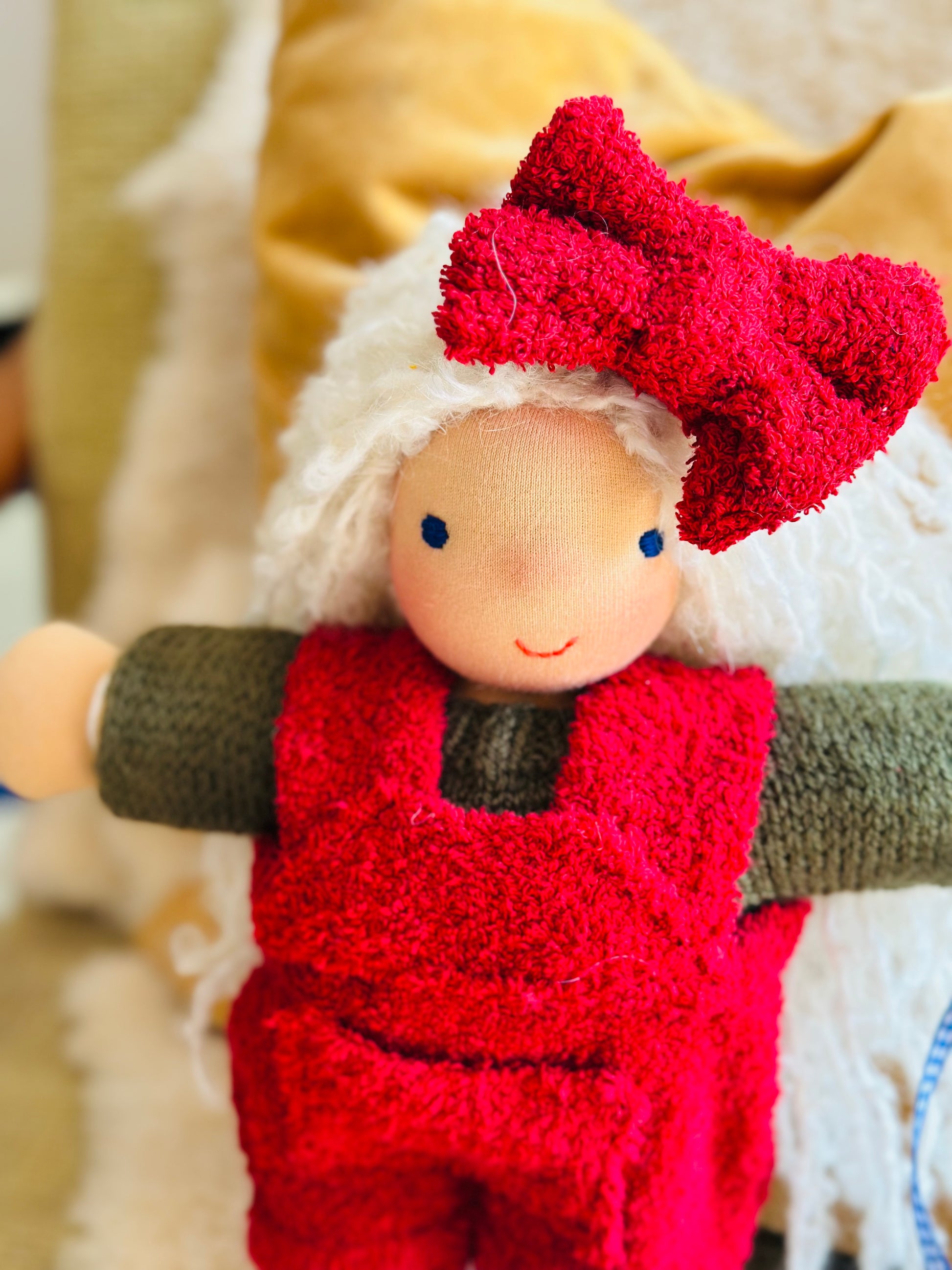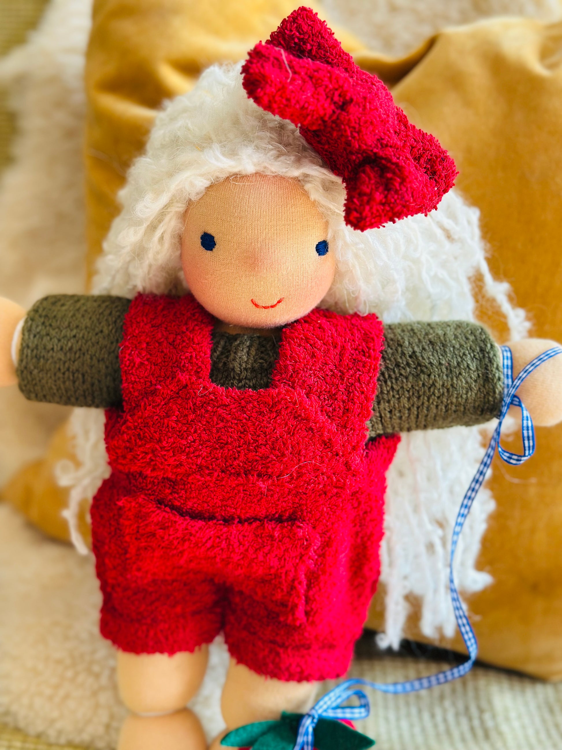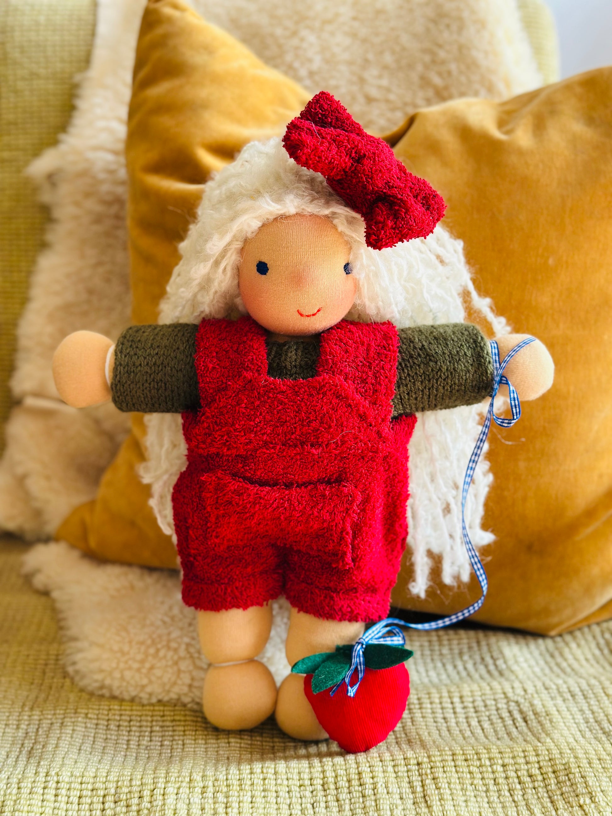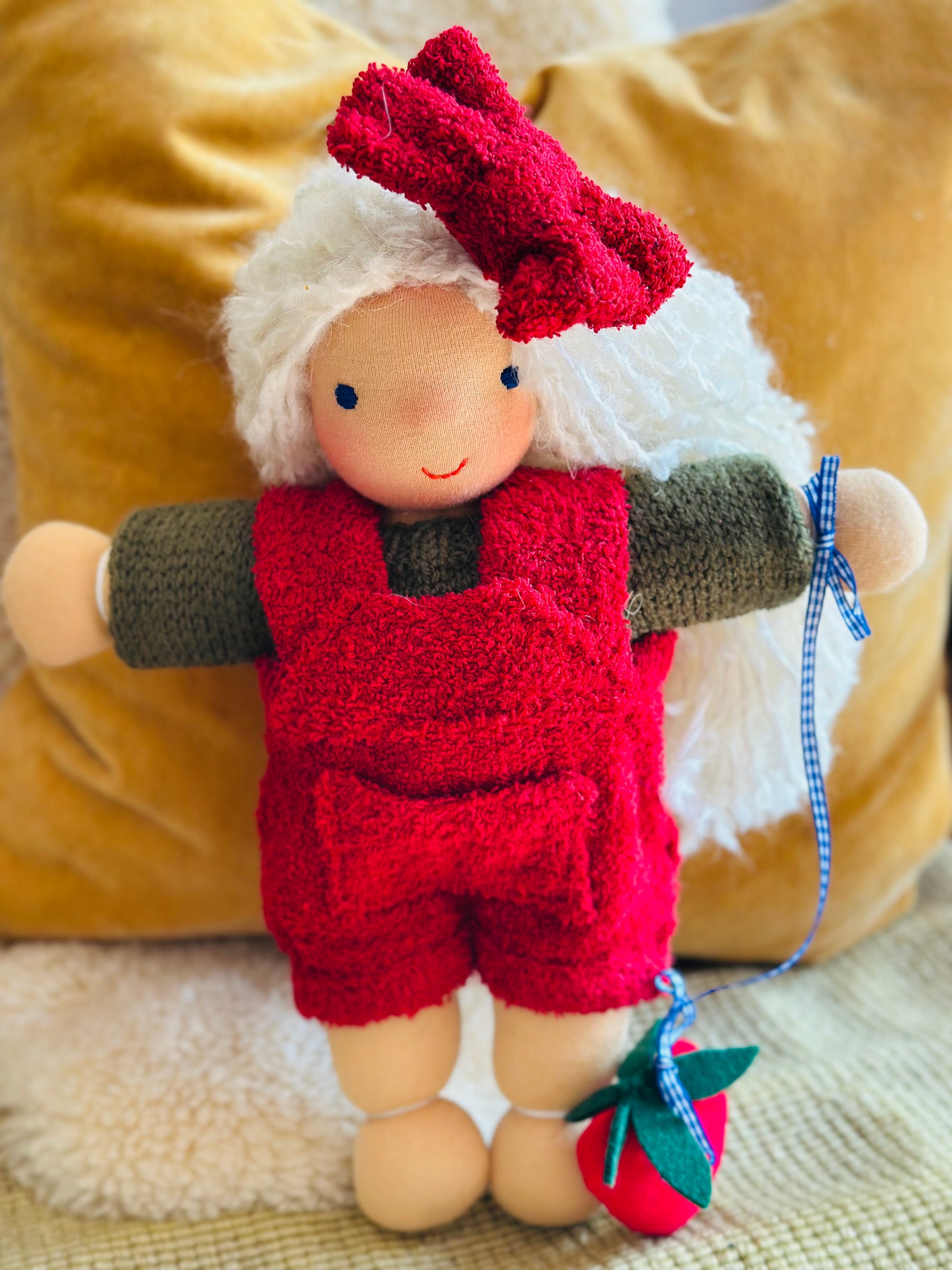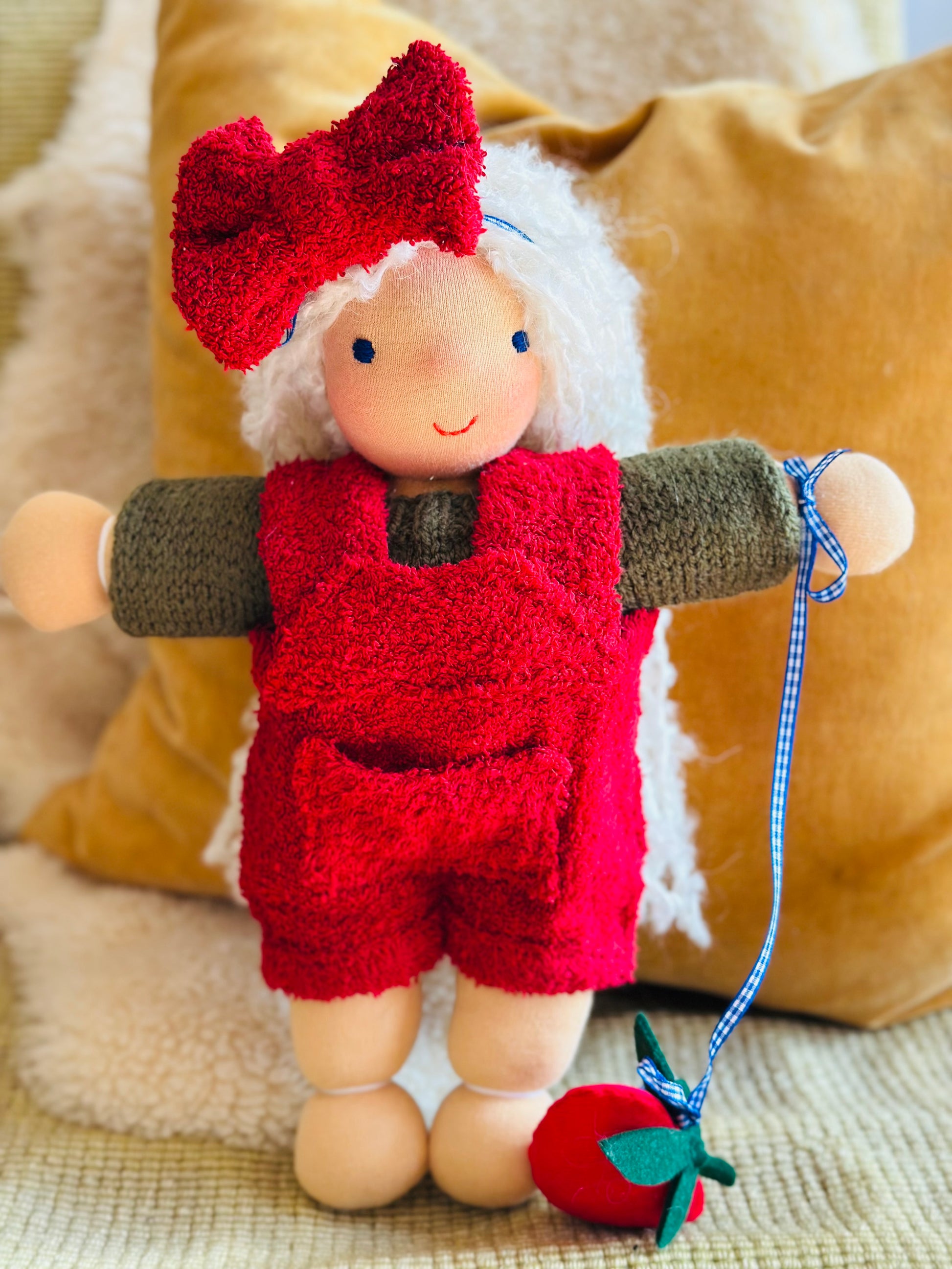 ERDBEERINCHEN 🍓 ist ein kleines, ca. 33 cm großes, kuscheliges Waldorf-Puppenkind und ist gefüllt mit gesunder Bio zertifizierter Schafwolle.
