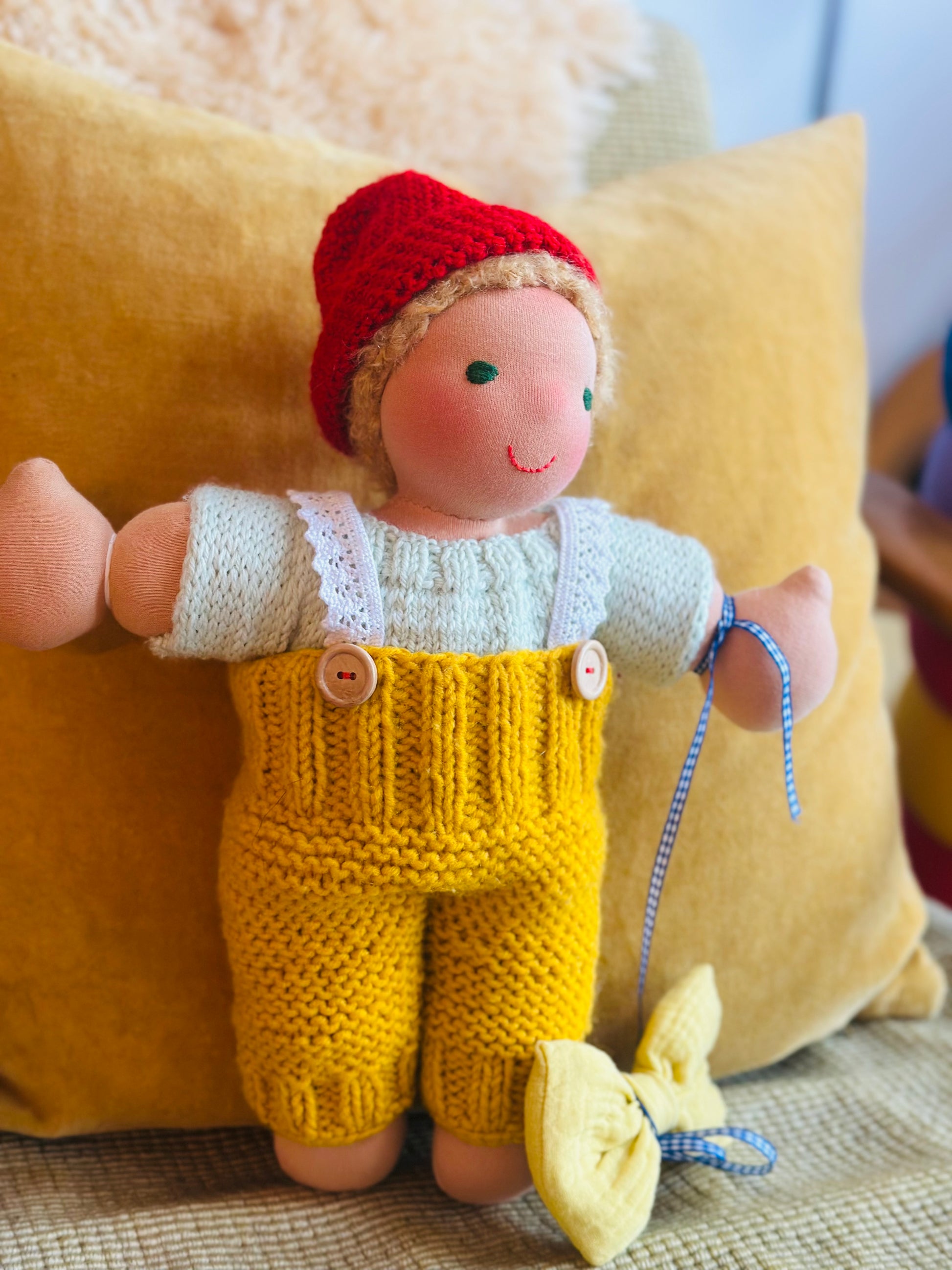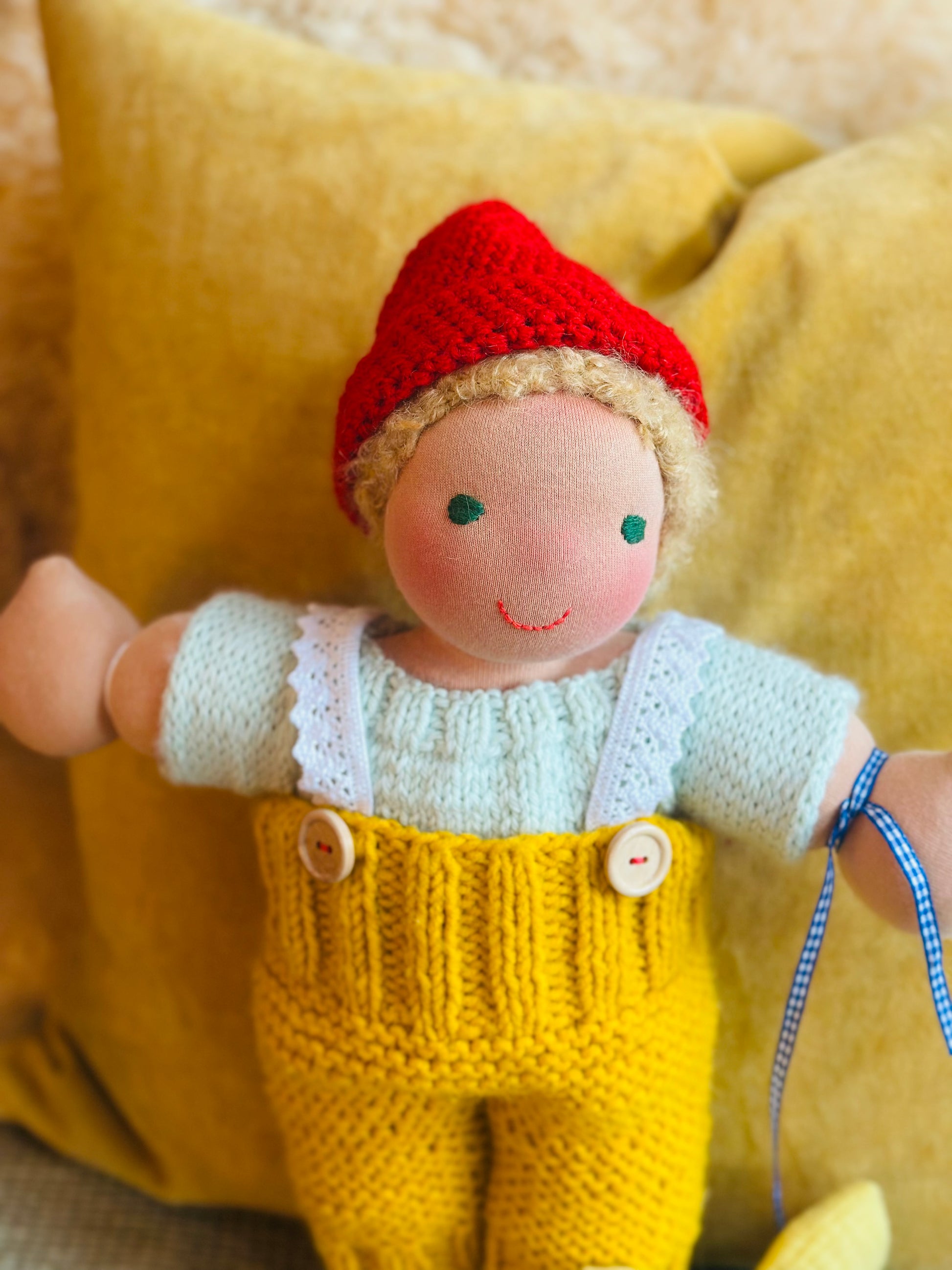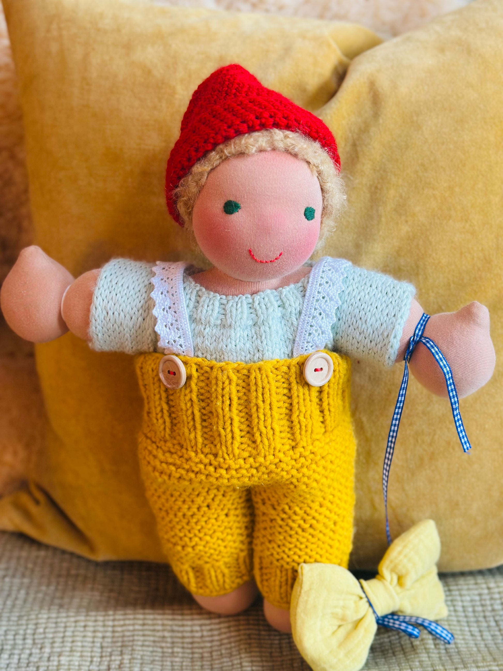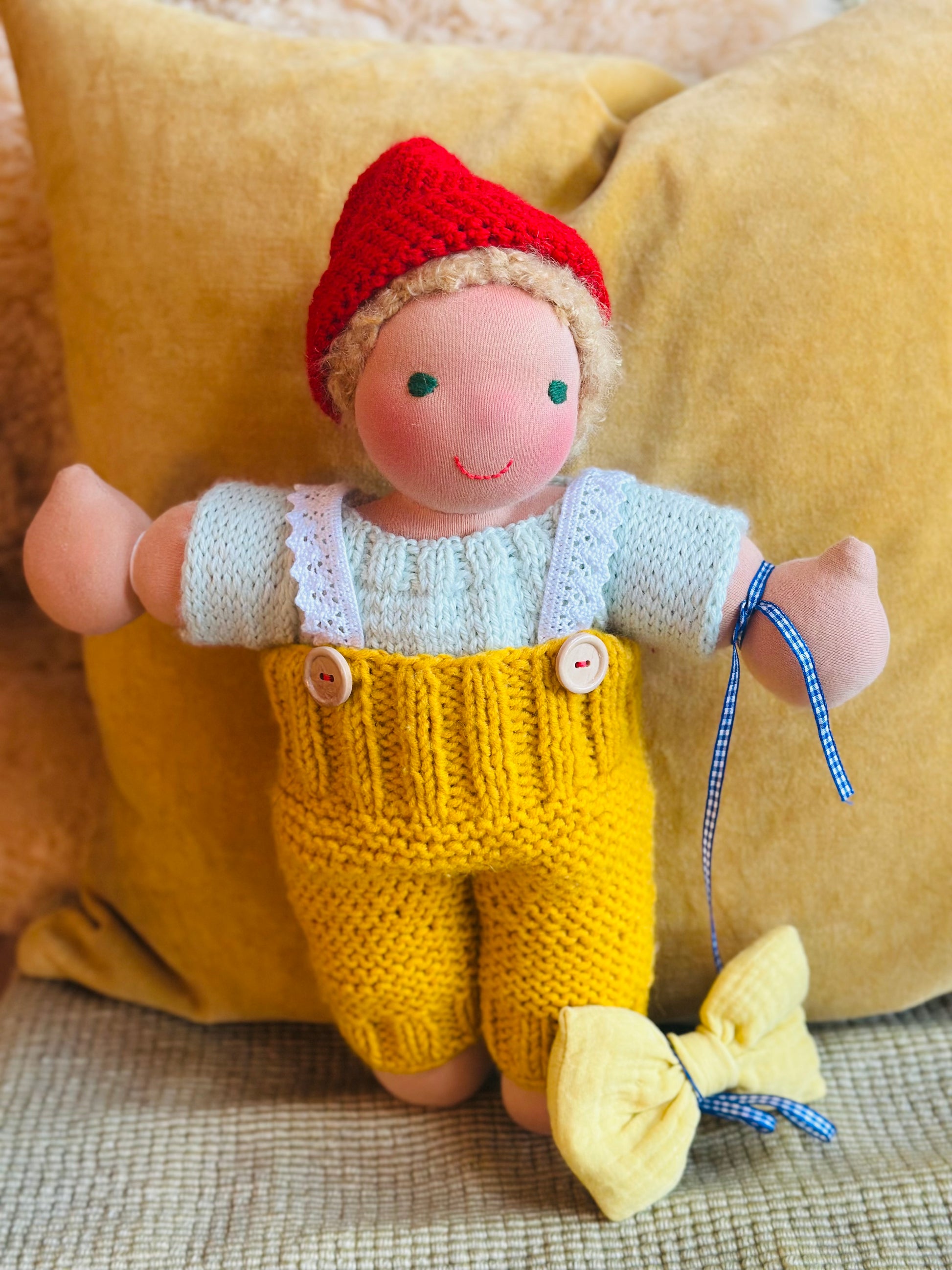 FRIEDRICH 👑 ist ein kleines, ca. 33 cm großes, kuscheliges Waldorf-Puppenkind und ist gefüllt mit gesunder Bio zertifizierter Schafwolle.