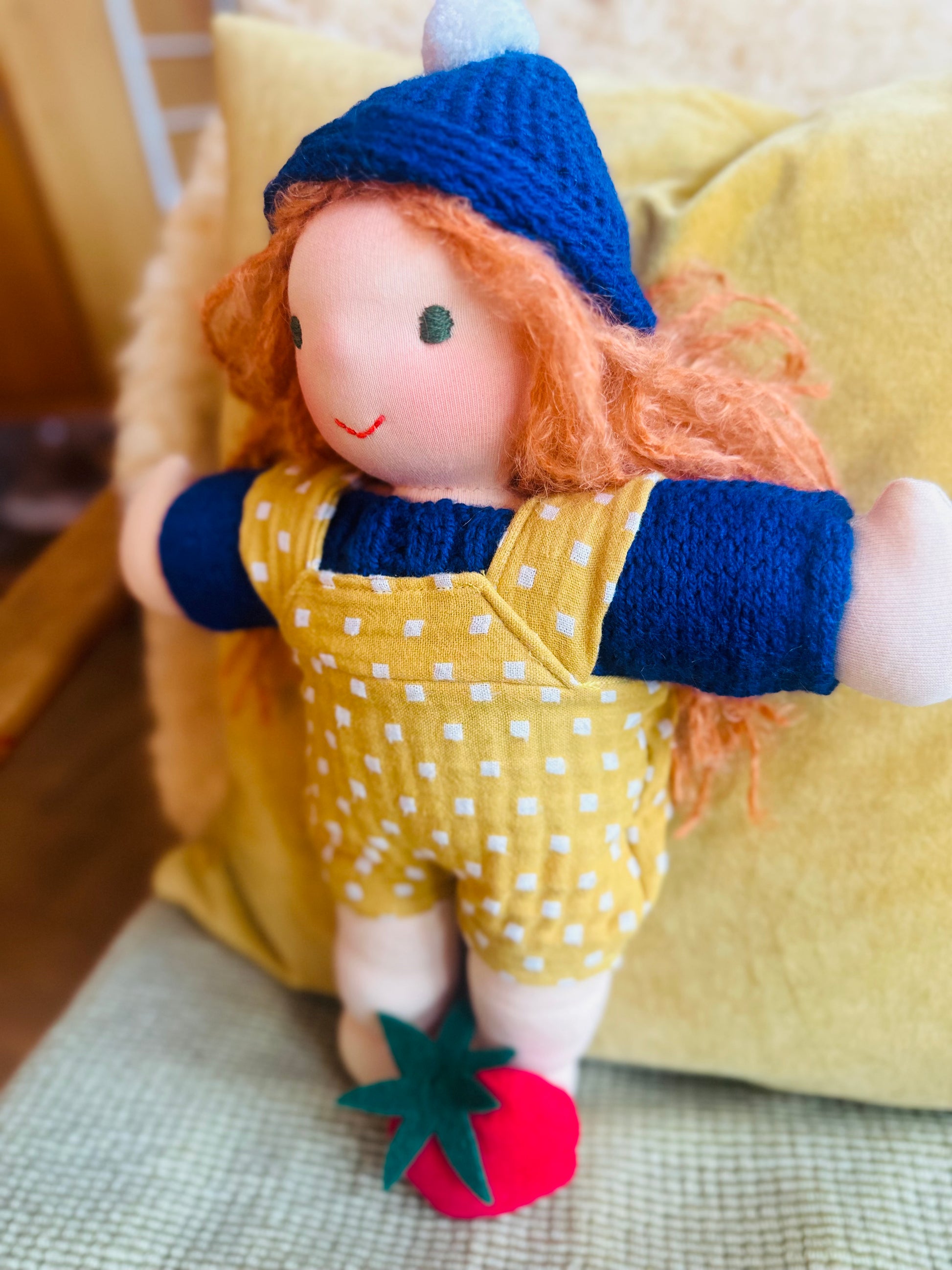 GRETA 🍎🌱 ist ein kleines, ca. 33 cm großes, kuscheliges Waldorf-Puppenkind und ist gefüllt mit gesunder Bio zertifizierter Schafwolle.