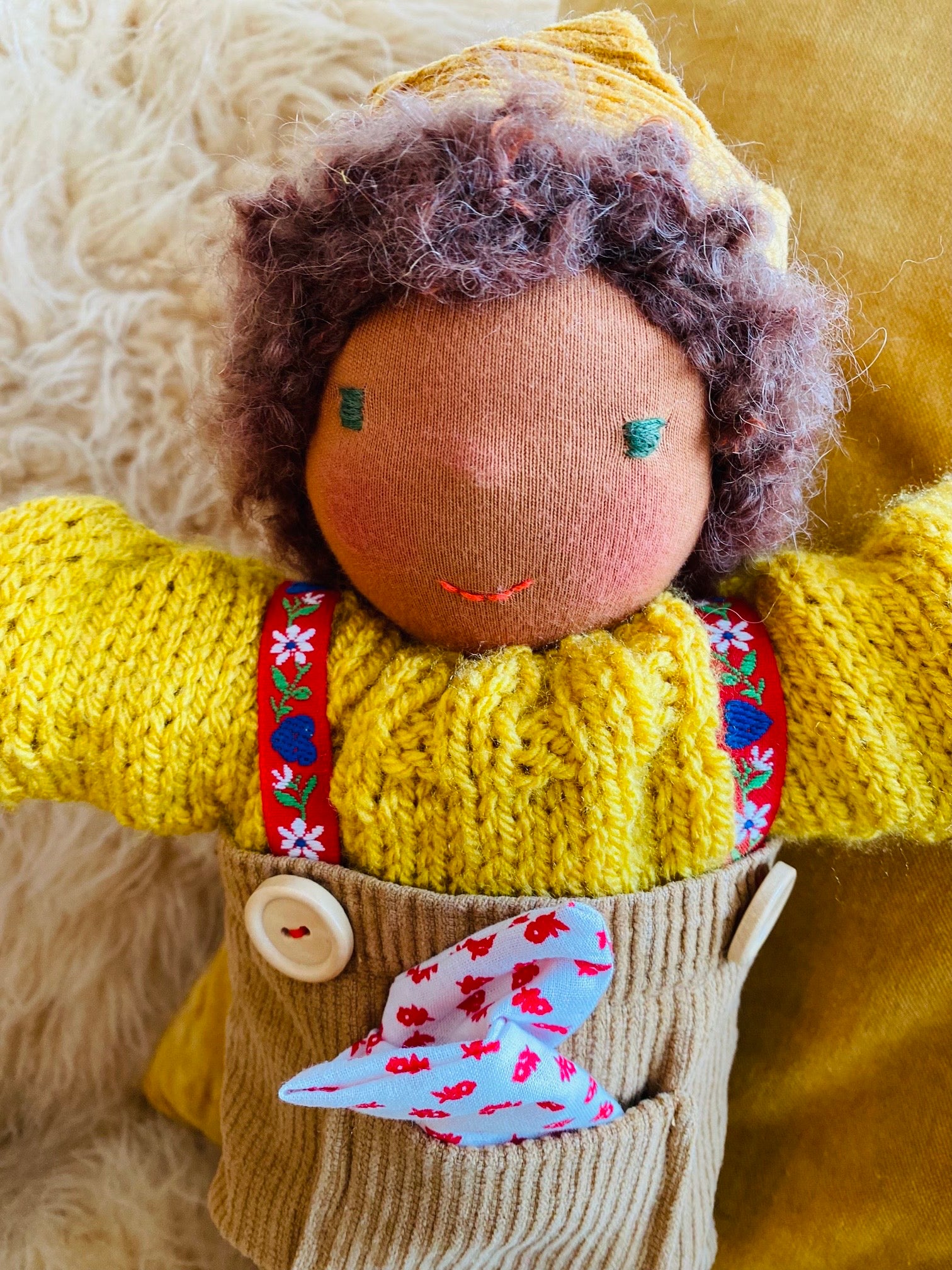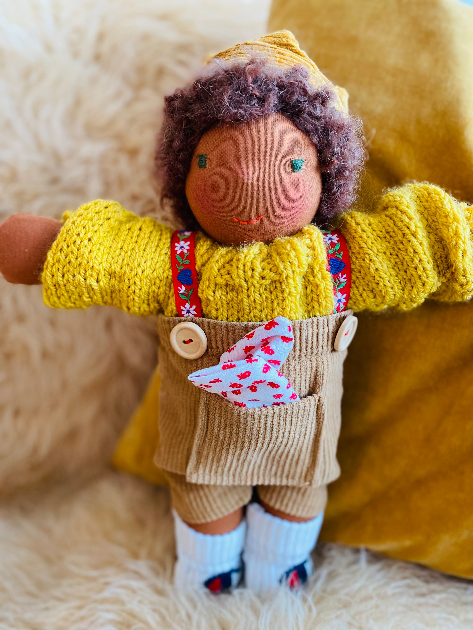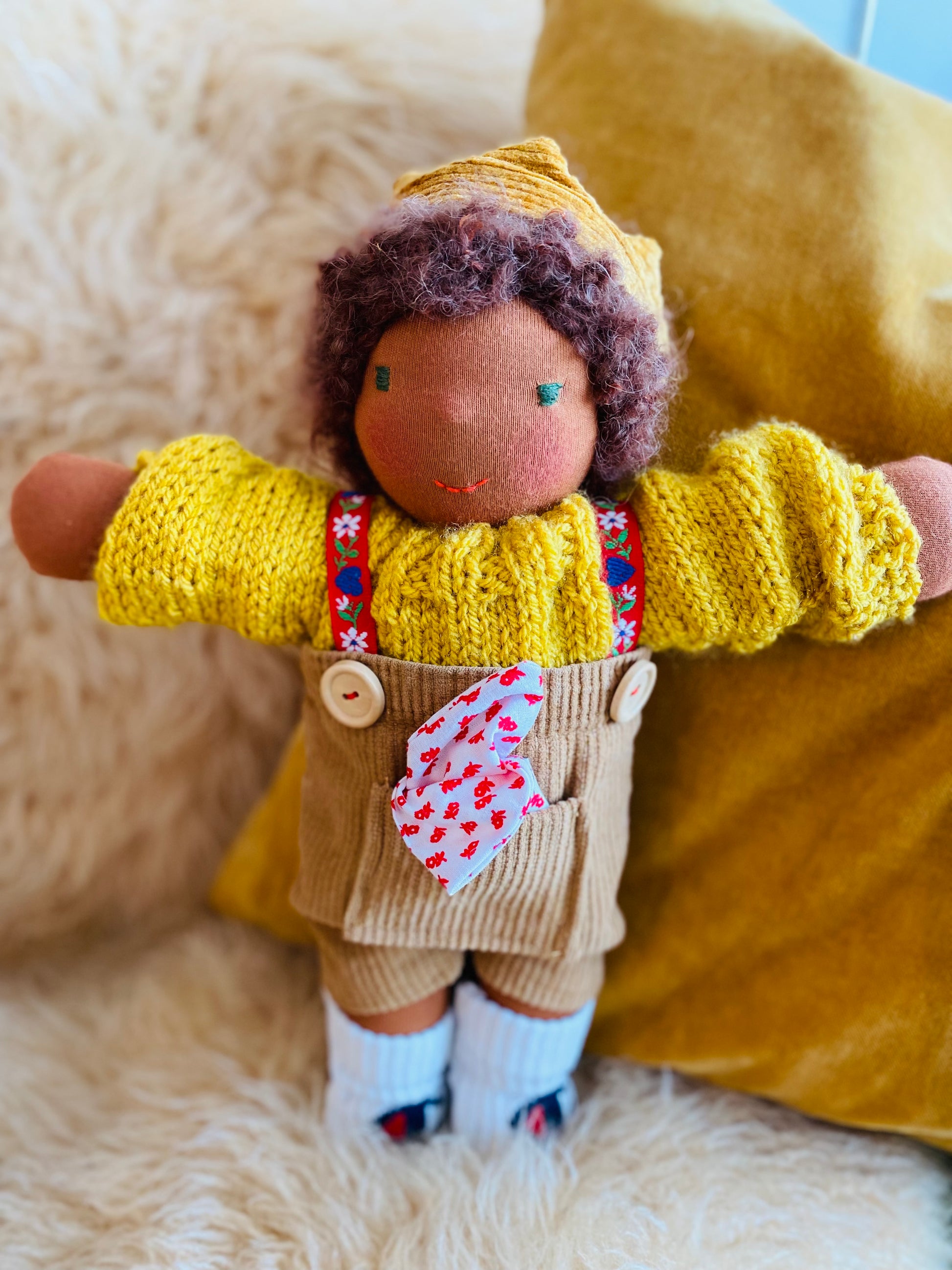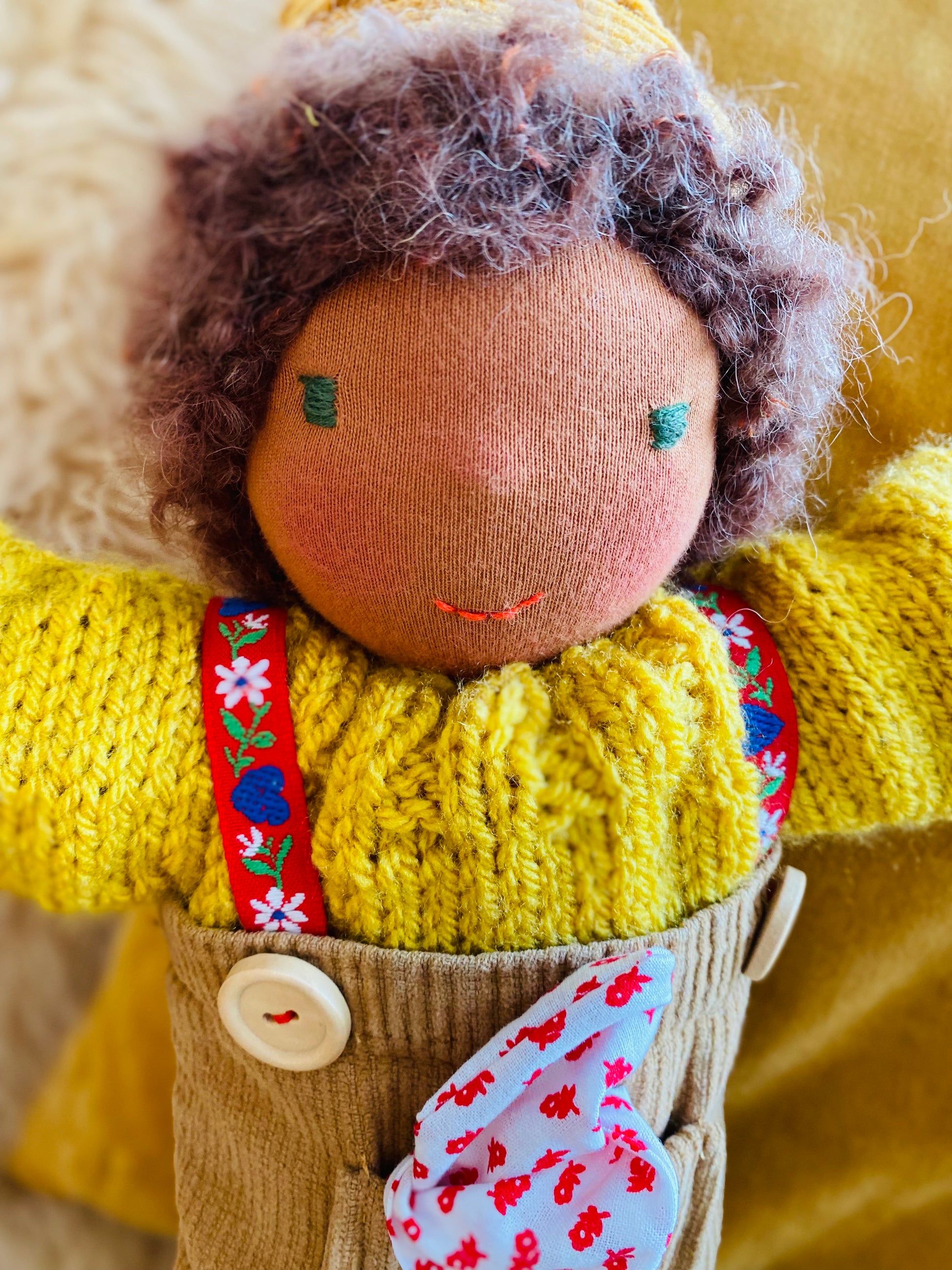 ist ein kleines, ca. 33 cm großes, kuscheliges Waldorf-Puppenkind und ist gefüllt mit nachhaltiger Schafwolle von einer kleinen Schafsfarm in Süddeutschland.
