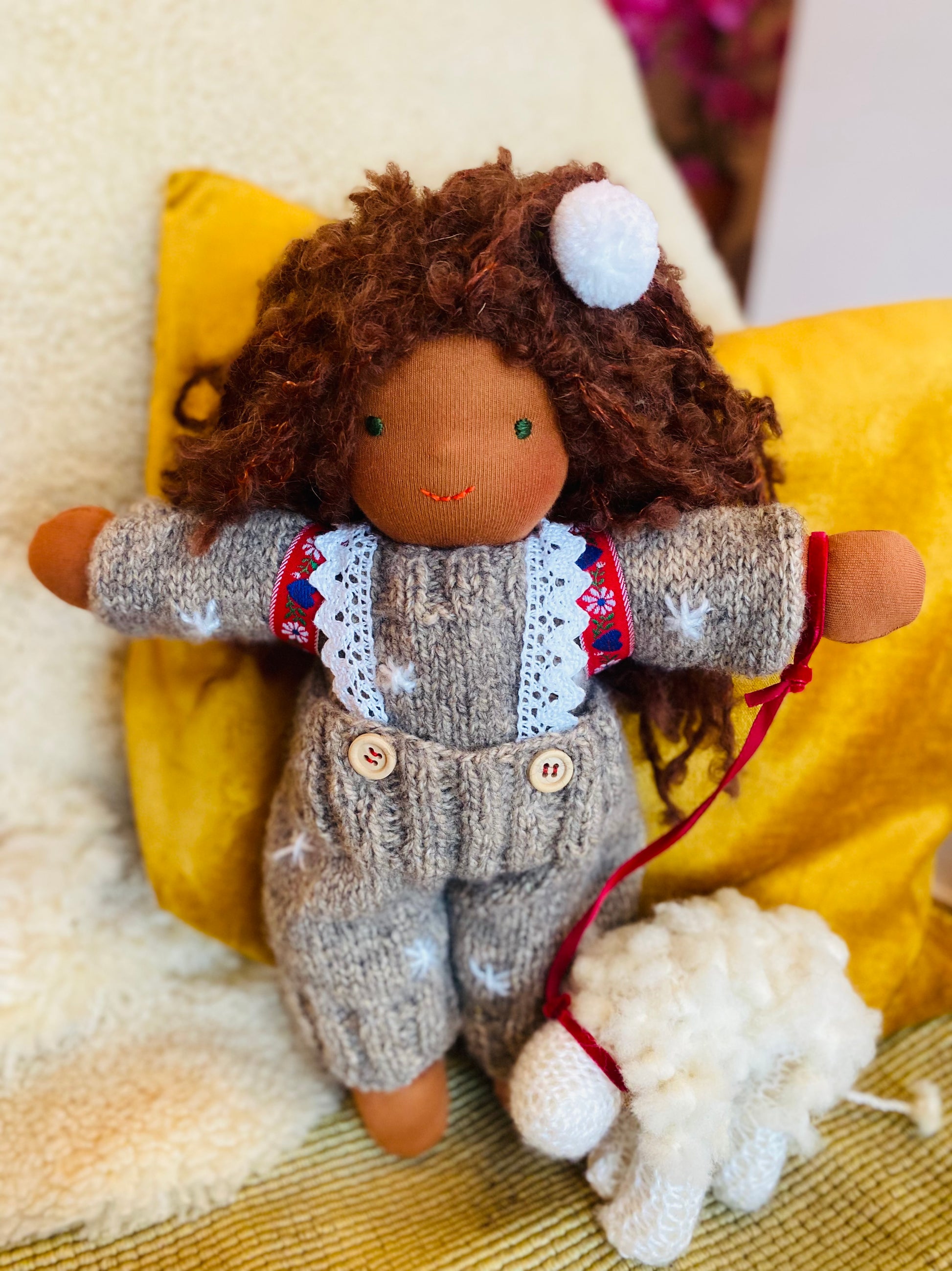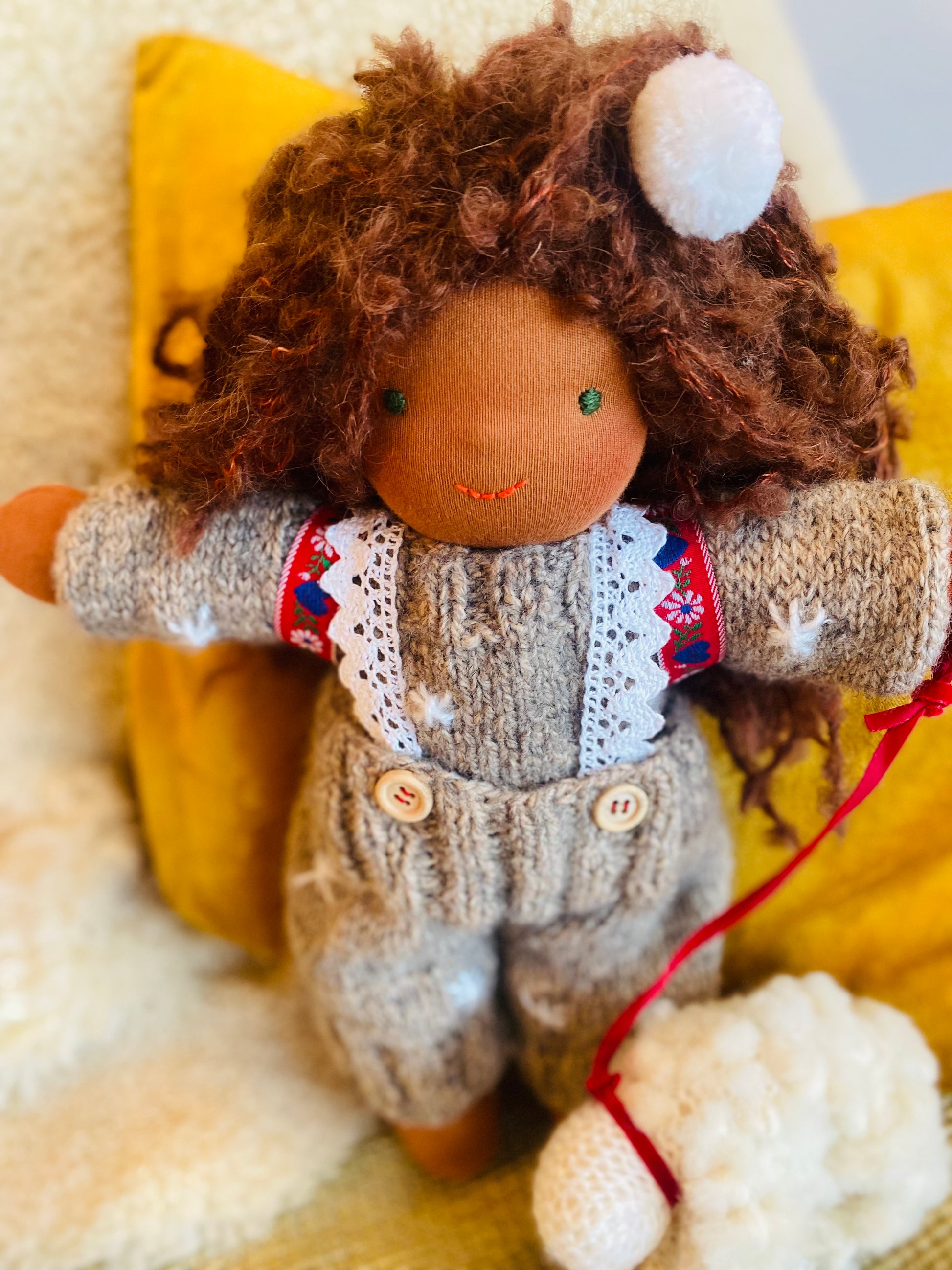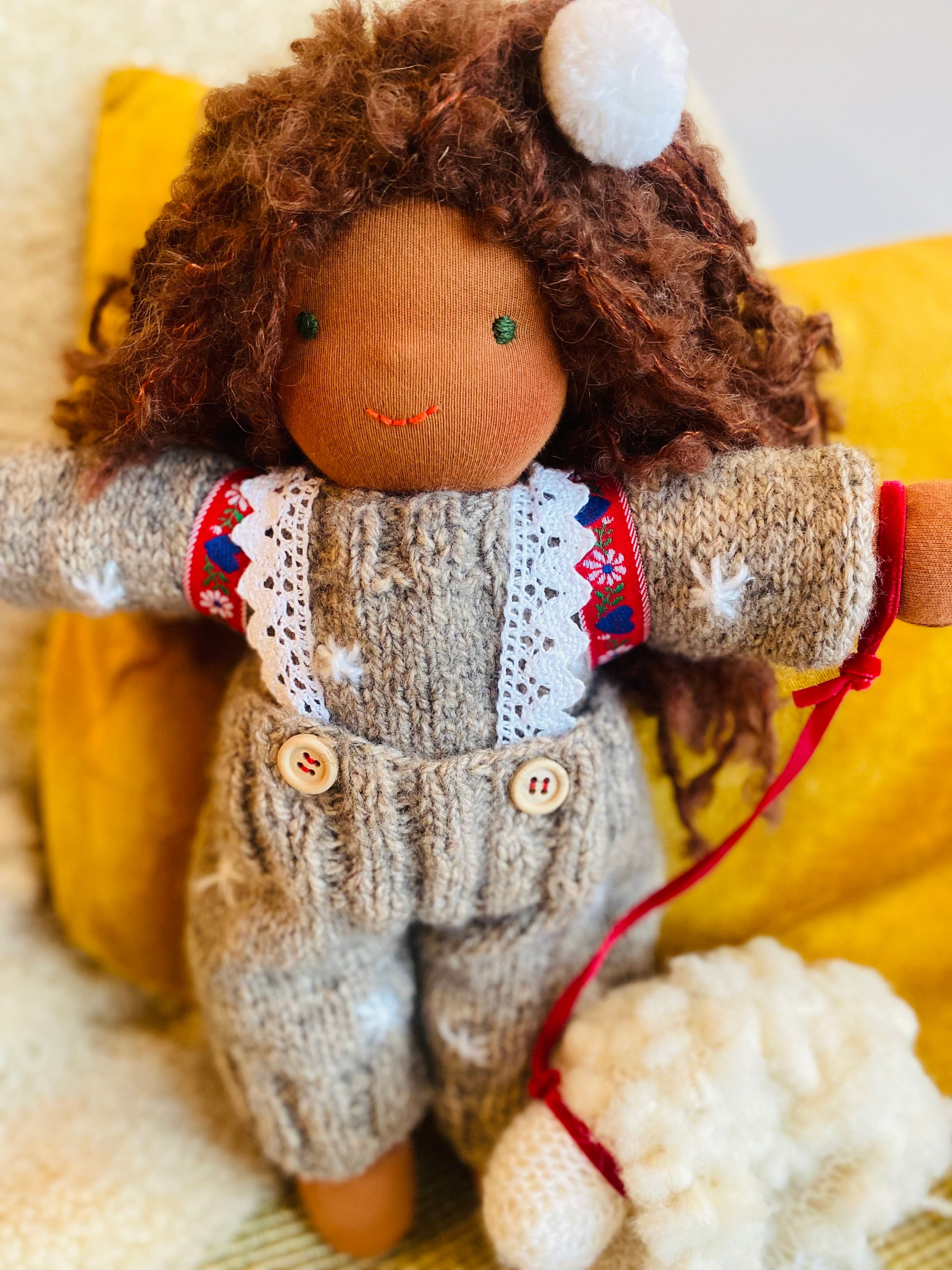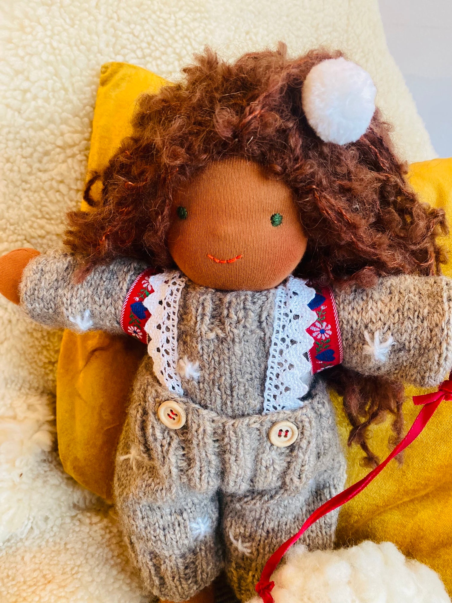 HEIDI ist ein kleines, ca. 33 cm großes, kuscheliges Waldorf-Puppenkind und ist gefüllt mit gesunder De Witte Engel OEKO-TEX® zertifizierter Schafwolle.
