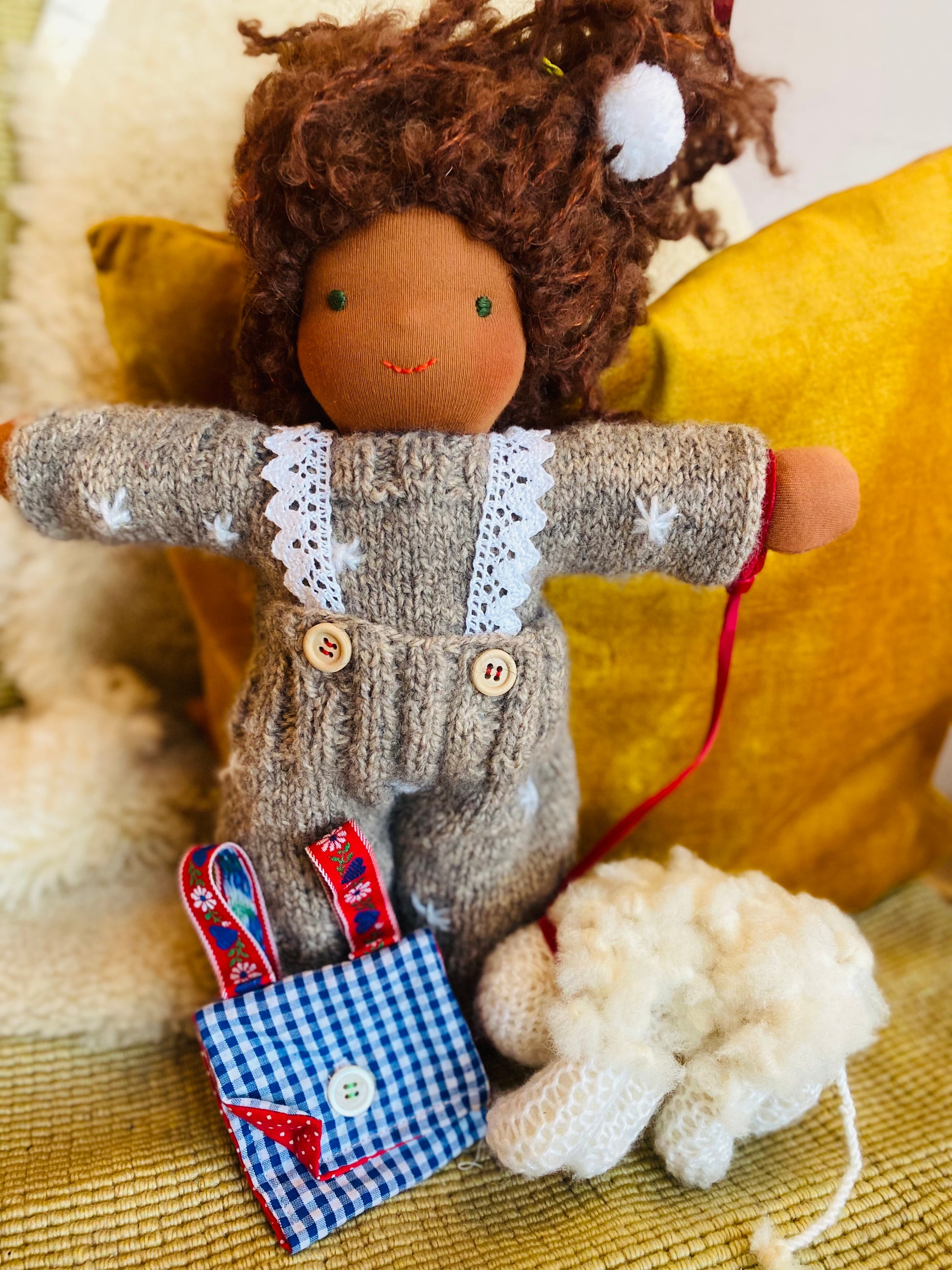 Die Mohair-Locke besteht aus 74% Mohair, 17% Schurwolle und 9% Polyamid und der Puppenjersey kommt von “Puppenstoffe” aus der Schweiz ist OEKO-TEX® zertifiziert und super robust.Share