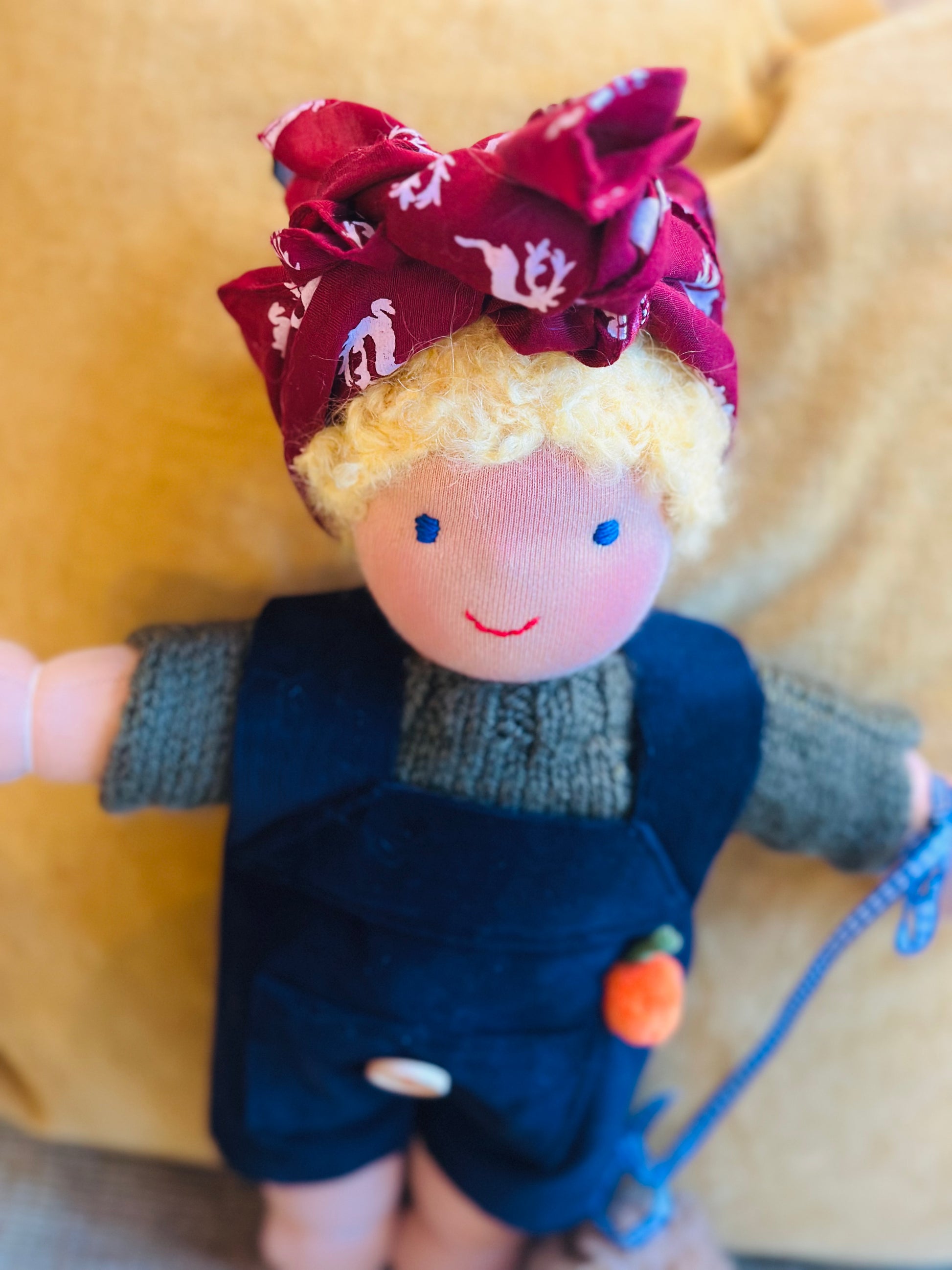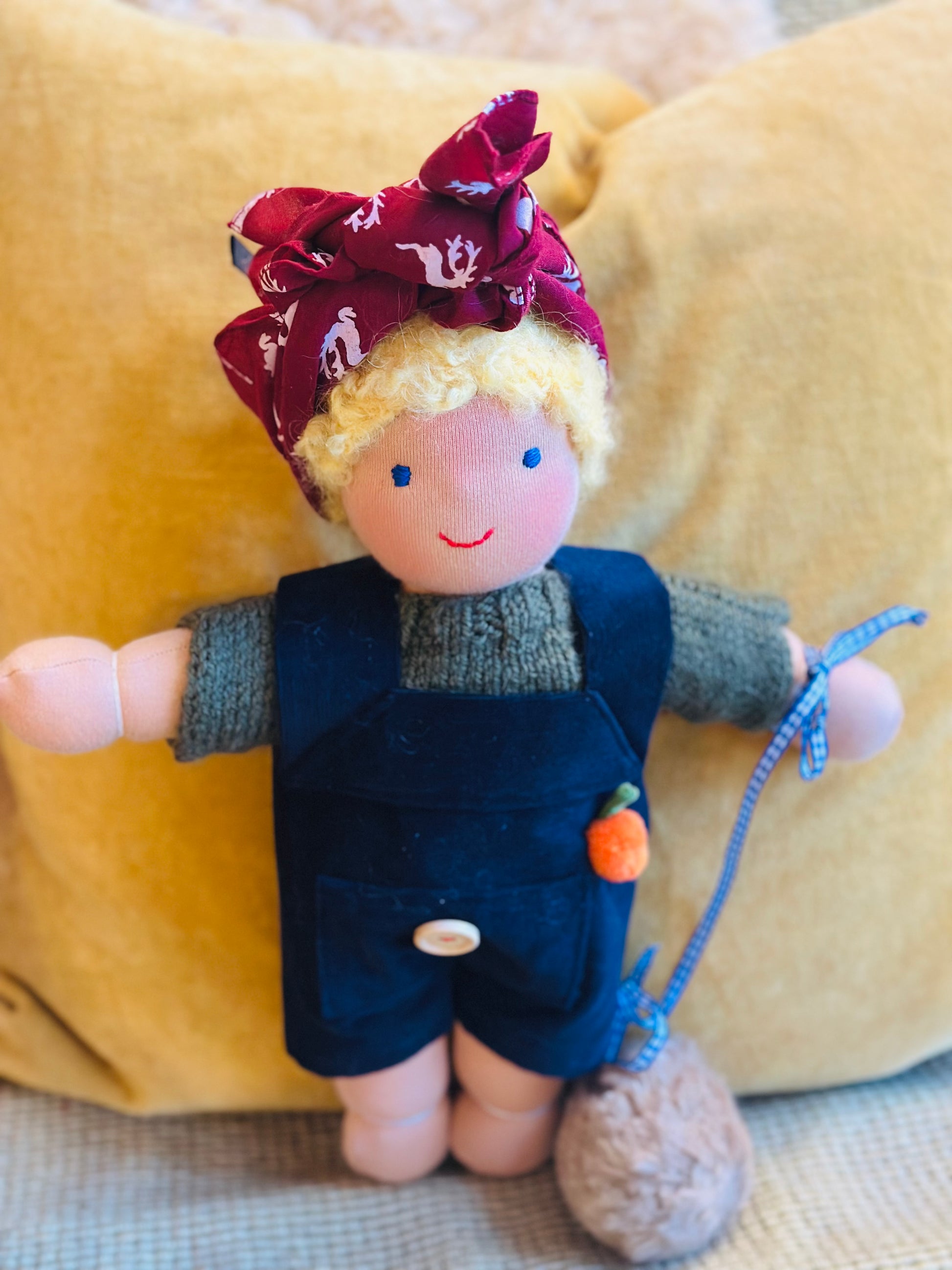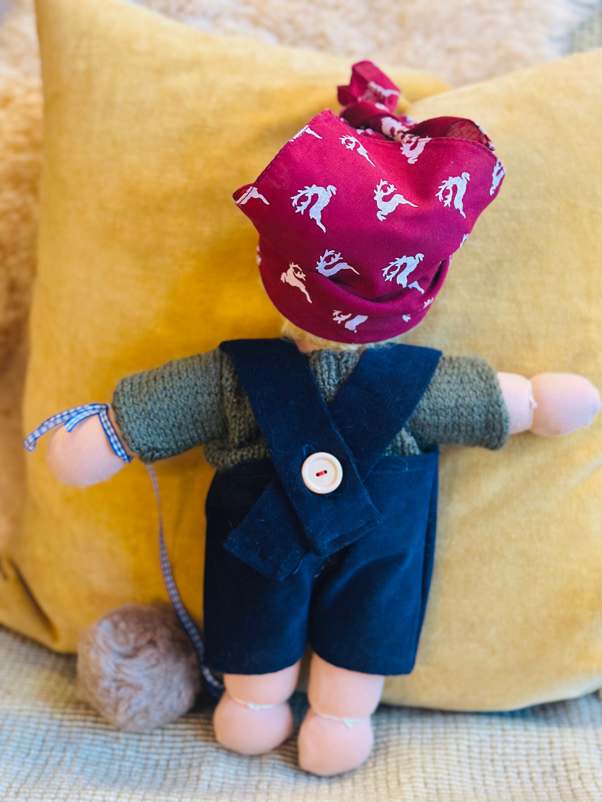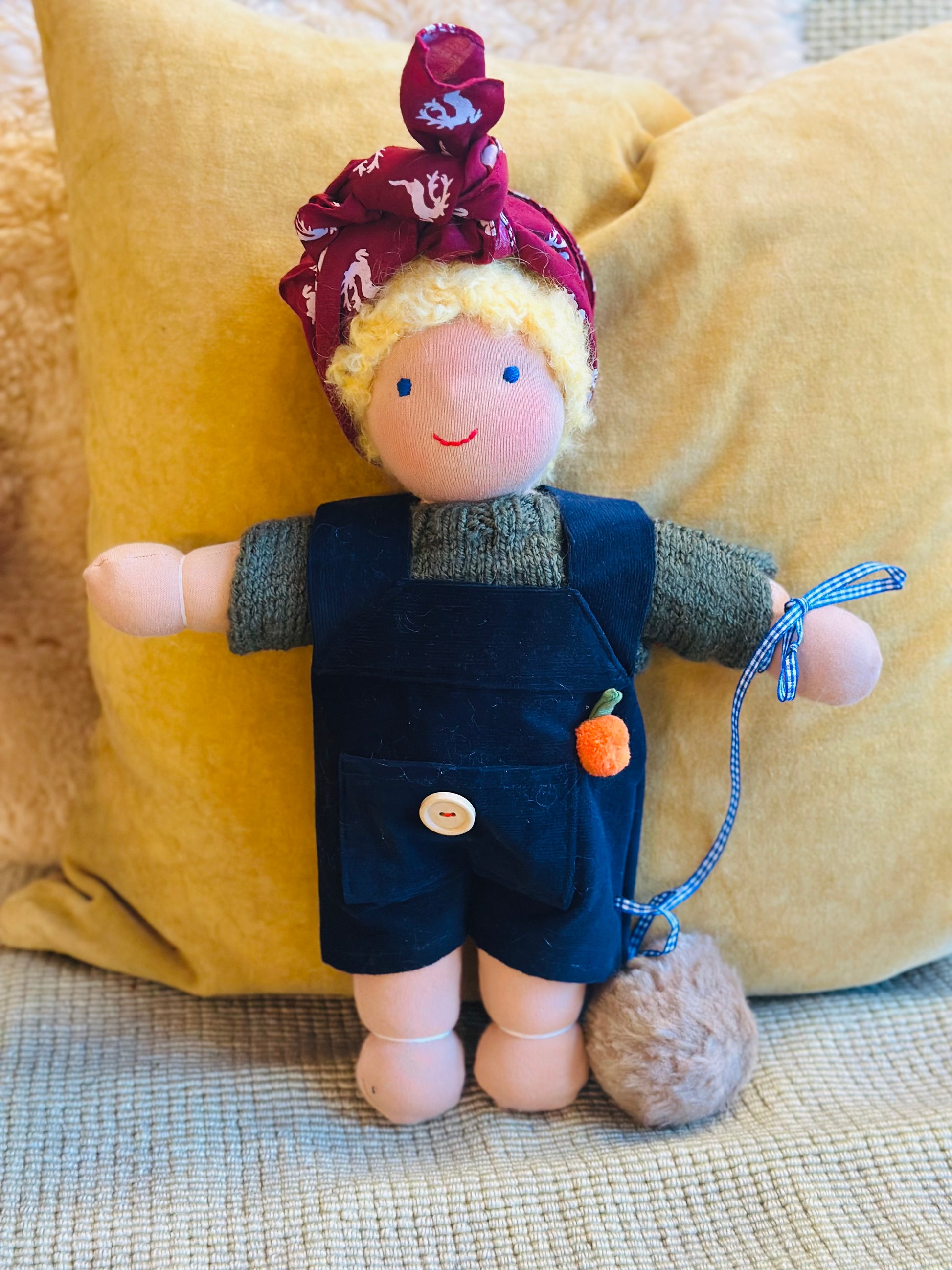 ROLAND ist ein kleines, ca. 33 cm großes, kuscheliges Waldorf-Puppenkind und ist gefüllt mit gesunder Bio zertifizierter Schafwolle.