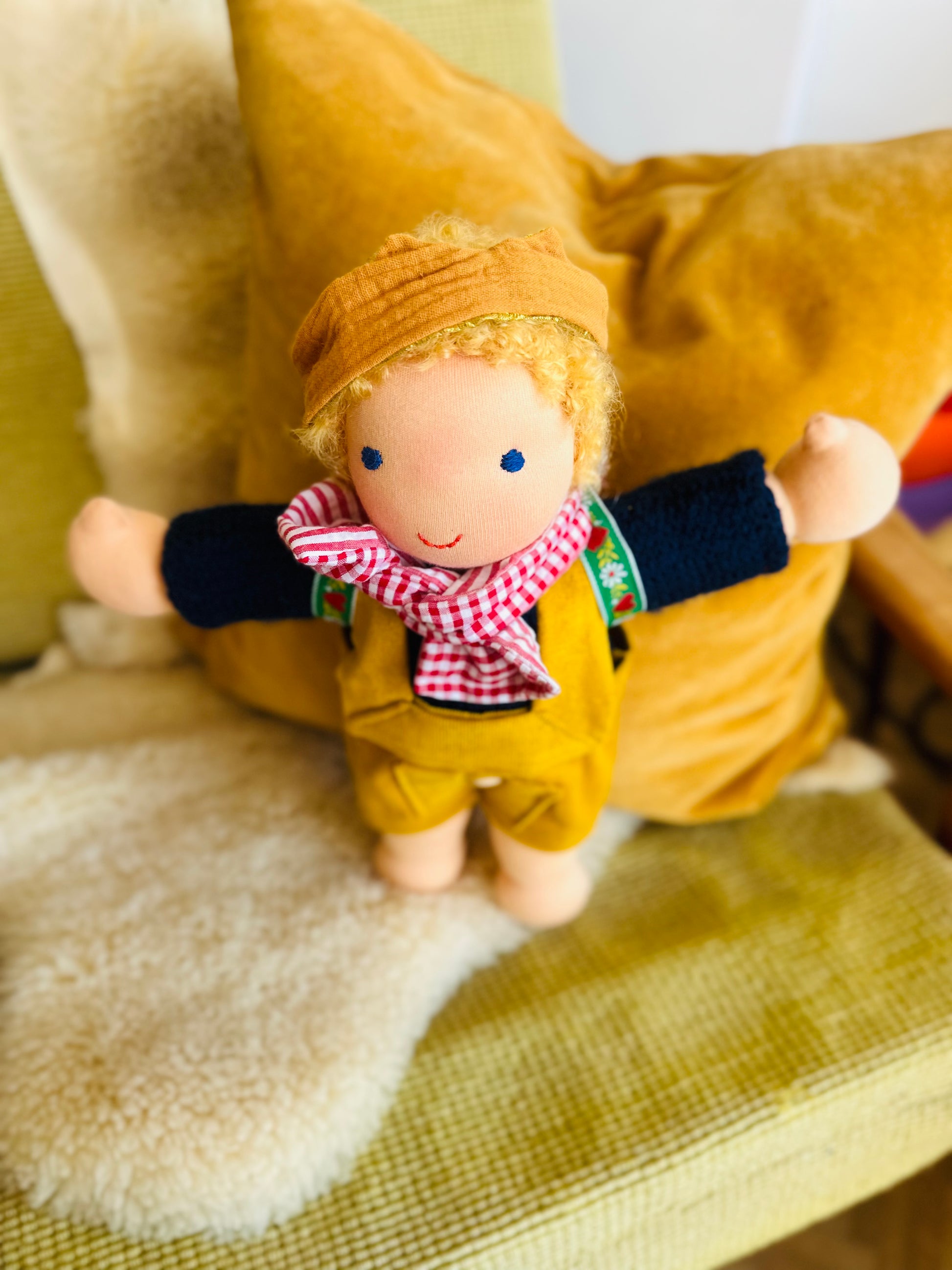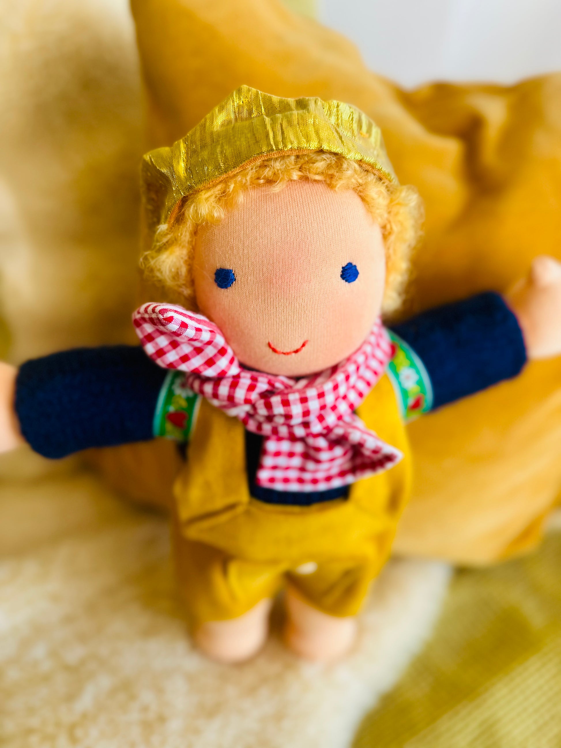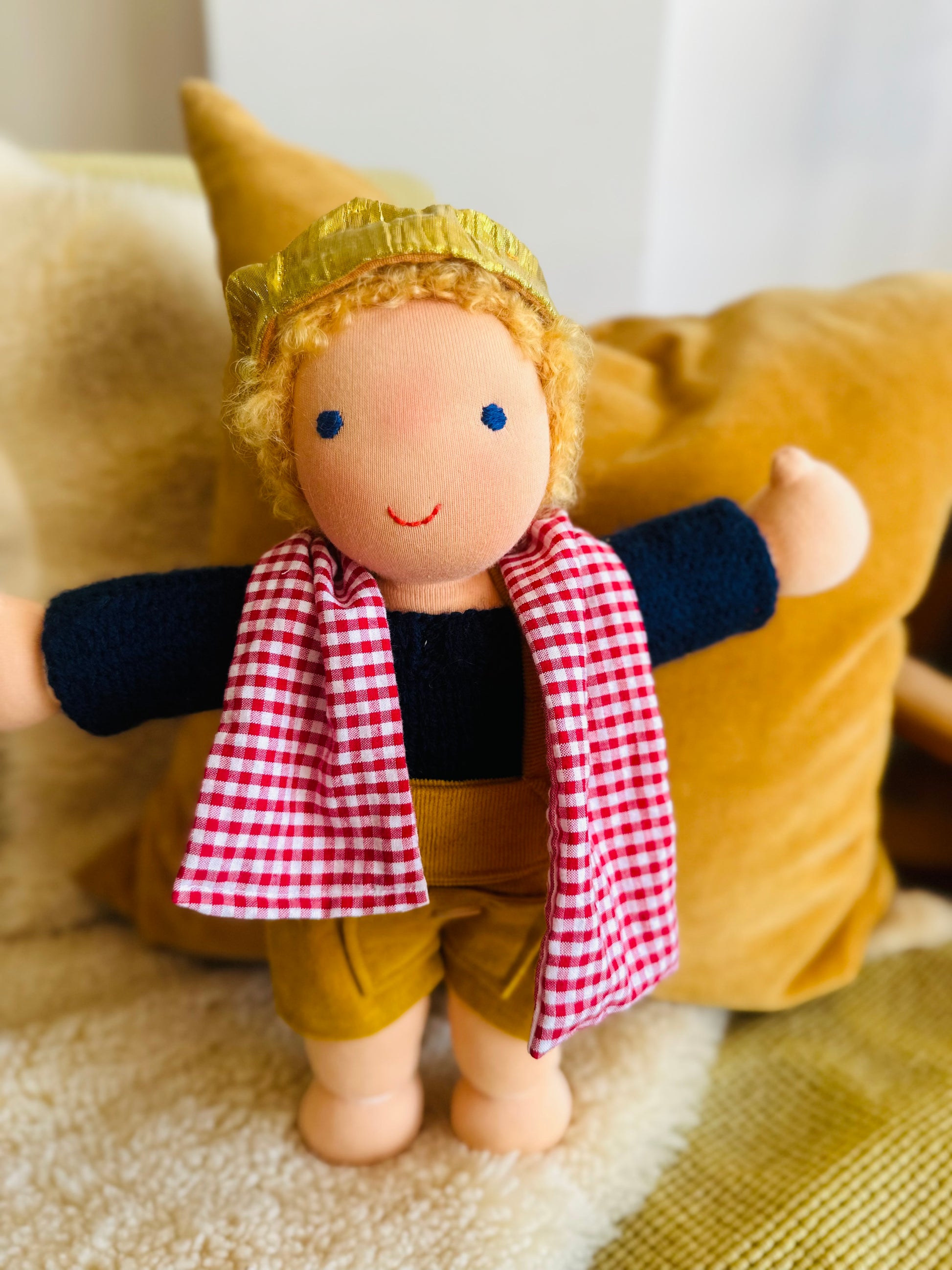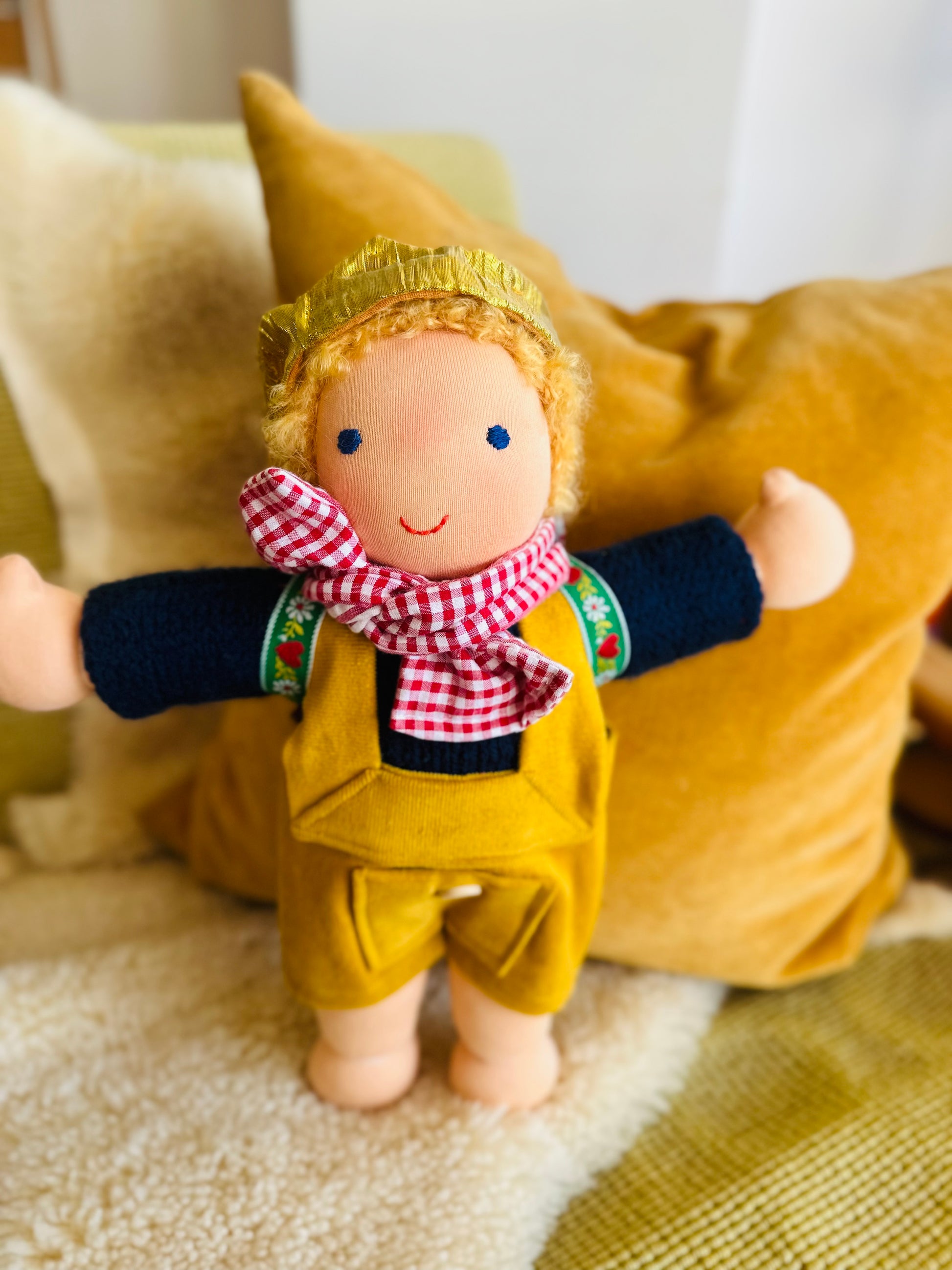 JUNES 👑 ist ein kleines, ca. 36 cm großes, kuscheliges Waldorf-Puppenkind.