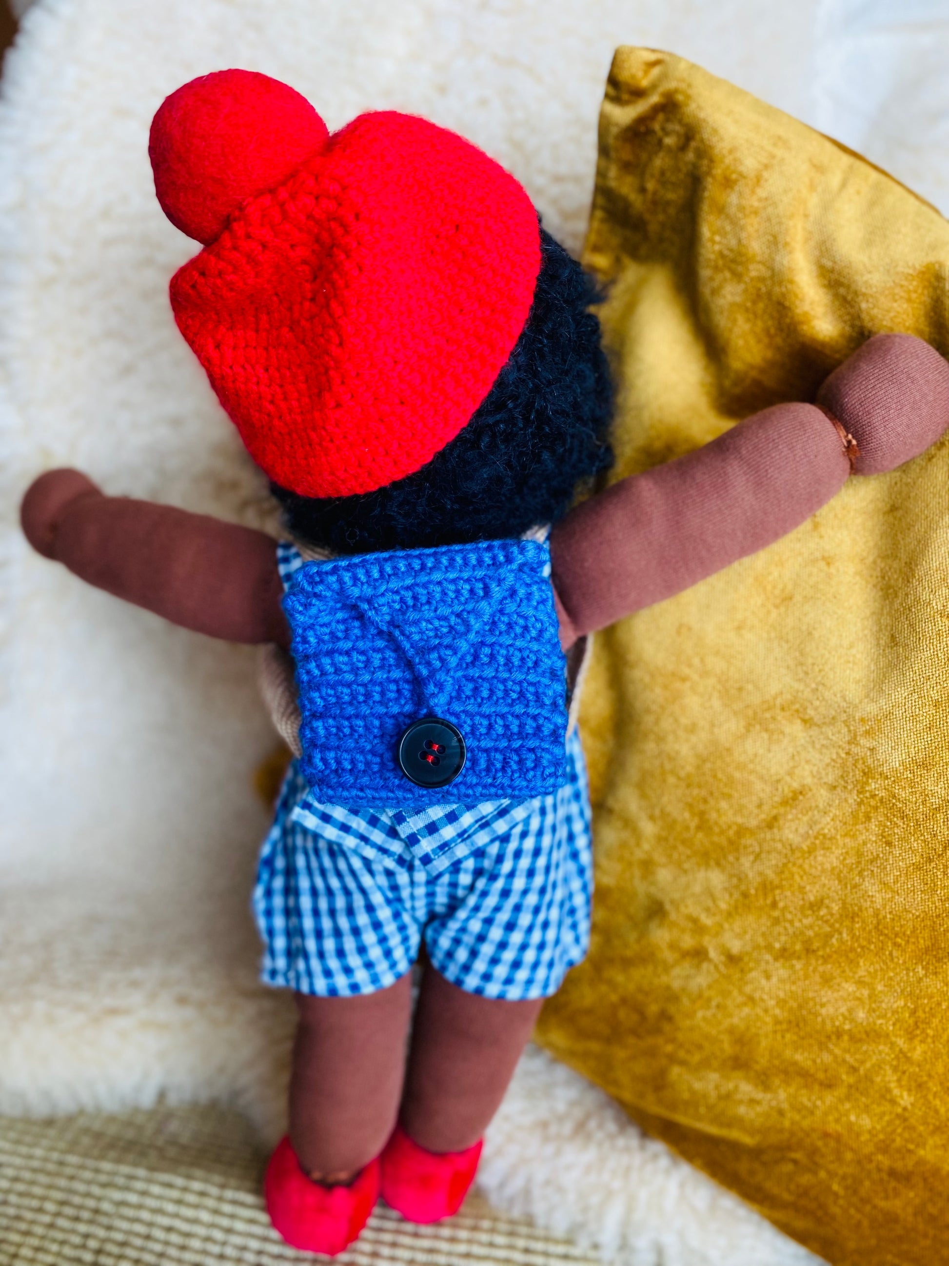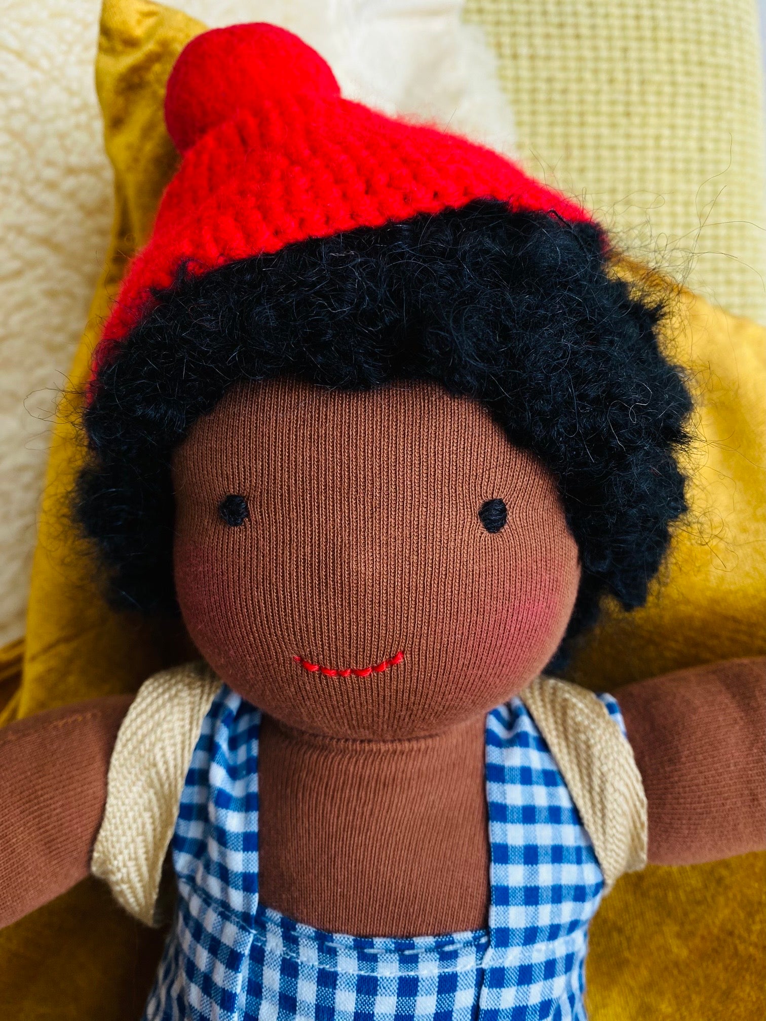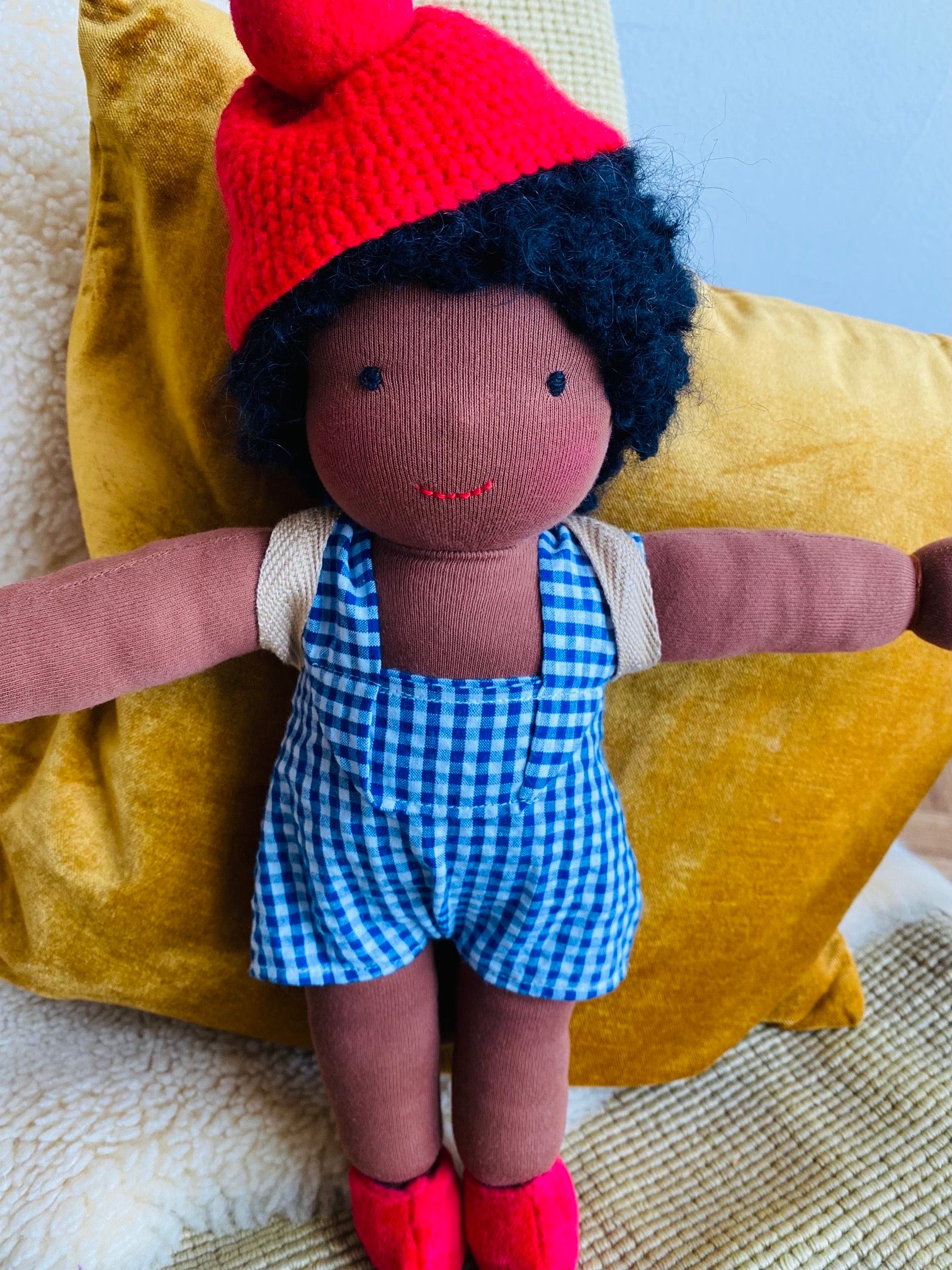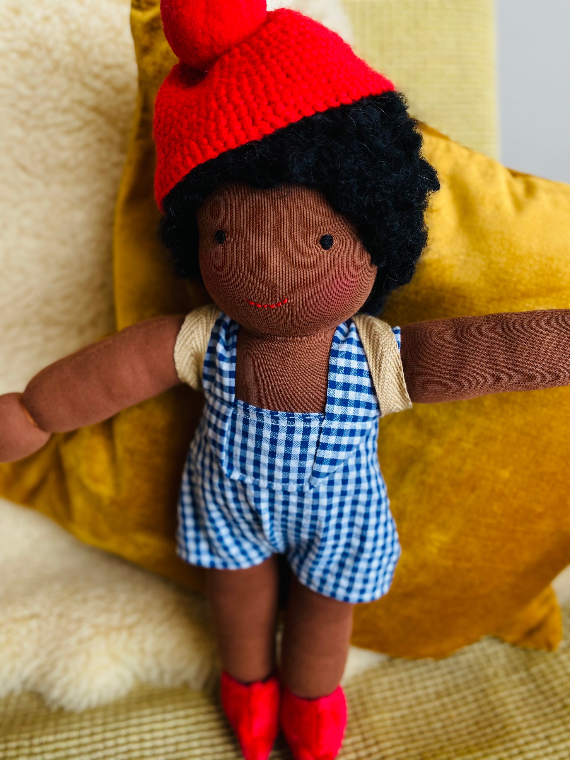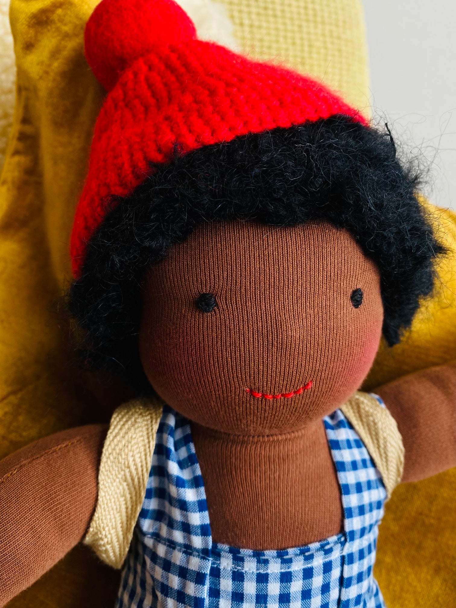 Es trägt einen Hosenanzug aus Baumwolle. Auf dem Kopf hat es eine rote Bommelmütze und auf dem Rücken einen kleinen blauen Rucksack.