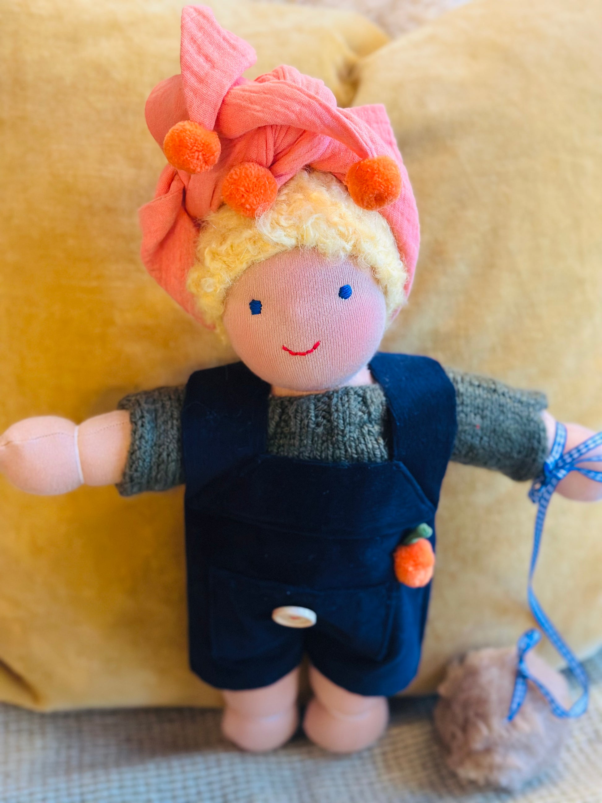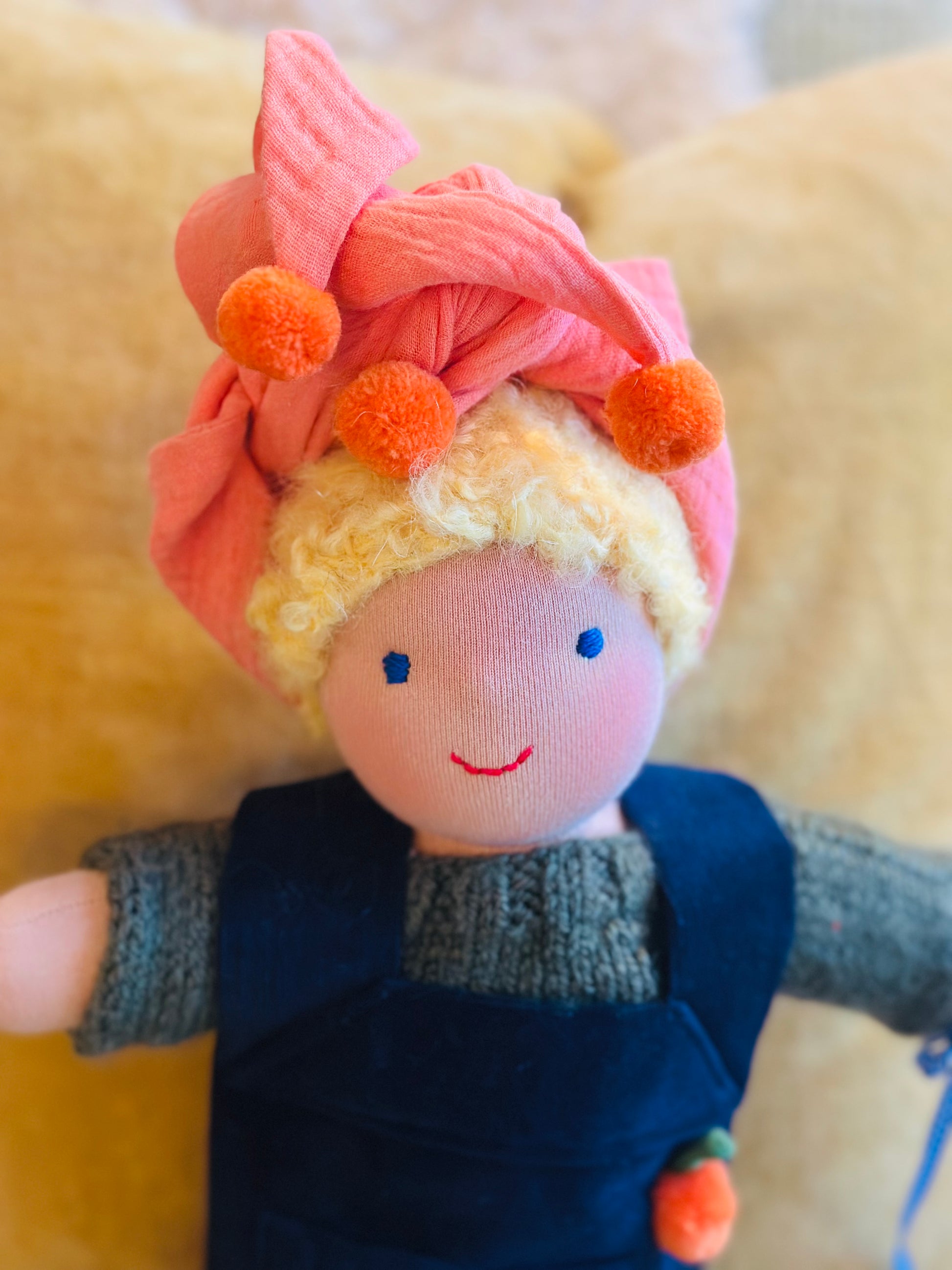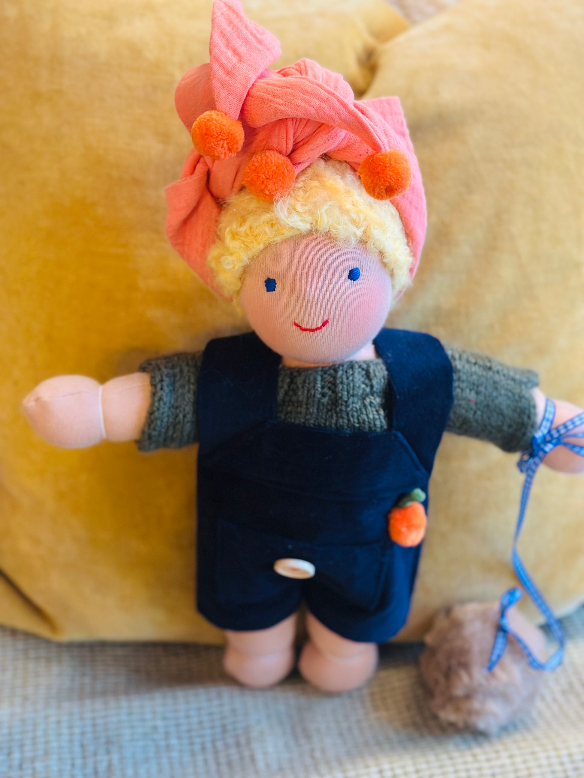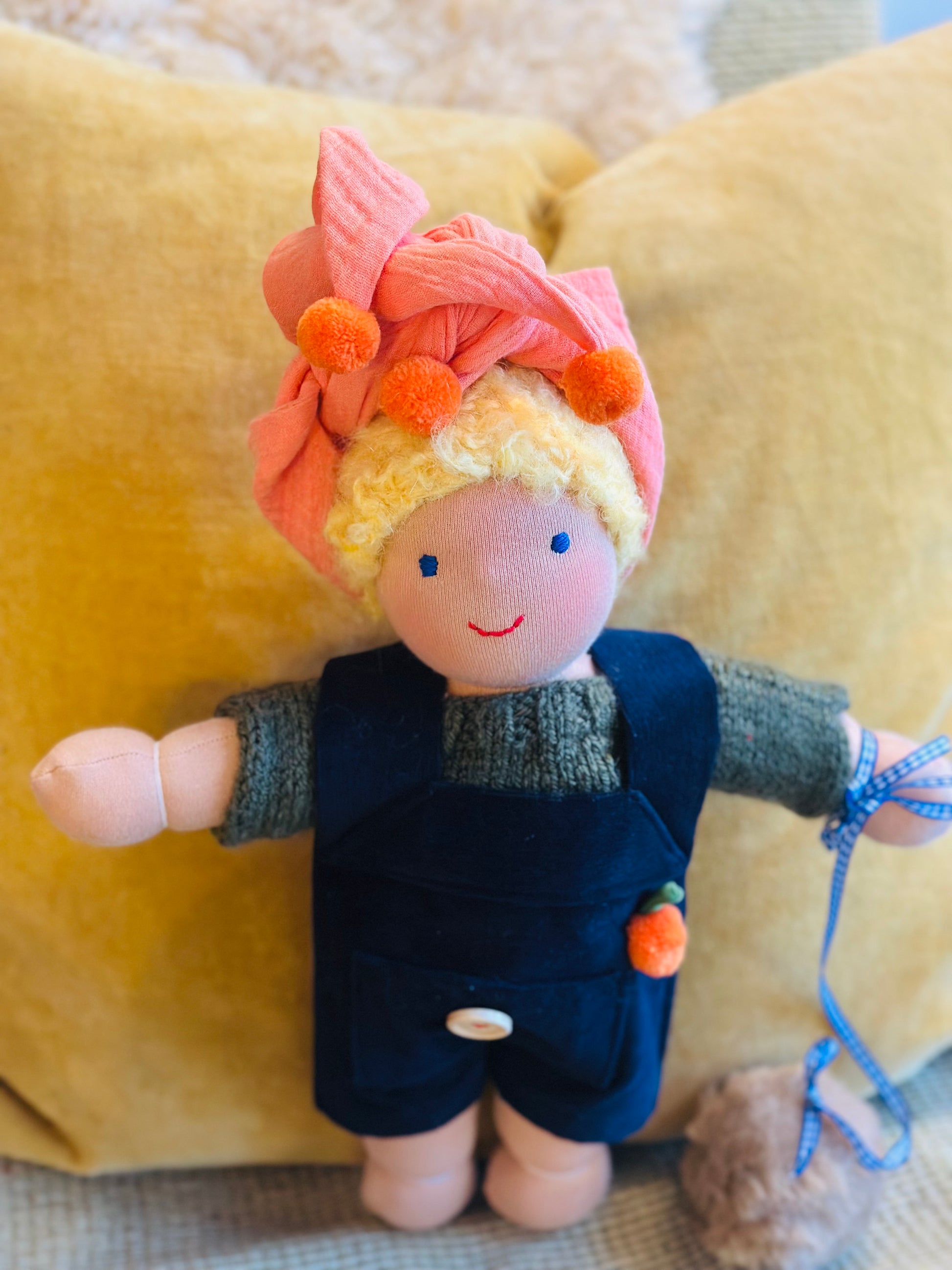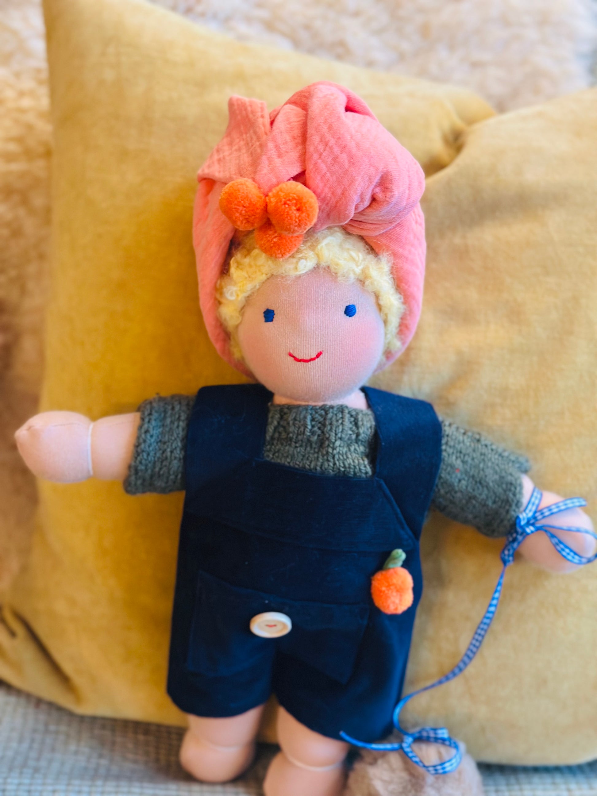 KURT ist ein kleines, ca. 33 cm großes, kuscheliges Waldorf-Puppenkind und ist gefüllt mit gesunder Bio zertifizierter Schafwolle.