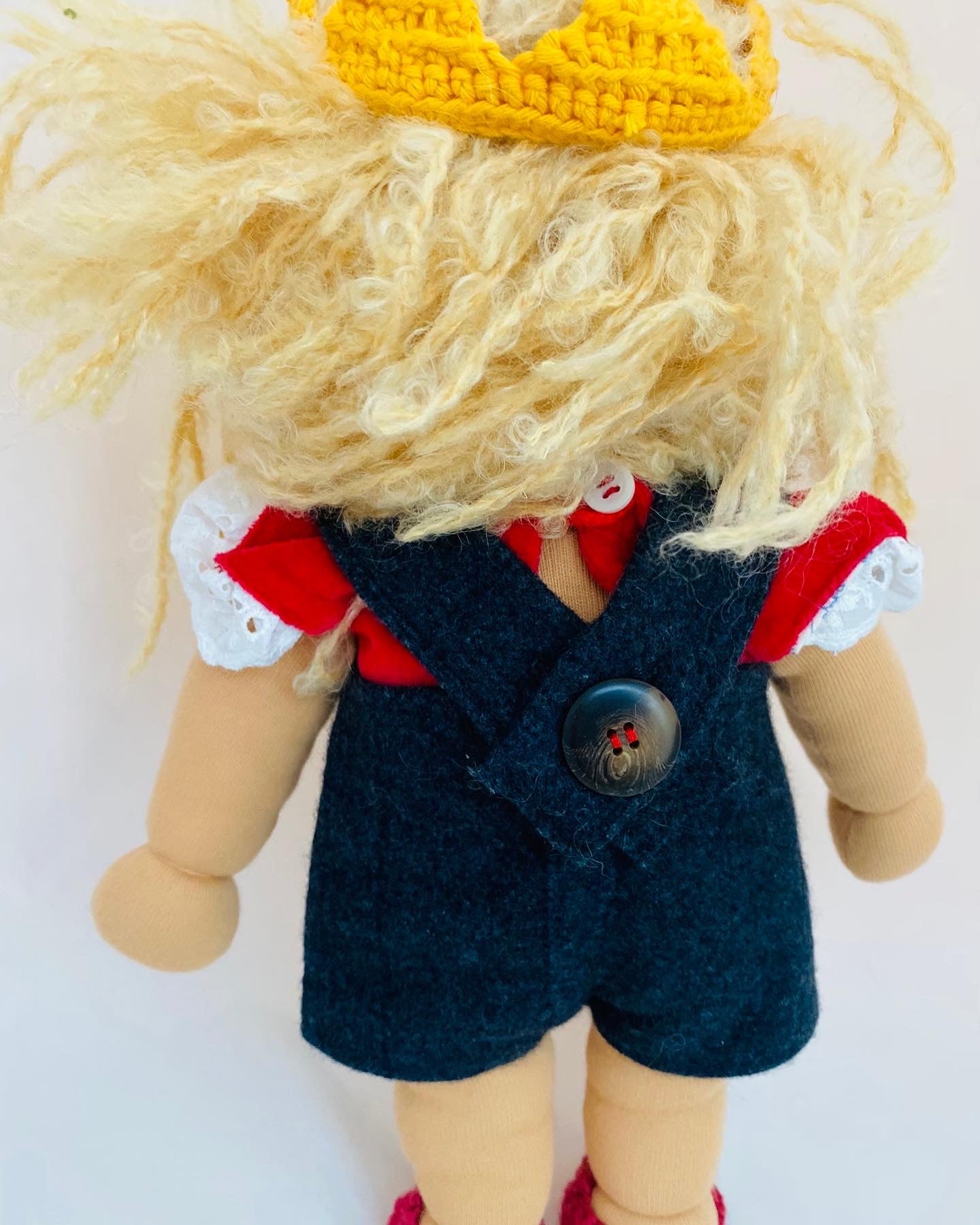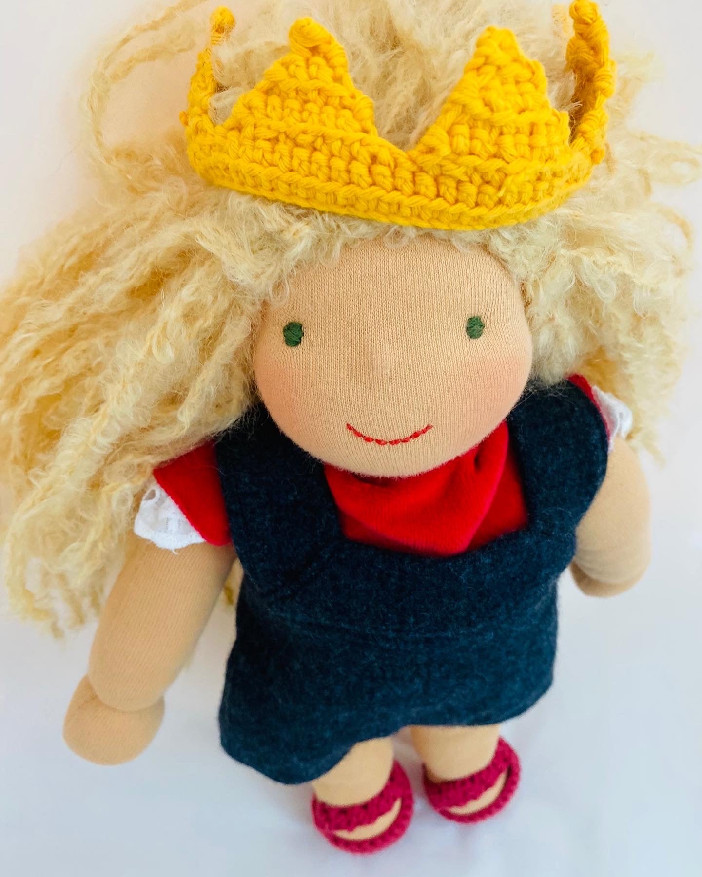 Auf dem Kopf hat sie eine schöne gelbe Krone und an den Füsschen rote Riemchenschuhe.