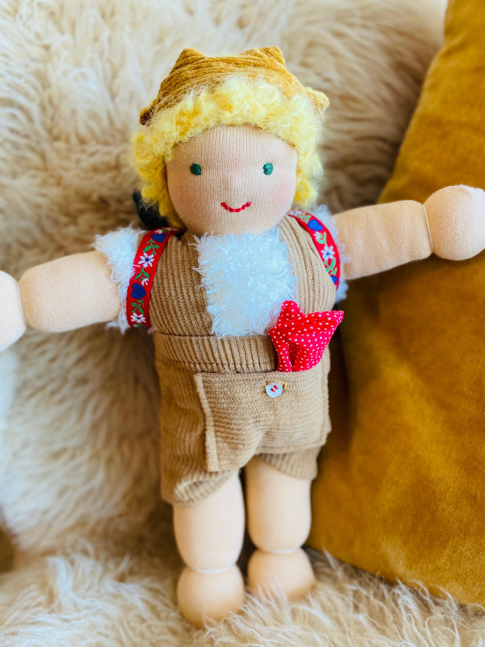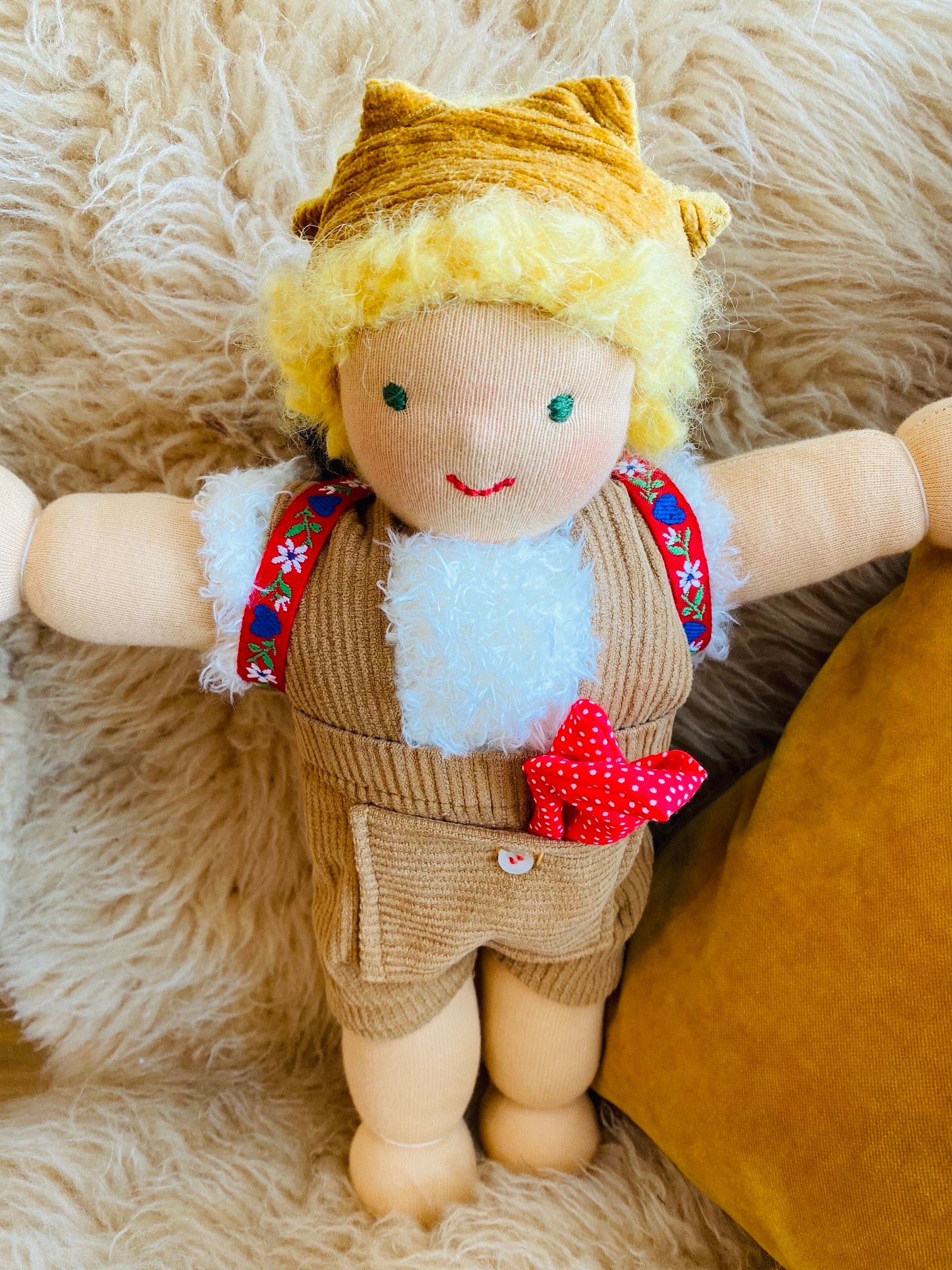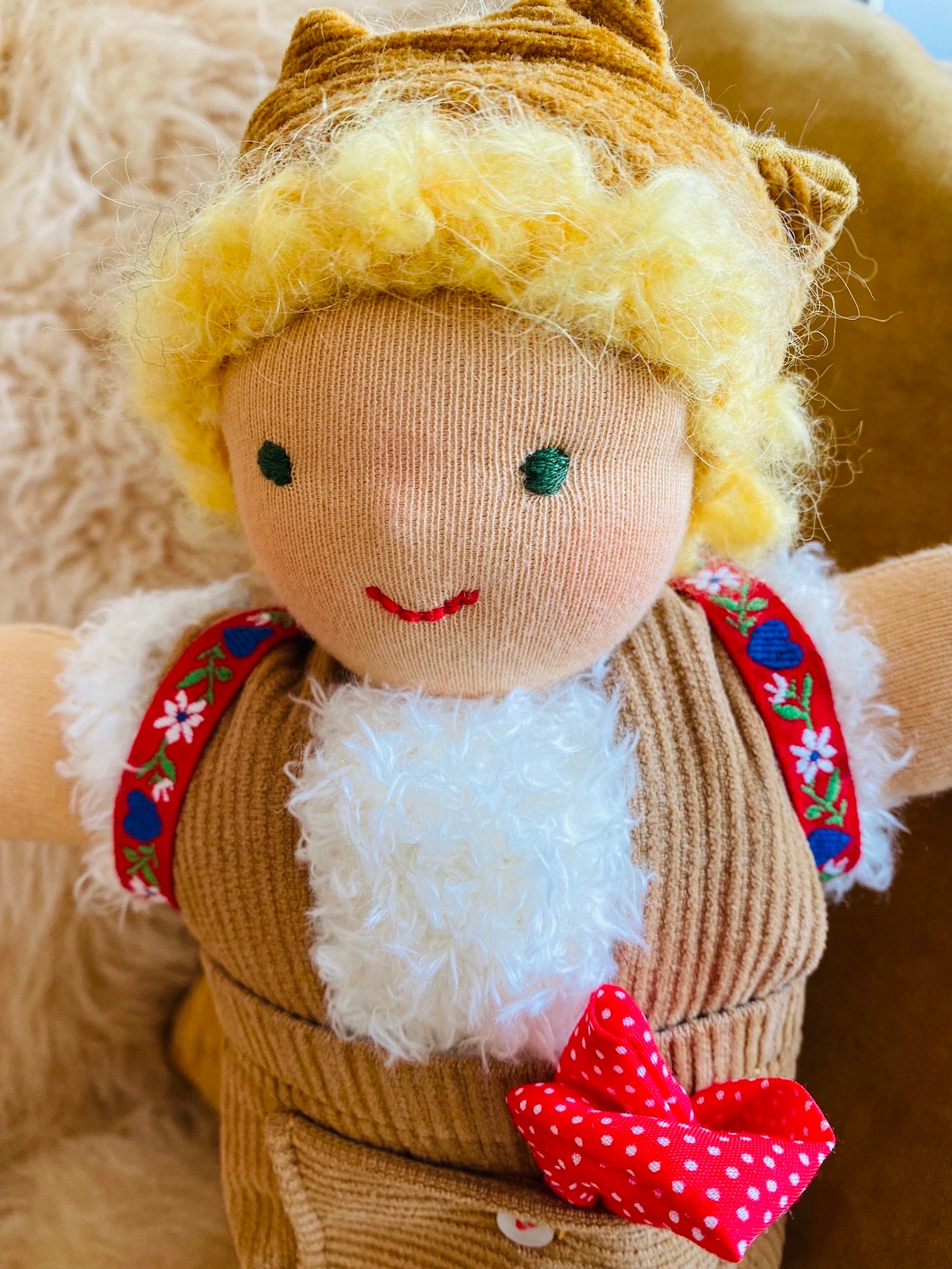 LEYF ist ein kleines, ca. 33 cm großes, kuscheliges Waldorf-Puppenkind und ist gefüllt mit gesunder De Witte Engel OEKO-TEX® zertifizierter Schafwolle.