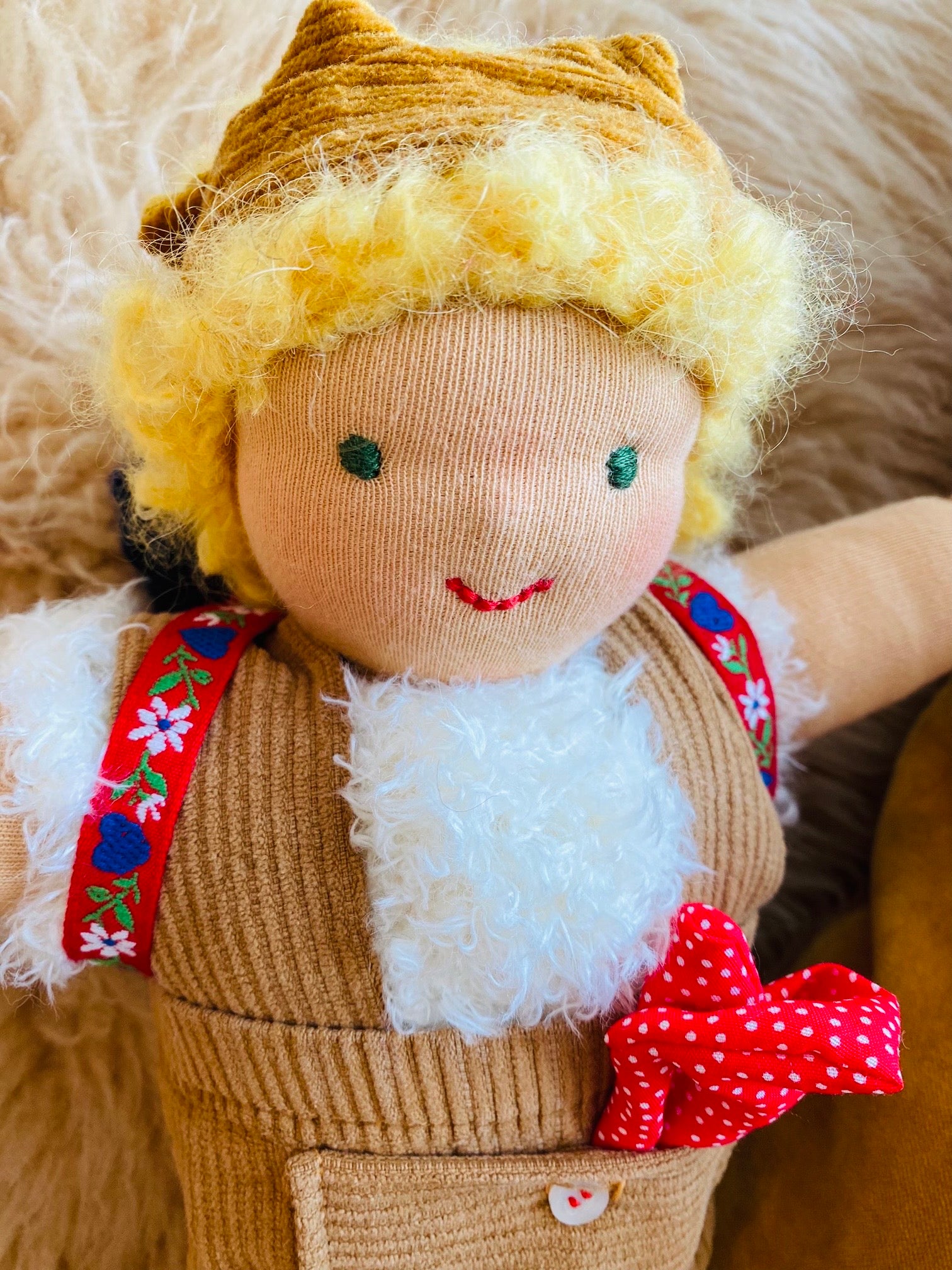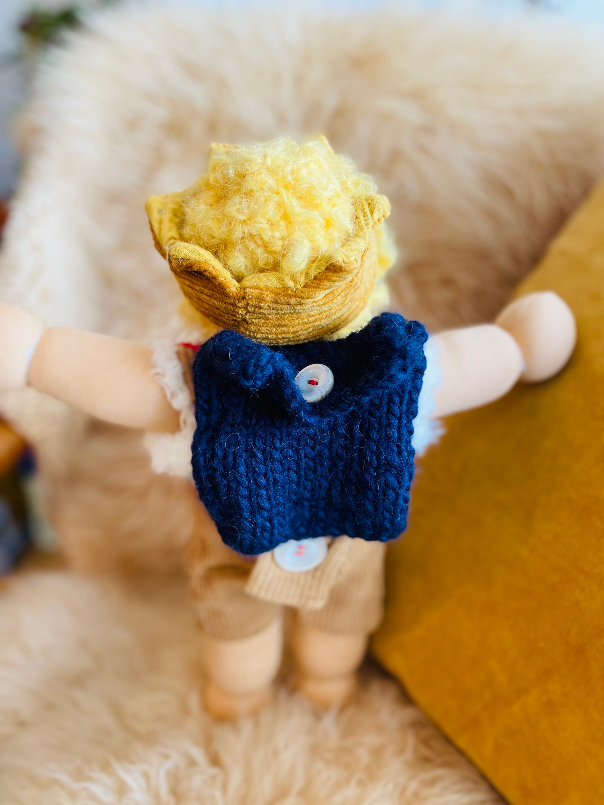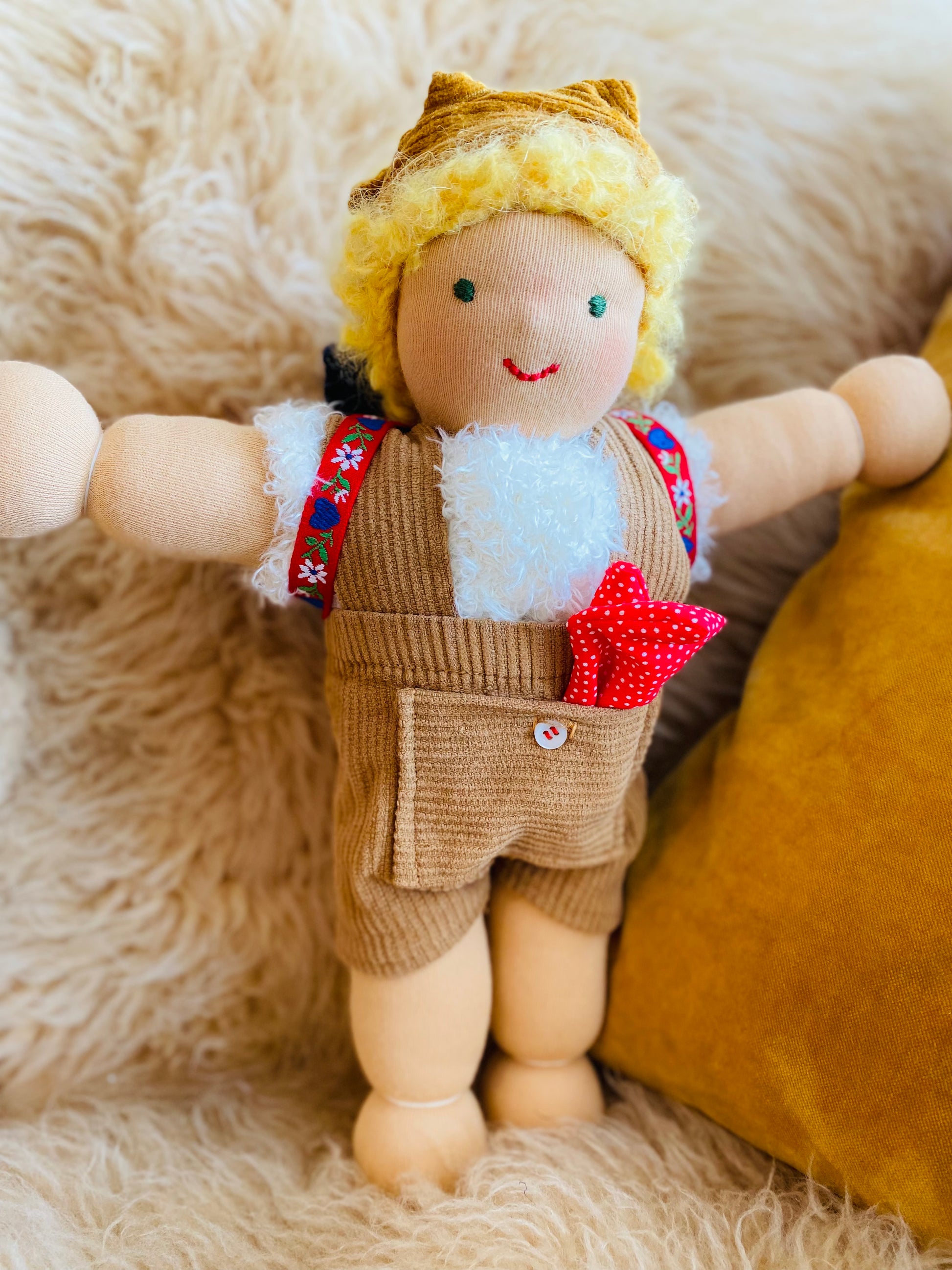 LEYF ist ein kleines, ca. 33 cm großes, kuscheliges Waldorf-Puppenkind und ist gefüllt mit gesunder De Witte Engel OEKO-TEX® zertifizierter Schafwolle.