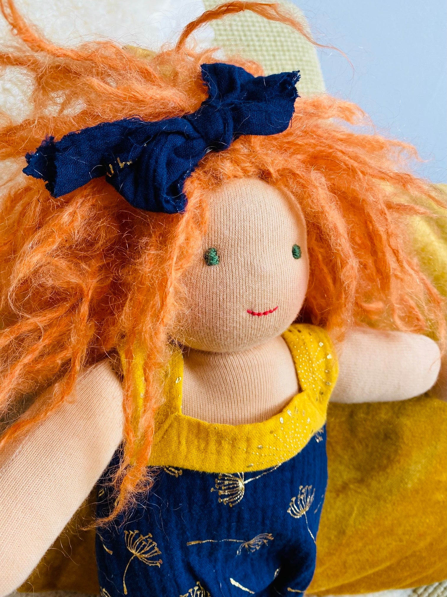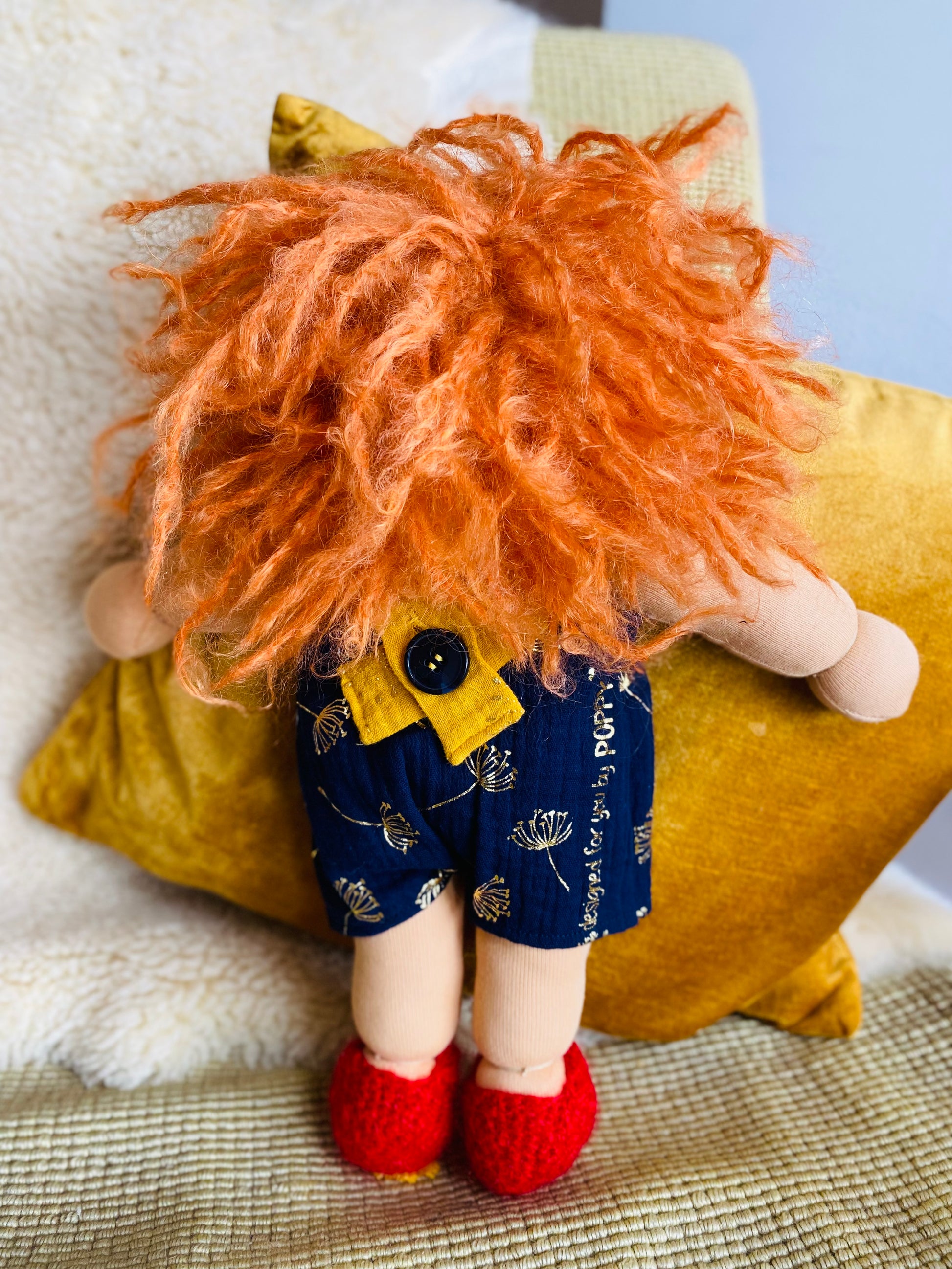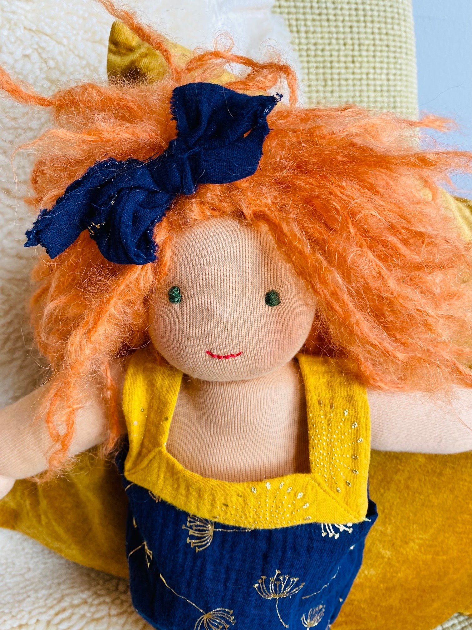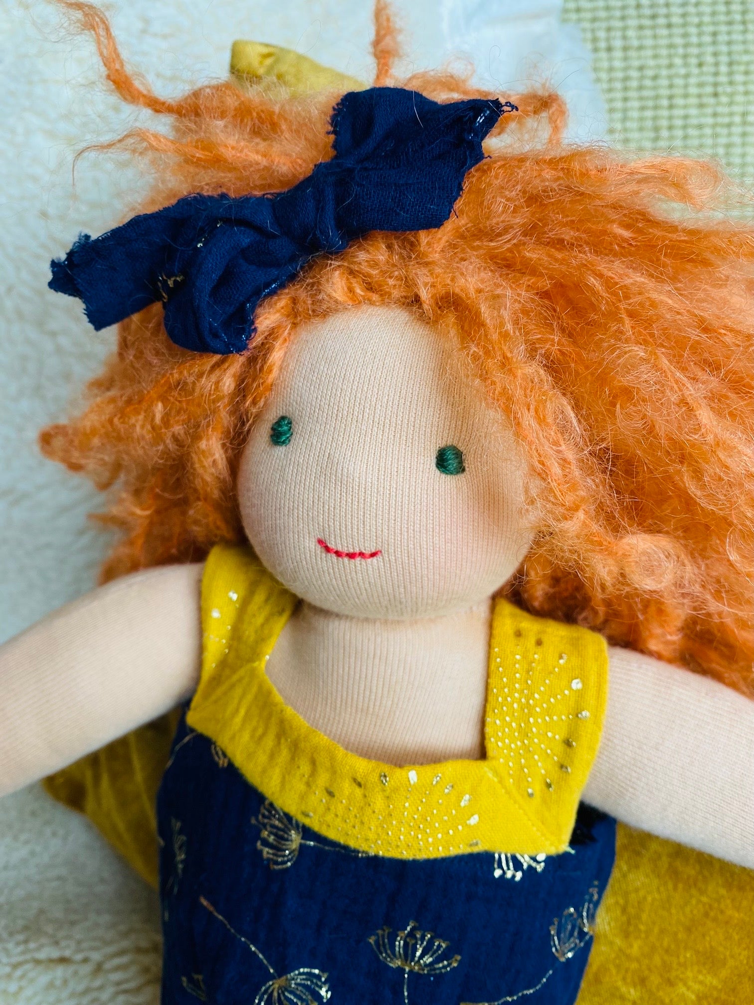 Die Mohair-Locke besteht aus 74% Mohair, 17% Schurwolle und 9% Polyamid. Der Puppenjersey kommt von „Puppenstoffe" aus der Schweiz und ist OEKO-TEX® zertifiziert und super robust.