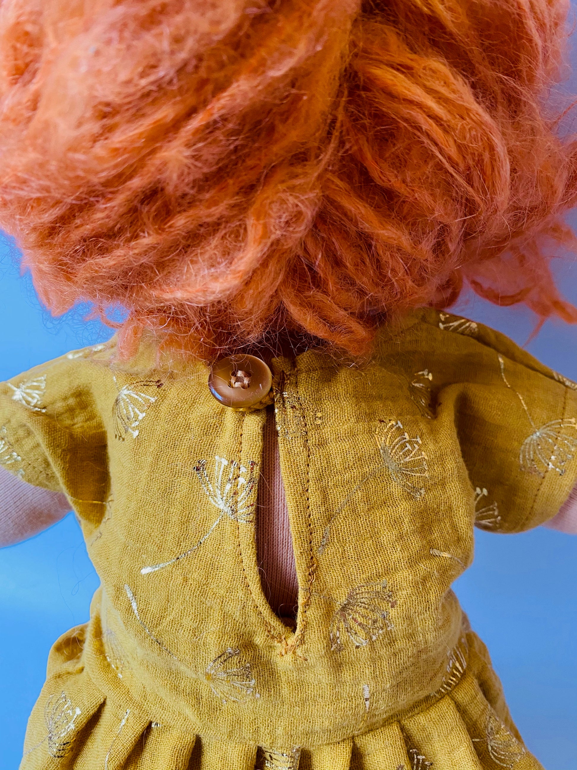 Sie trägt ein gelbes Musselin Kleid mit goldenem Blumendruck und eine gelbe Musselin Hose. Im Haar hat sie eine gelbe Schleife.