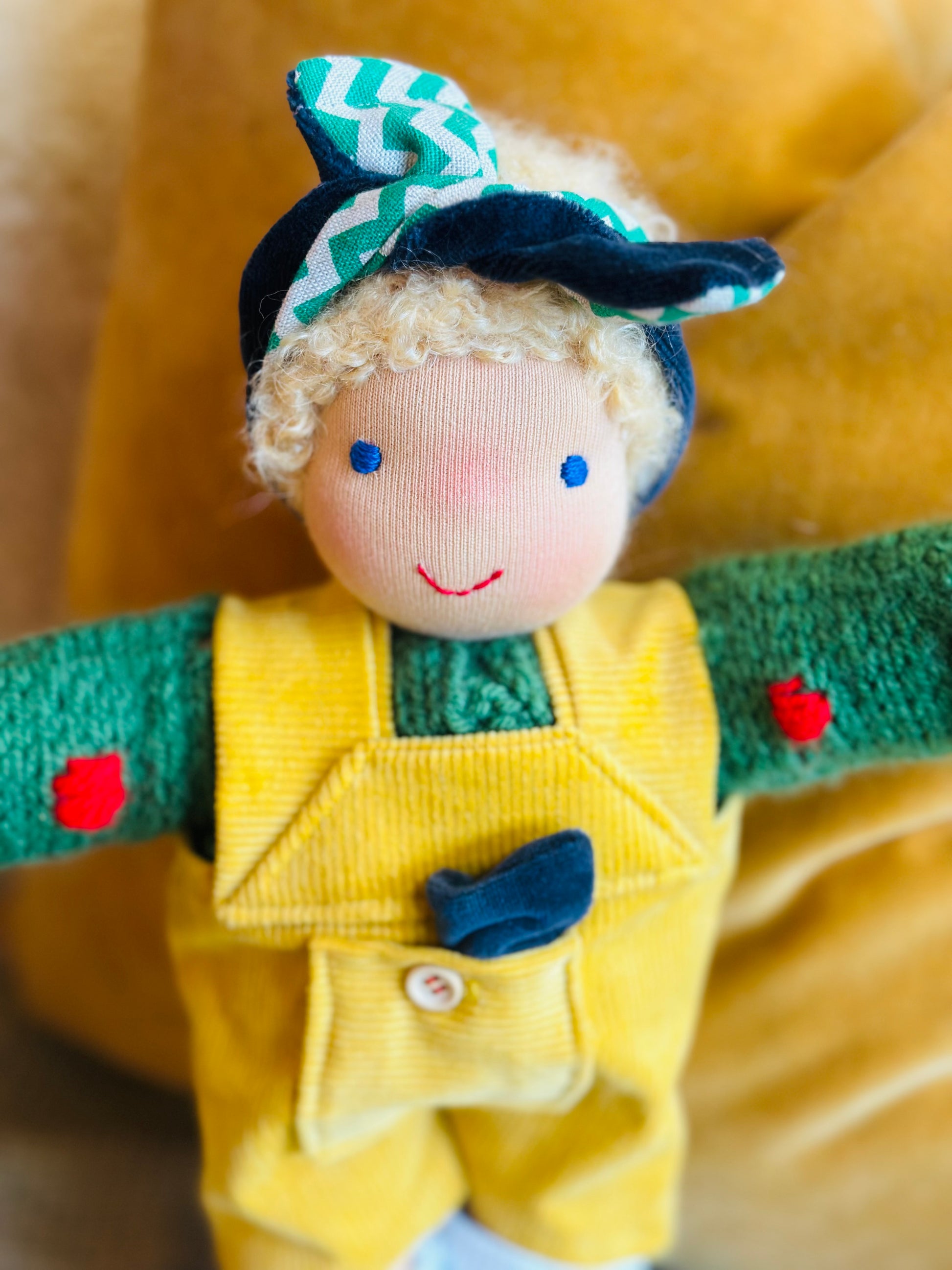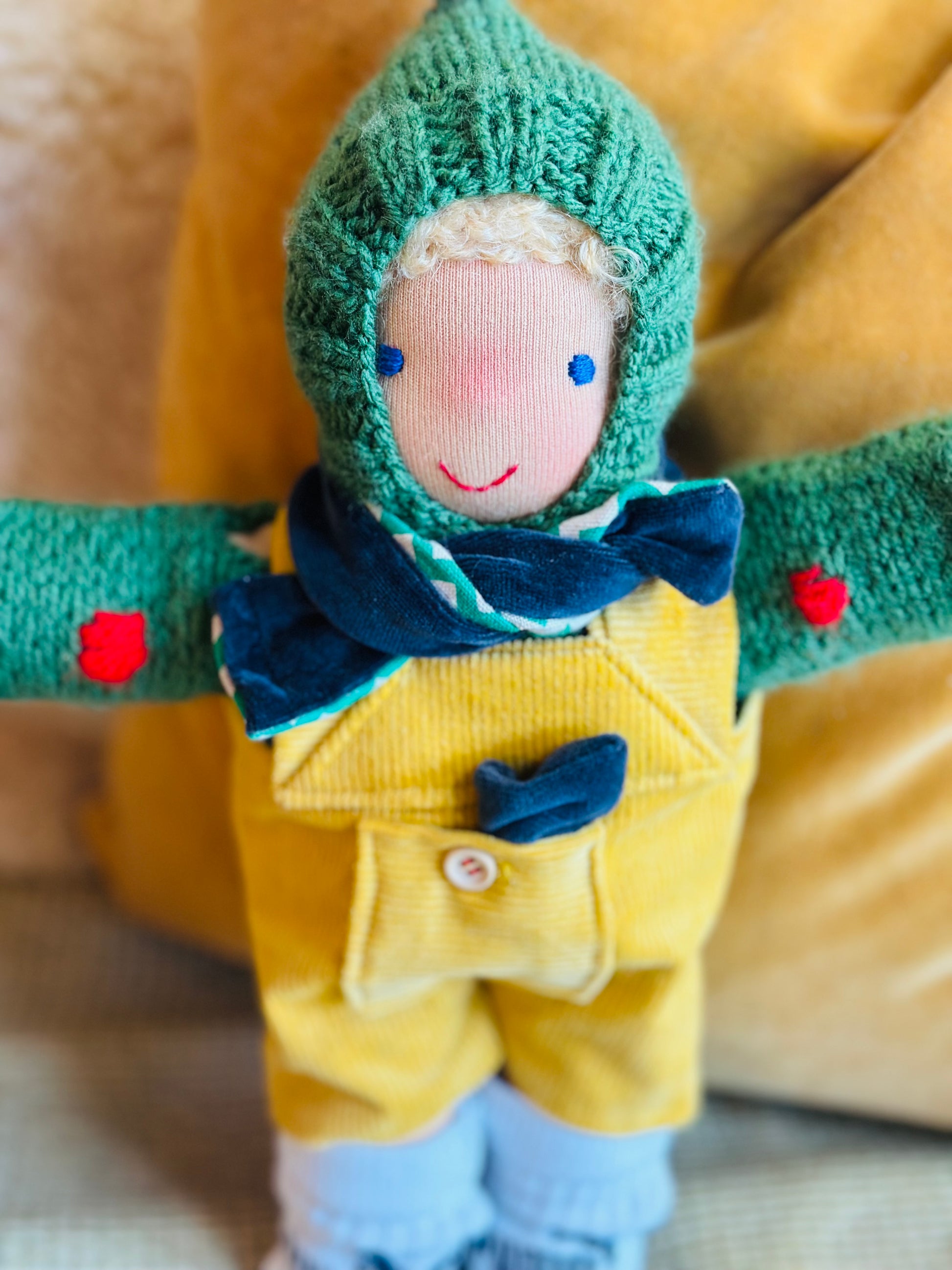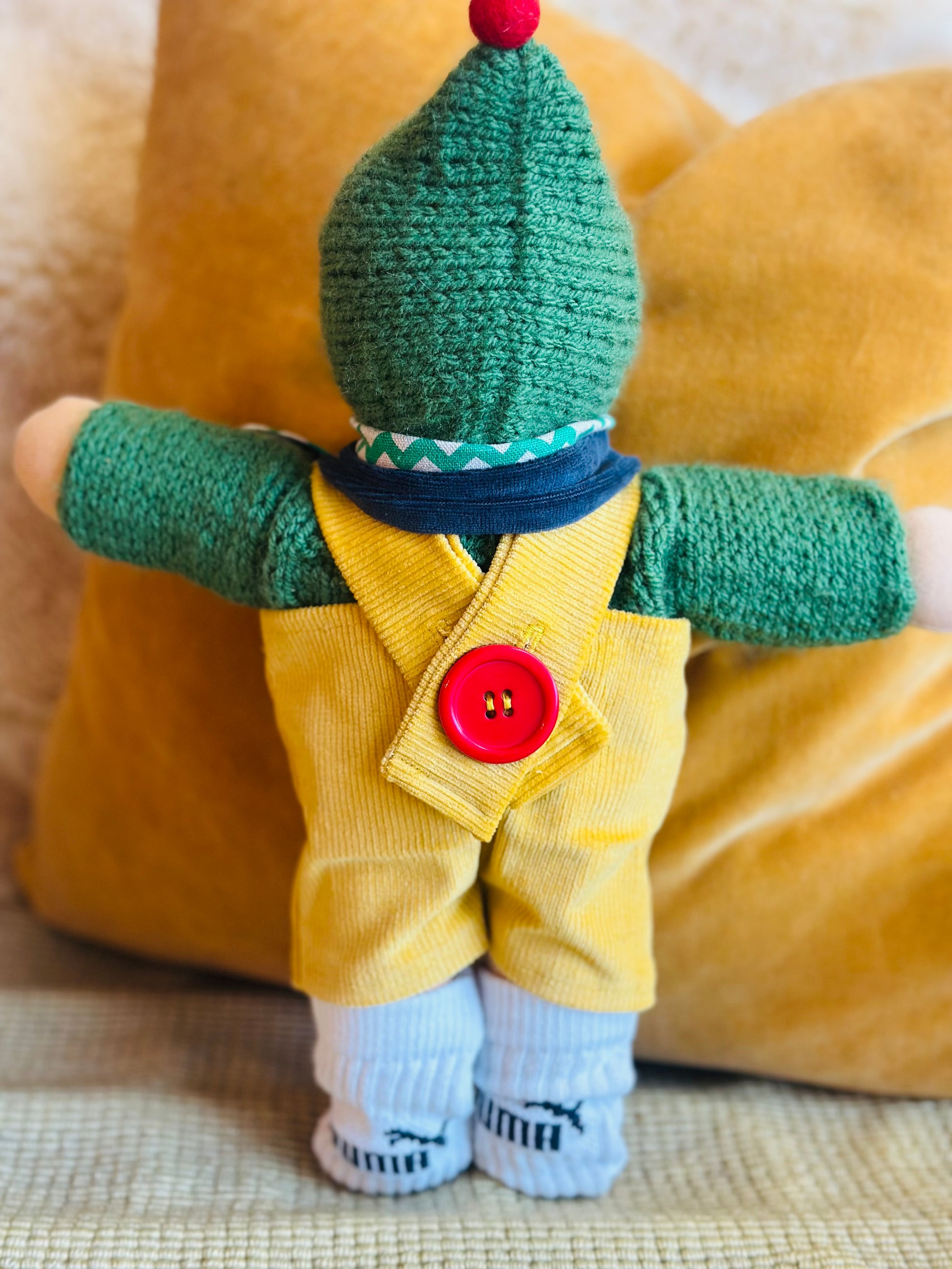 MATTI ist ein kleines, ca. 33 cm großes, kuscheliges Waldorf-Puppenkind und ist gefüllt mit gesunder Bio zertifizierter Schafwolle.