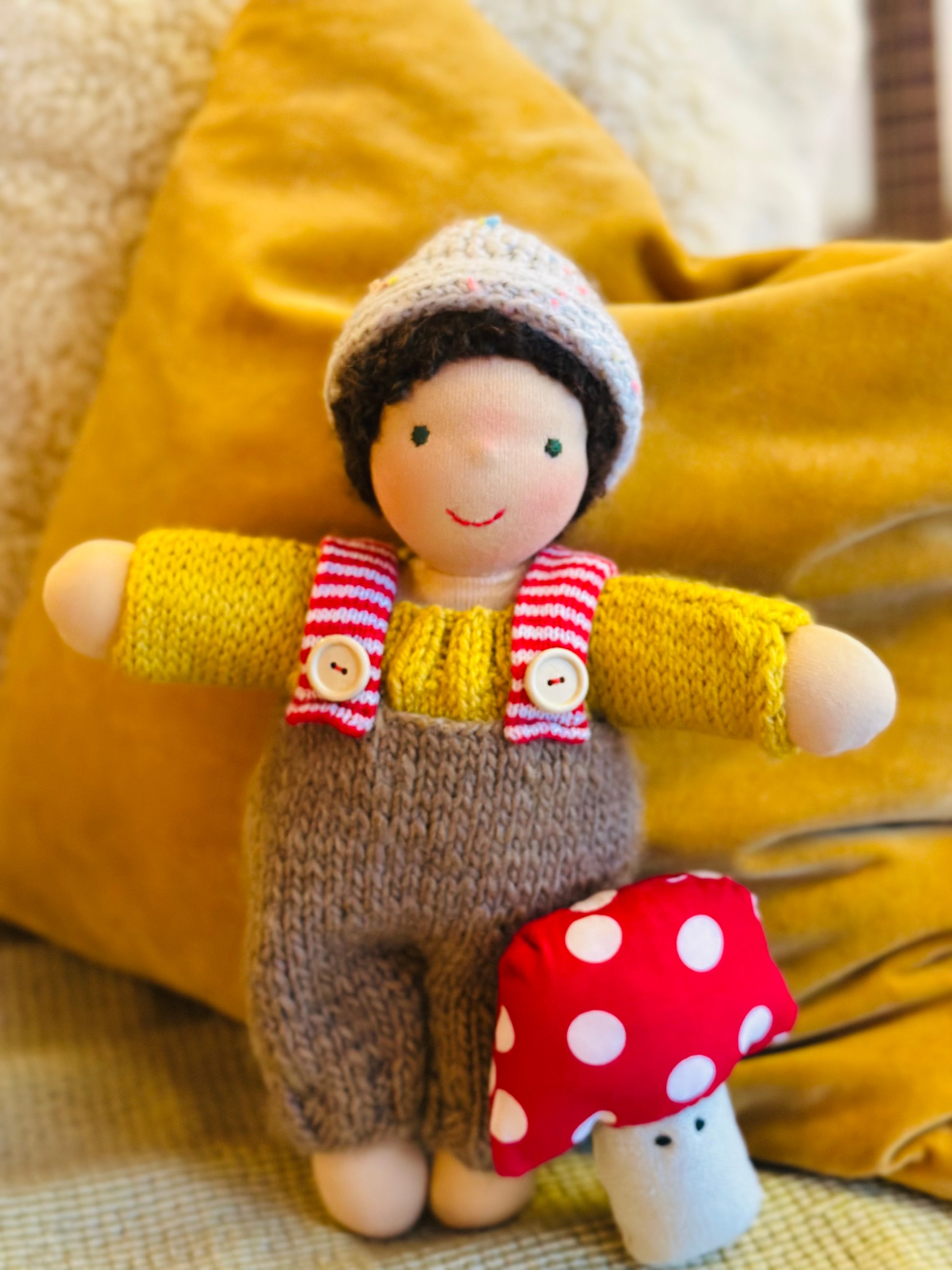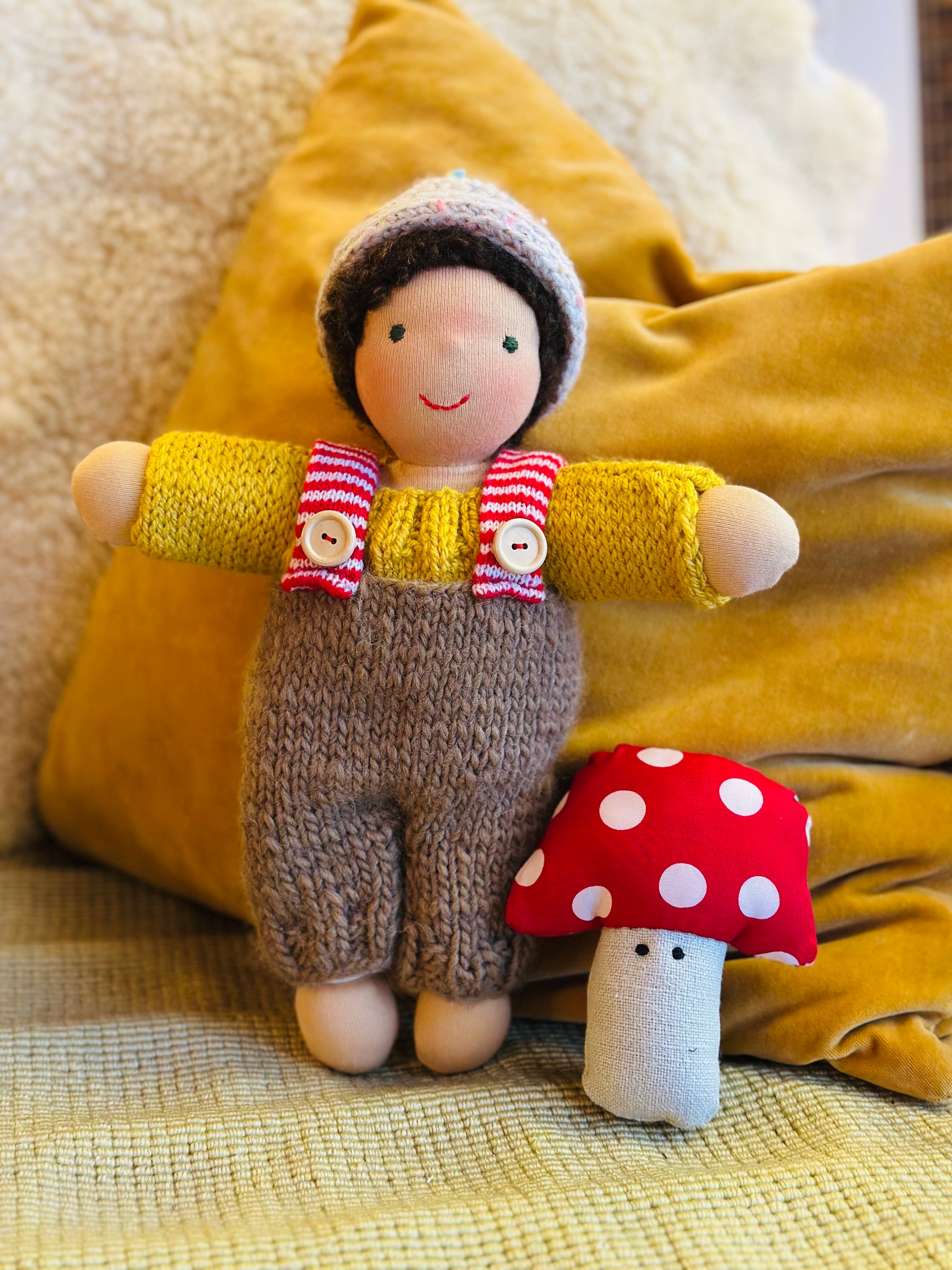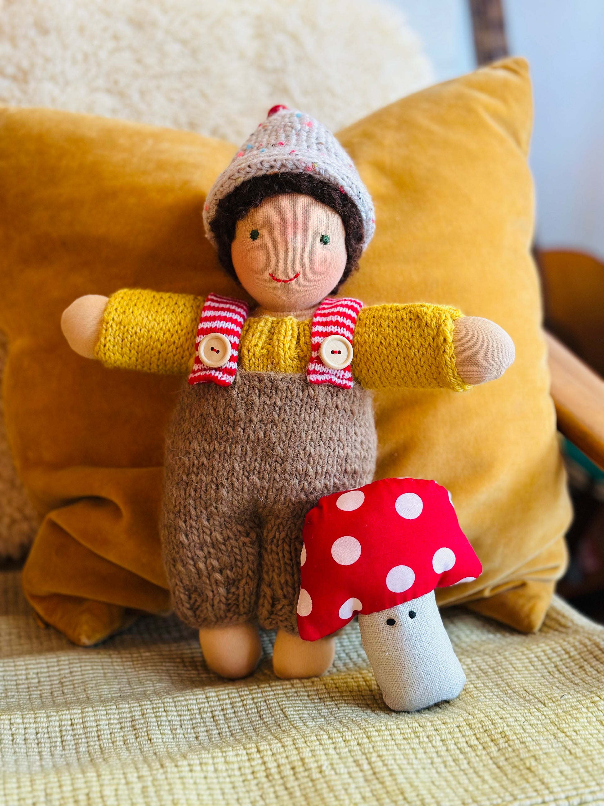 MAX 🍄 ist ein kleines, ca. 33 cm großes, kuscheliges Waldorf-Puppenkind und ist gefüllt mit gesunder De Witte Engel OEKO-TEX® zertifizierter Schafwolle.