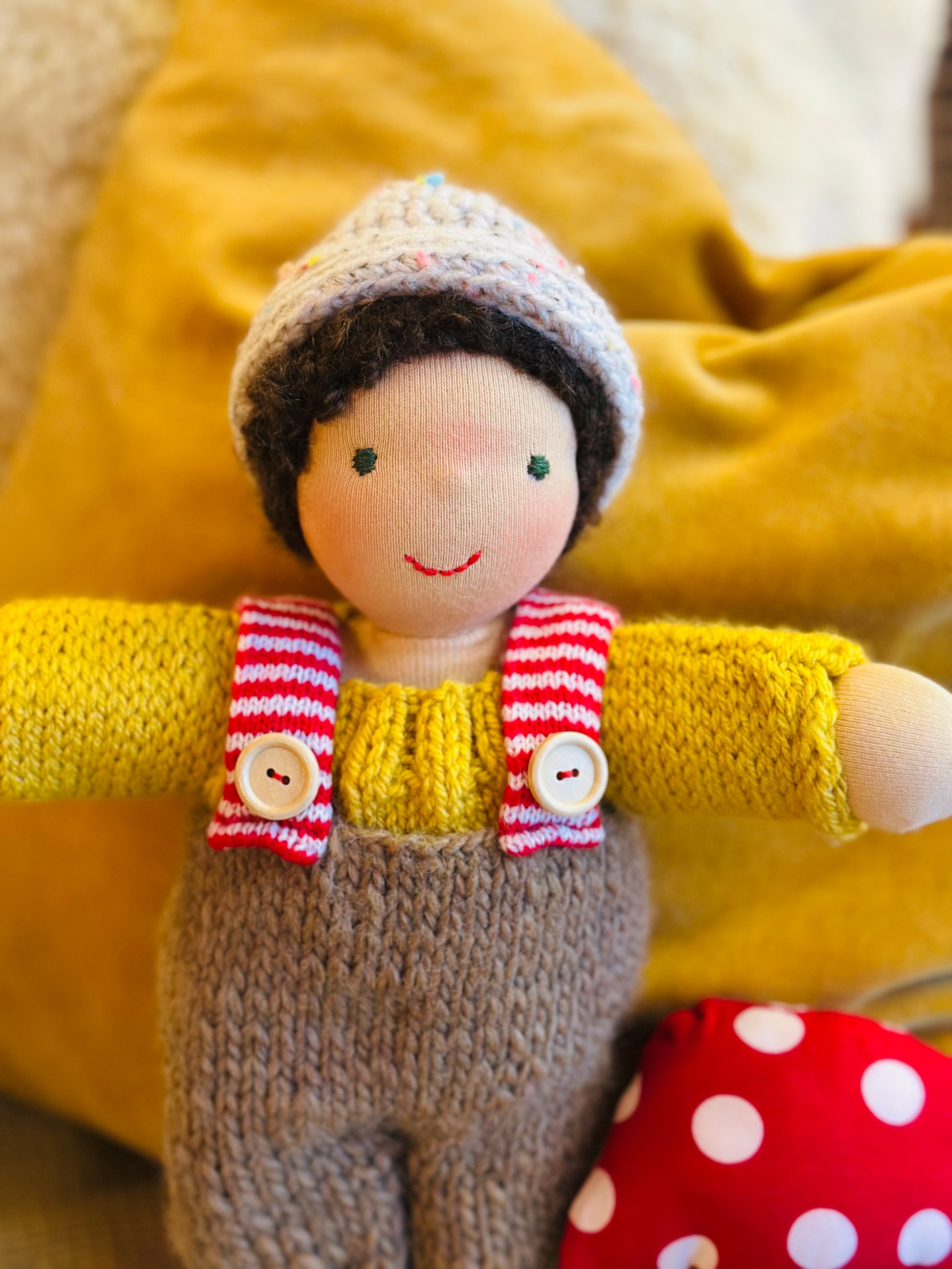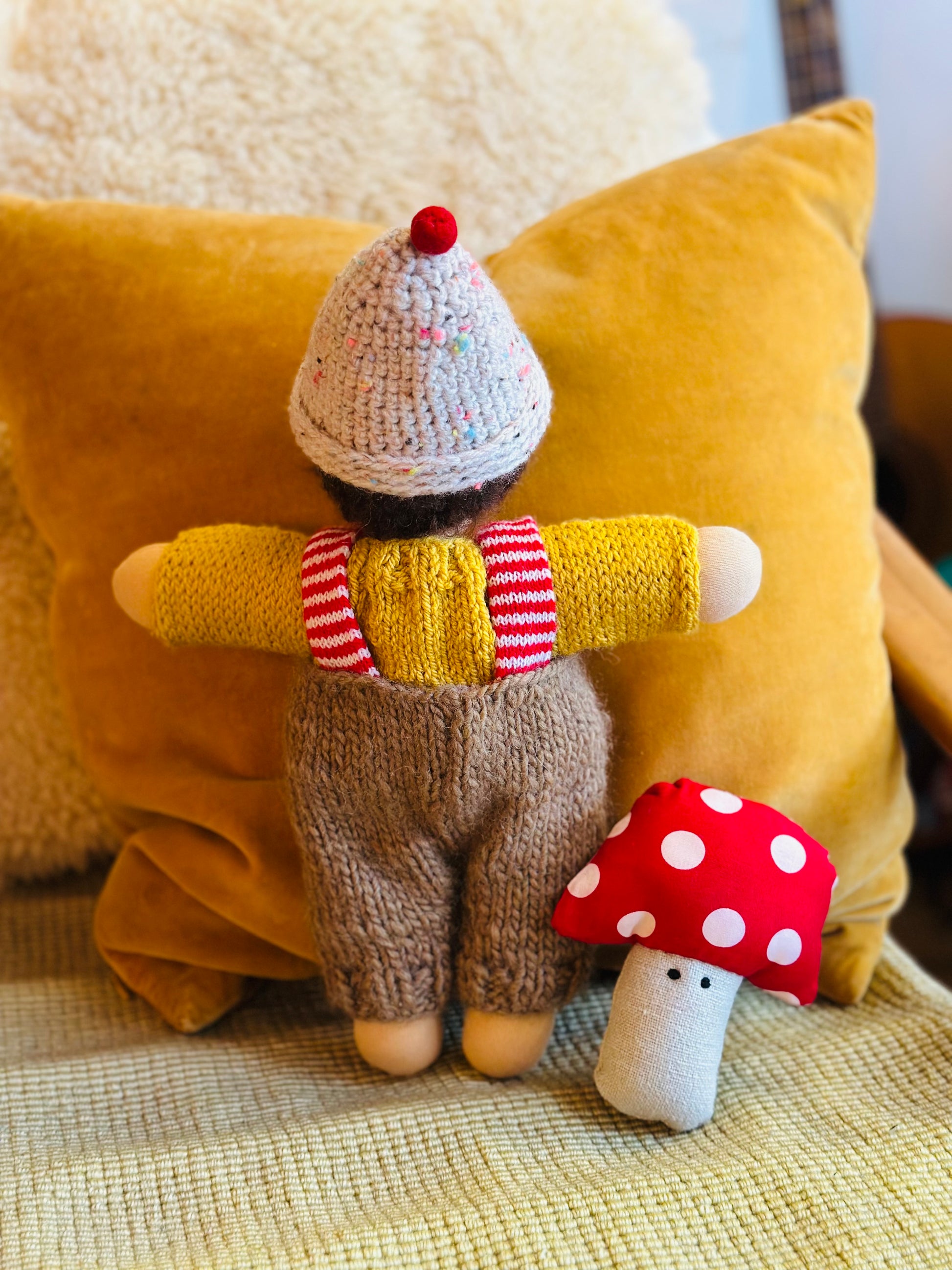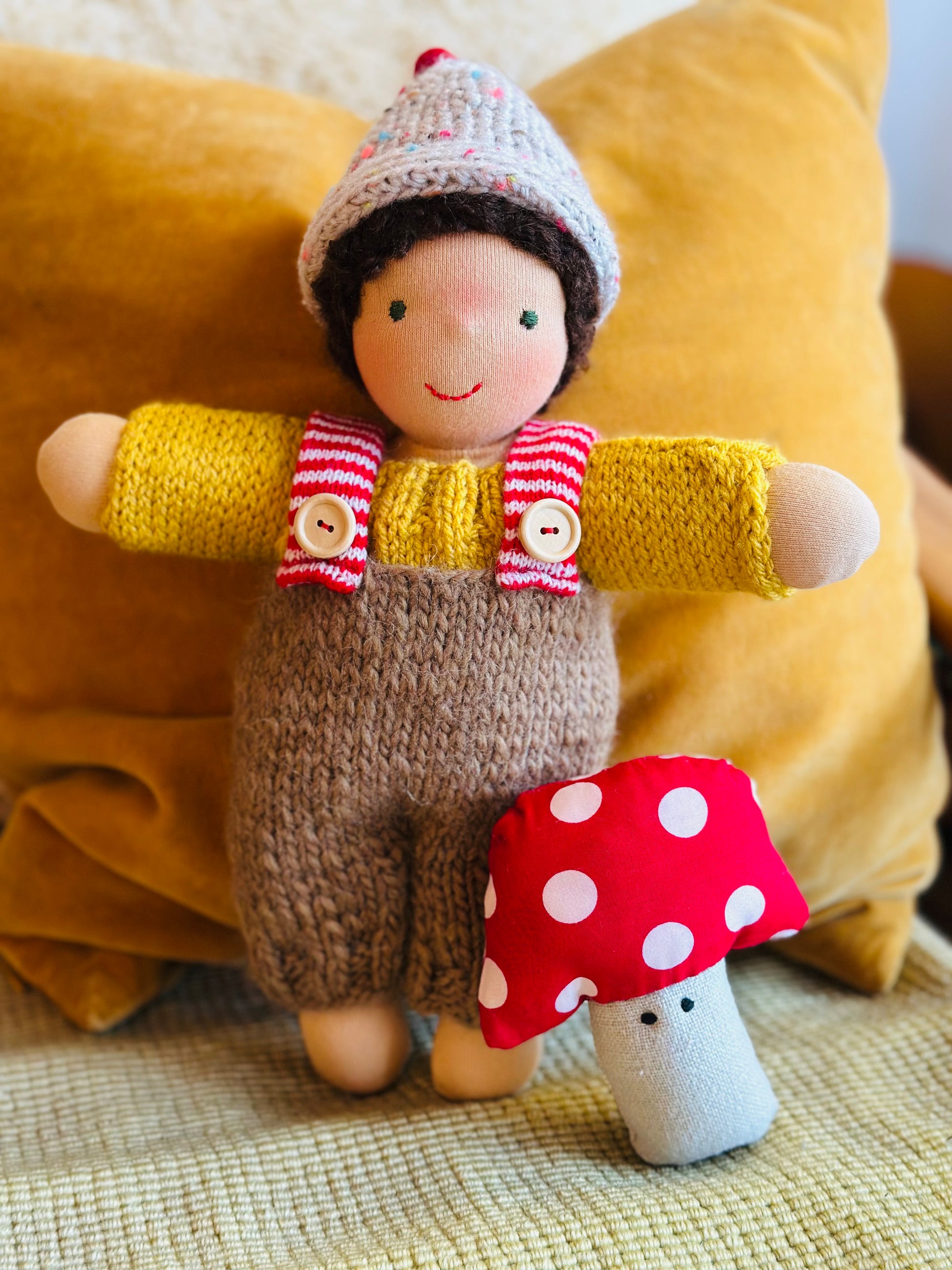 MAX 🍄 ist ein kleines, ca. 33 cm großes, kuscheliges Waldorf-Puppenkind und ist gefüllt mit gesunder De Witte Engel OEKO-TEX® zertifizierter Schafwolle.