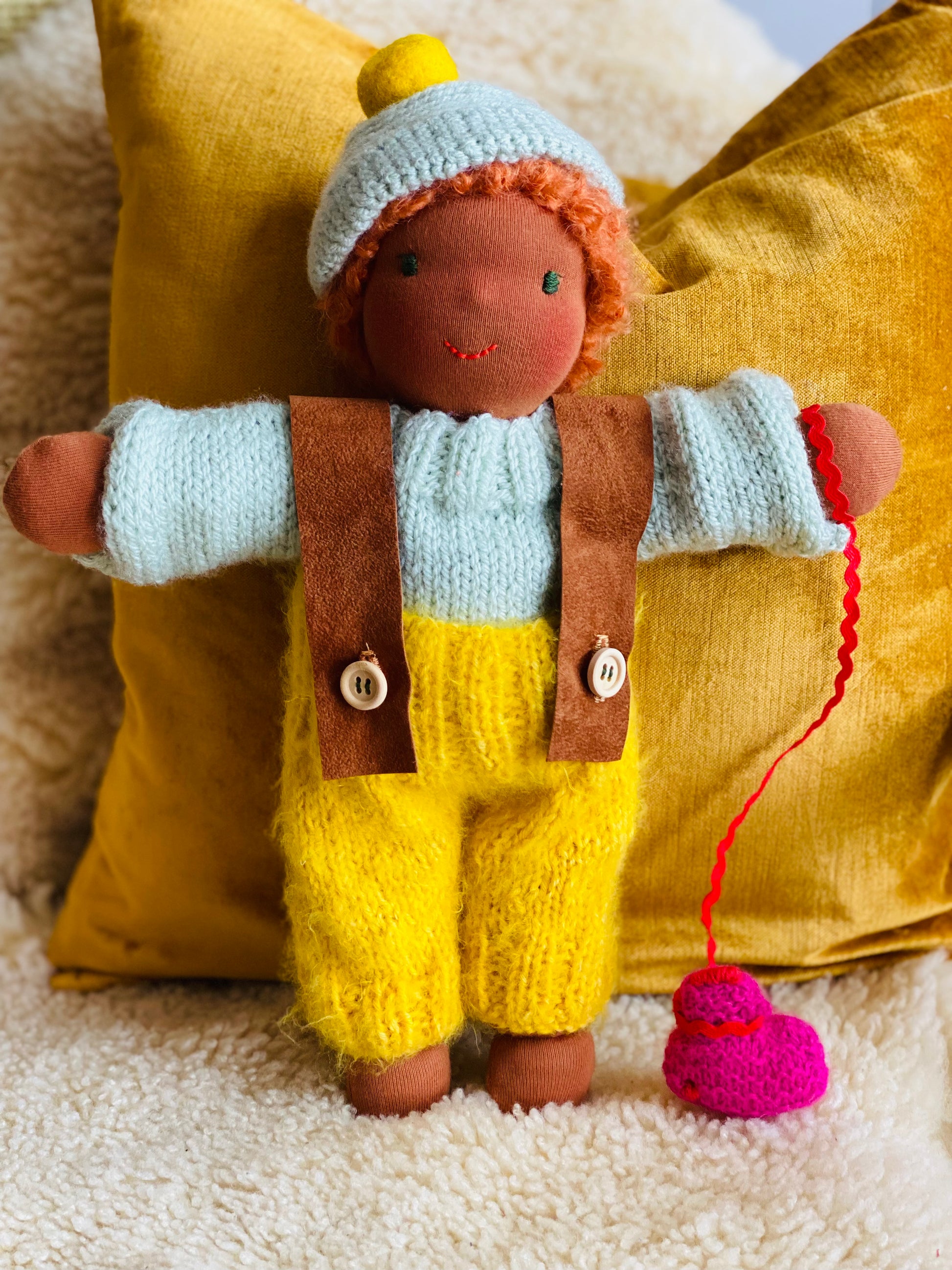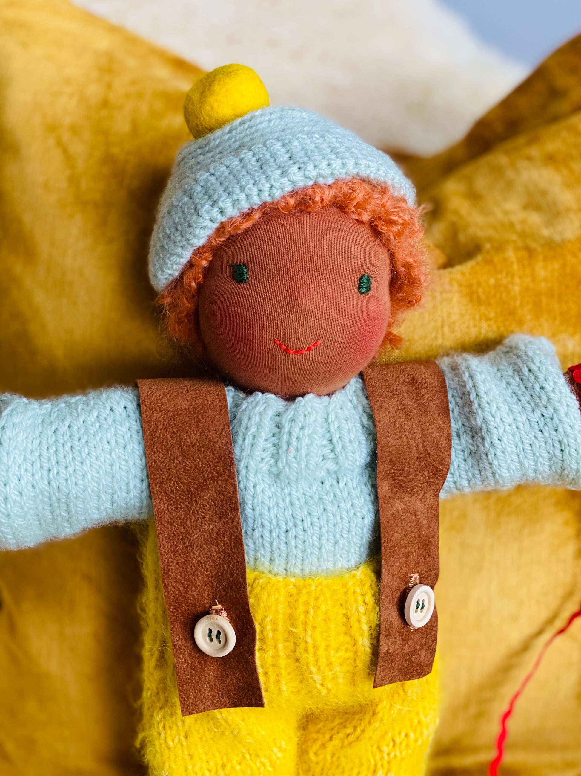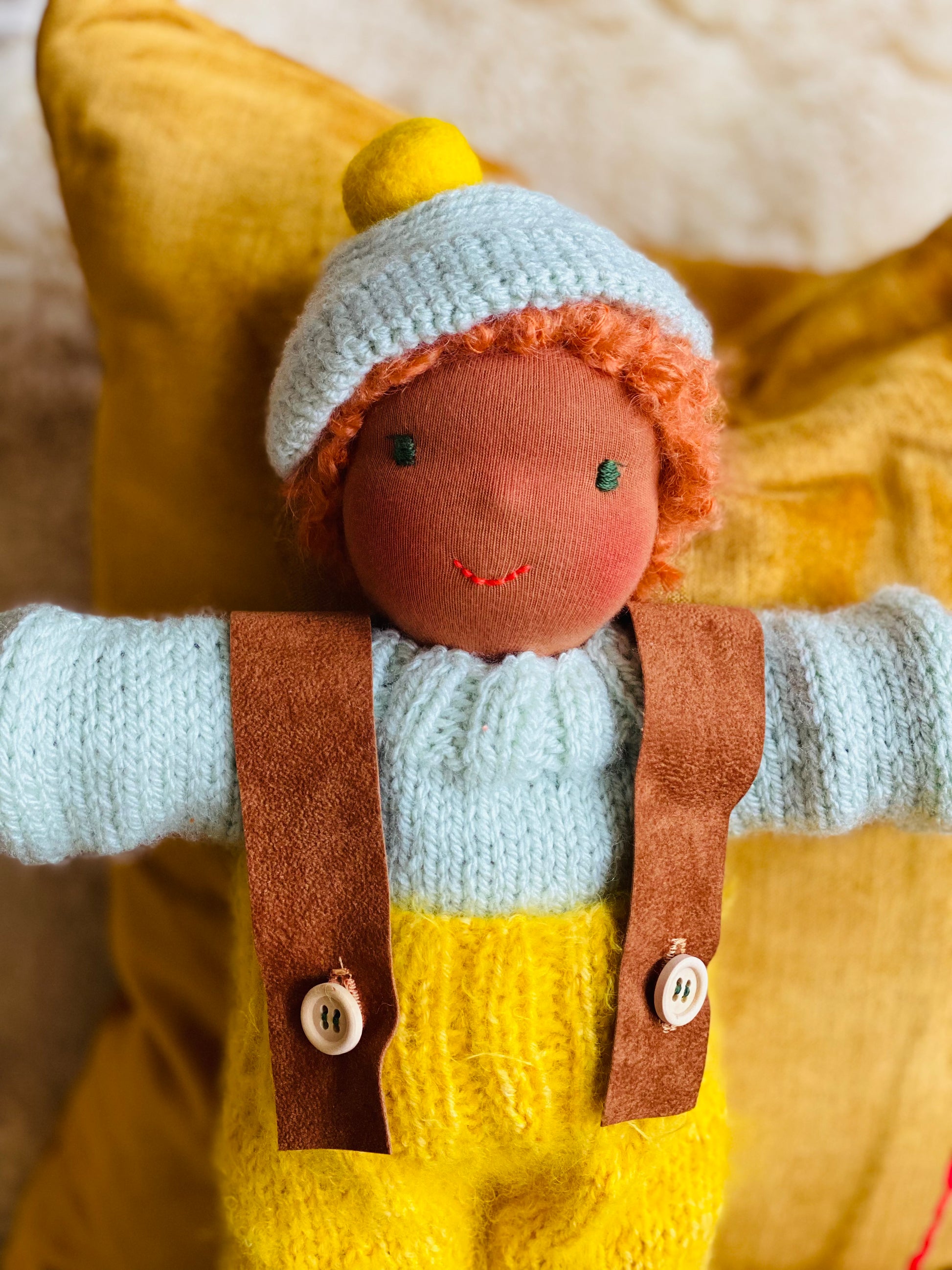 NOAM ist ein kleines, ca. 33 cm großes, kuscheliges Waldorf-Puppenkind und ist gefüllt mit gesunder De Witte Engel OEKO-TEX® zertifizierter Schafwolle.