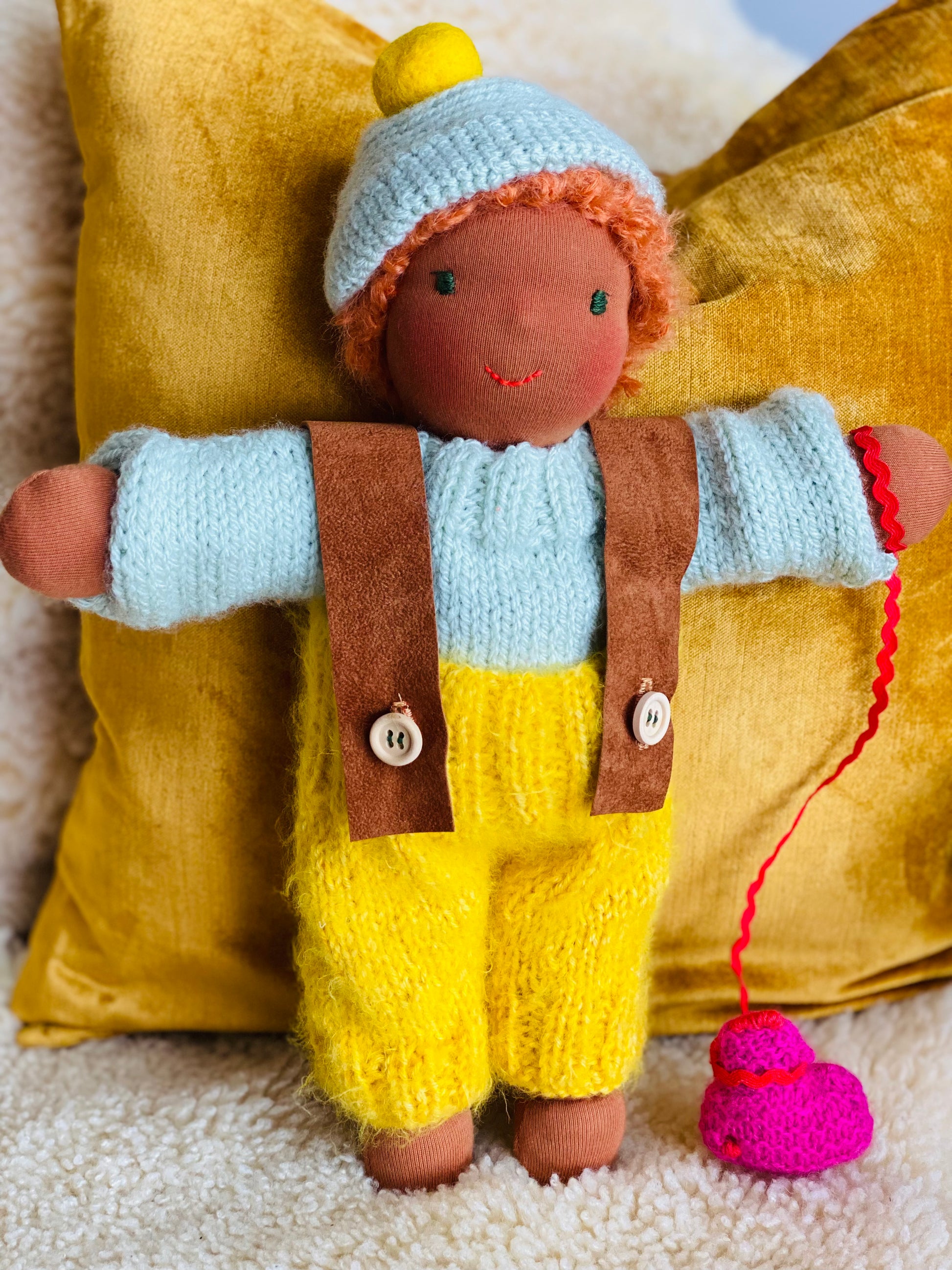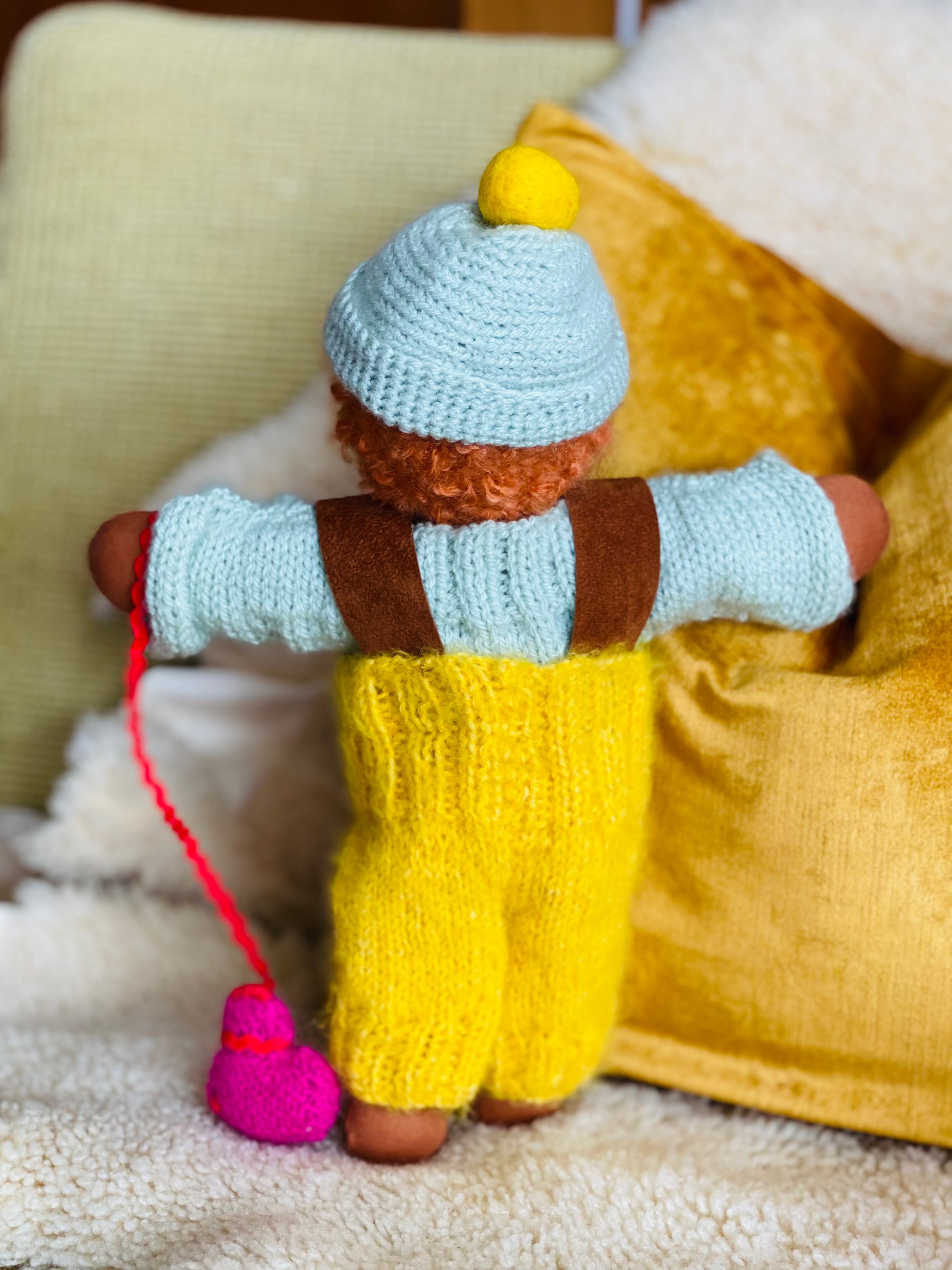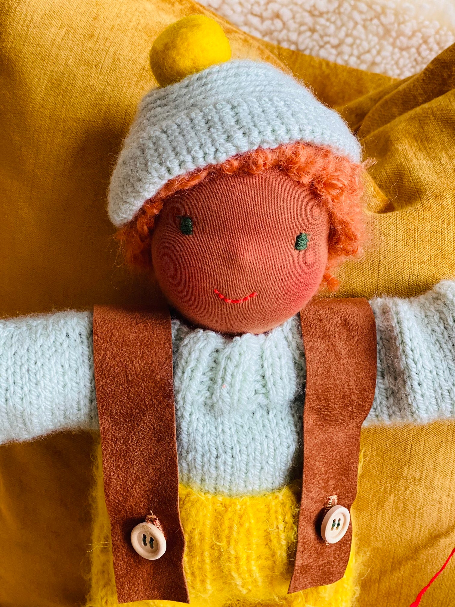 NOAM ist ein kleines, ca. 33 cm großes, kuscheliges Waldorf-Puppenkind und ist gefüllt mit gesunder De Witte Engel OEKO-TEX® zertifizierter Schafwolle.