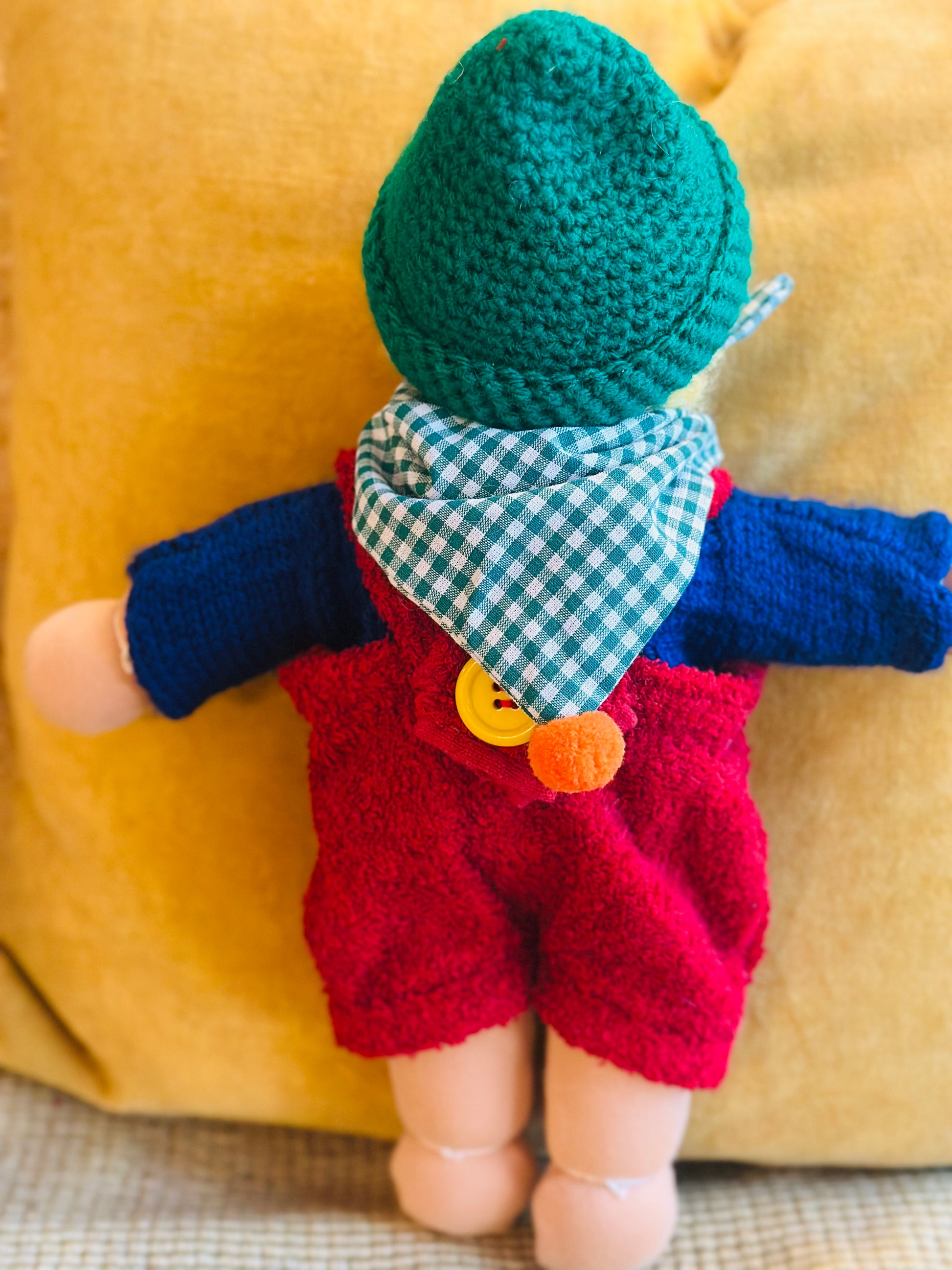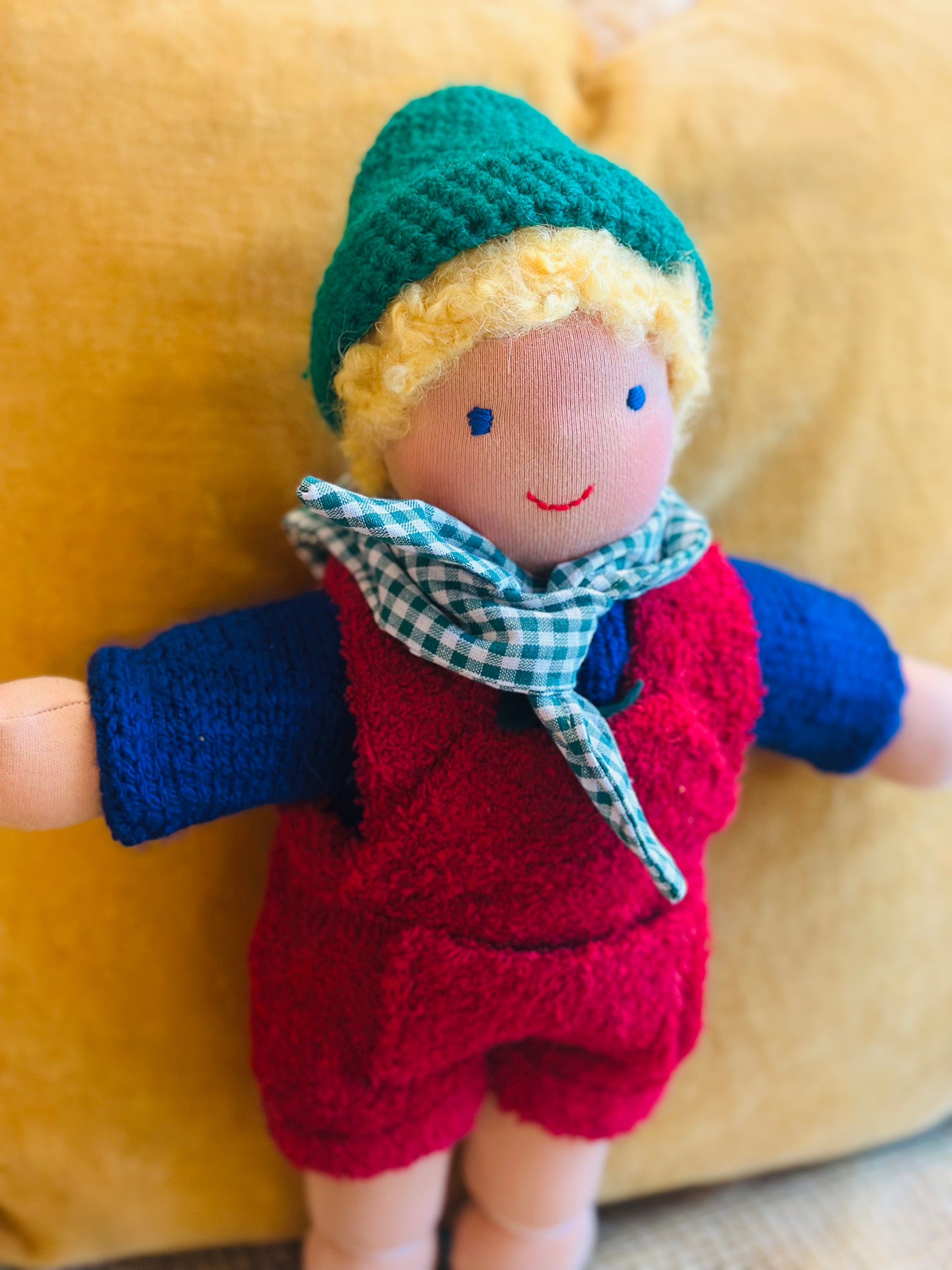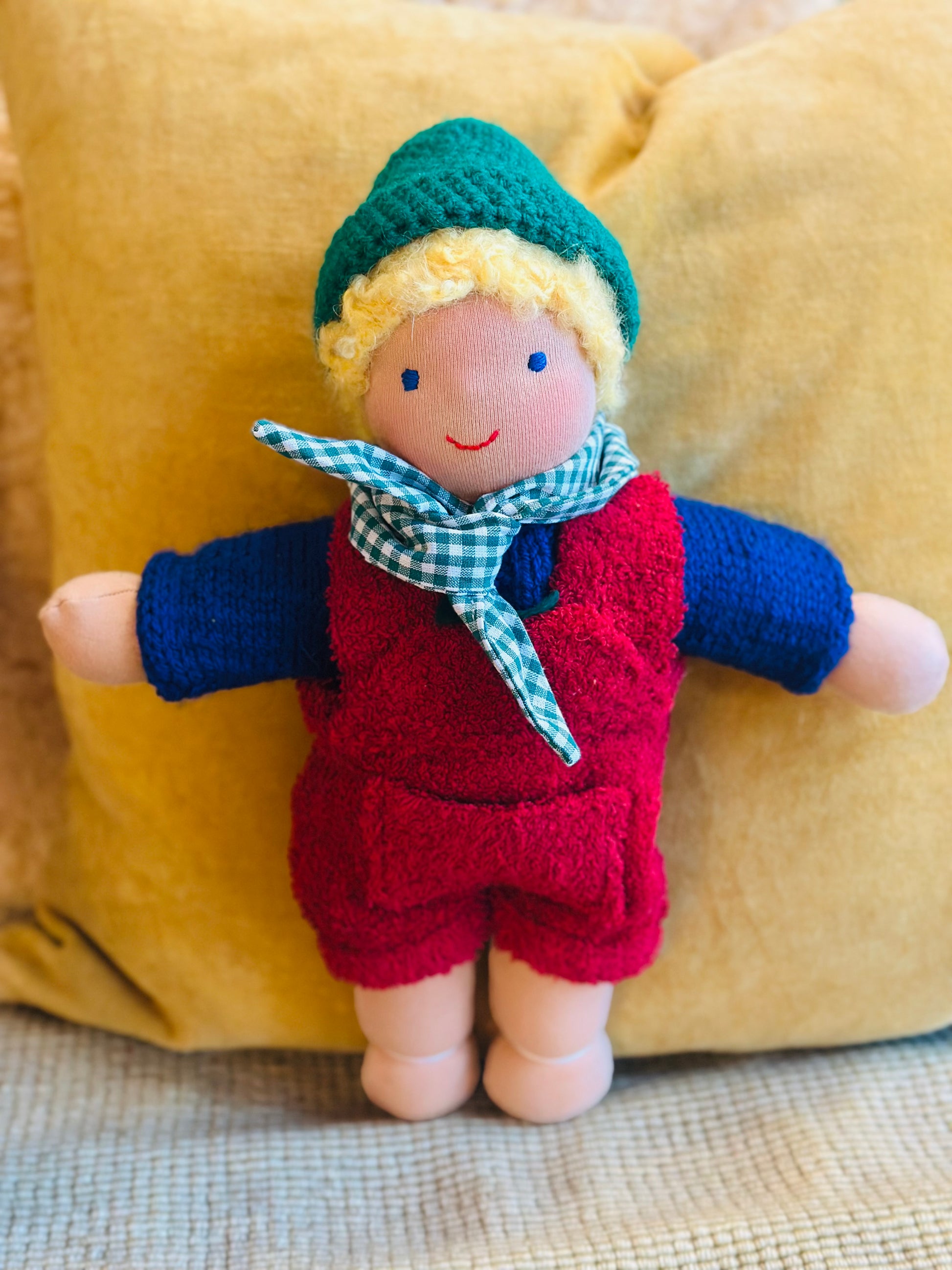 OSCAR ist ein kleines, ca. 33 cm großes, kuscheliges Waldorf-Puppenkind und ist gefüllt mit gesunder Bio zertifizierter Schafwolle.