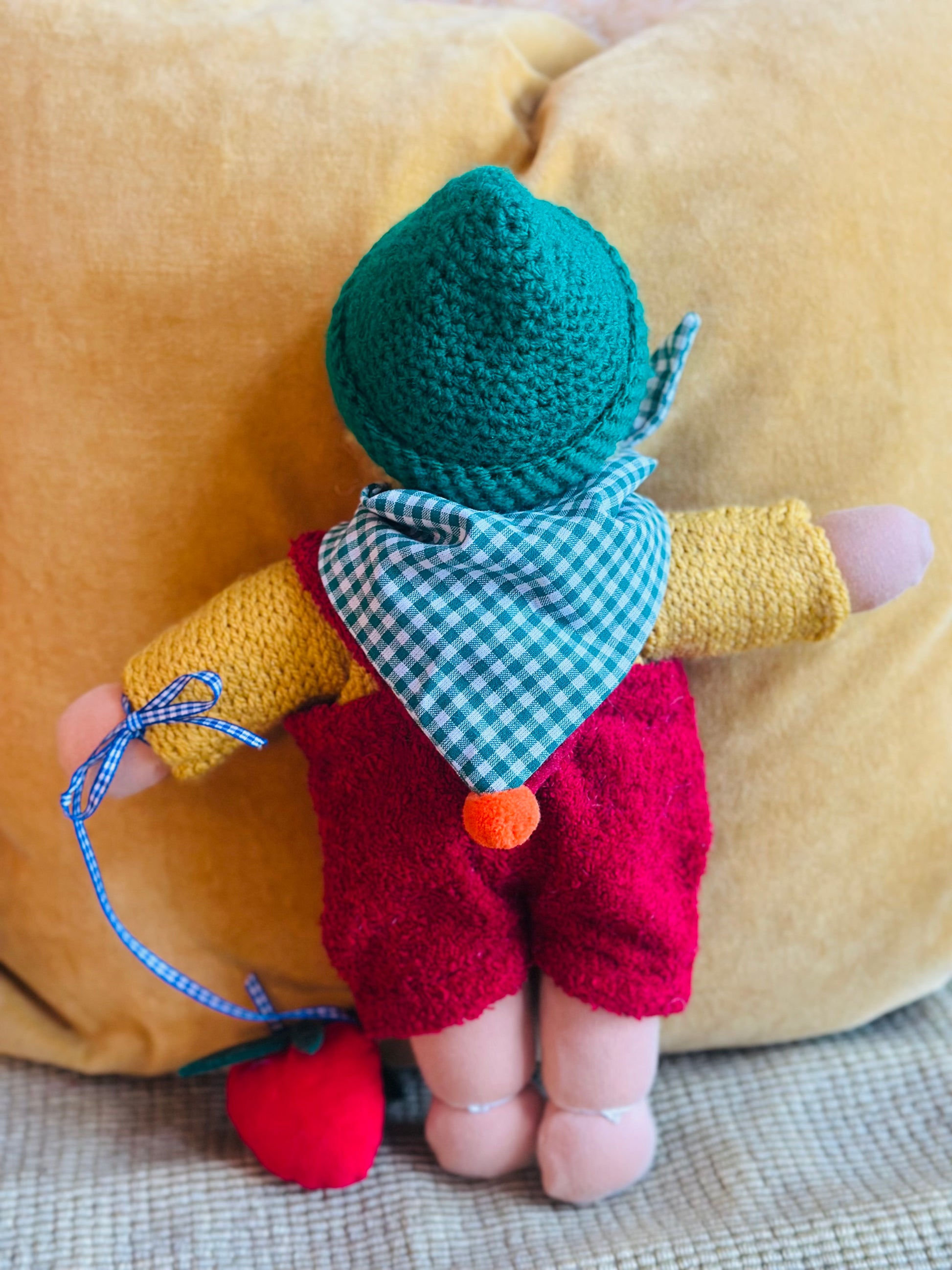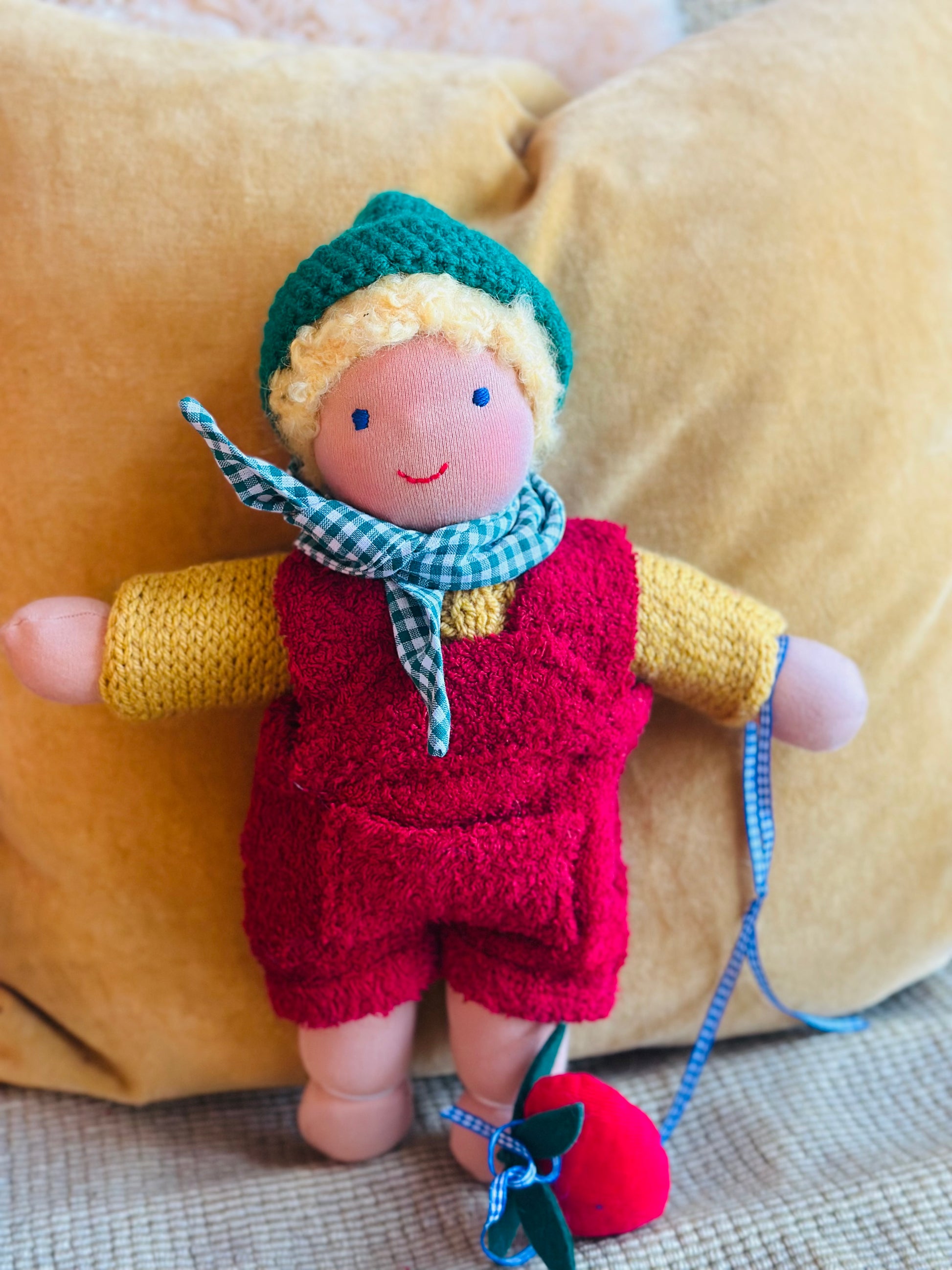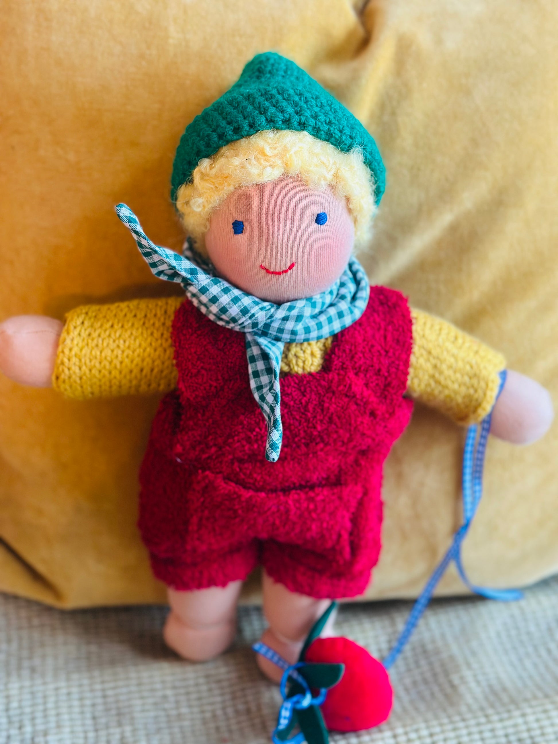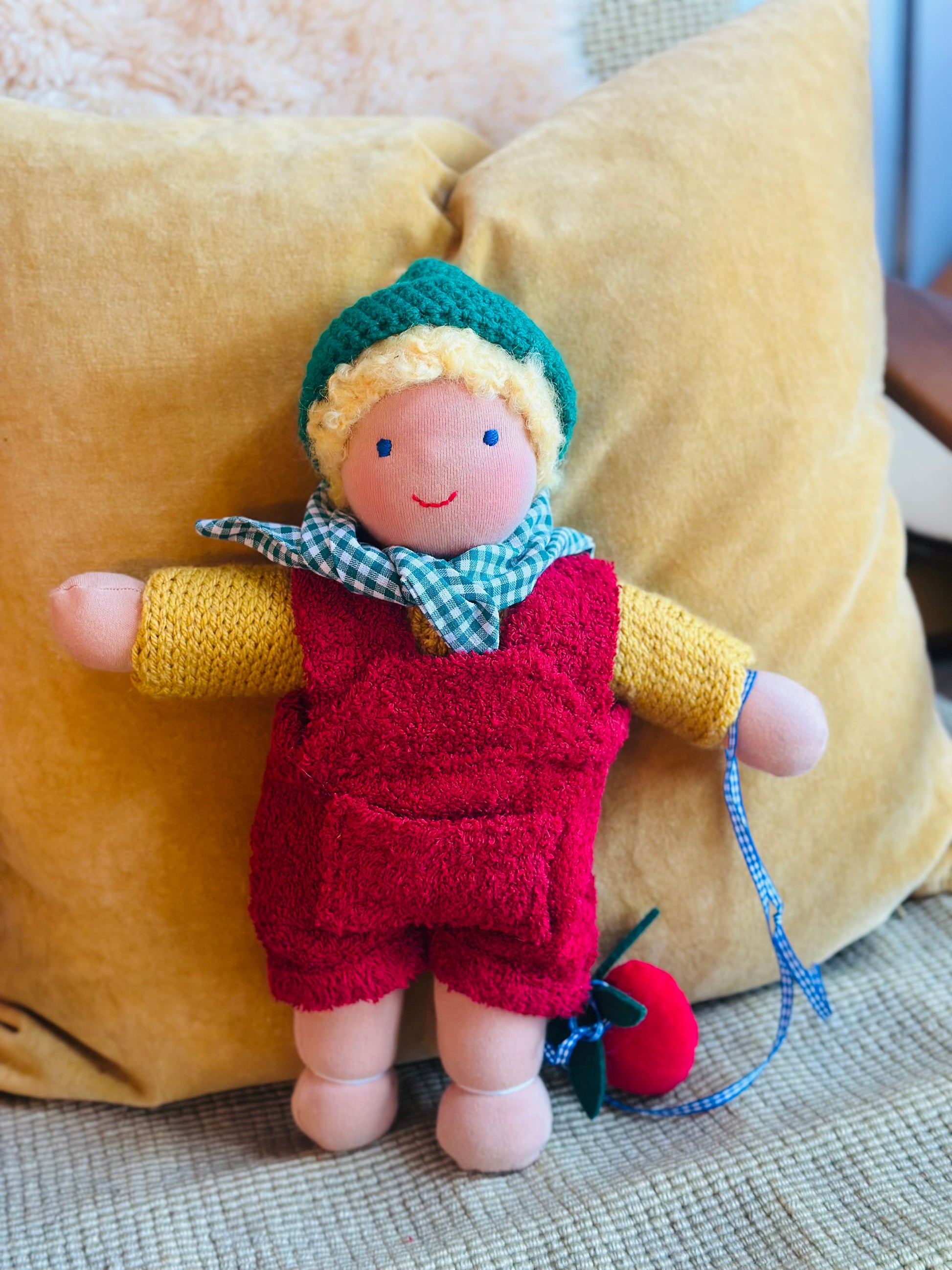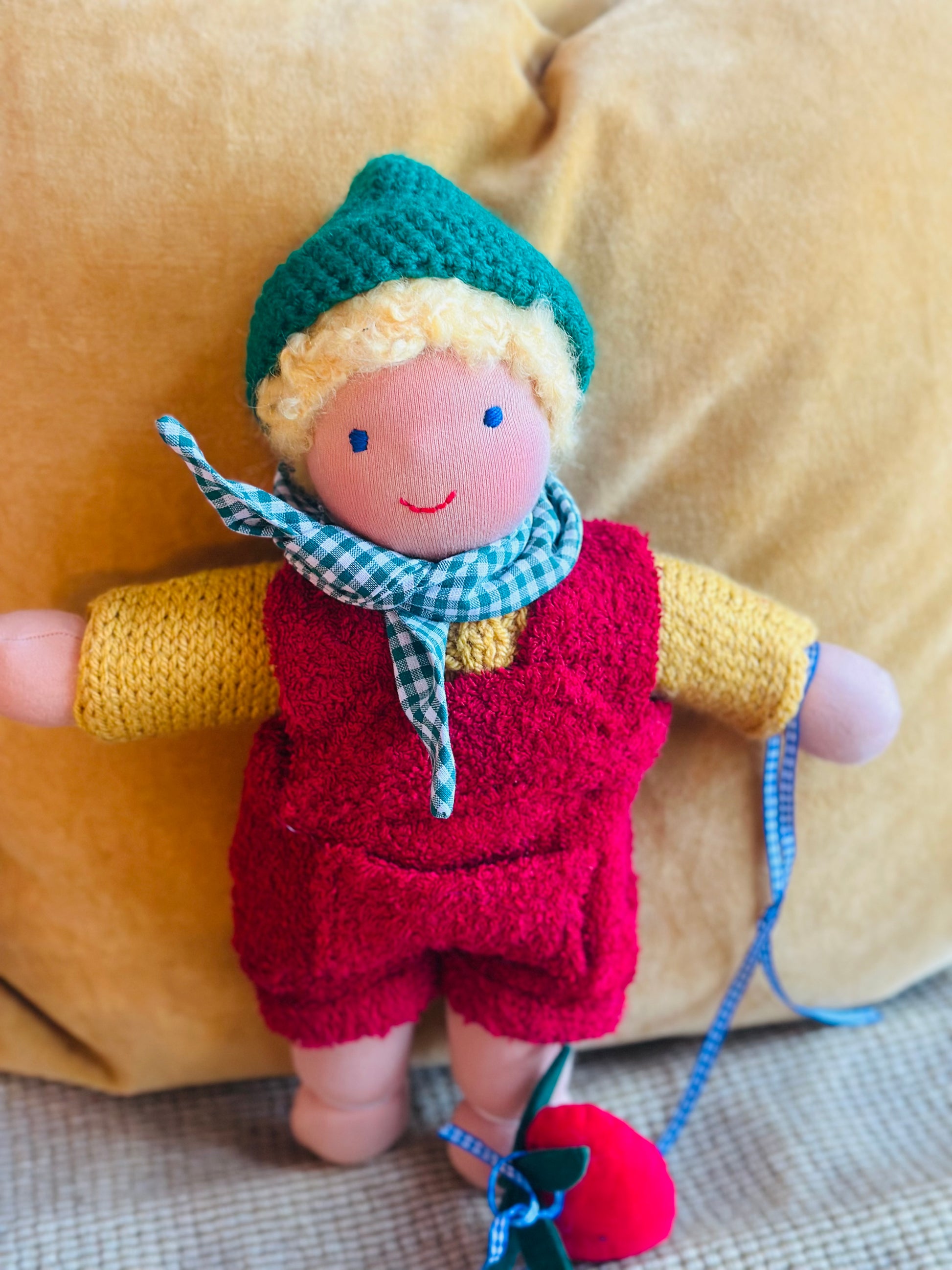 ROLAND ist ein kleines, ca. 33 cm großes, kuscheliges Waldorf-Puppenkind und ist gefüllt mit gesunder Bio zertifizierter Schafwolle.