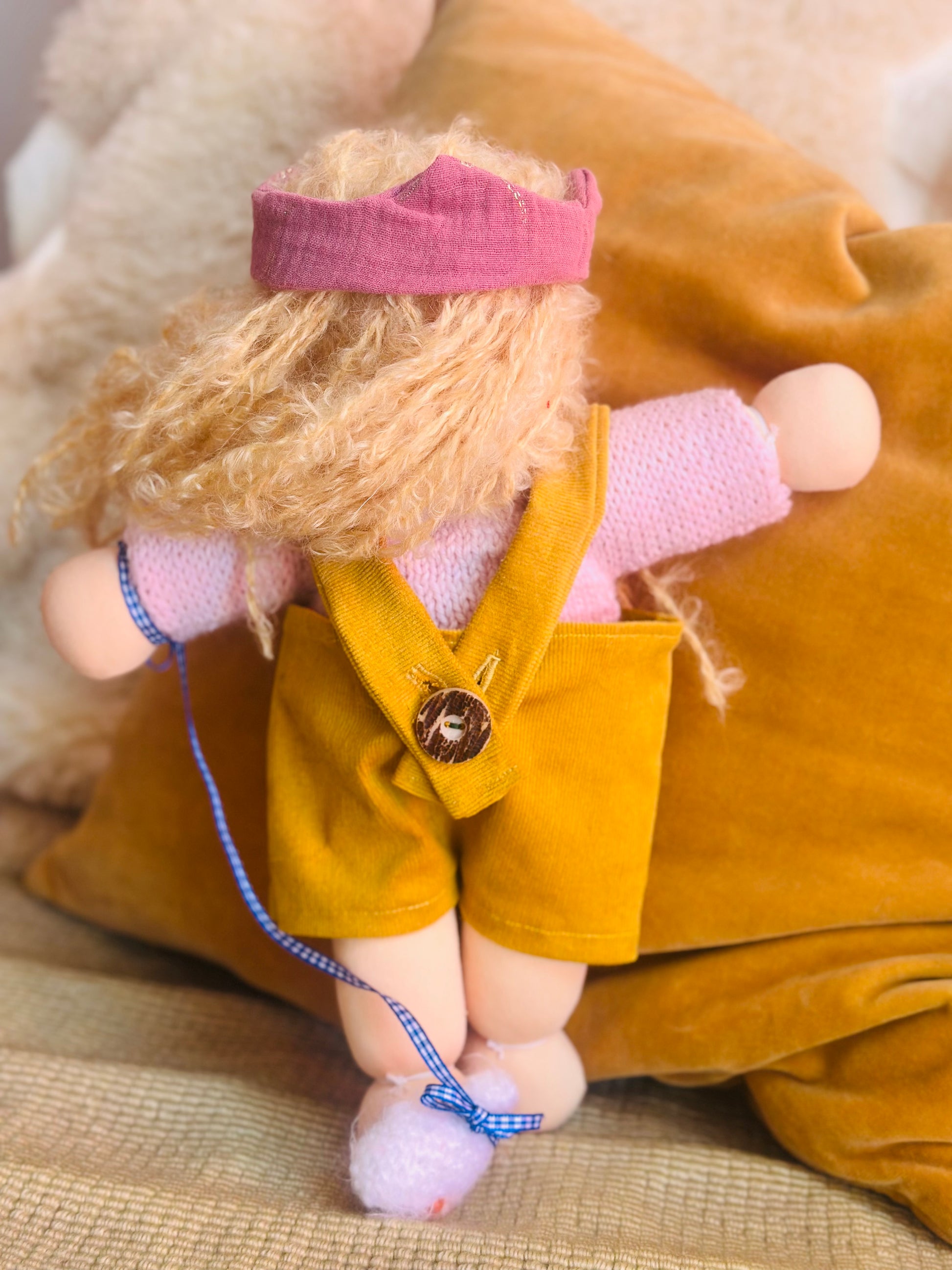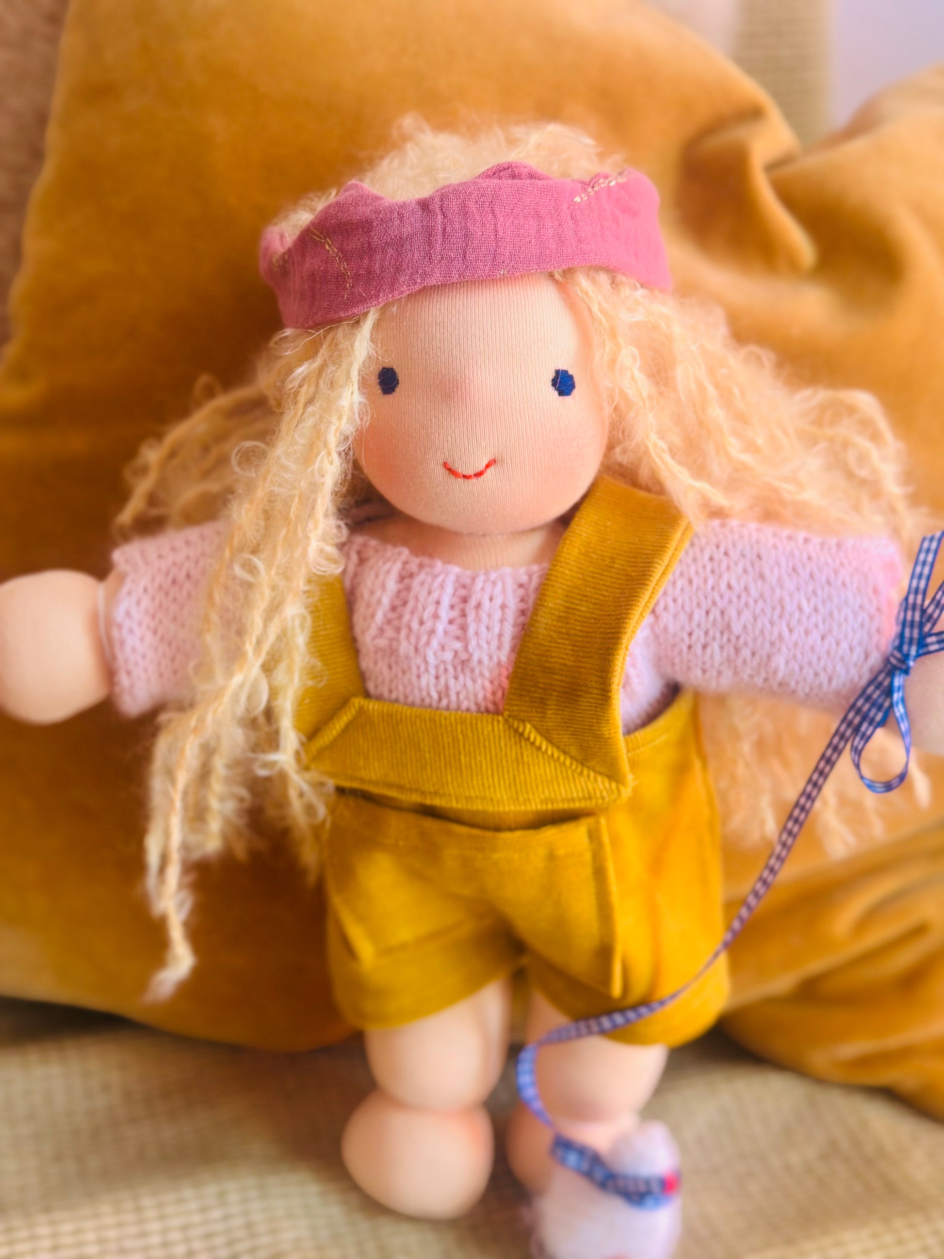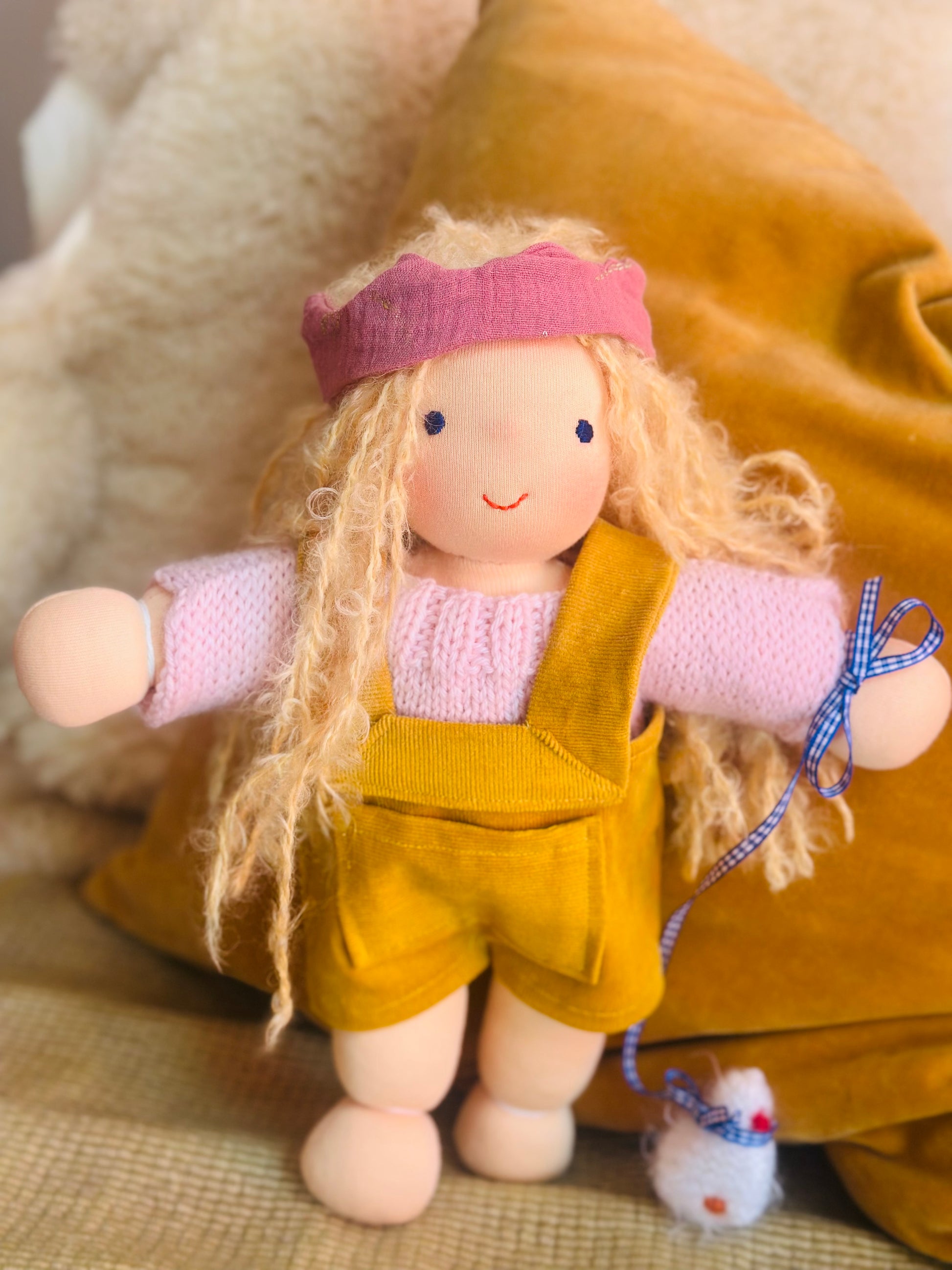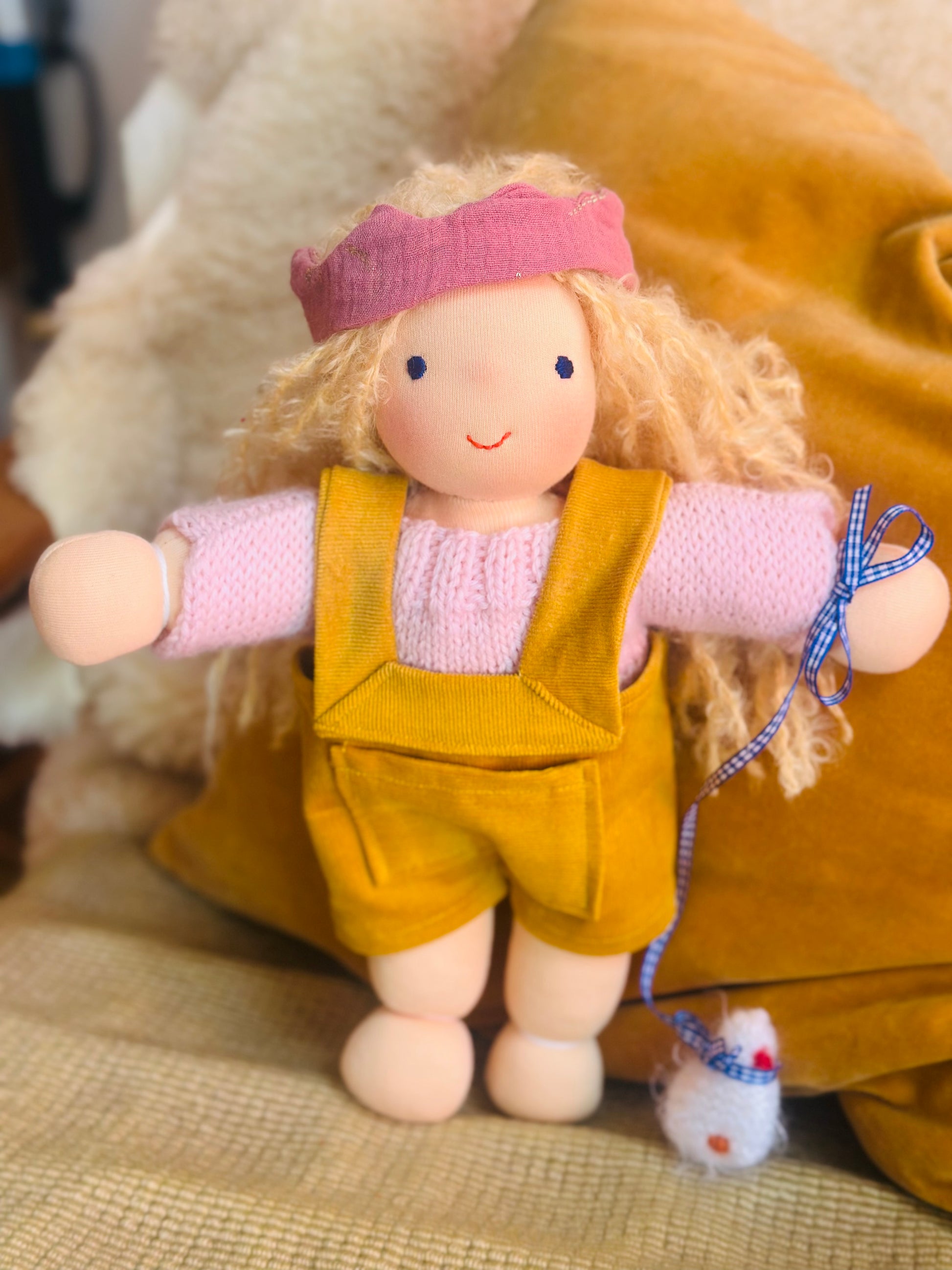 VALENTINA ist ein kleines, ca. 33 cm großes, kuscheliges Waldorf-Puppenkind und ist gefüllt mit gesunder Bio zertifizierter Schafwolle.