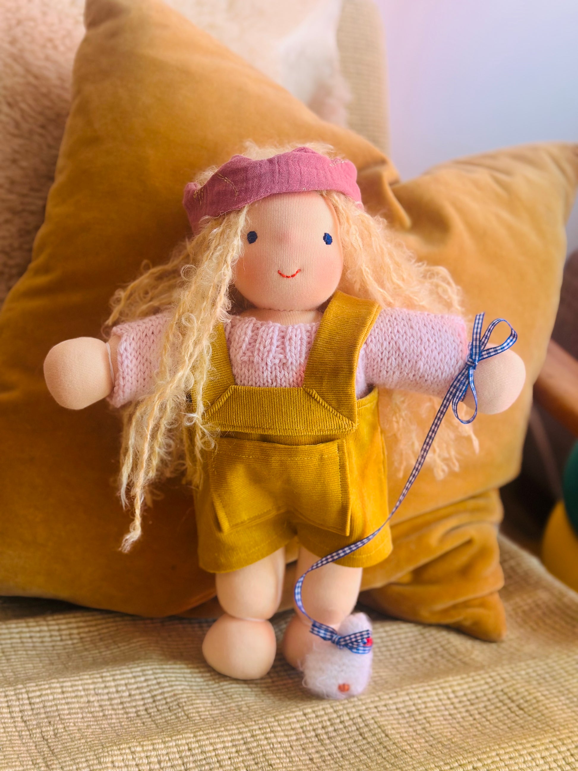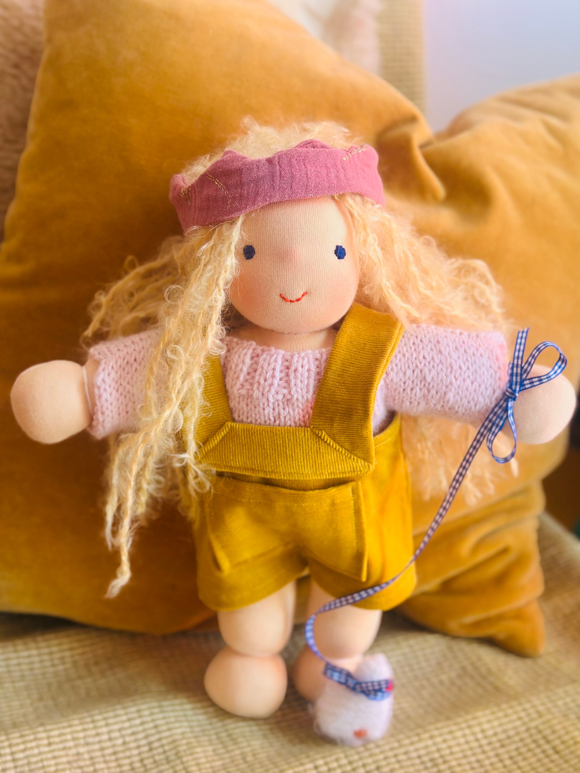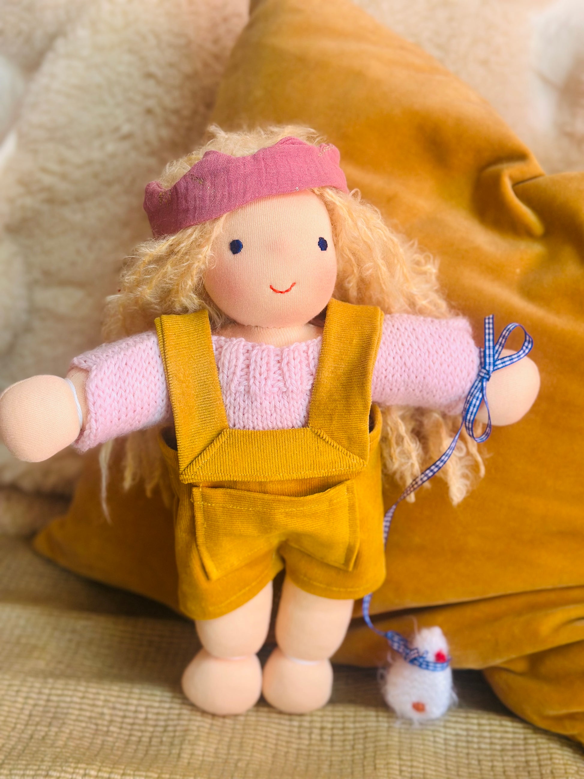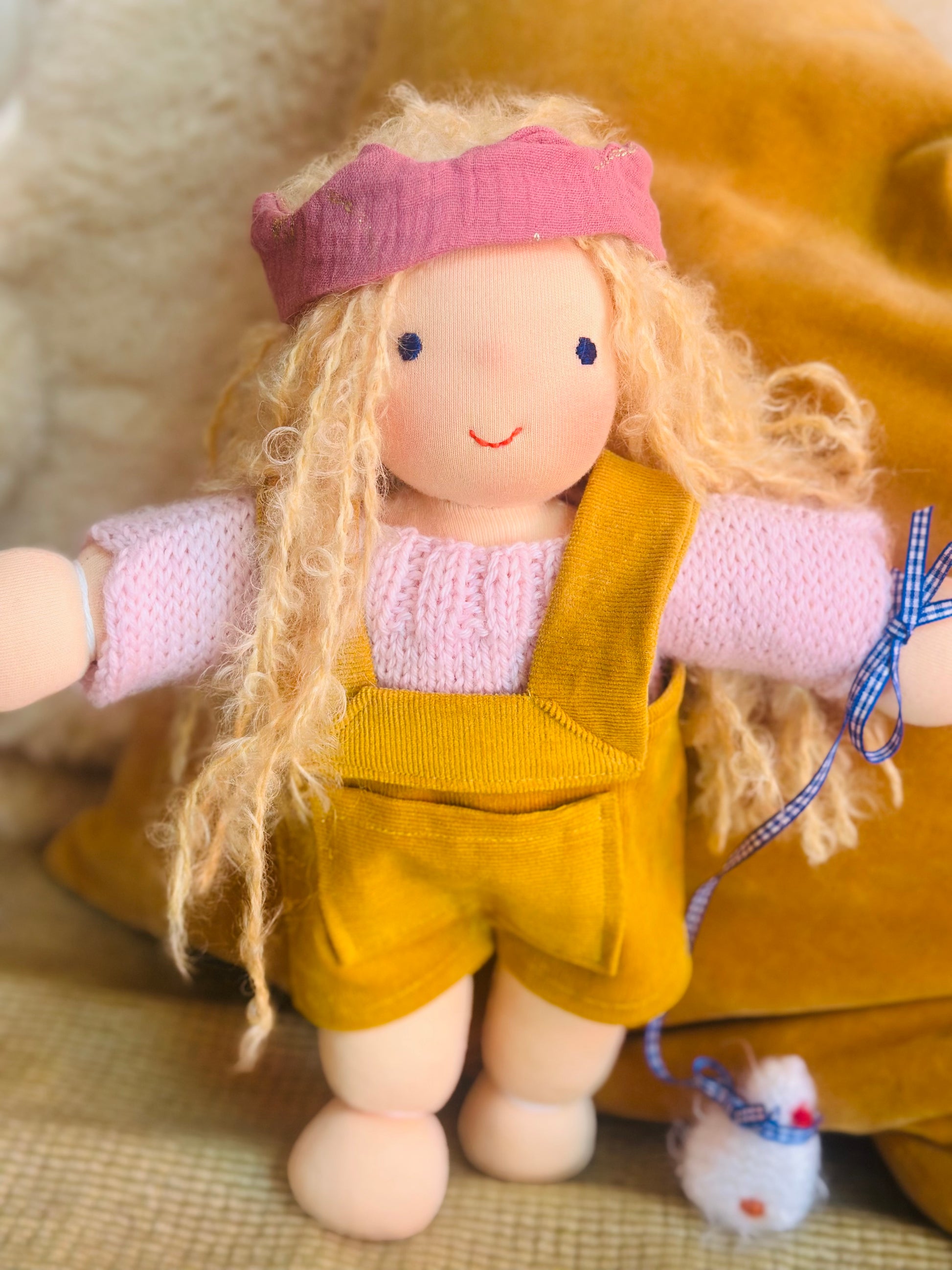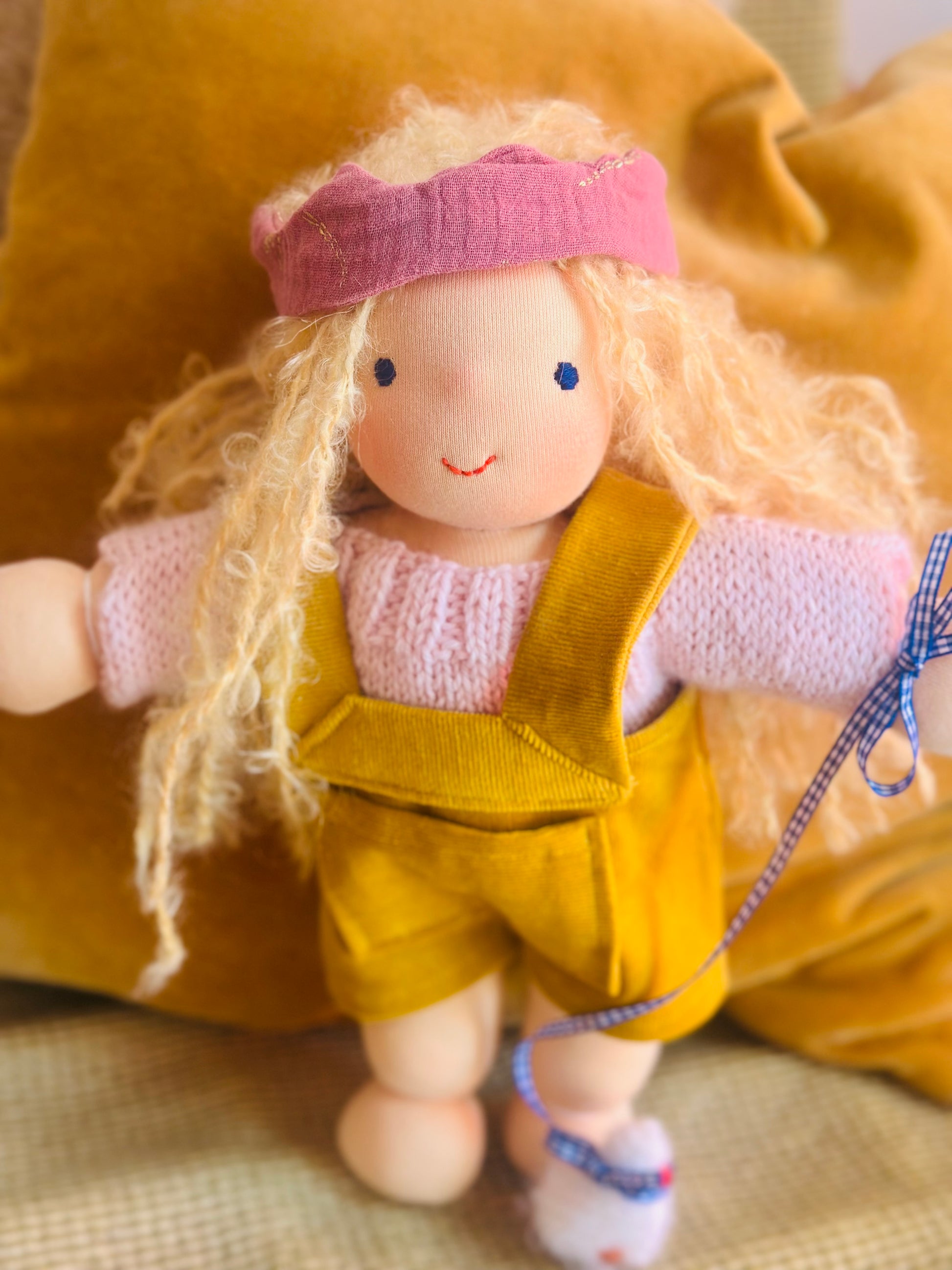 VALENTINA ist ein kleines, ca. 33 cm großes, kuscheliges Waldorf-Puppenkind und ist gefüllt mit gesunder Bio zertifizierter Schafwolle.
