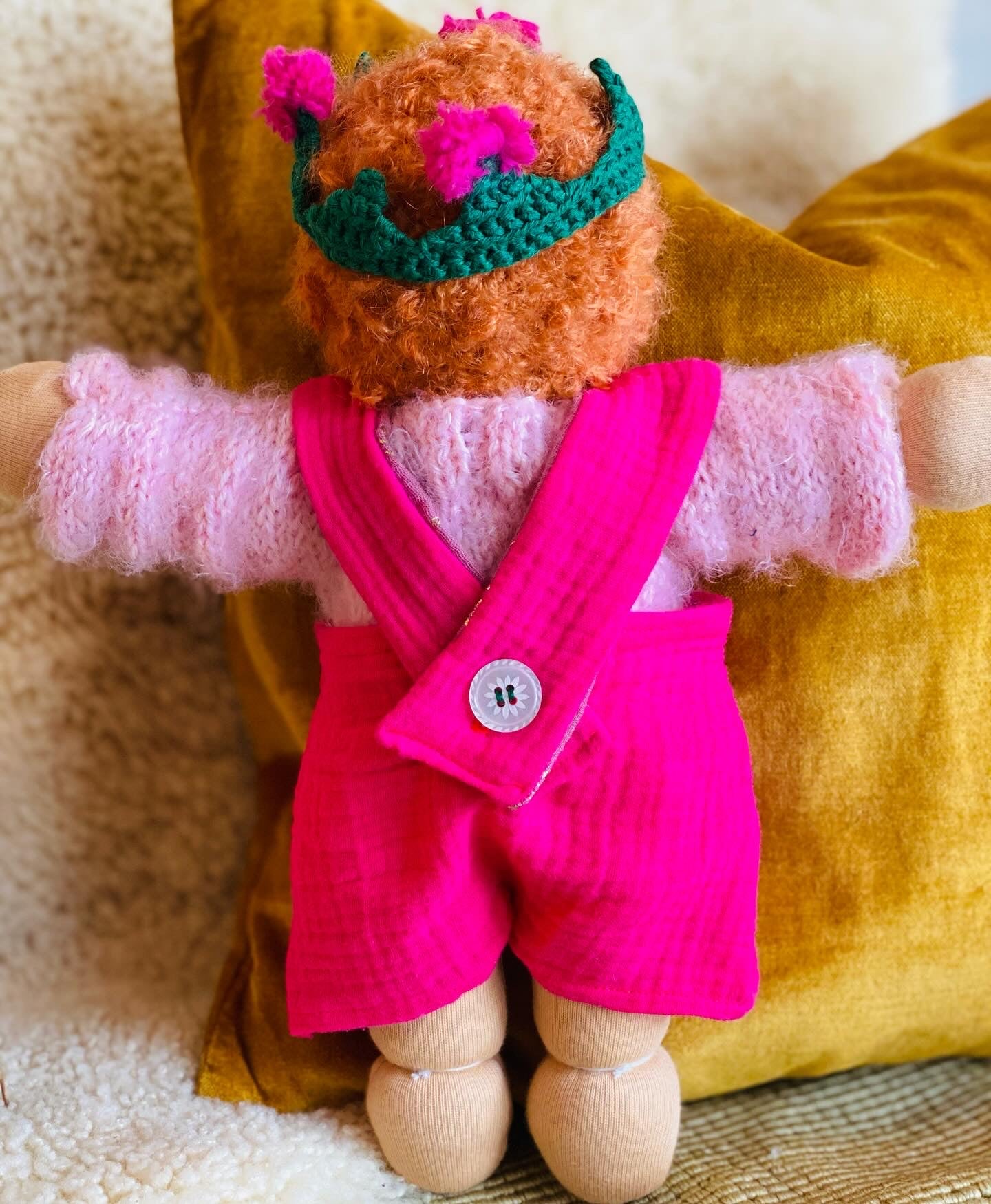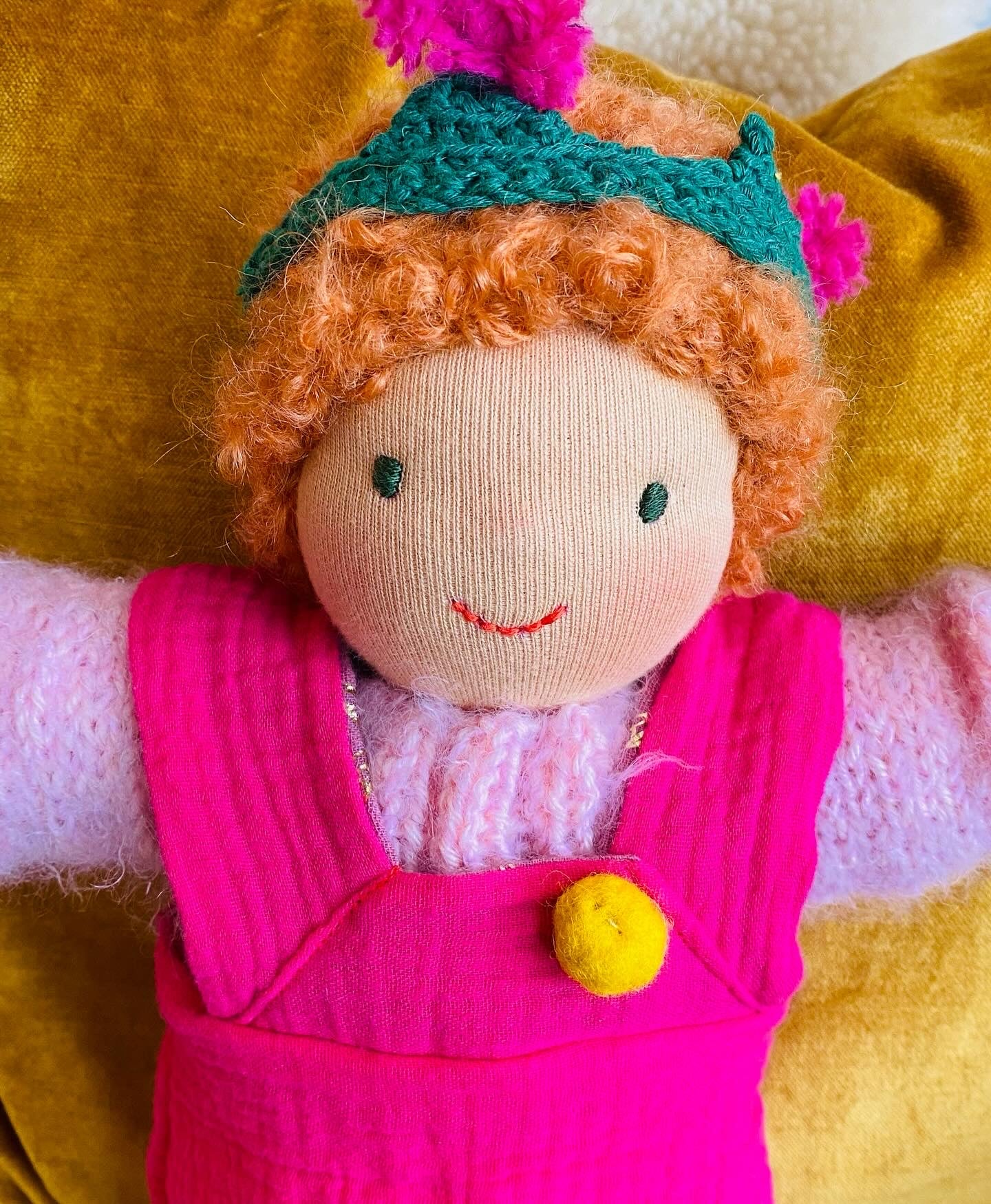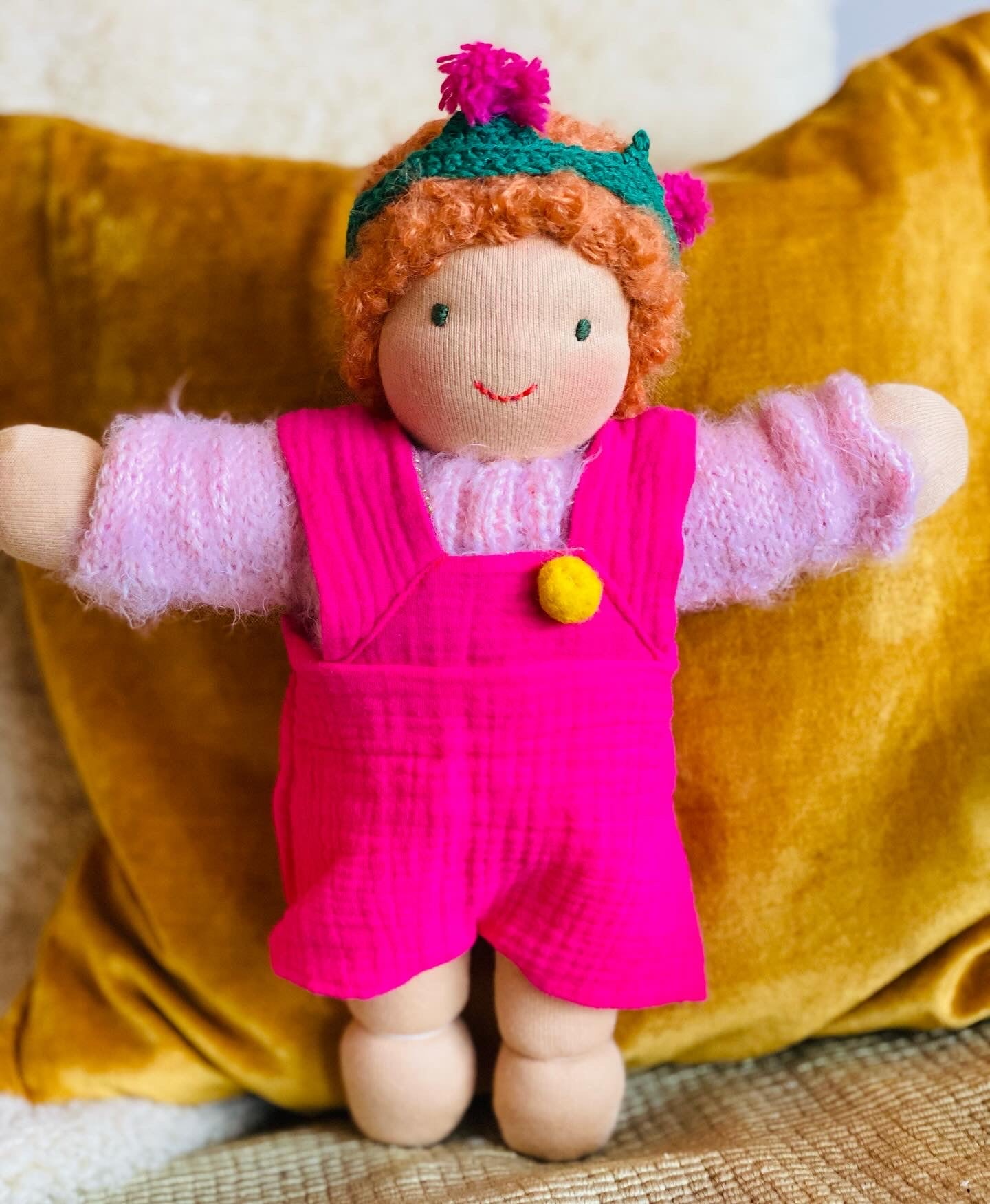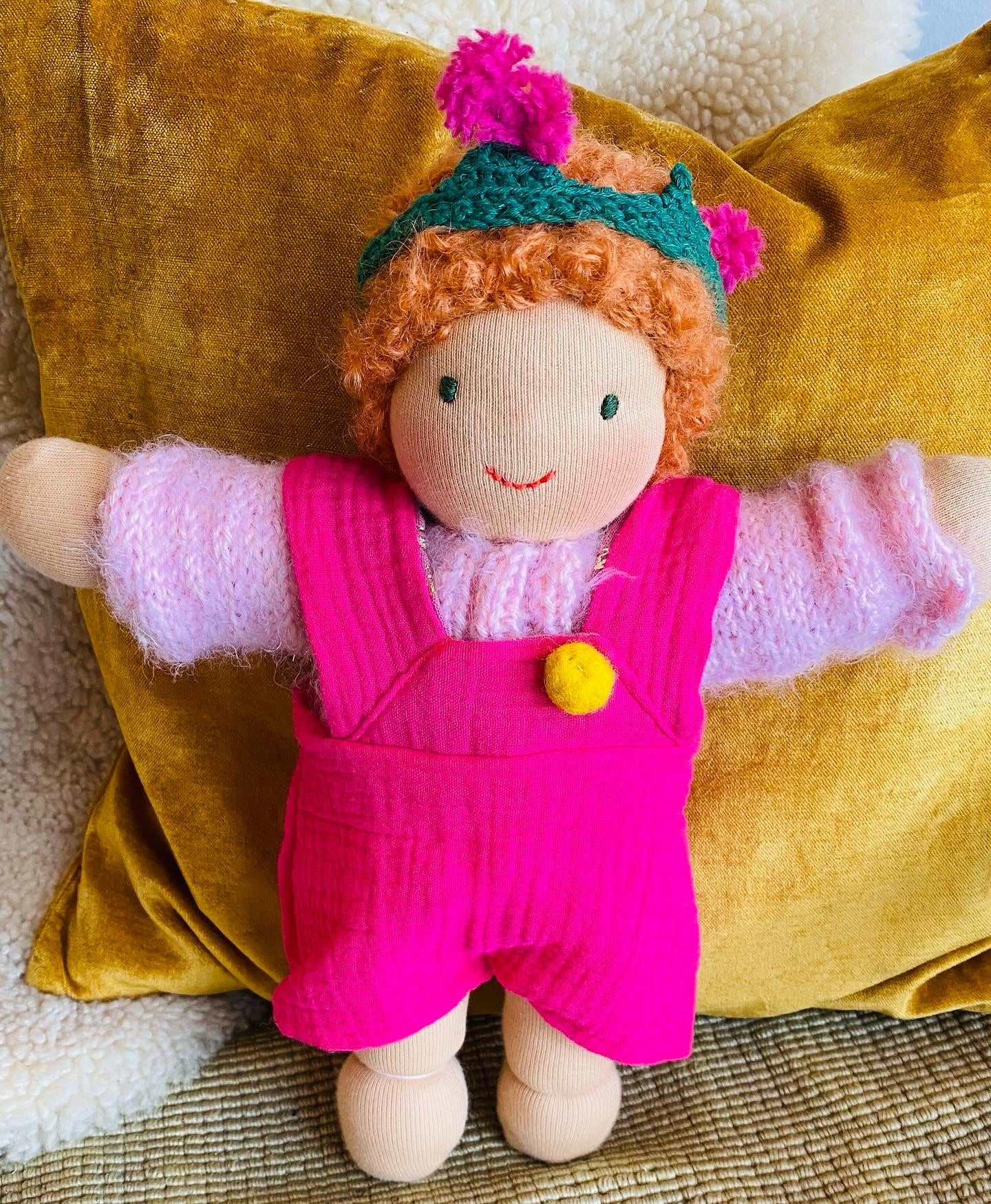 RITA ist ein kleines, ca. 33 cm großes, kuscheliges Waldorf-Puppenkind und ist gefüllt mit gesunder De Witte Engel OEKO-TEX® zertifizierter Schafwolle.