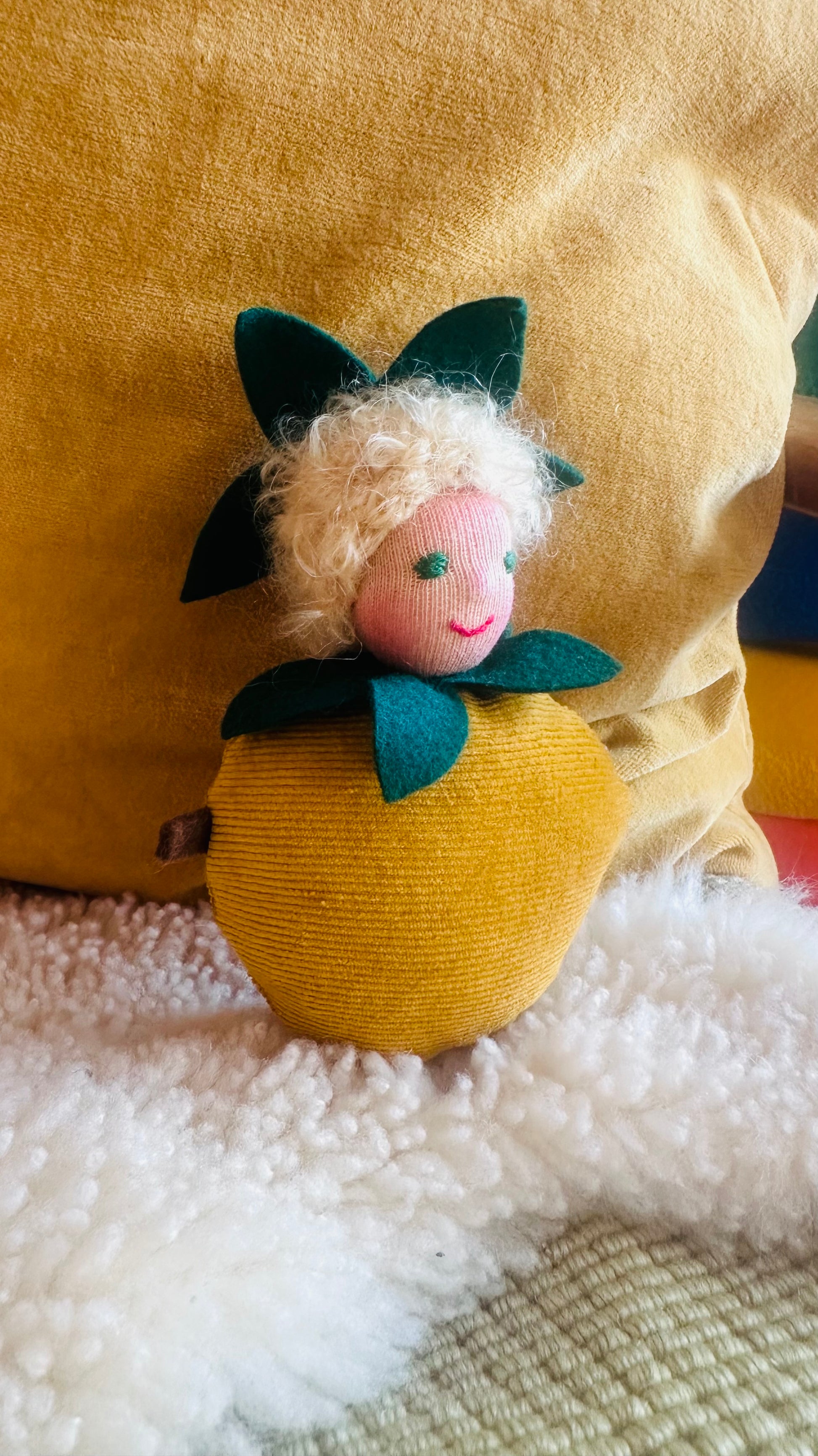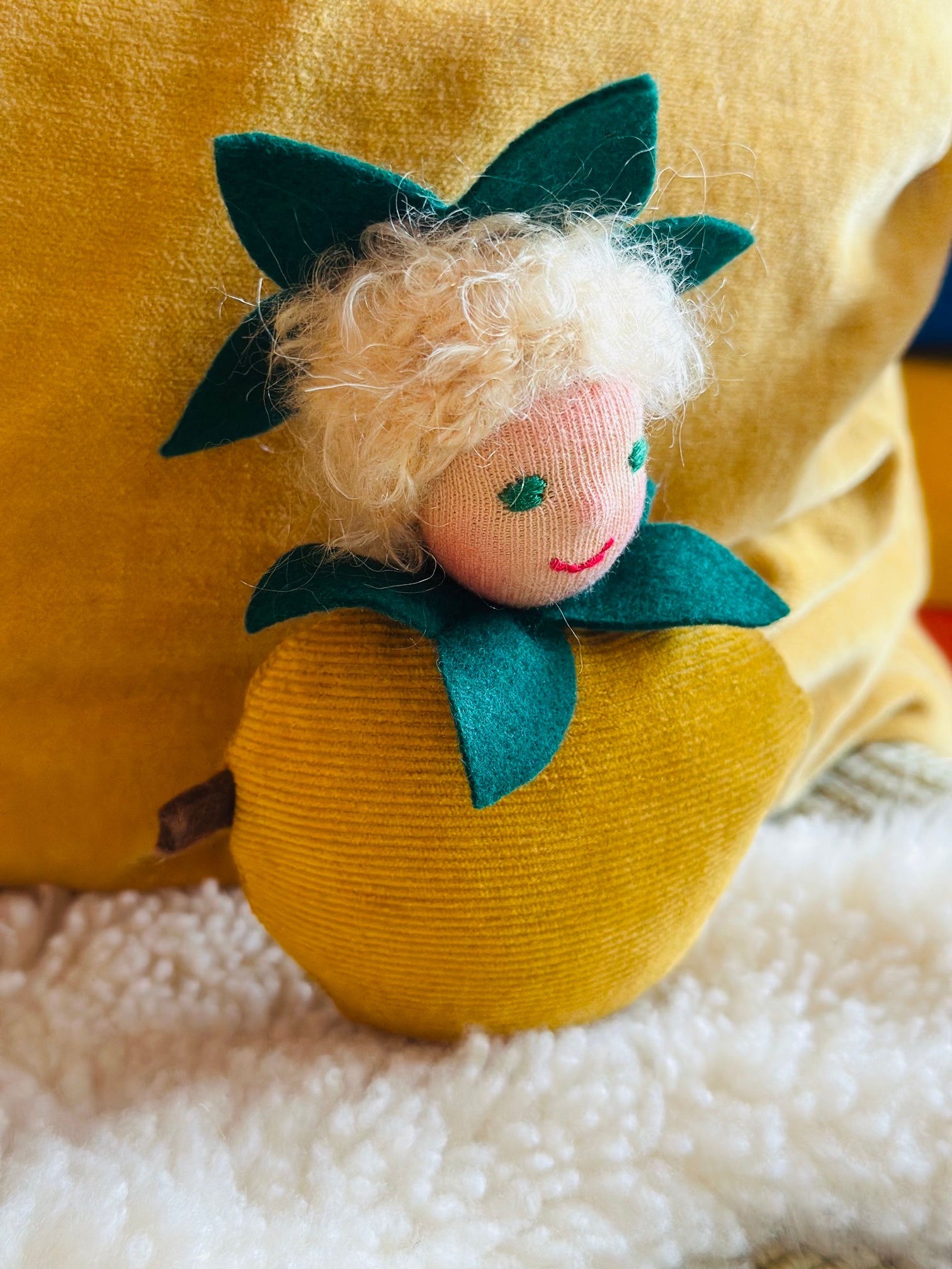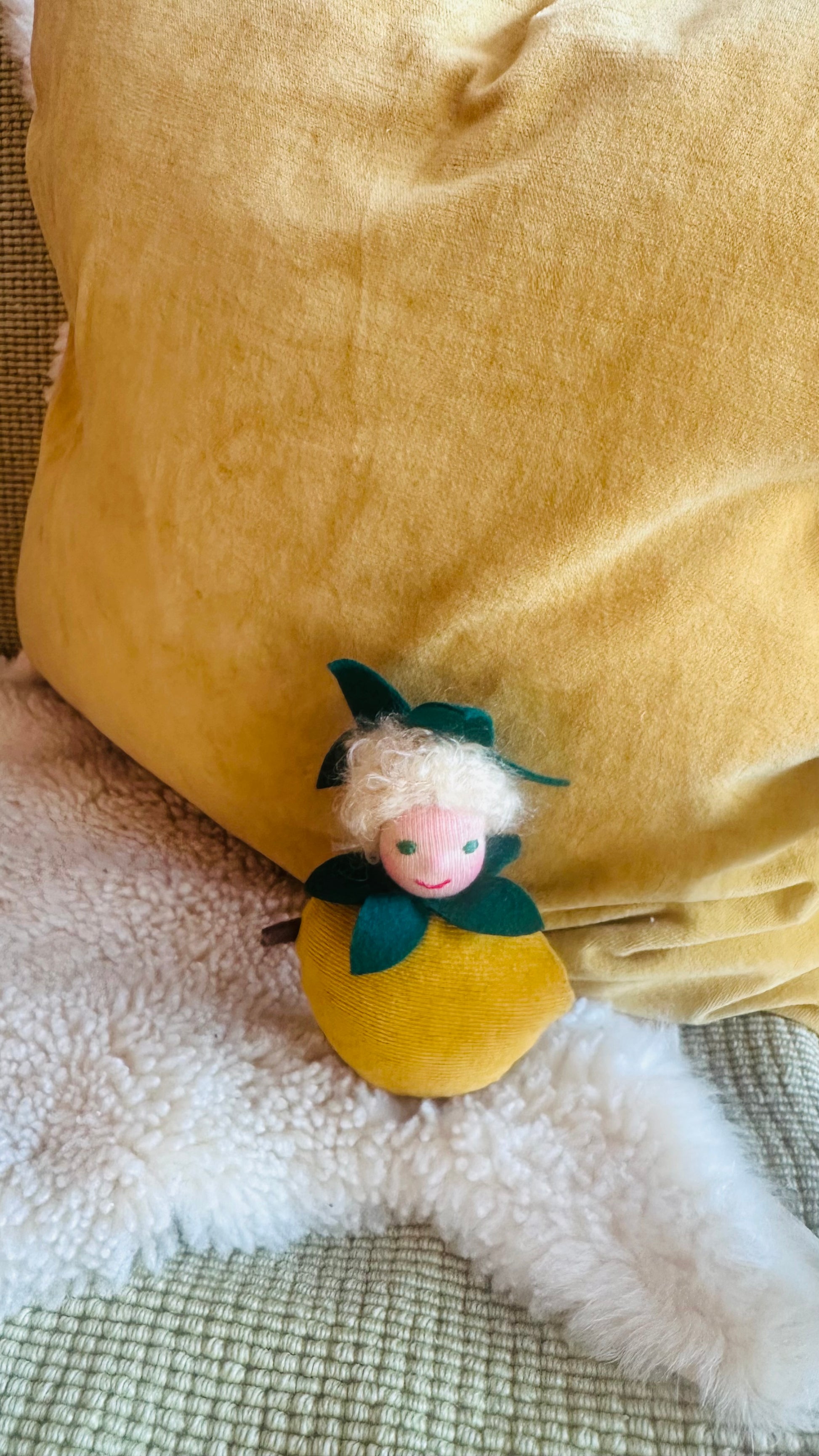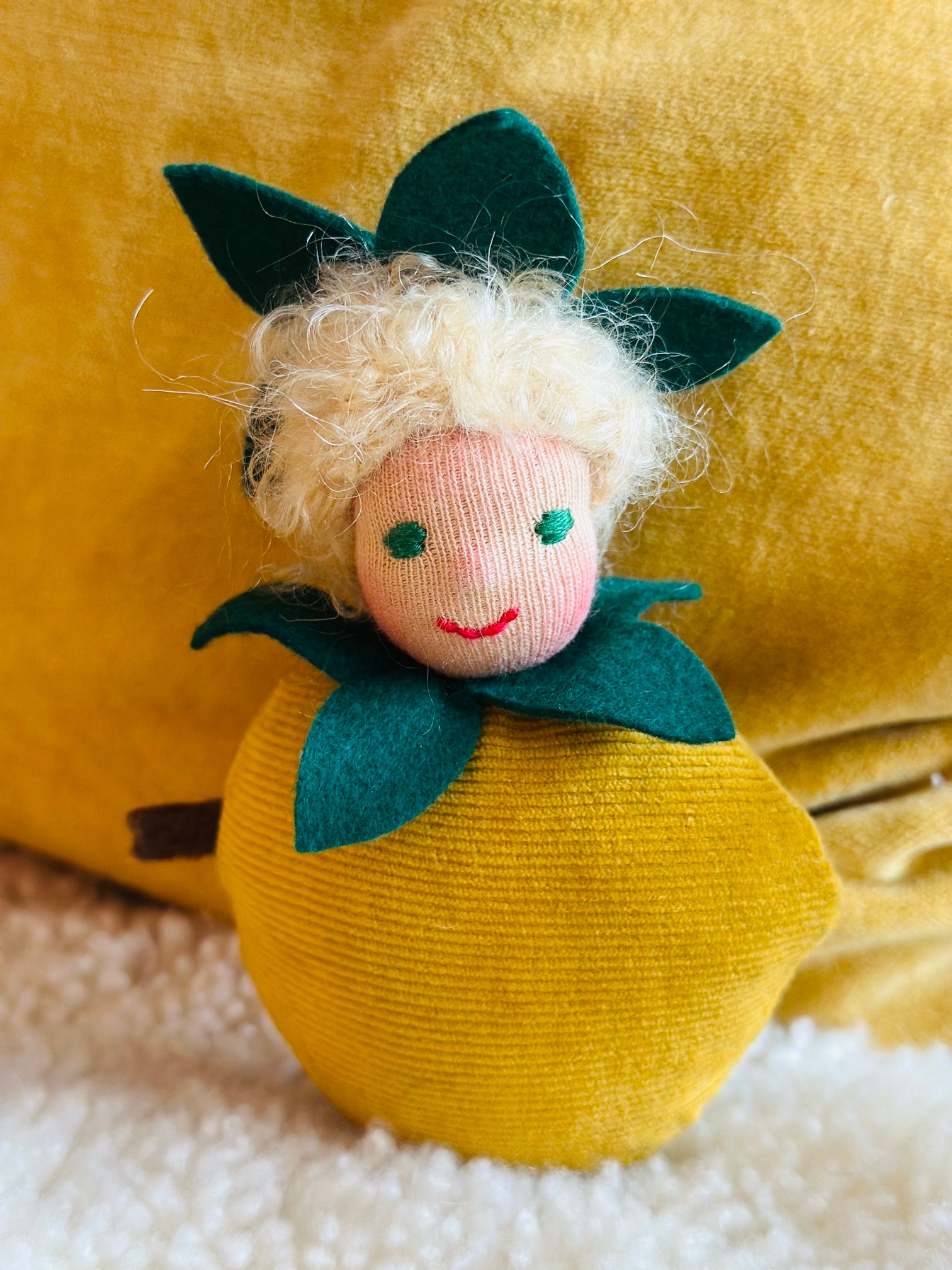 LIMONI 🍋 ist ein kleines, ca. 13 cm  großes, kuscheliges Waldorf-Puppenkind und ist gefüllt mit gesunder Bio zertifizierter Schafwolle.